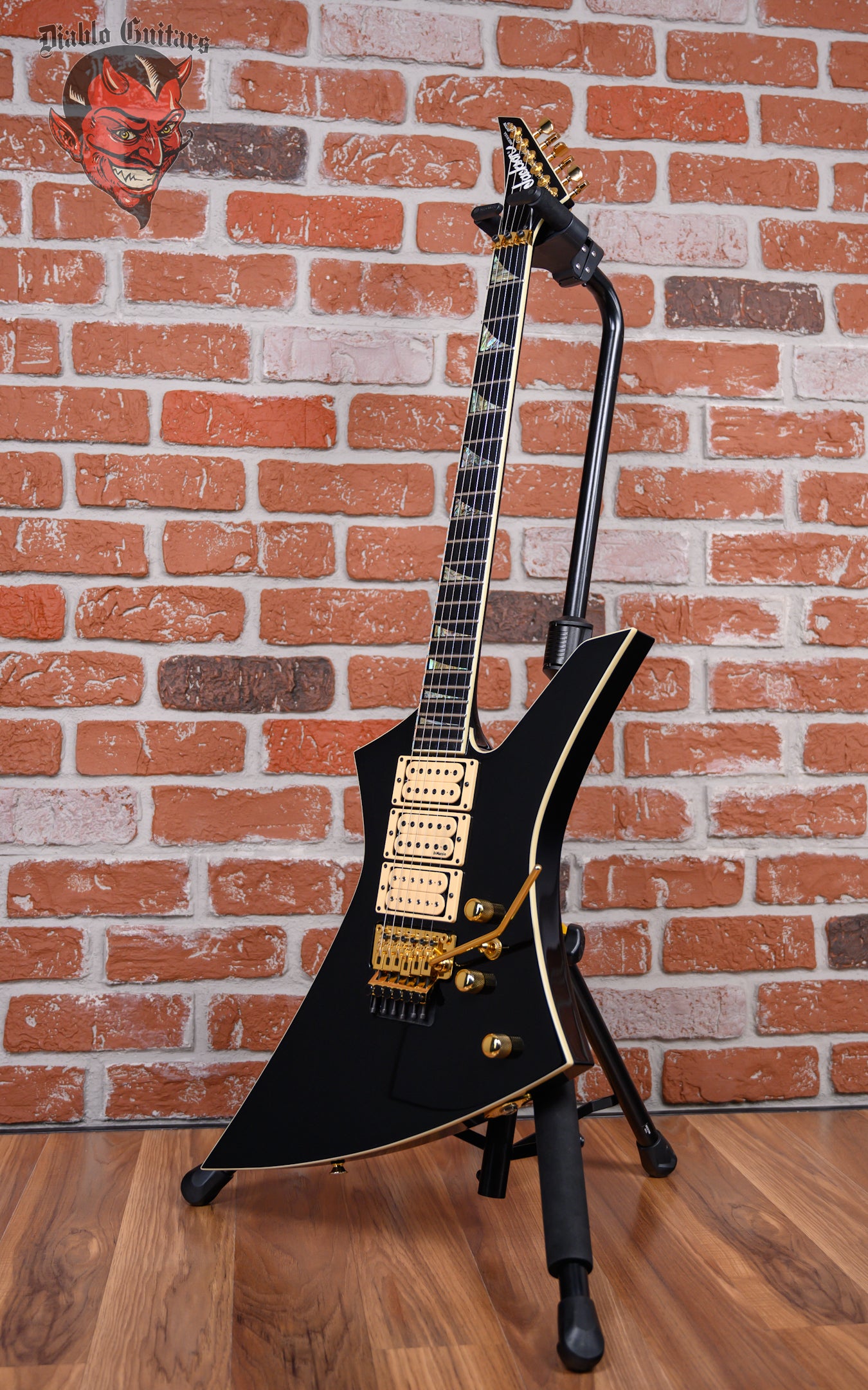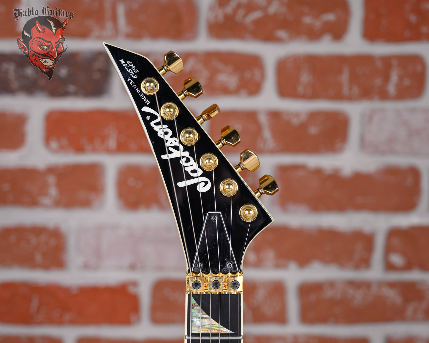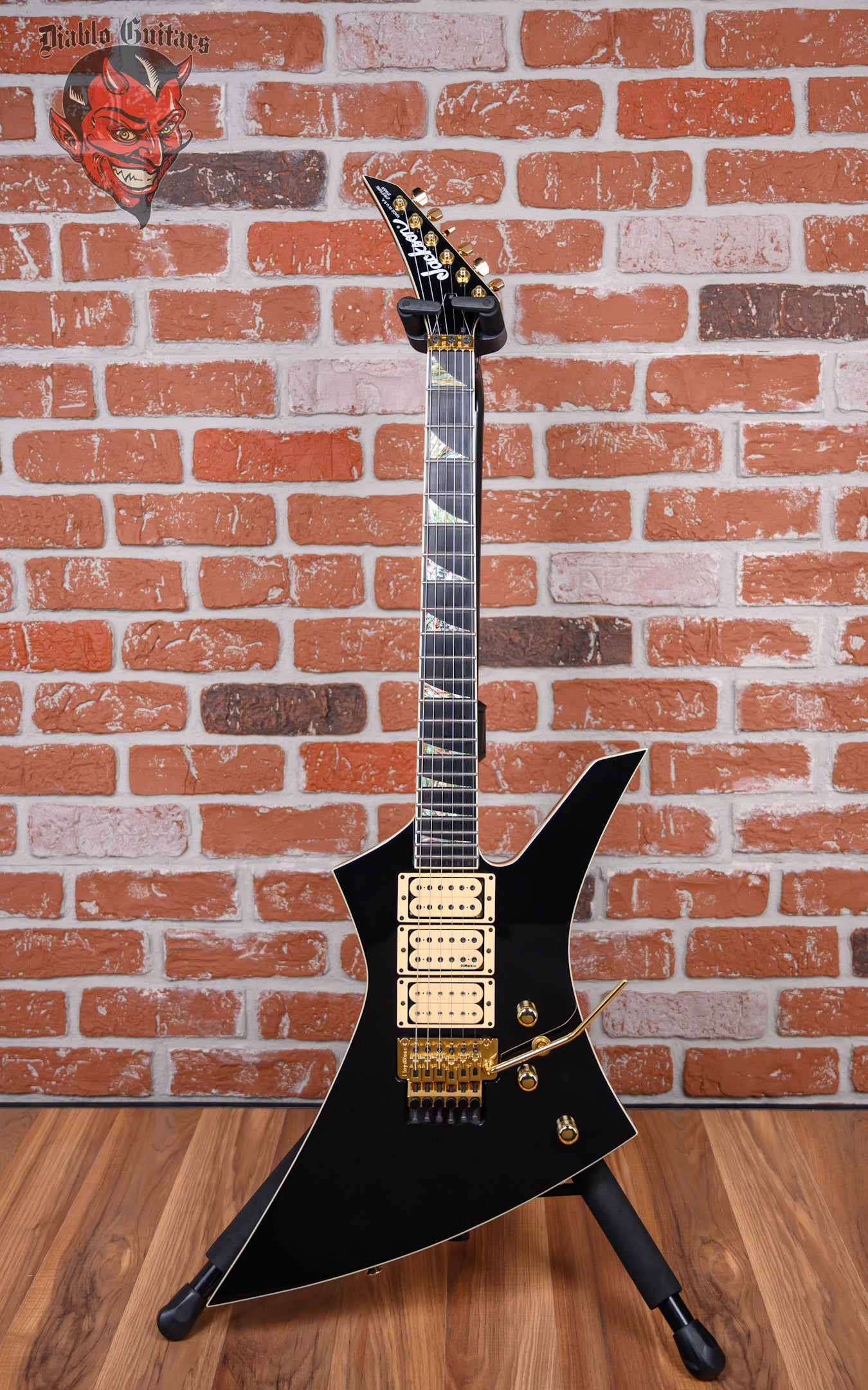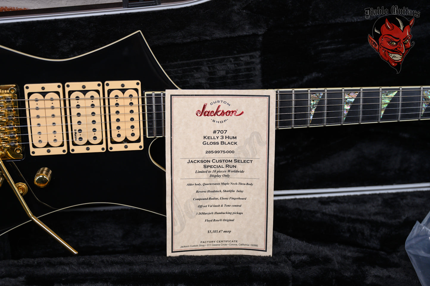 Jackson USA Custom Shop Custom Select Special Run Kelly 3-Hum in Black finish made in 2013 with Original Hard Shell Case. This guitar features a solid alder body, quartersawn maple neck-thru and bound ebony fingerboard with a reverse, bound headstock. Equipped with a dimarzio PAF pro in the neck position, a dimarzio PAF pro in the middle position and a dimarzio super distortion in the bridge position. Controlled by 3-Volume pots and a 3-Way toggle switch. The 25.5" scale length neck has abalone sharkfin inlays, black side markers with 24 jumbo frets on a compound 12"-16" radius with a speed profile. The hardware is comprised of gold Jackson sealed diecast tuning machines with cloche heads, a Floyd Rose locking nut, a Floyd Rose original double locking tremolo with ‘84 style trem arm and gold knurled dome knobs.