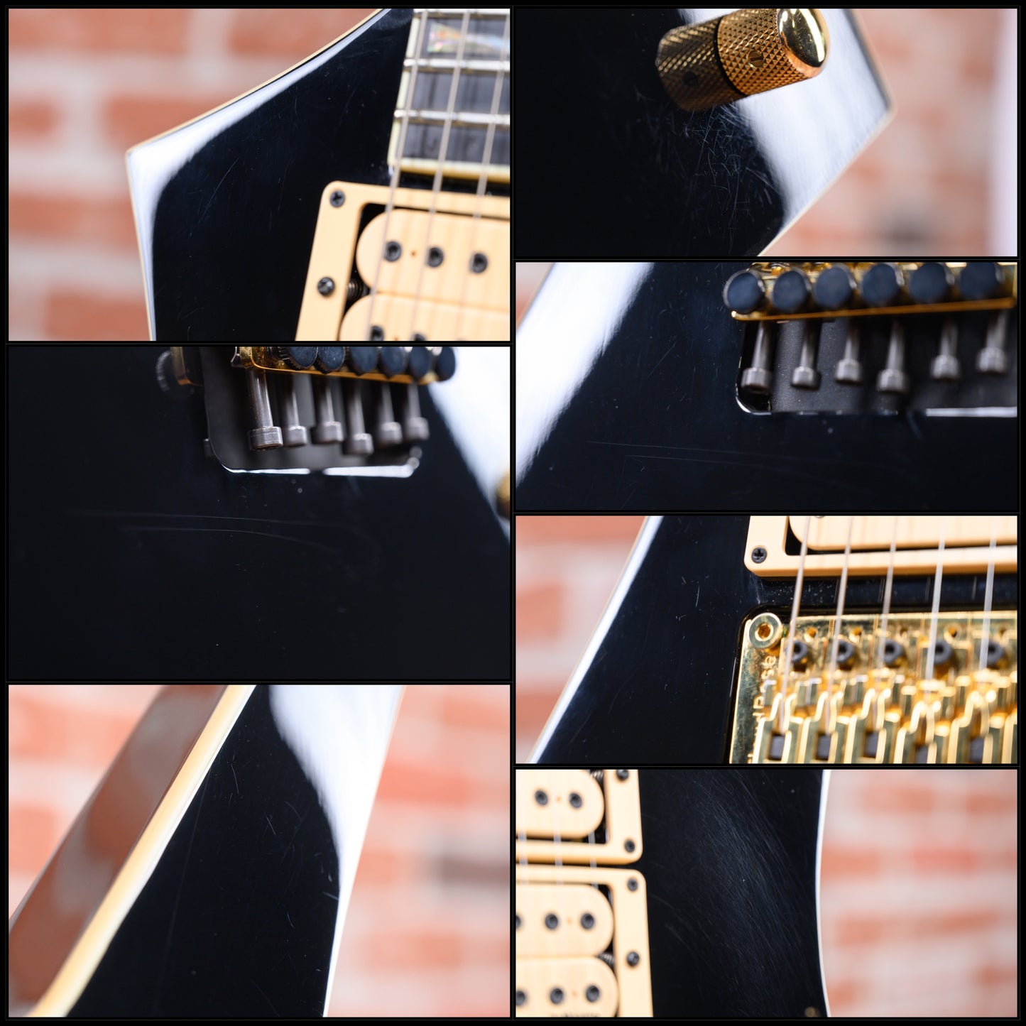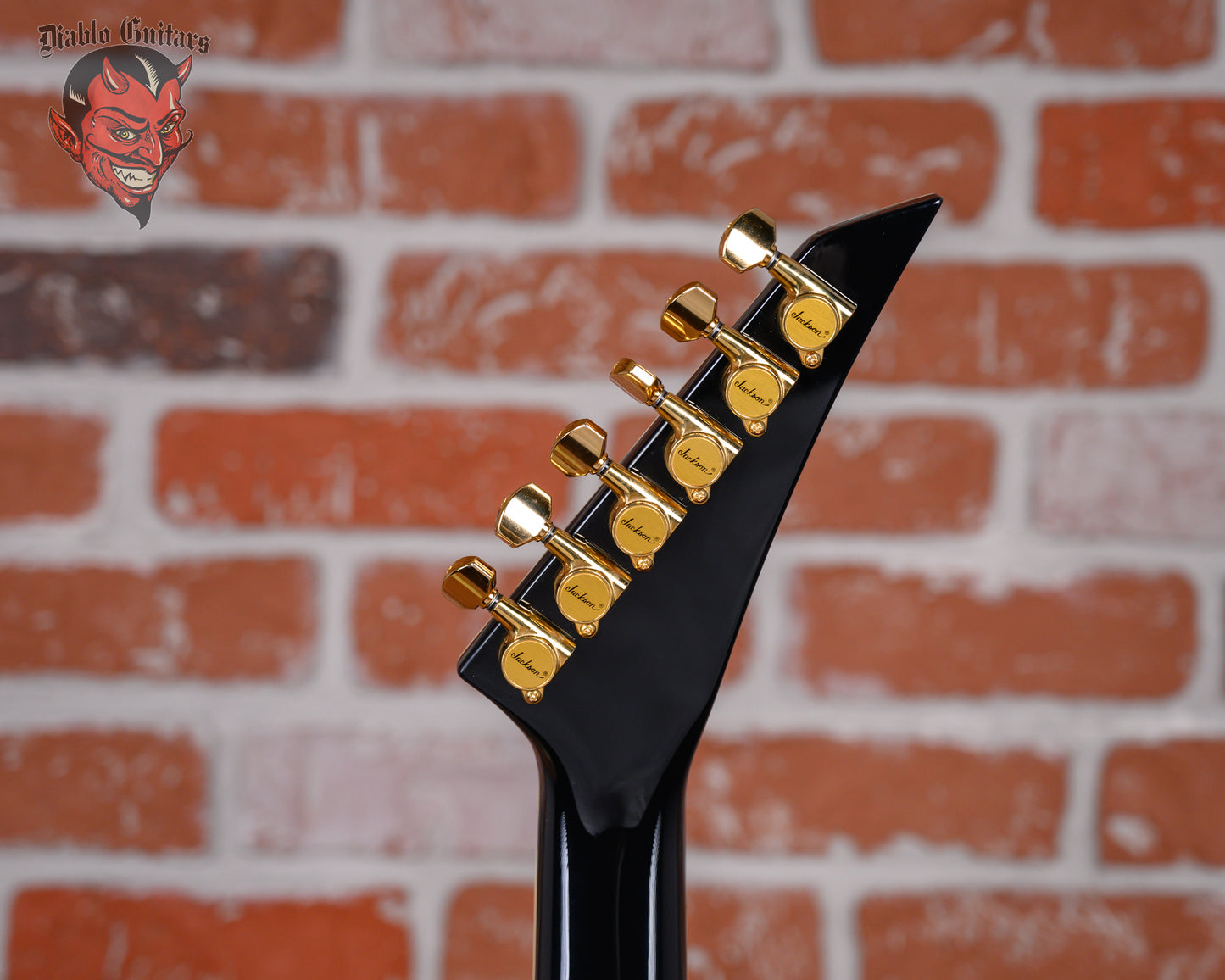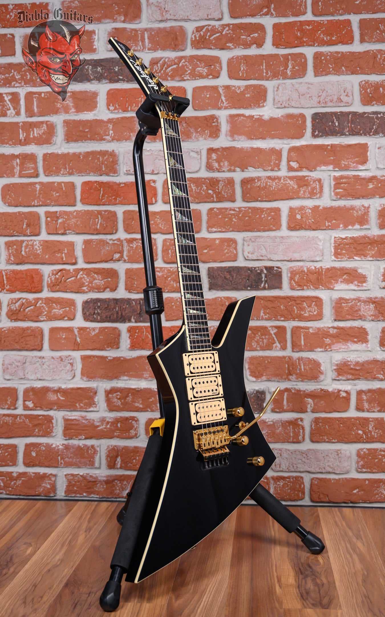 Jackson USA Custom Shop Custom Select Special Run Kelly 3-Hum in Black finish made in 2013 with Original Hard Shell Case. This guitar features a solid alder body, quartersawn maple neck-thru and bound ebony fingerboard with a reverse, bound headstock. Equipped with a dimarzio PAF pro in the neck position, a dimarzio PAF pro in the middle position and a dimarzio super distortion in the bridge position. Controlled by 3-Volume pots and a 3-Way toggle switch. The 25.5" scale length neck has abalone sharkfin inlays, black side markers with 24 jumbo frets on a compound 12"-16" radius with a speed profile. The hardware is comprised of gold Jackson sealed diecast tuning machines with cloche heads, a Floyd Rose locking nut, a Floyd Rose original double locking tremolo with ‘84 style trem arm and gold knurled dome knobs.