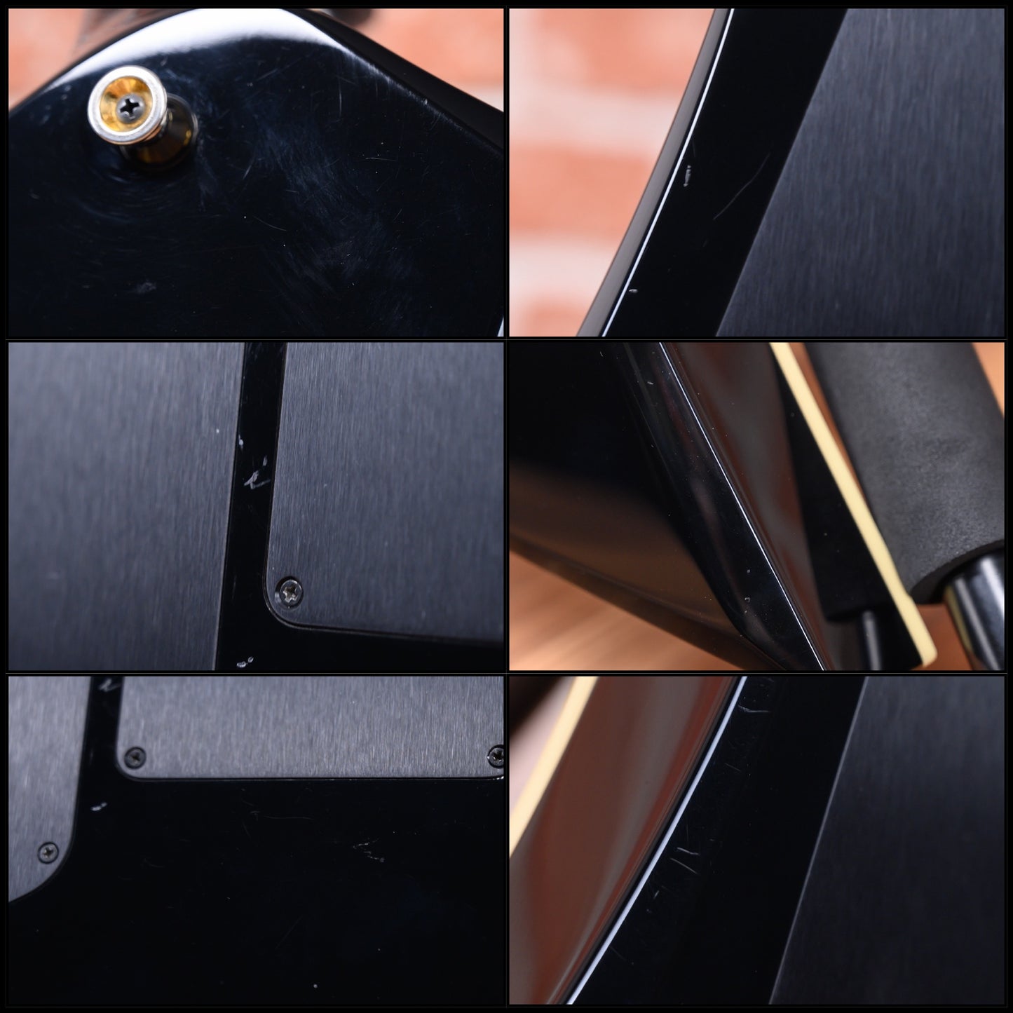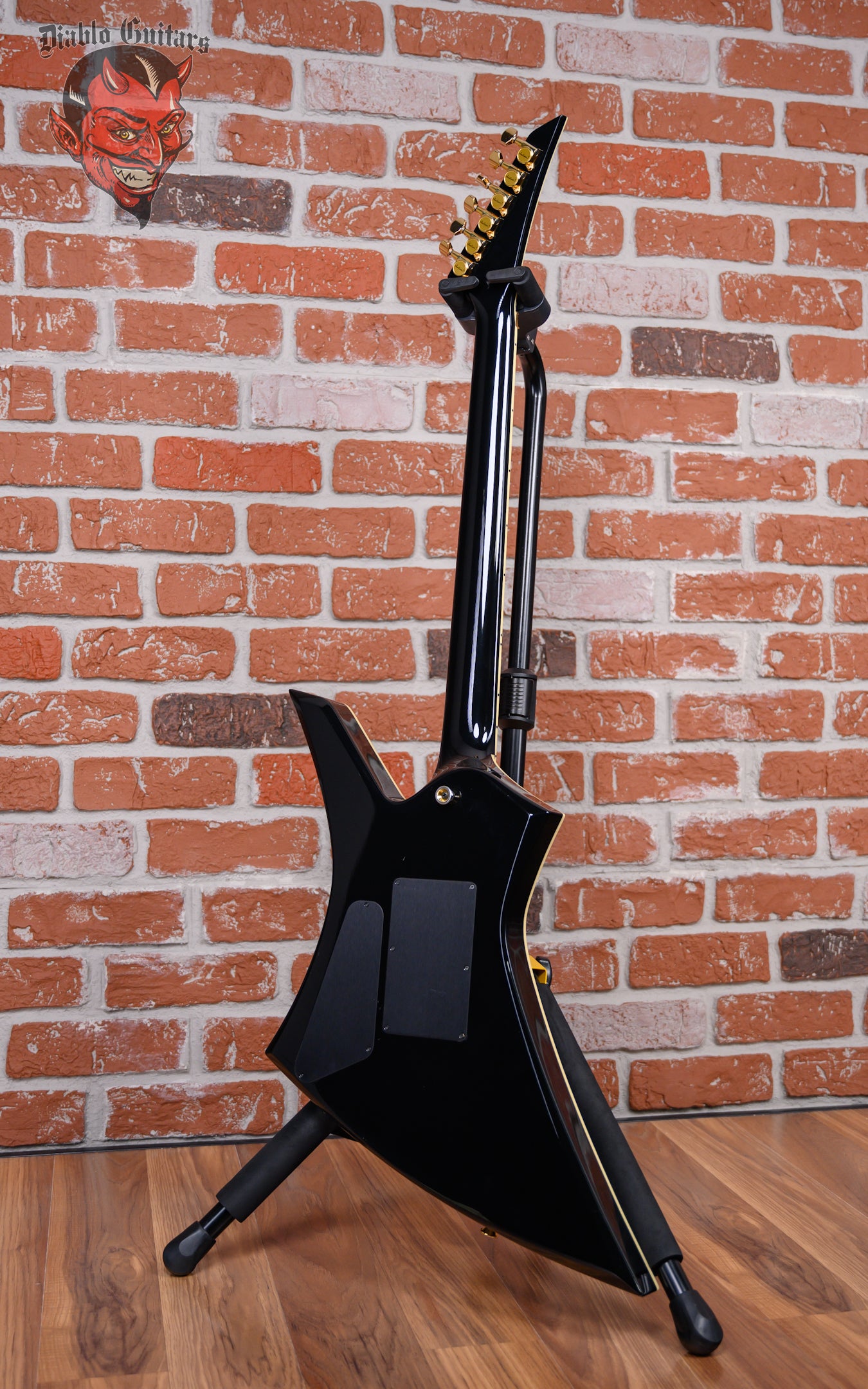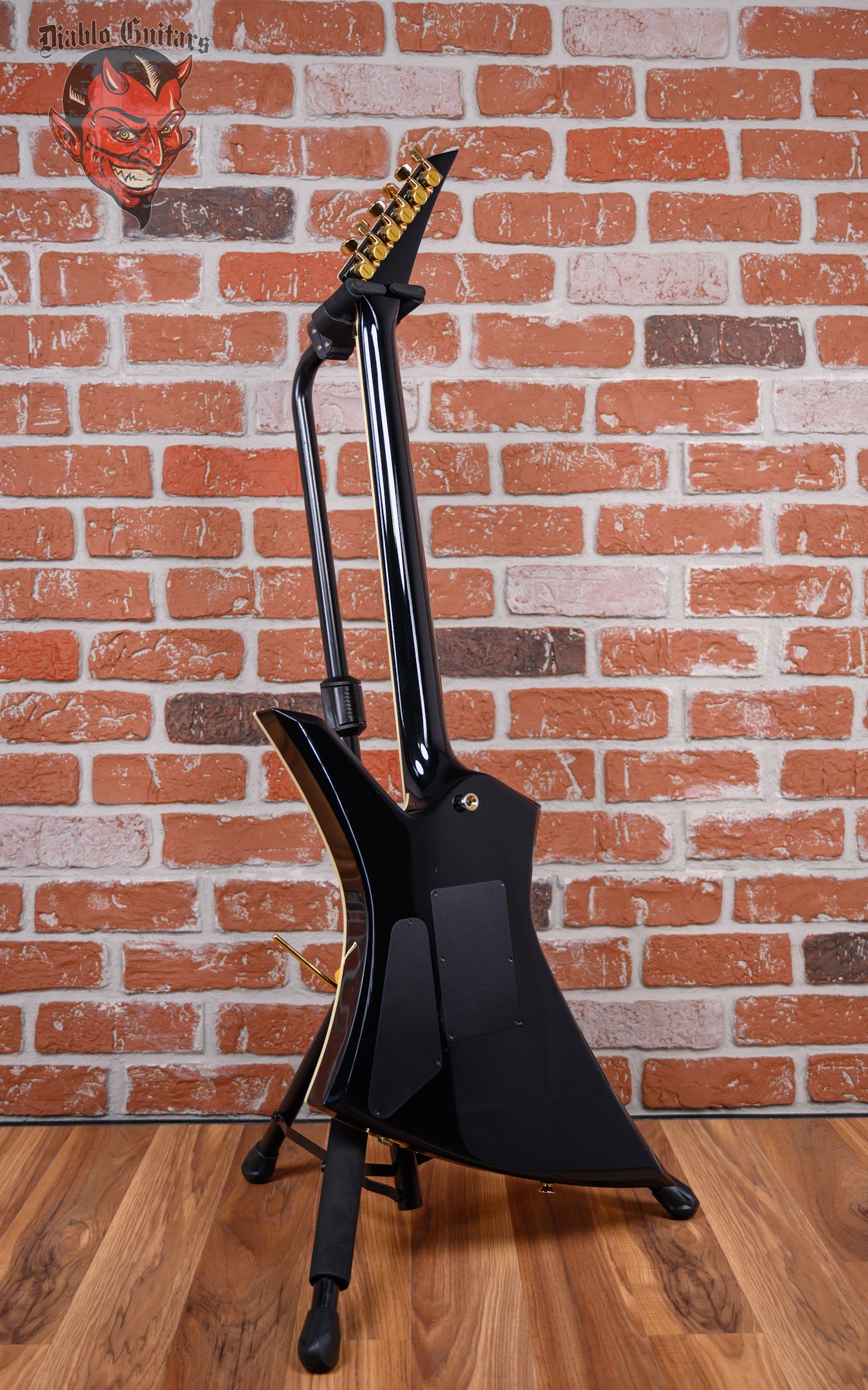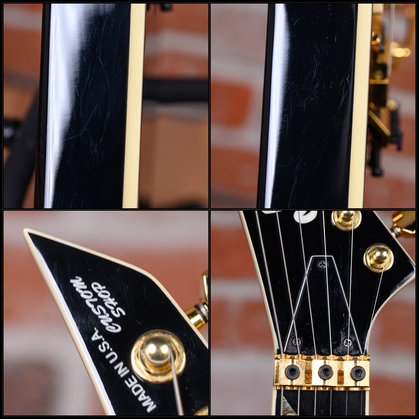 Jackson USA Custom Shop Custom Select Special Run Kelly 3-Hum in Black finish made in 2013 with Original Hard Shell Case. This guitar features a solid alder body, quartersawn maple neck-thru and bound ebony fingerboard with a reverse, bound headstock. Equipped with a dimarzio PAF pro in the neck position, a dimarzio PAF pro in the middle position and a dimarzio super distortion in the bridge position. Controlled by 3-Volume pots and a 3-Way toggle switch. The 25.5" scale length neck has abalone sharkfin inlays, black side markers with 24 jumbo frets on a compound 12"-16" radius with a speed profile. The hardware is comprised of gold Jackson sealed diecast tuning machines with cloche heads, a Floyd Rose locking nut, a Floyd Rose original double locking tremolo with ‘84 style trem arm and gold knurled dome knobs.