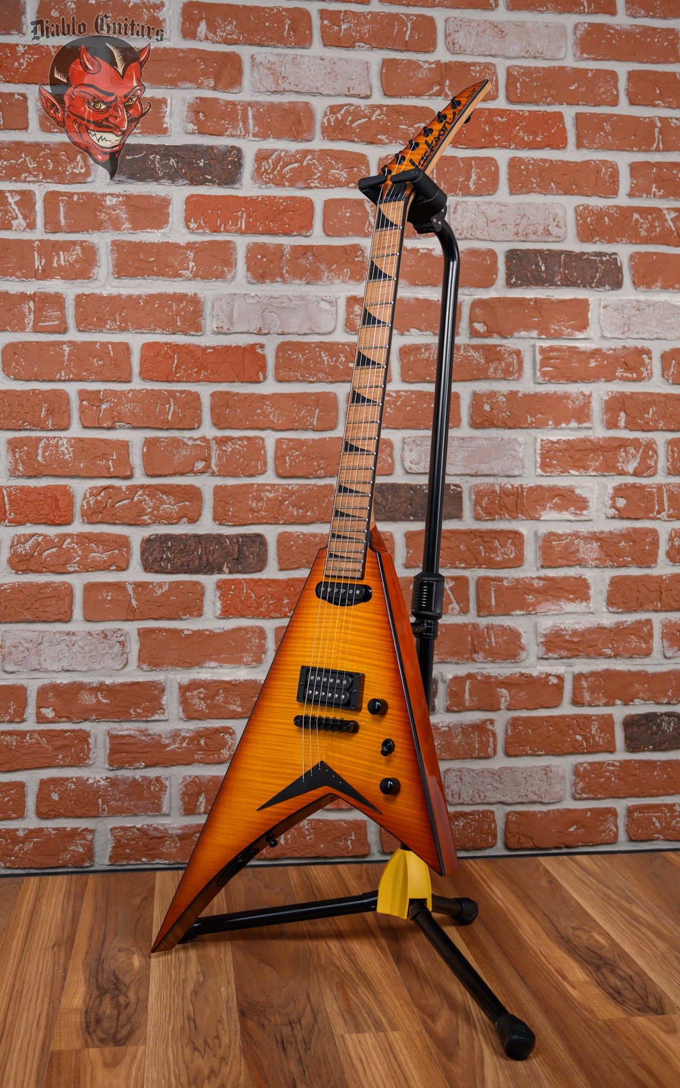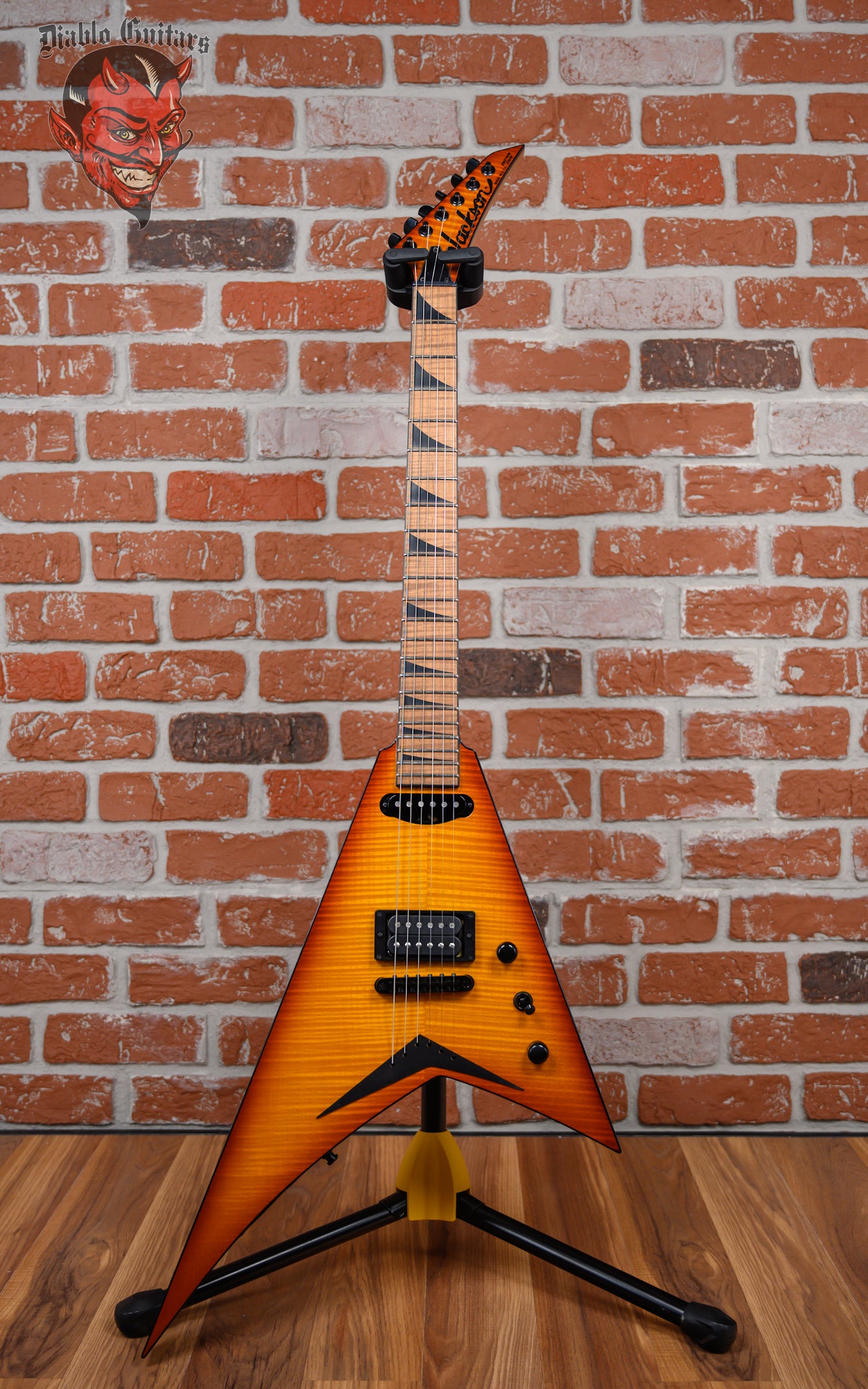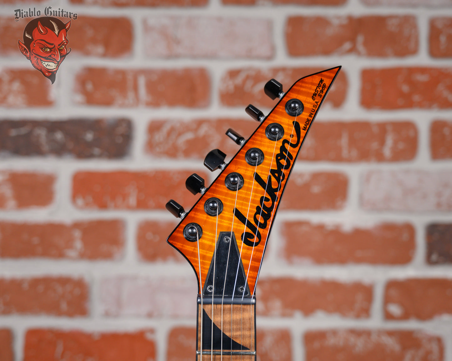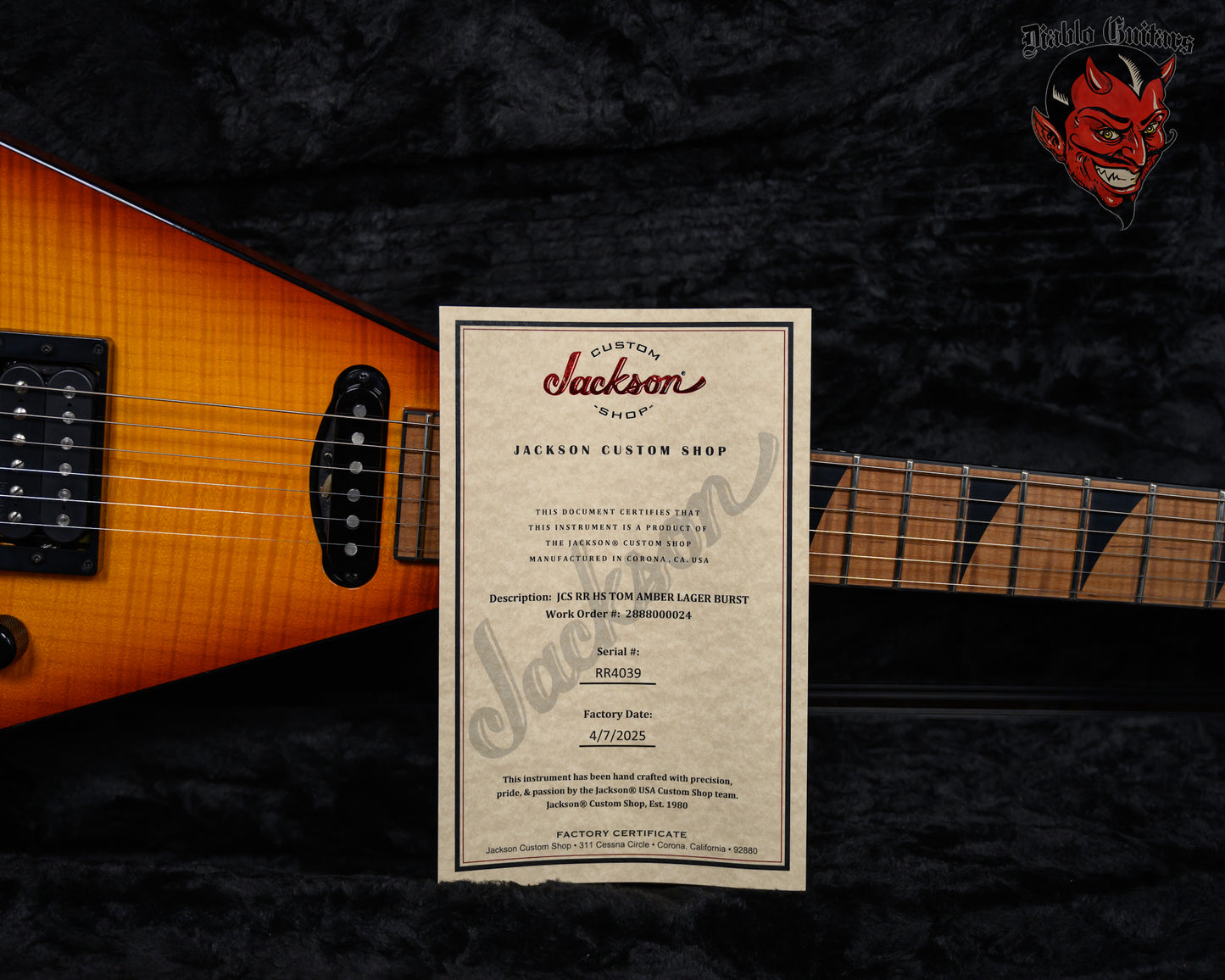 Jackson USA Custom Shop RR HS TOM Rhoads Flame Maple Top in Amber Lager Burst finish made in 2025 with Original Hard Shell Case. This guitar features a Solid Mahogany body with a bound Flamed Maple slab top, Caramelized Maple neck-thru and bound Carmalized Flame Maple fingerboard with a Bound, Color Matched Flame Maple Overlay headstock. Equipped with a Fender Handwound Texas Special single coil in the neck position and a DiMarzio Tone Zone in the bridge position. Controlled by 1 Volume, 1 Tone pot and a 3-Way Toggle Switch. The 25.5" scale length neck has Black Sharkfin inlays and Luminlay side markers with 22 Jumbo frets on a Compound 12"-16" radius with a Standard profile. The hardware is comprised of Black Schaller Sealed Diecast Locking tuning machines with Cloche heads, a Graphtech Black Tusq nut, a Gotoh Tune-o-matic bridge-string-thru body bridge and Black Knurled Dome knobs.