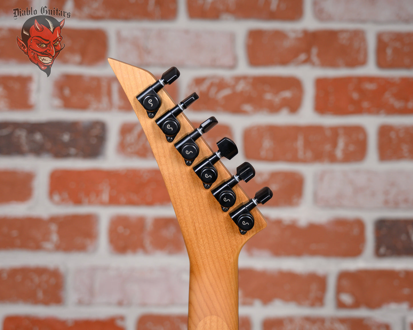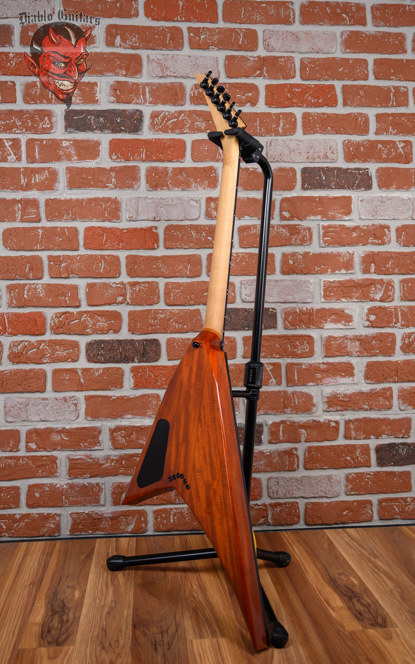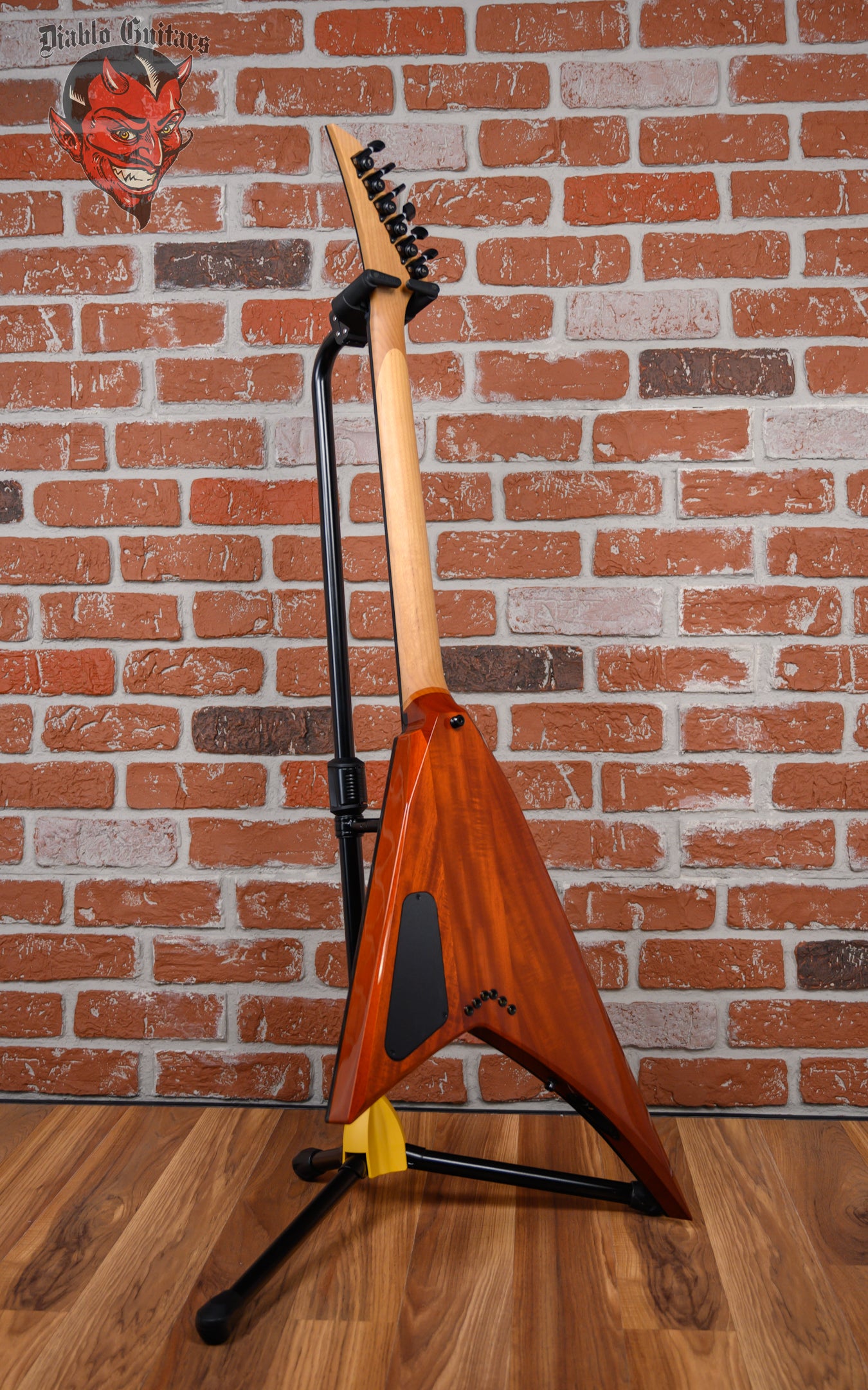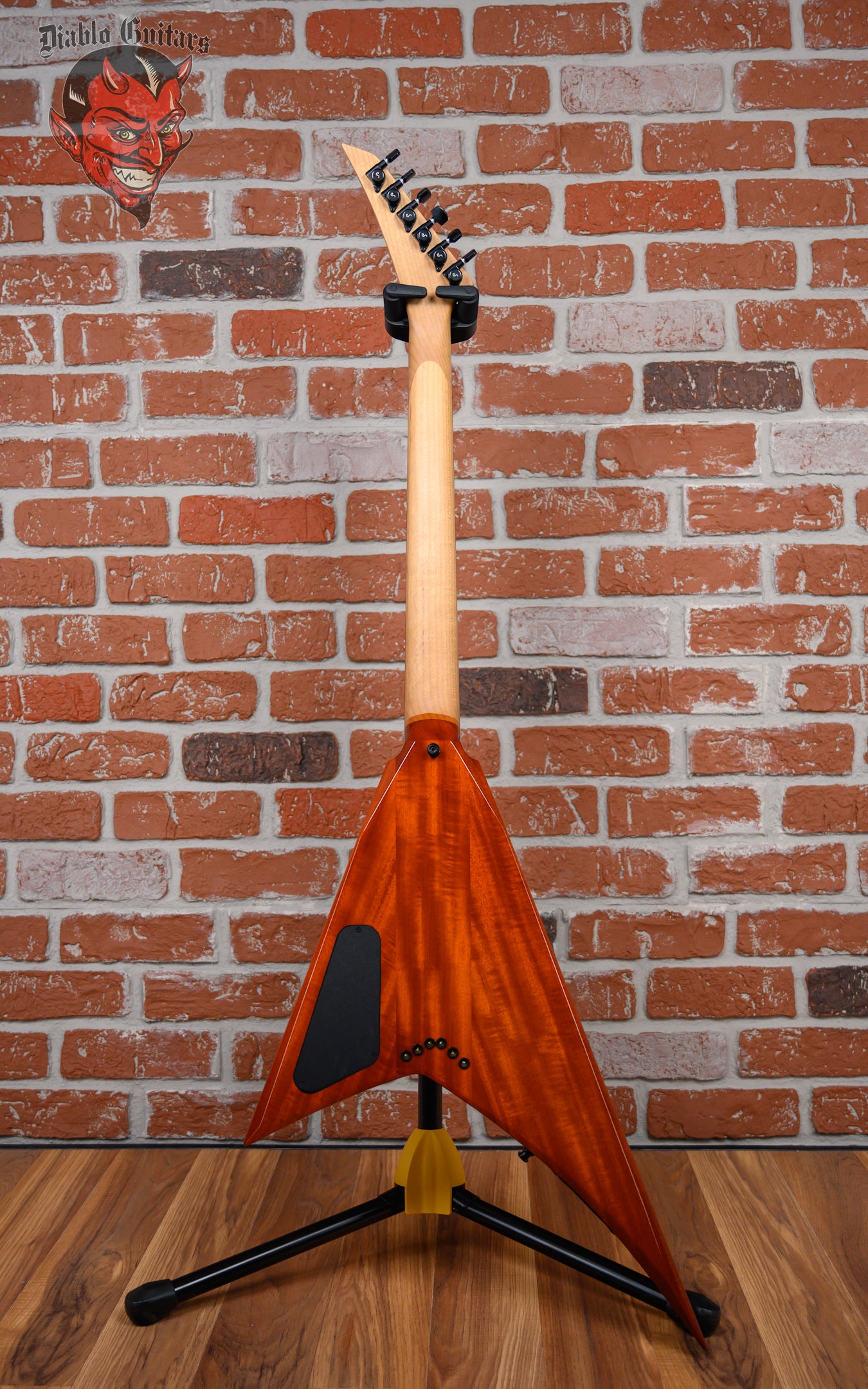 Jackson USA Custom Shop RR HS TOM Rhoads Flame Maple Top in Amber Lager Burst finish made in 2025 with Original Hard Shell Case. This guitar features a Solid Mahogany body with a bound Flamed Maple slab top, Caramelized Maple neck-thru and bound Carmalized Flame Maple fingerboard with a Bound, Color Matched Flame Maple Overlay headstock. Equipped with a Fender Handwound Texas Special single coil in the neck position and a DiMarzio Tone Zone in the bridge position. Controlled by 1 Volume, 1 Tone pot and a 3-Way Toggle Switch. The 25.5" scale length neck has Black Sharkfin inlays and Luminlay side markers with 22 Jumbo frets on a Compound 12"-16" radius with a Standard profile. The hardware is comprised of Black Schaller Sealed Diecast Locking tuning machines with Cloche heads, a Graphtech Black Tusq nut, a Gotoh Tune-o-matic bridge-string-thru body bridge and Black Knurled Dome knobs.