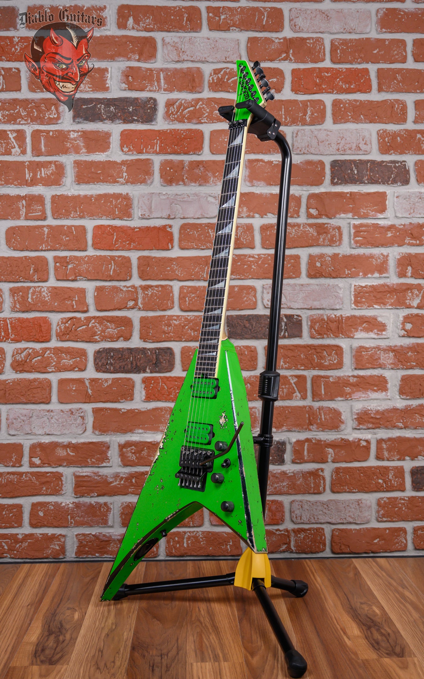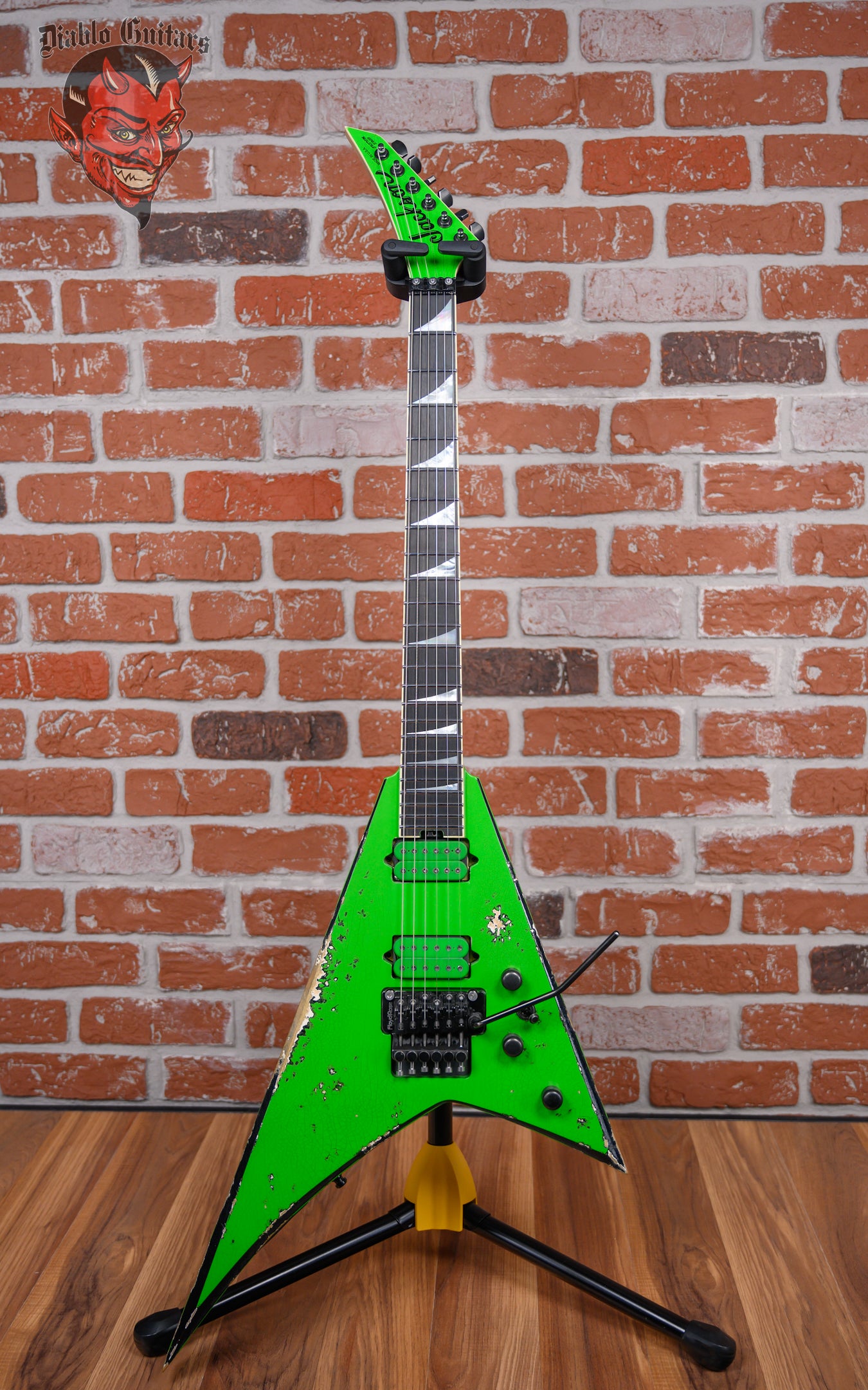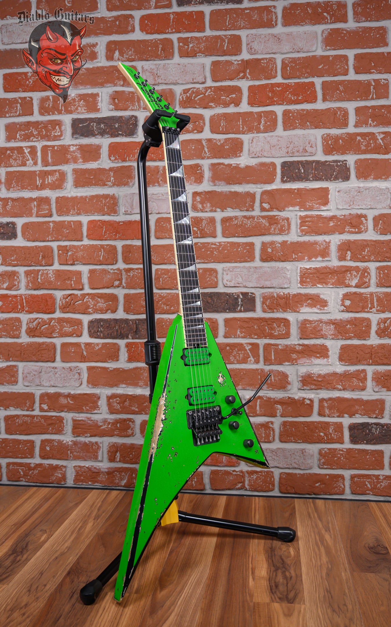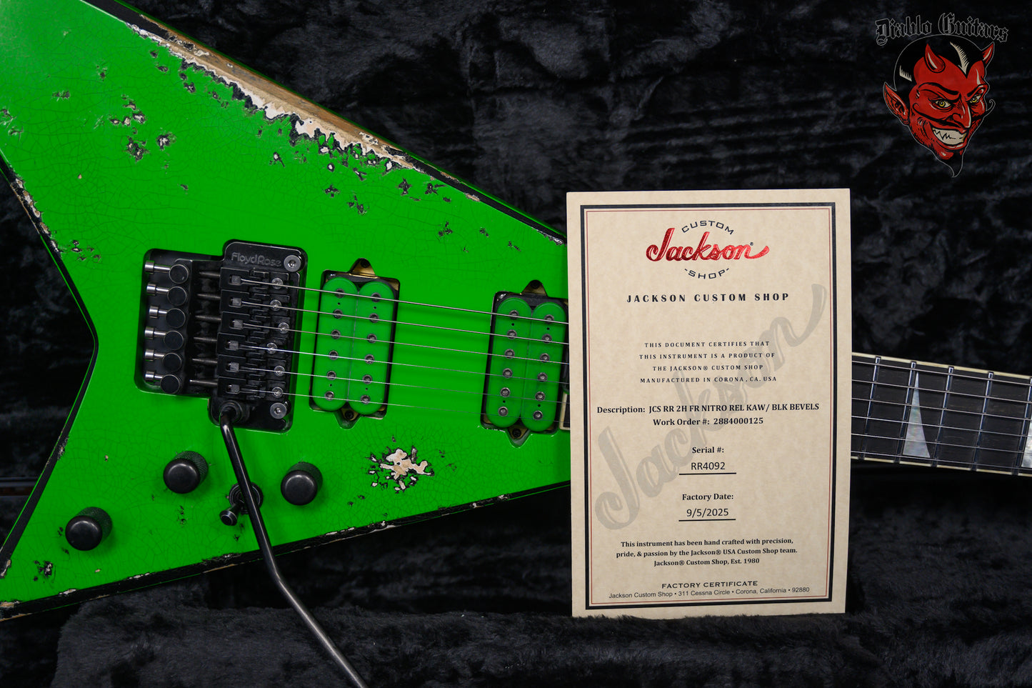 Jackson USA Custom Shop RR24 2H FR Rhoads in Kawasabi Green with Black Bevels Nitro Relic finish made in 2025 with Original Hard Shell Case. This guitar features a solid alder body, quartersawn maple neck-thru and bound ebony fingerboard with a reverse bound and color matched headstock. Equipped with a pair of DiMarzio green bobbin humbuckers, PAF Pro in the neck position and a Super DIstortion in the bridge position. Controlled by 1-EVH 500k low friction volume pot, 2-EVH 250k high friction tone pots and a 3-Way toggle switch. The 25.5" scale length neck has mother of pearl reverse sharkfin inlays and luminlay side markers with 24 jumbo stainless steel frets on a compound 12"-16" radius with a standard profile. The hardware is comprised of aged black Gotoh Sealed Die-Cast tuning machines with cloche heads, a Floyd Rose Locking nut, a Floyd Rose Original Double Locking Tremolo bridge with FU-Tone Titanium Upgrades /Brass Block and black knurled dome knobs.
