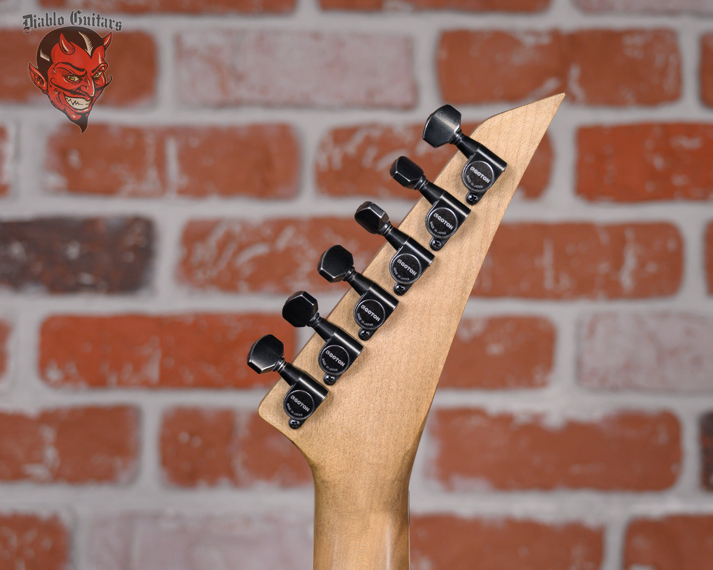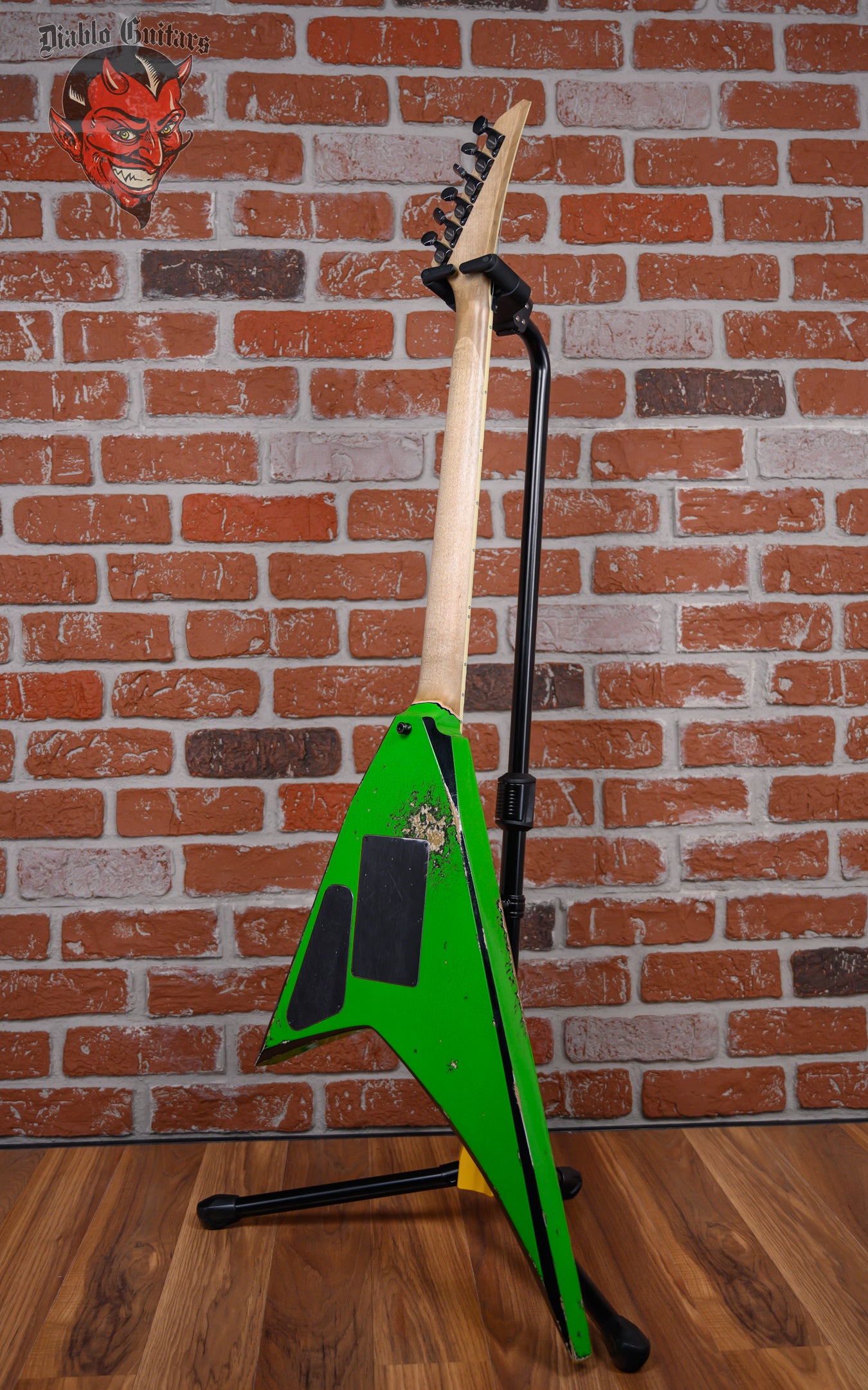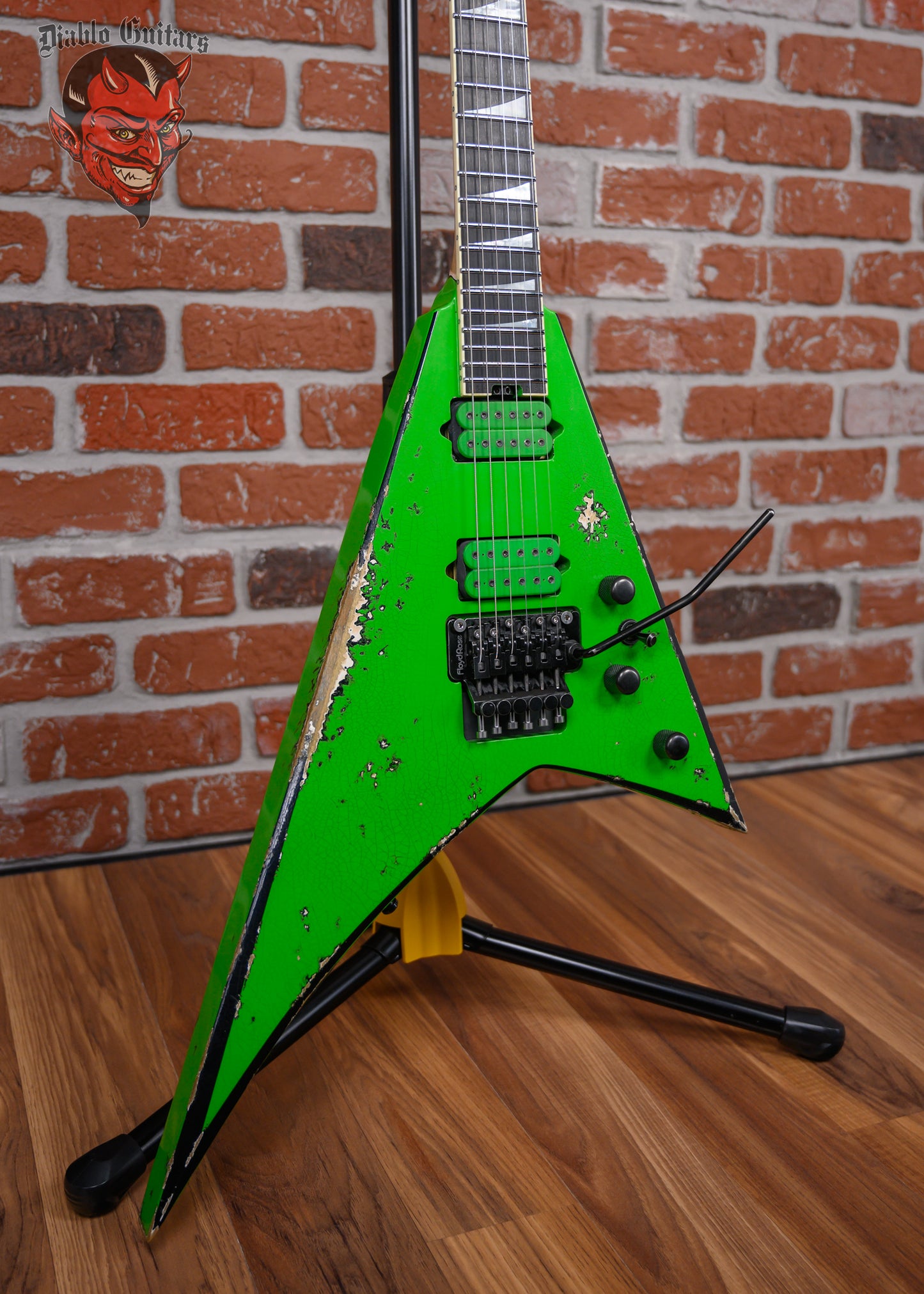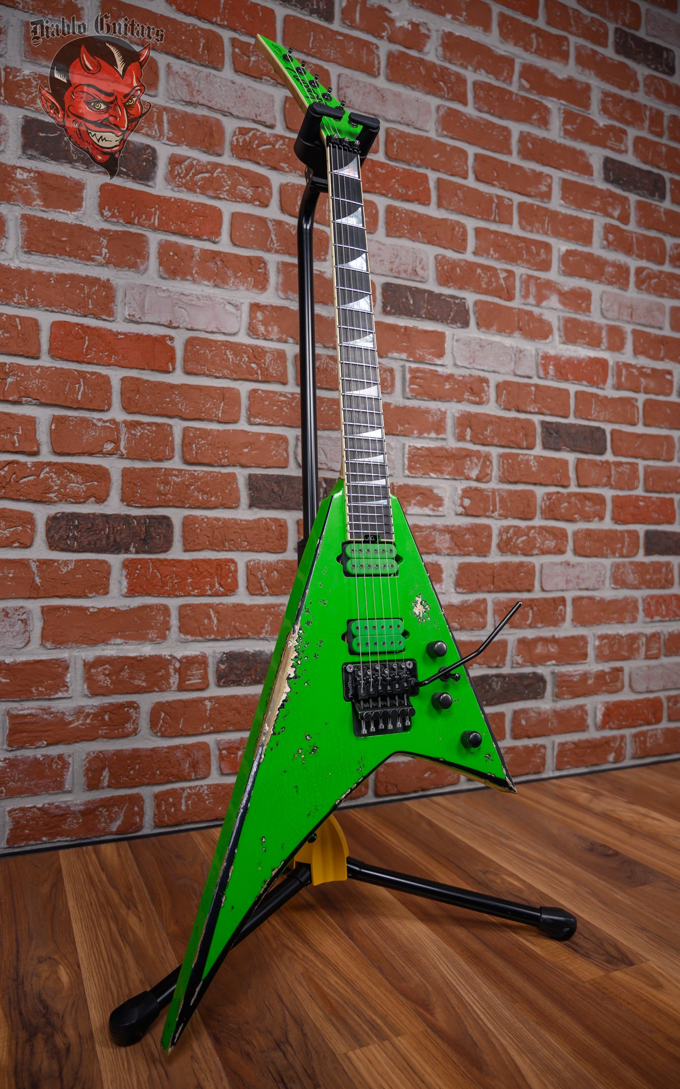 Jackson USA Custom Shop RR24 2H FR Rhoads in Kawasabi Green with Black Bevels Nitro Relic finish made in 2025 with Original Hard Shell Case. This guitar features a solid alder body, quartersawn maple neck-thru and bound ebony fingerboard with a reverse bound and color matched headstock. Equipped with a pair of DiMarzio green bobbin humbuckers, PAF Pro in the neck position and a Super DIstortion in the bridge position. Controlled by 1-EVH 500k low friction volume pot, 2-EVH 250k high friction tone pots and a 3-Way toggle switch. The 25.5" scale length neck has mother of pearl reverse sharkfin inlays and luminlay side markers with 24 jumbo stainless steel frets on a compound 12"-16" radius with a standard profile. The hardware is comprised of aged black Gotoh Sealed Die-Cast tuning machines with cloche heads, a Floyd Rose Locking nut, a Floyd Rose Original Double Locking Tremolo bridge with FU-Tone Titanium Upgrades /Brass Block and black knurled dome knobs.