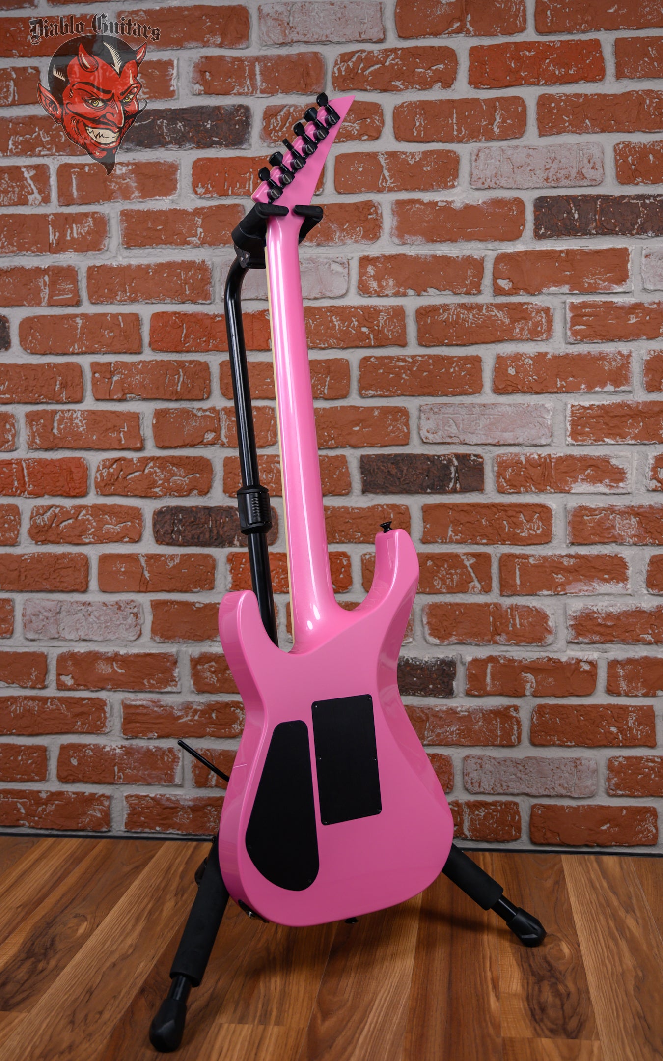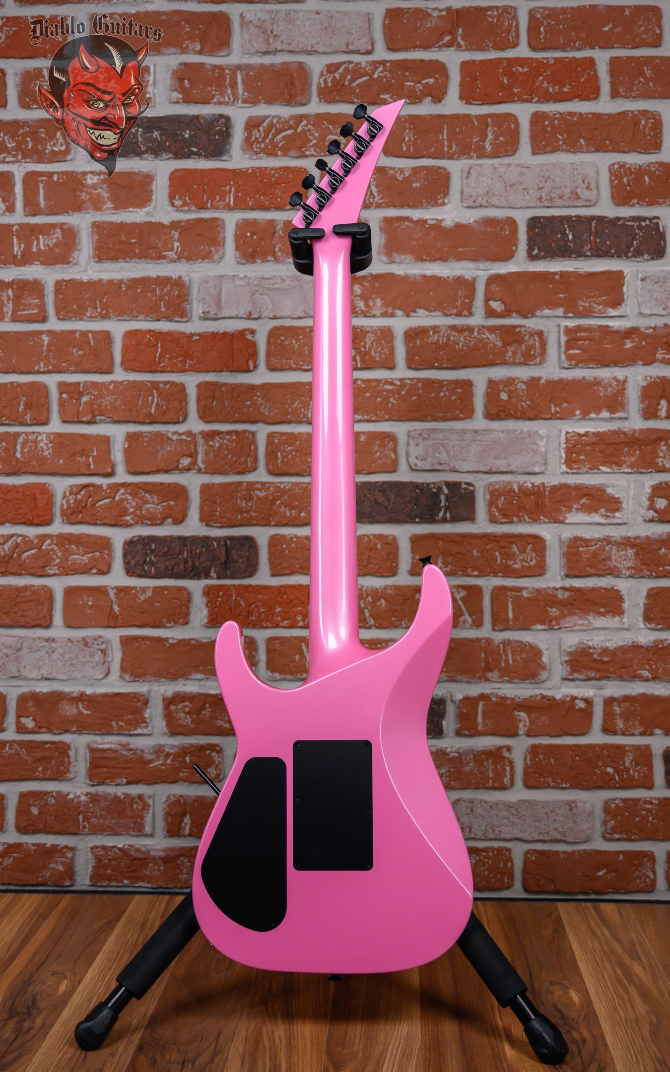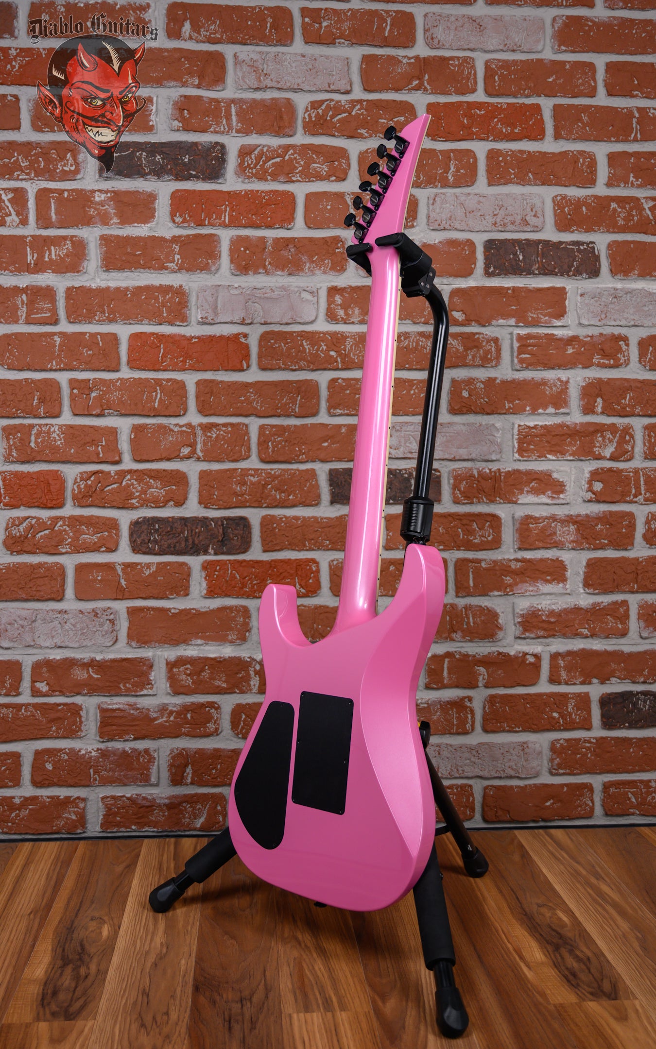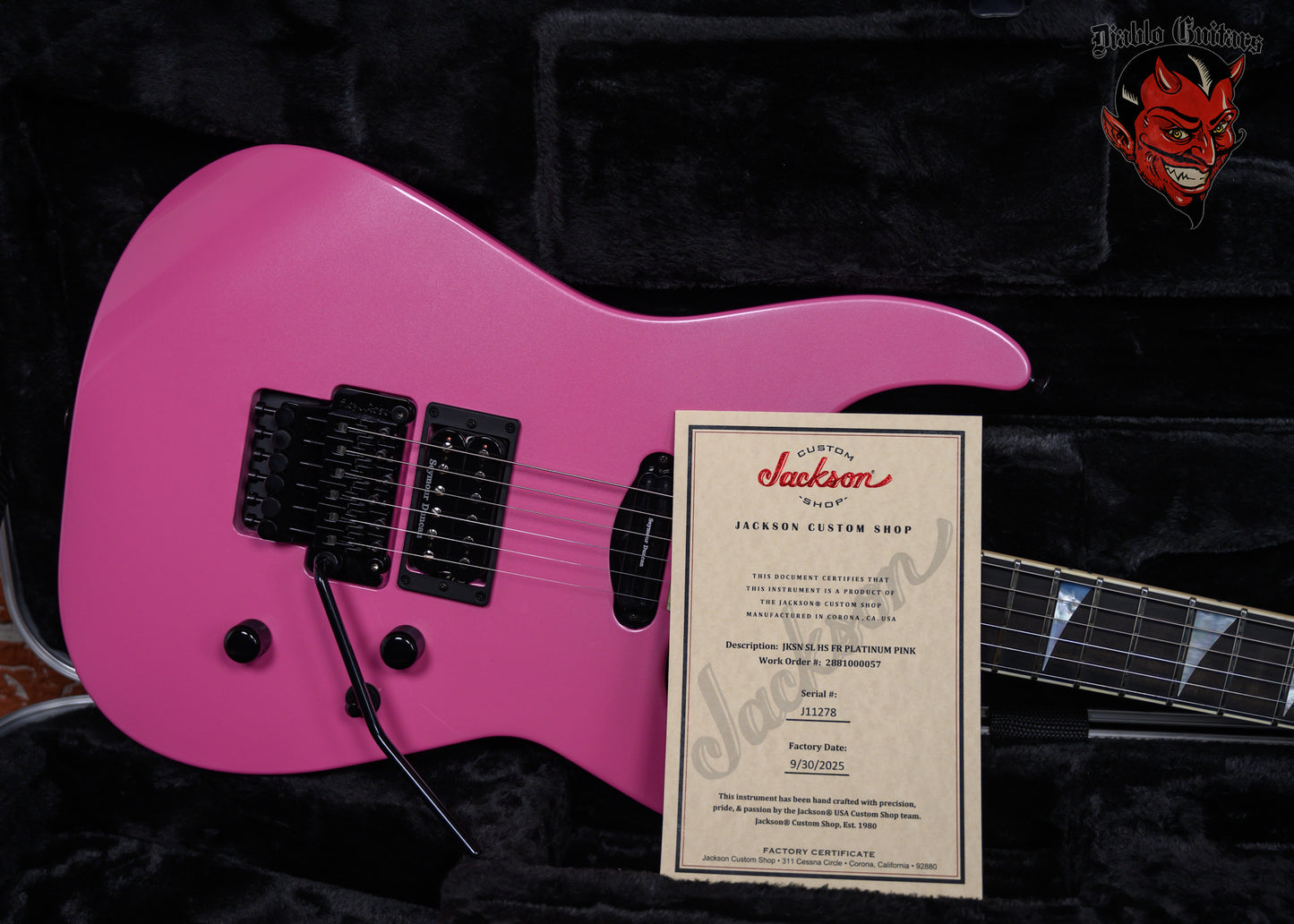 New Jackson USA Custom Shop SL HS FR Soloist in Platinum Pink finish made in 2025 with Original Hard Shell Case. This guitar features a solid alder body, quartersawn maple neck-thru and bound ebony fingerboard with a reverse, bound headstock. Equipped with a Seymour Duncan Hot Rails in the neck position and a Seymour Duncan Custom 5 in the bridge position. Controlled by 1 volume, 1 tone pot and a 3-Way toggle switch in the SLX ‘A' Configuration. The 25.5" scale length neck has mother of pearl sharkfin inlays and black side markers with 24 jumbo frets on a compound 12"-16" radius with a standard profile. The hardware is comprised of black Gotoh Sealed Die-Cast tuning machines with cloche heads, a Floyd Rose Locking nut, a Floyd Rose Original Double Locking Tremolo bridge, and black knurled dome knobs.