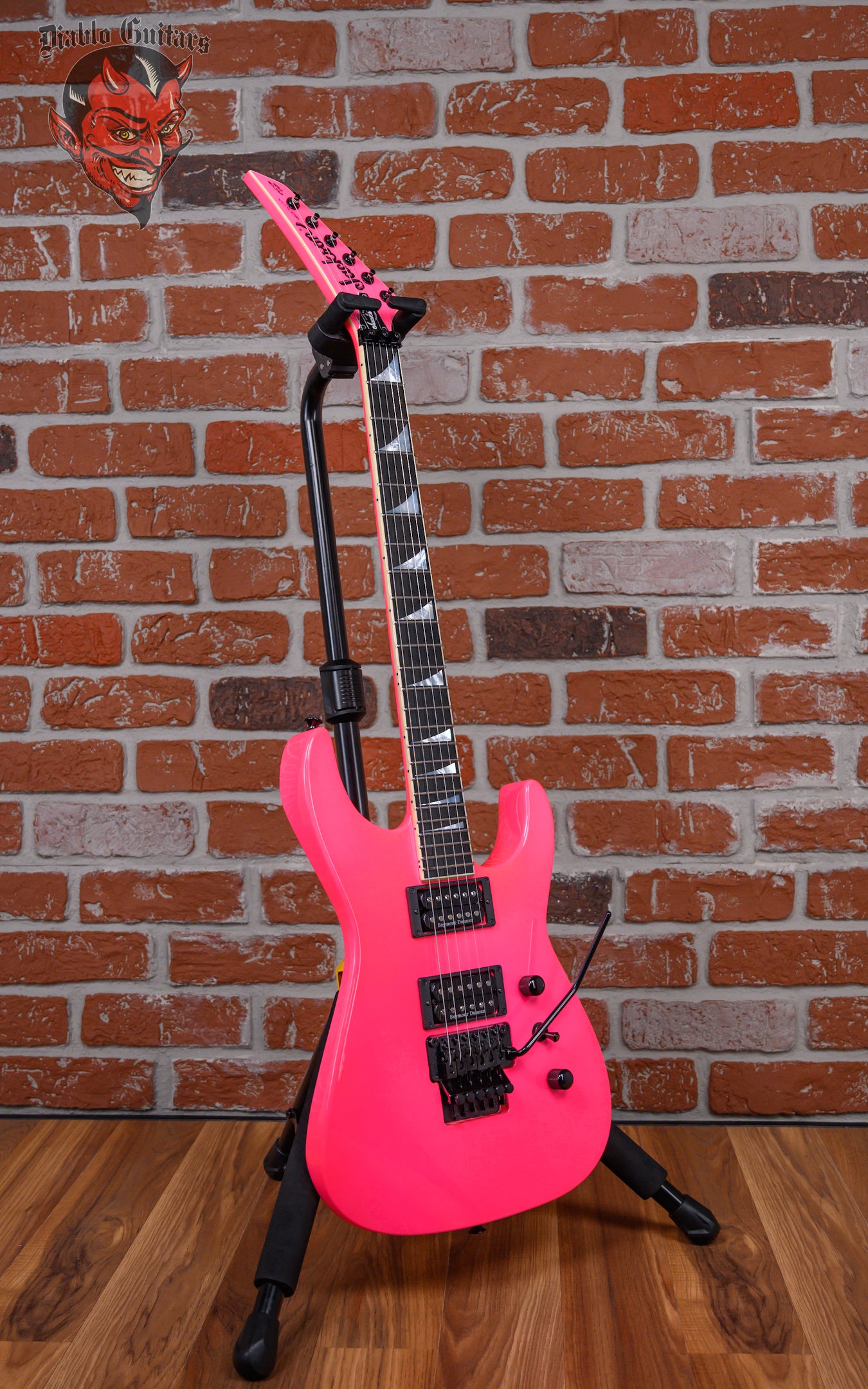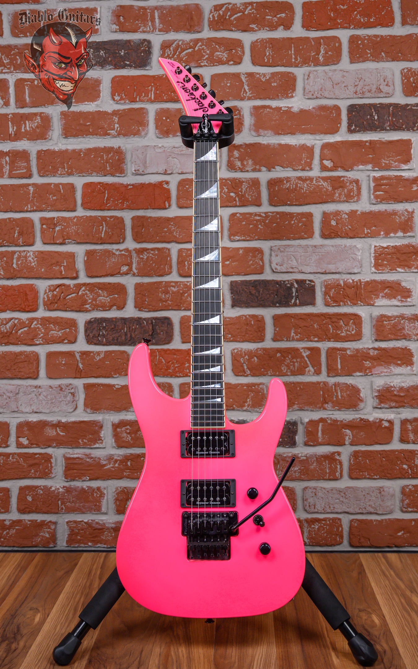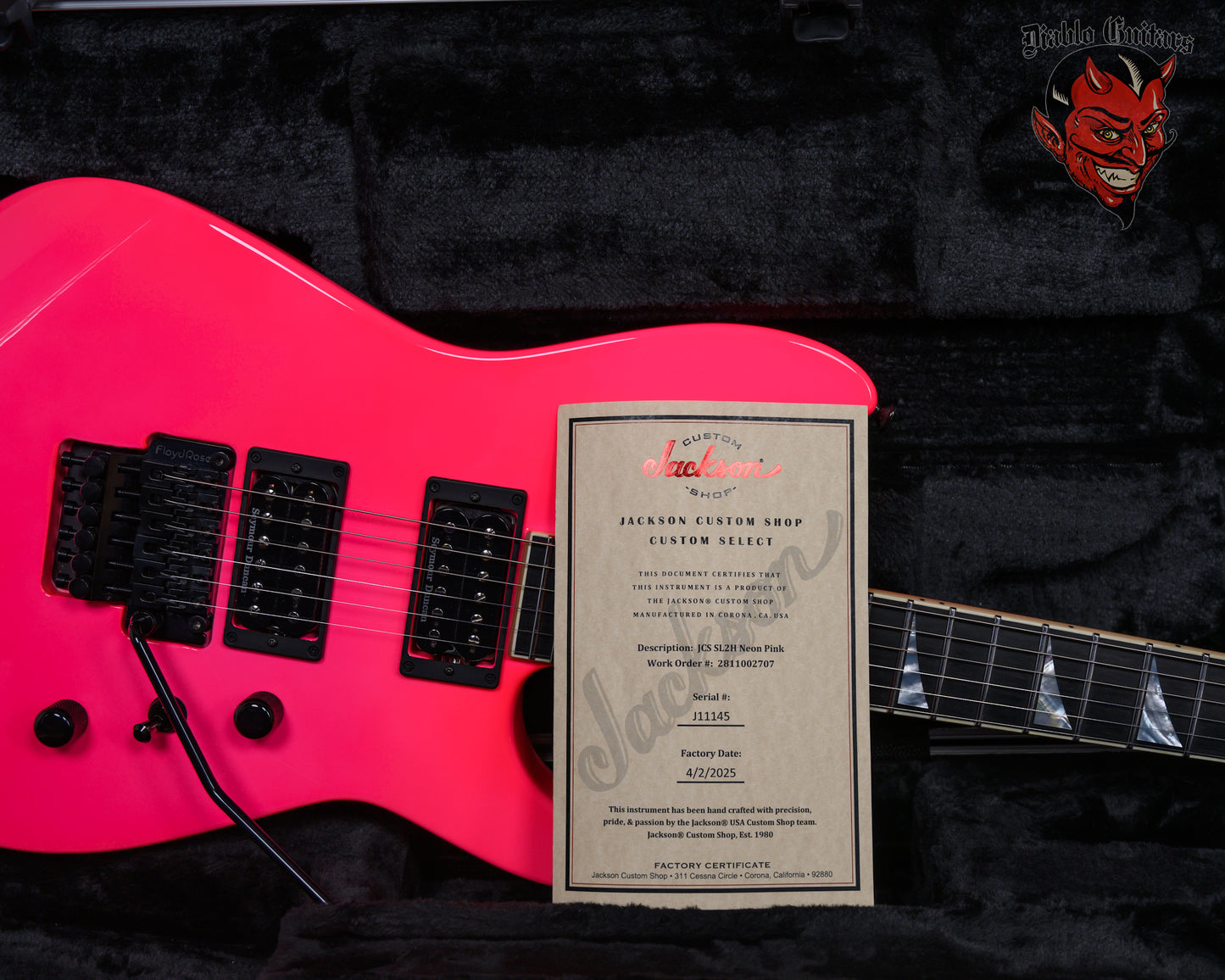 Jackson USA Custom Shop SL2H Soloist in Neon Pink finish made in 2025 with Original Hard Shell Case. This guitar features a solid alder body, quartersawn maple neck-thru and bound ebony fingerboard with a bound color matched headstock. Equipped with a Seymour Duncan SH-1N ‘59 in the neck position and a Seymour Duncan TB-4 JB in the bridge position. Controlled by 1 volume, 1 tone pot and a 3-Way toggle switch. The 25.5" scale length neck has mother of pearl sharkfin inlays and black side markers with 24 jumbo frets on a compound 12"-16" radius with a standard neck profile. The hardware is comprised of black gotoh sealed Die-Cast tuning machines with cloche heads, a Floyd Rose locking nut, a Floyd Rose original double locking tremolo and black knurled dome knobs.