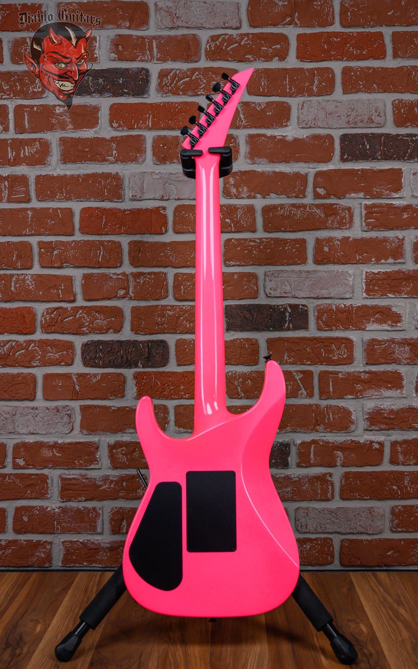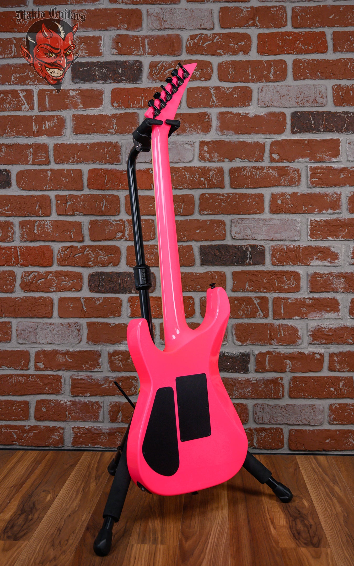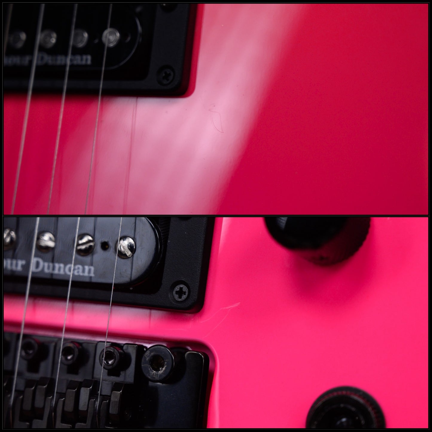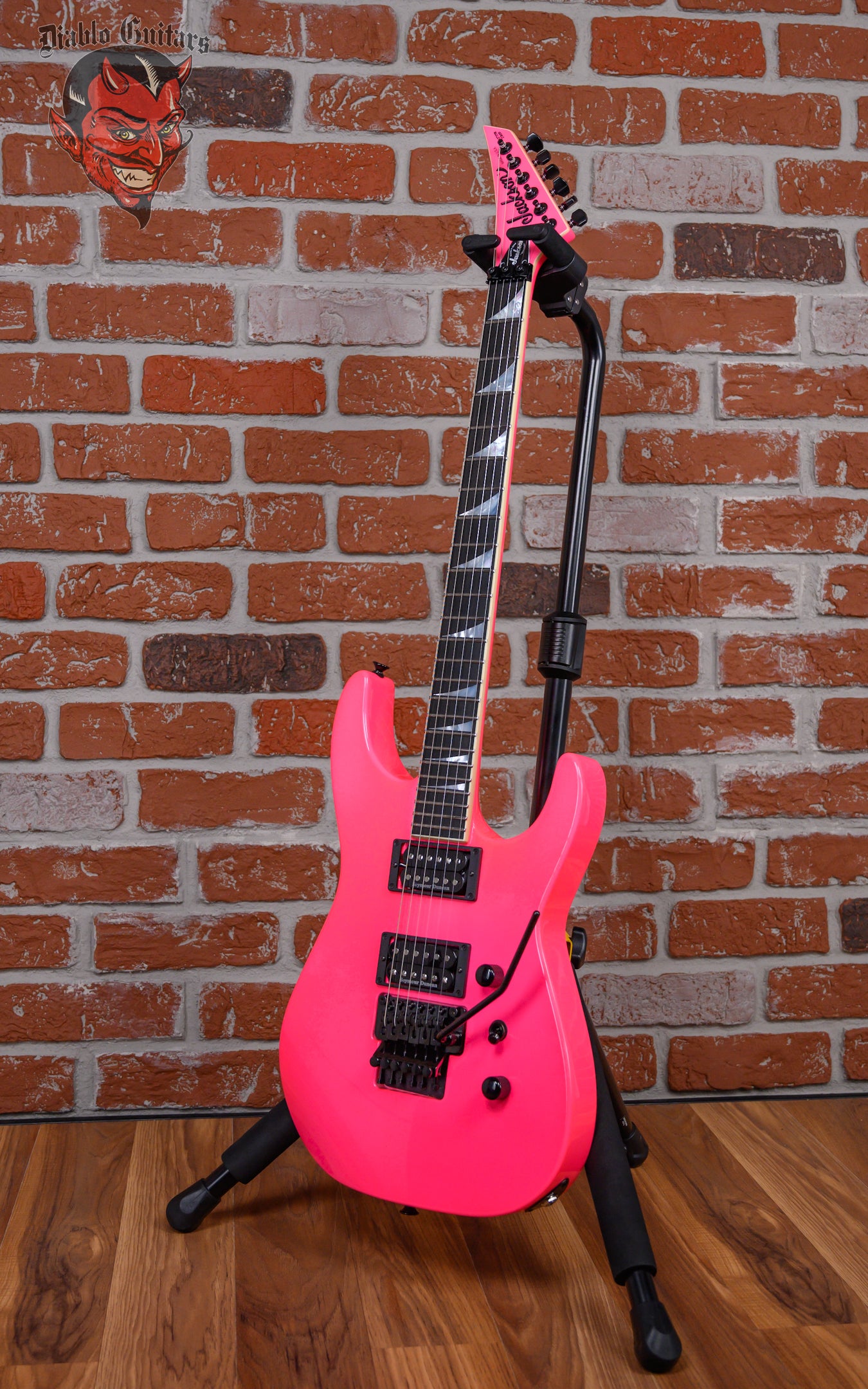 Jackson USA Custom Shop SL2H Soloist in Neon Pink finish made in 2025 with Original Hard Shell Case. This guitar features a solid alder body, quartersawn maple neck-thru and bound ebony fingerboard with a bound color matched headstock. Equipped with a Seymour Duncan SH-1N ‘59 in the neck position and a Seymour Duncan TB-4 JB in the bridge position. Controlled by 1 volume, 1 tone pot and a 3-Way toggle switch. The 25.5" scale length neck has mother of pearl sharkfin inlays and black side markers with 24 jumbo frets on a compound 12"-16" radius with a standard neck profile. The hardware is comprised of black gotoh sealed Die-Cast tuning machines with cloche heads, a Floyd Rose locking nut, a Floyd Rose original double locking tremolo and black knurled dome knobs.
