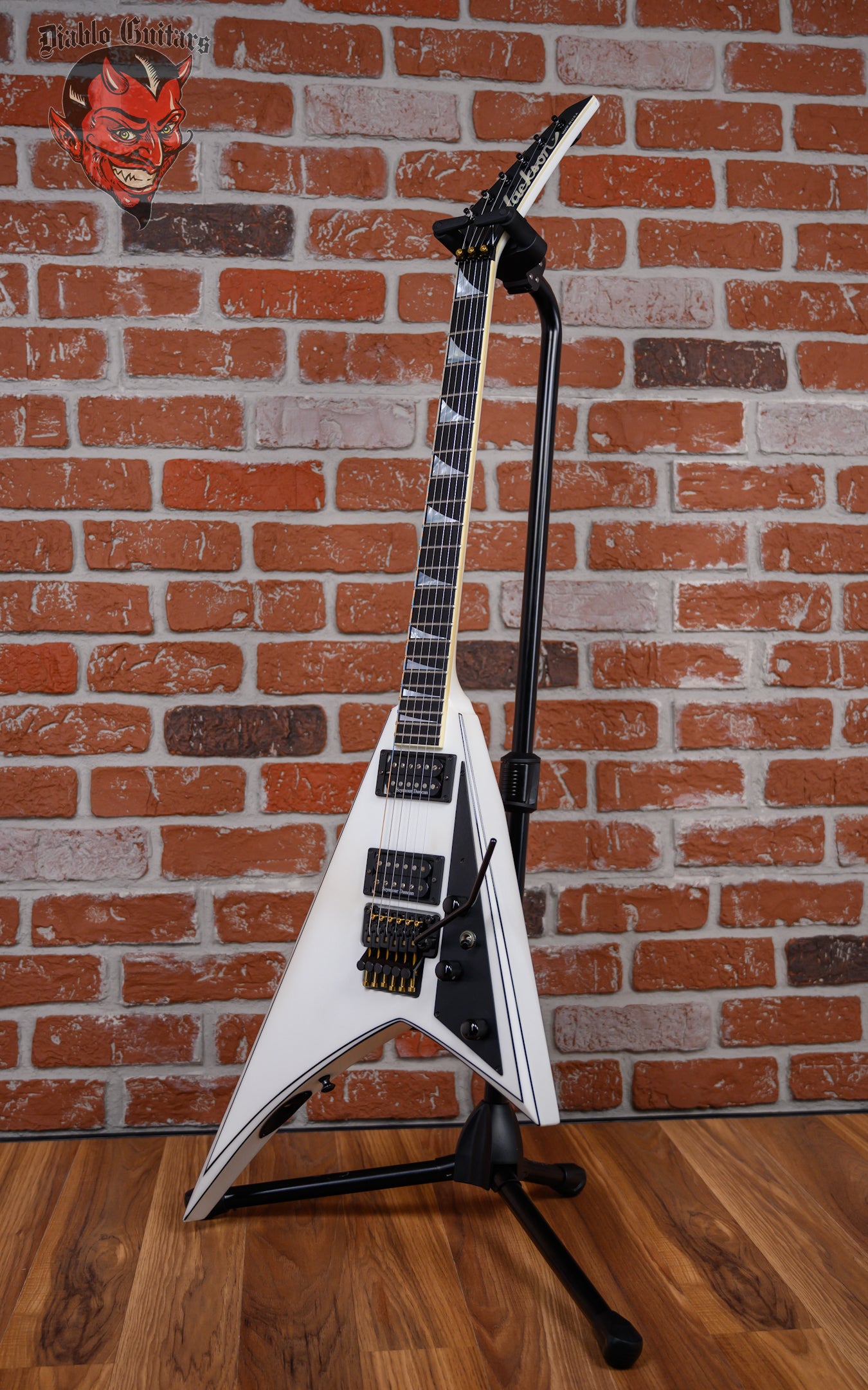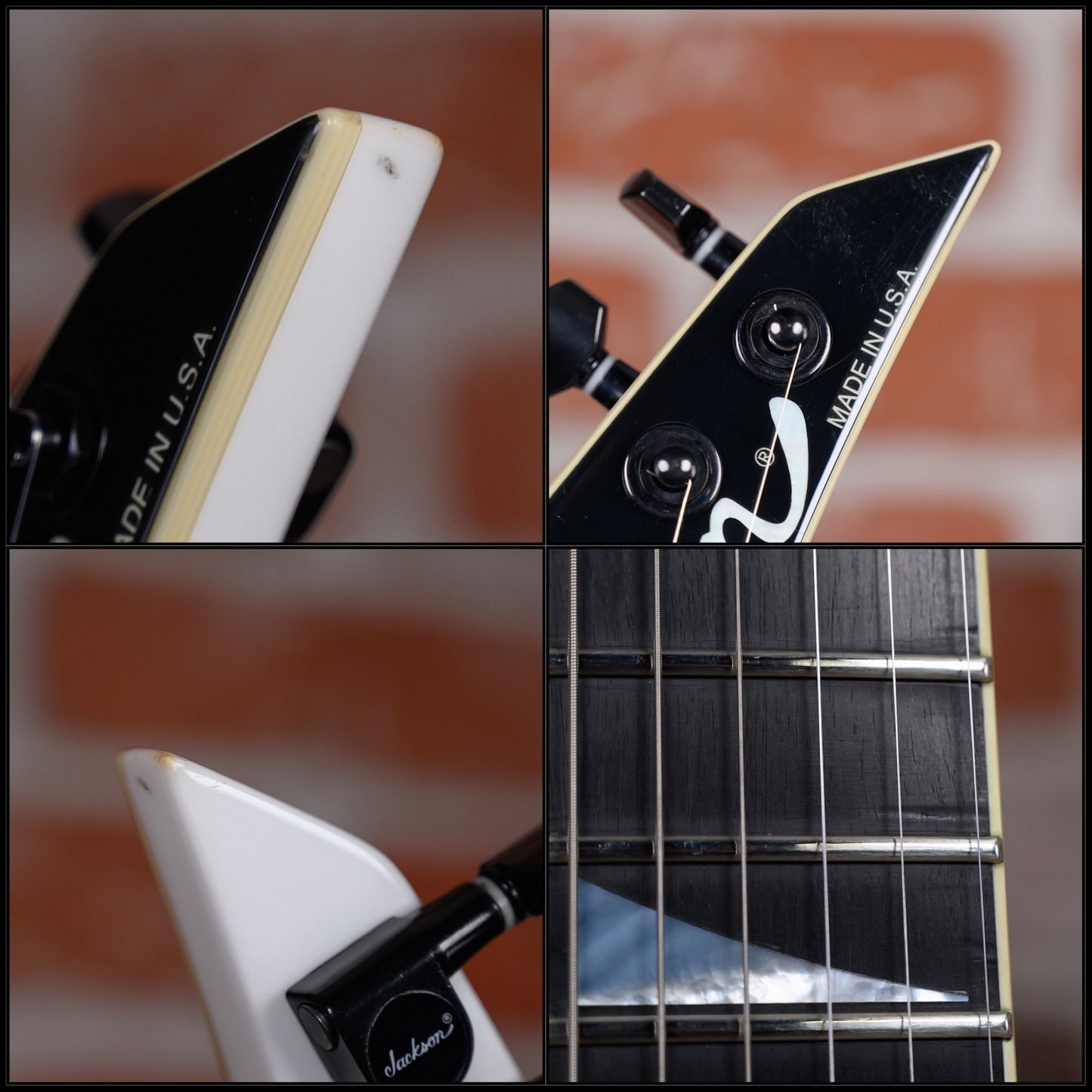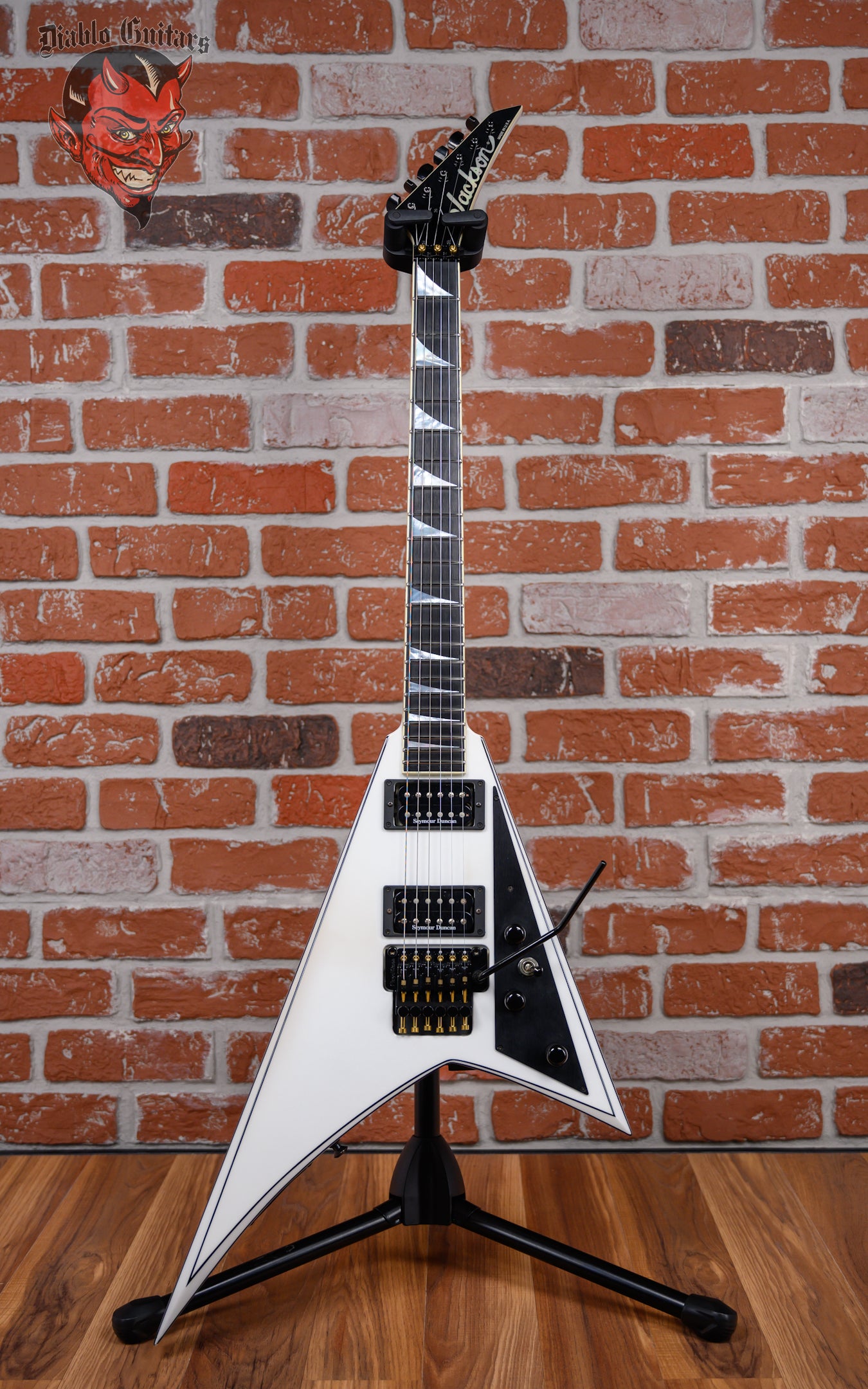 Jackson USA Select RR1 Rhoads in Snow White with Black Pinstripes finish made in 2010 with Original Hard Shell Case. This guitar features a solid alder body, quartersawn maple neck-thru and bound ebony fingerboard with a bound headstock. Equipped with a Seymour Duncan SH2N Jazz in the neck position and a Seymour Duncan TB-4 JB in the bridge position. Controlled by 1 volume, 2 tone pots and a 3-Way toggle switch. The 25.5" scale length neck has mother of pearl sharkfin inlays and Black side markers with 22 jumbo frets on a compound 12"-16" radius with a standard profile. The hardware is comprised of Black Jackson Sealed Diecast tuning machines with cloche heads, a Floyd Rose Locking nut with FU-Tone Gold Titanium Bolts, a Floyd Rose Original Double Locking Tremolo bridge with upgrade FU-Tone Gold Titanium Hardware and Black knurled dome knobs with a anodized Black pickguard.