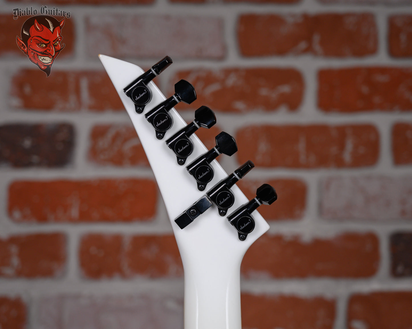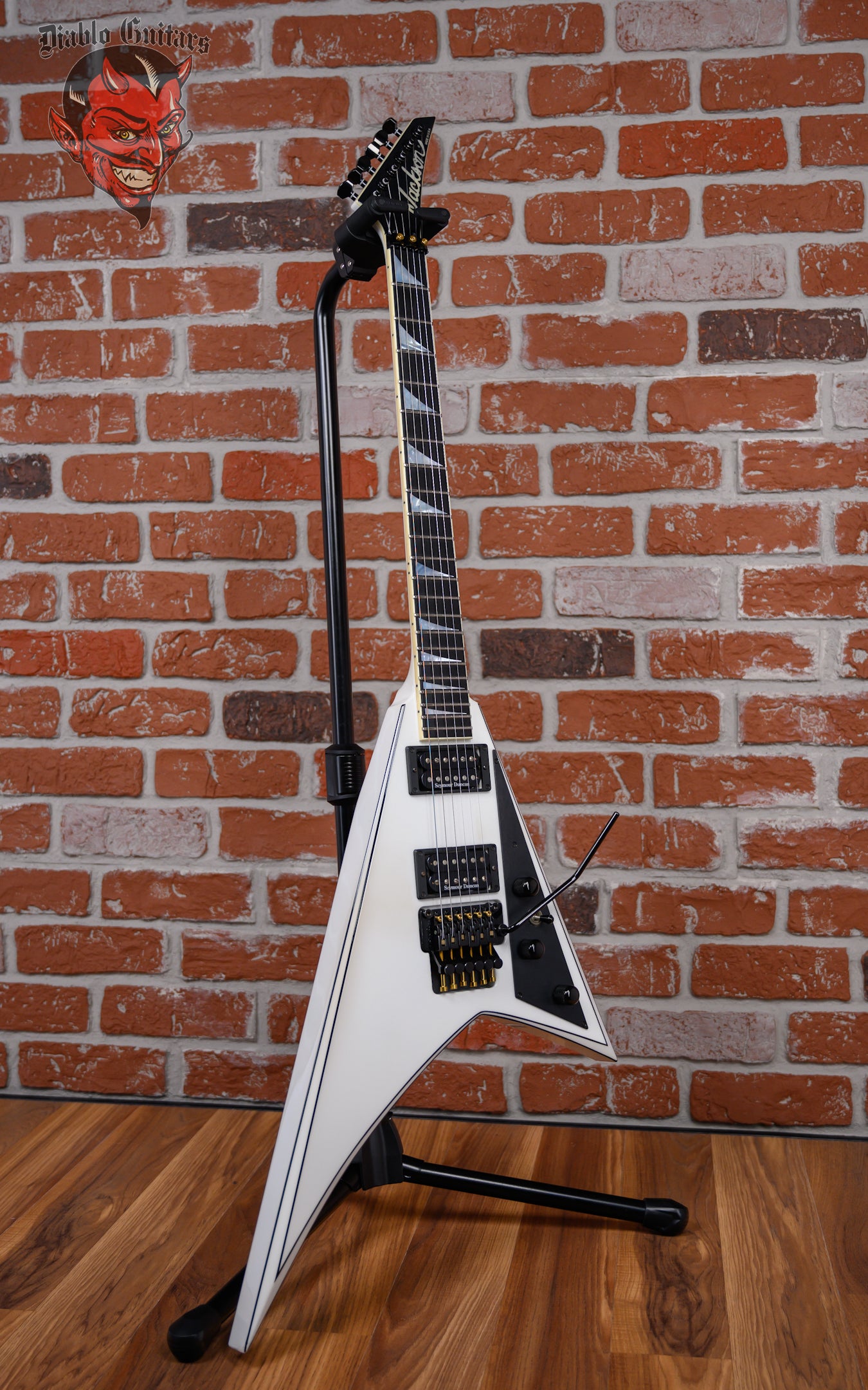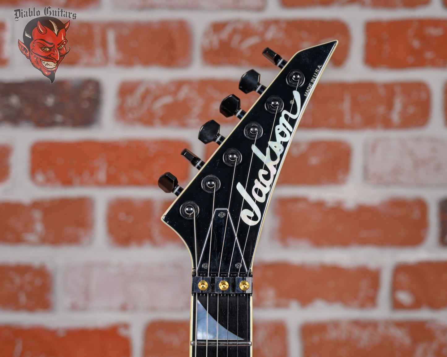 Jackson USA Select RR1 Rhoads in Snow White with Black Pinstripes finish made in 2010 with Original Hard Shell Case. This guitar features a solid alder body, quartersawn maple neck-thru and bound ebony fingerboard with a bound headstock. Equipped with a Seymour Duncan SH2N Jazz in the neck position and a Seymour Duncan TB-4 JB in the bridge position. Controlled by 1 volume, 2 tone pots and a 3-Way toggle switch. The 25.5" scale length neck has mother of pearl sharkfin inlays and Black side markers with 22 jumbo frets on a compound 12"-16" radius with a standard profile. The hardware is comprised of Black Jackson Sealed Diecast tuning machines with cloche heads, a Floyd Rose Locking nut with FU-Tone Gold Titanium Bolts, a Floyd Rose Original Double Locking Tremolo bridge with upgrade FU-Tone Gold Titanium Hardware and Black knurled dome knobs with a anodized Black pickguard.