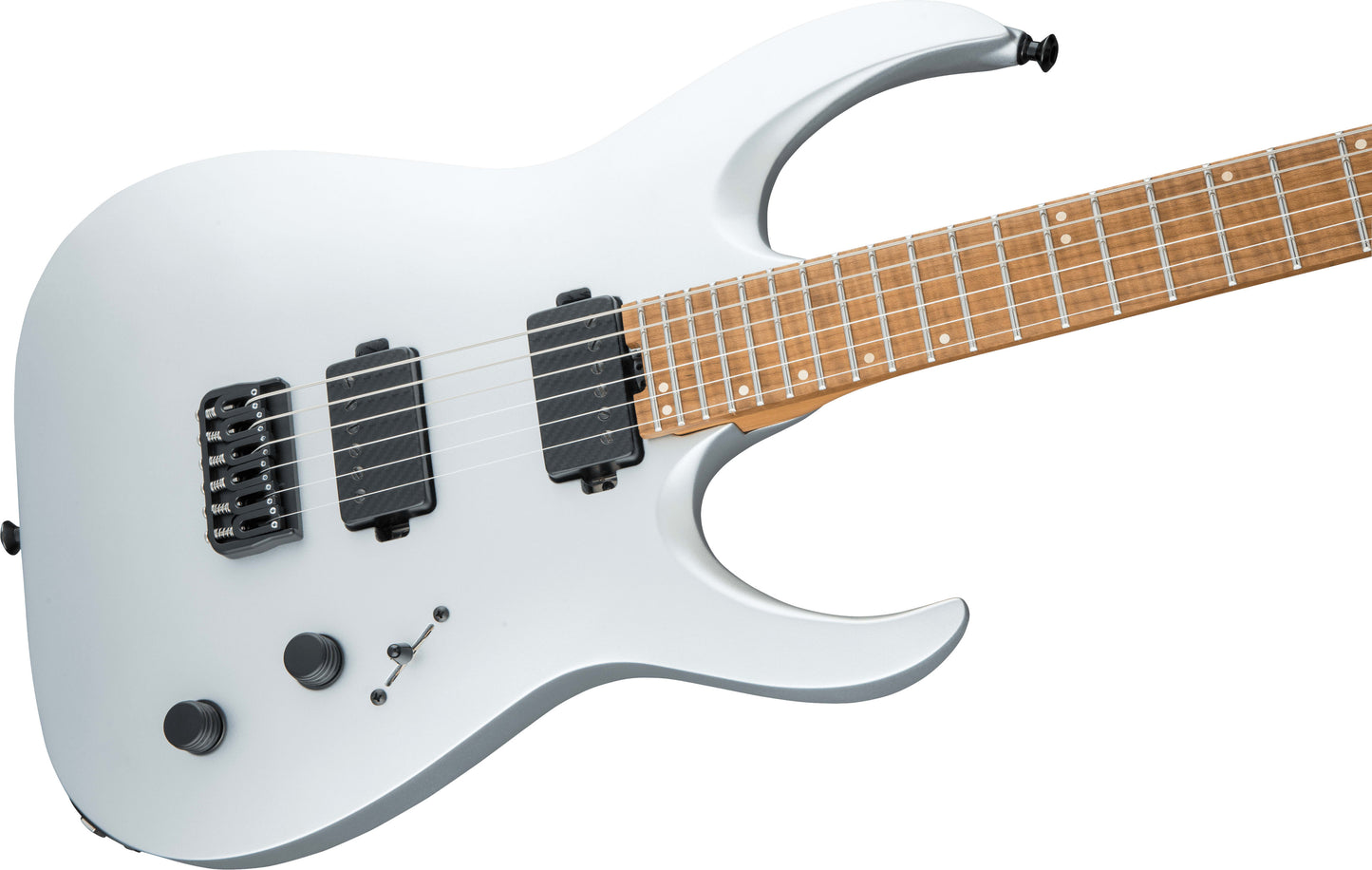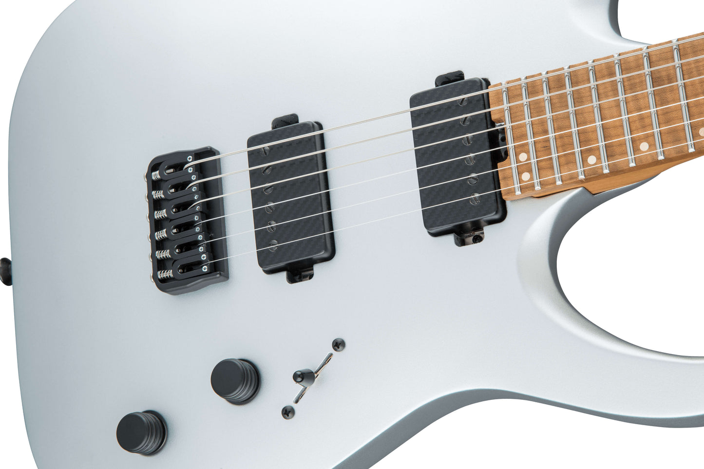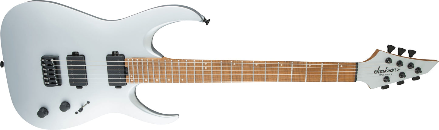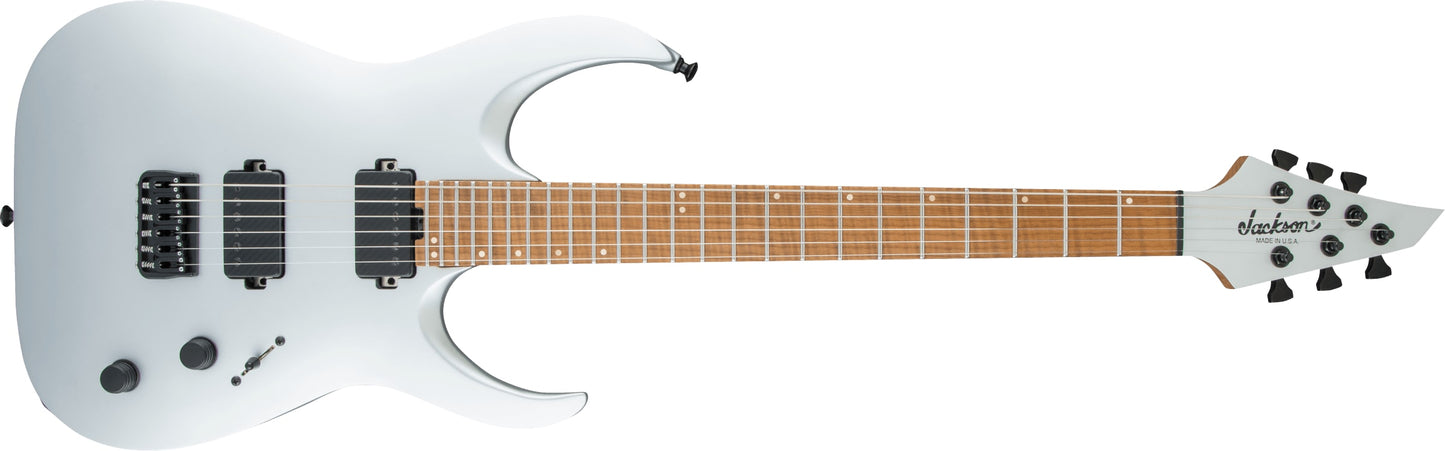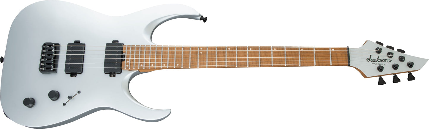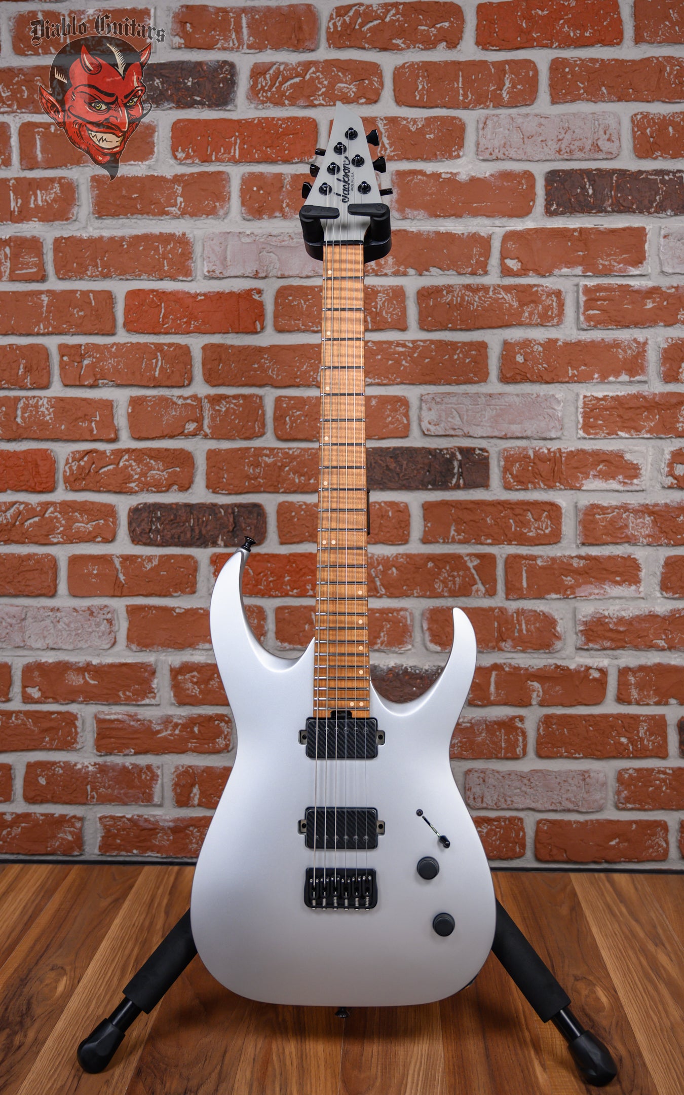 Regular price $4,364.99New USA Signature Misha Mansoor Juggernaut Ht6 in Satin Silver finish made in 2023 with Original Hard Shell Case (B-Stock). This guitar features a solid caramelized basswood body, caramelized quartersawn maple neck, carmalized flame maple fingerboard with a reverse AT-1 3x3 color matched headstock. Equipped with a pair of Bare Knuckle Carbon Fiber Etched Ragnarok humbuckers in the neck and bridge position. Controlled by 1 volume, 1 tone pot with push/pull tone bypass and a 5-Way blade switch with coil tapping. The 25.5" scale length neck has maple off set dot inlays and luminlay side markers with 24 jumbo stainless steel frets on a 20" radius with a speed profile. The hardware is comprised of black Hipshot Open-Gear Locking tuning machines with keystone heads, a graphtech black tusq XL nut, a Hipshot Hardtail 6 bridge and Hipshot O-Ring knobs.