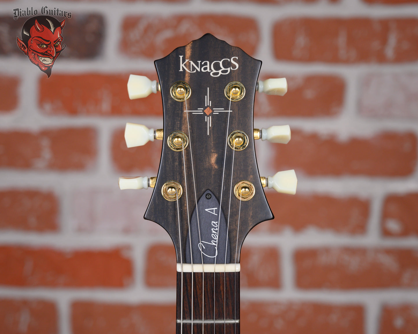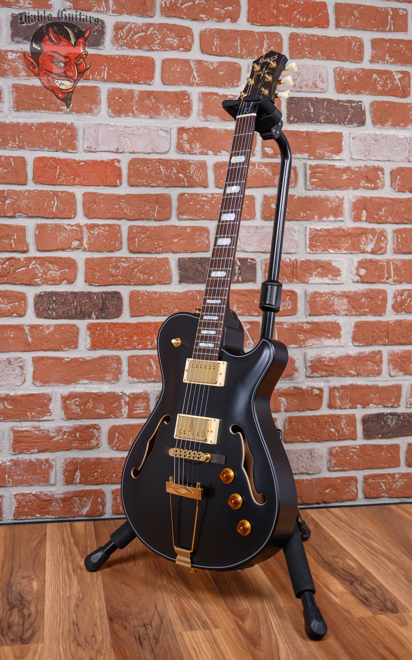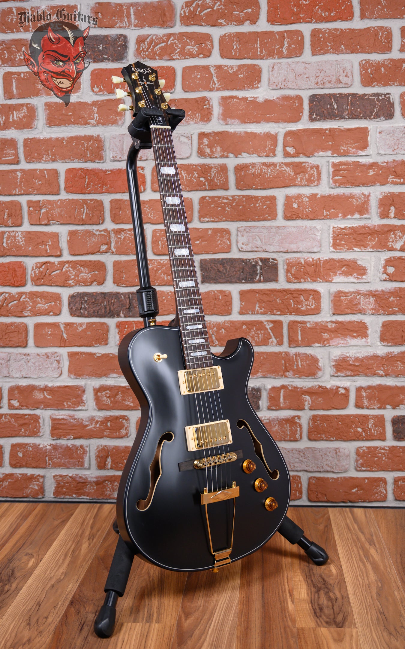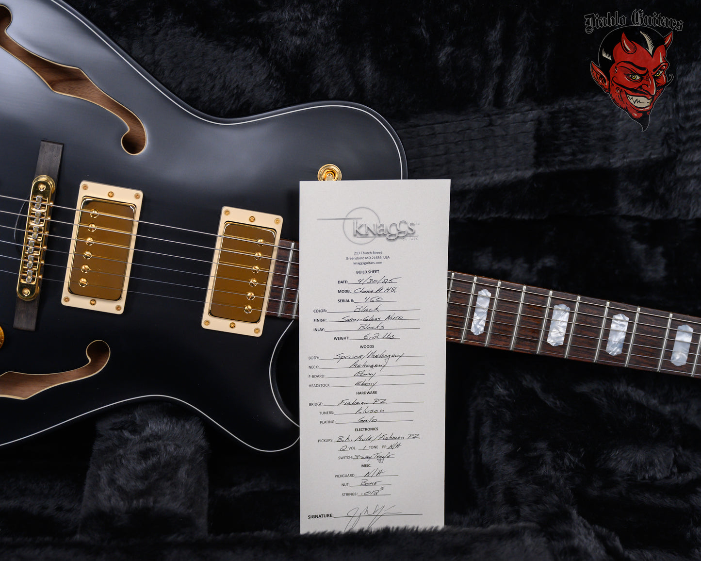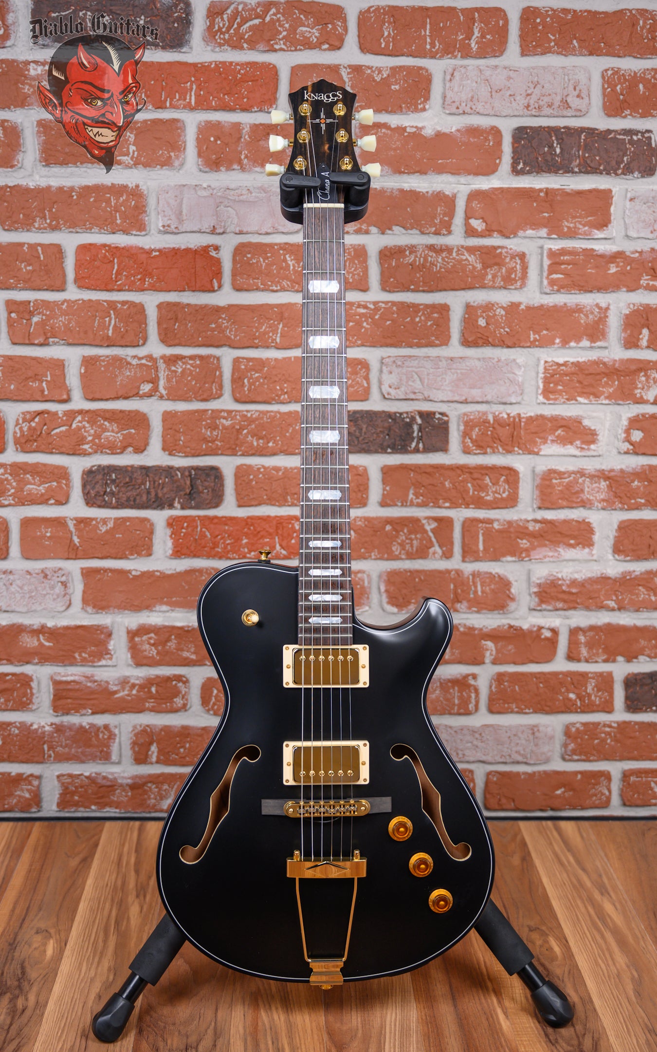Knaggs Chena A H2 in Semi-Gloss Black finish made in 2025 with Original Hard Shell Case. This guitar features a hollow mahogany back&sides body with a bound spruce top, mahogany neck and ebony fingerboard with a rosewood overlay headstock with morning star inlay. Equipped with a pair of bare knuckle mule humbuckers in the neck and bridge position. Controlled by 1-Volume, 1-Tone, 1-Piezo volume and a 3-Way toggle switch. The 24.75" scale length neck has pearloid block inlays and white side markers with 22 medium jumbo frets on a 12" radius with a medium "D" profile. The hardware is comprised of gold Kluson revolution G-Mount locking tuning machines with keystone heads, a bone nut, a Fishman P2 piezo bridge with ebony base and amber top hat knobs.