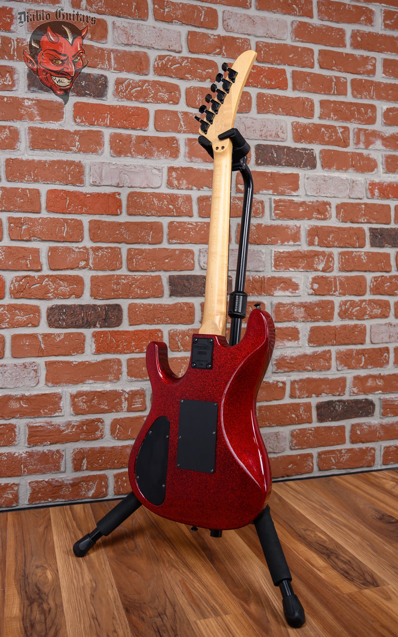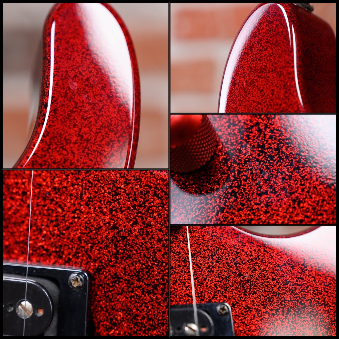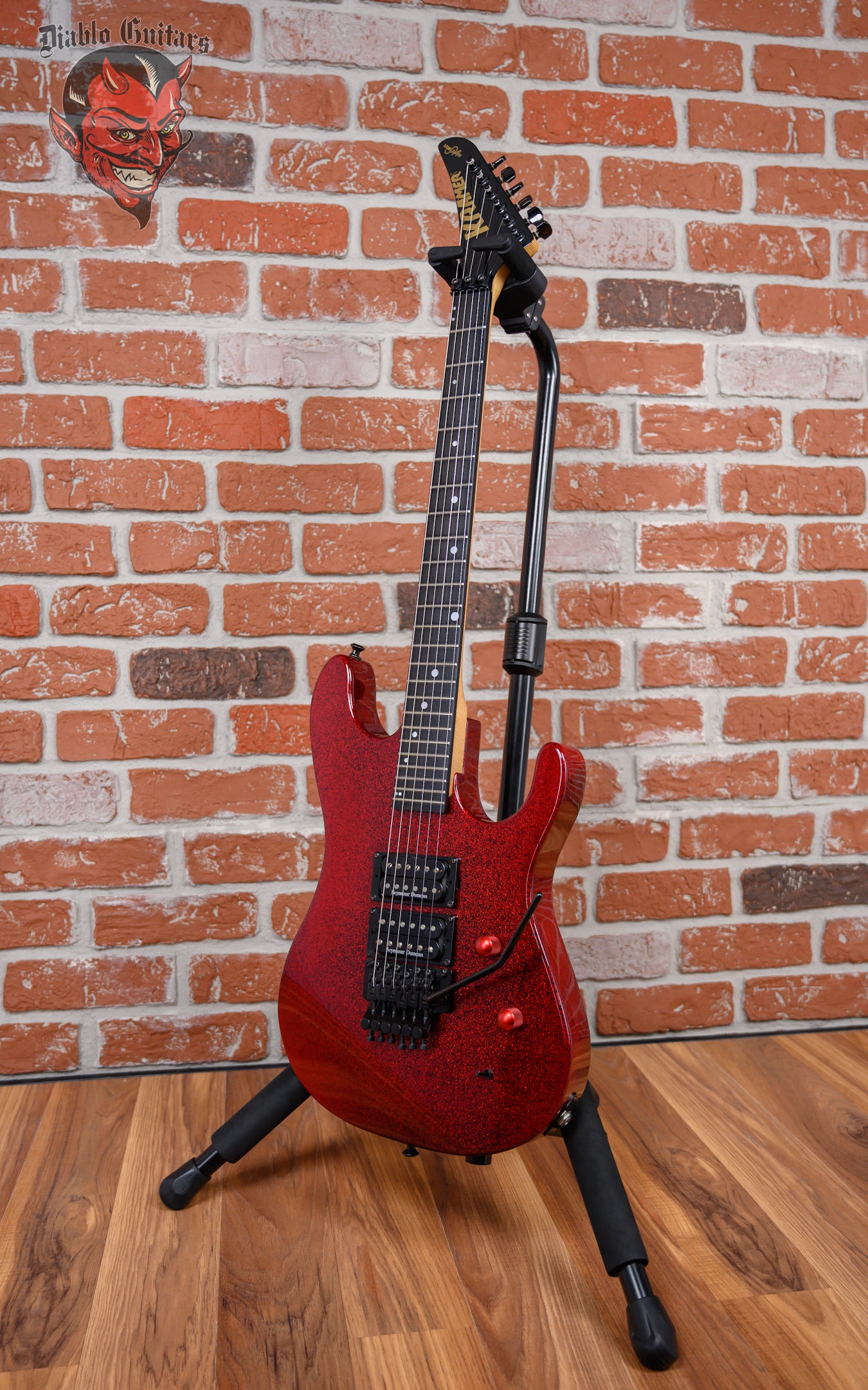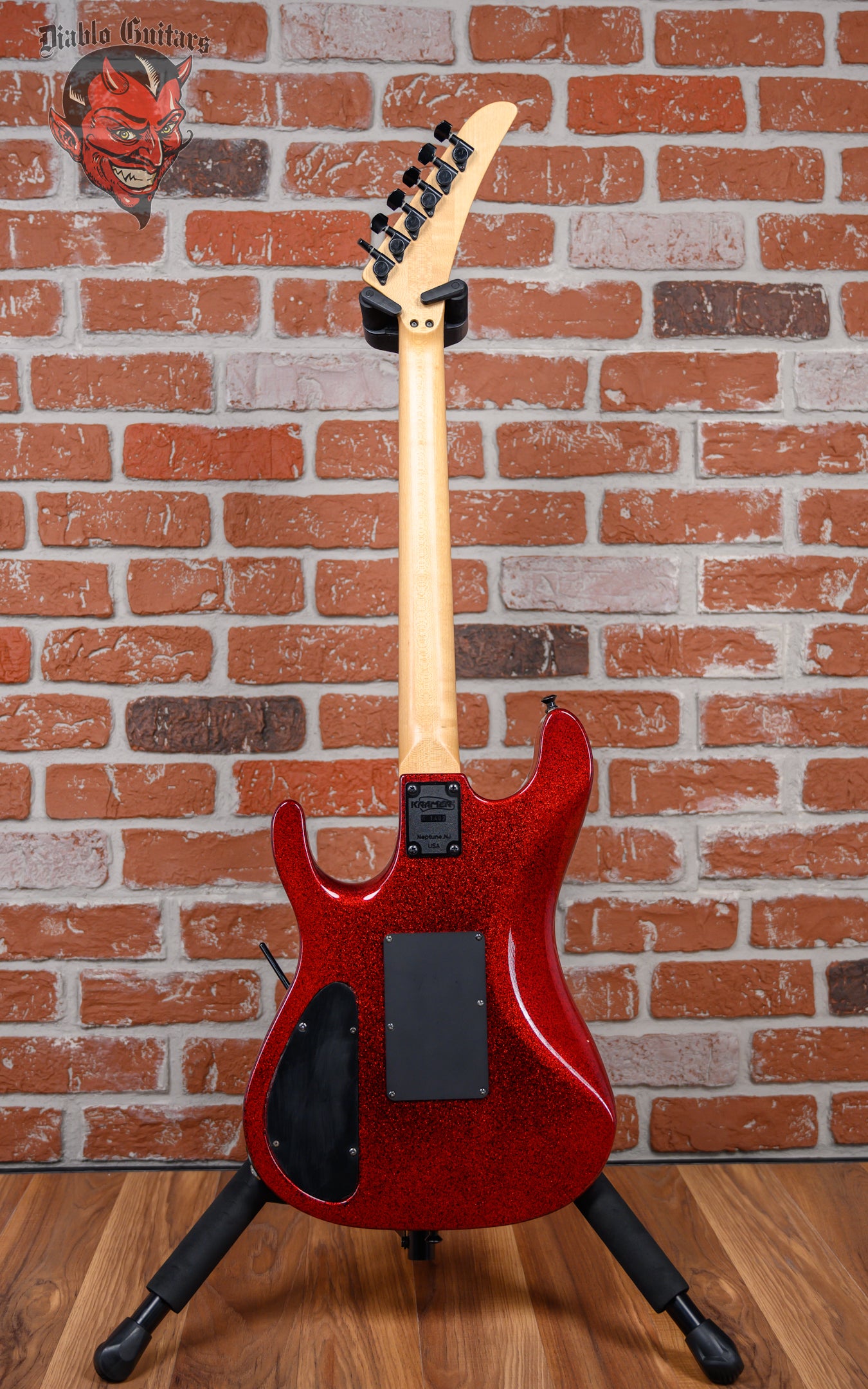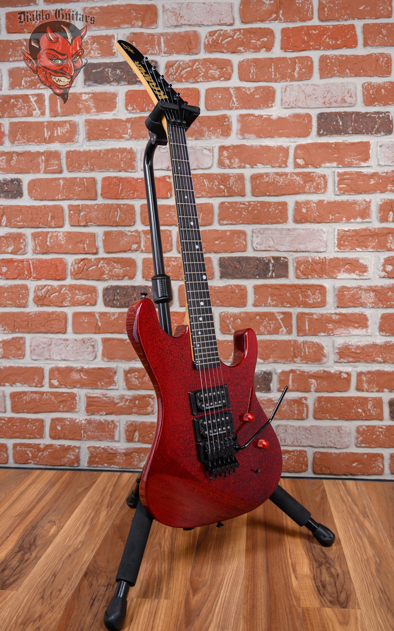 Vintage Kramer Nightswan in Red Sparkle finish made in 1989 with Original Hard Shell Case. This guitar features a solid mahogany body, 3-Piece maple neck and ebony fingerboard with a reverse headstock. Equipped with a Seymour Duncan- Duncan Distortion in the middle position and a Seymour Duncan TB4 JB in the bridge position. Controlled by 1 volume, 1 tone pot with push pull coil tap and a 3-Way mini toggle selector, original volume pot dates to 1988. The 24.75" scale length neck has acrylic offset dot inlays and white side markers with 24 jumbo frets on a 305mm radius with a thin U profile. The hardware is comprised of black Schaller Sealed Die-Cast tuning machines with cloche heads, a Floyd Rose Locking nut, a Floyd Rose Surface Mounted Original Double Locking Tremolo bridge and anodized Red knurled dome knobs.