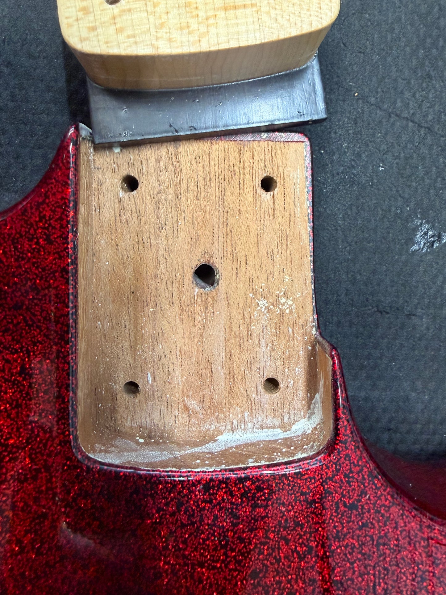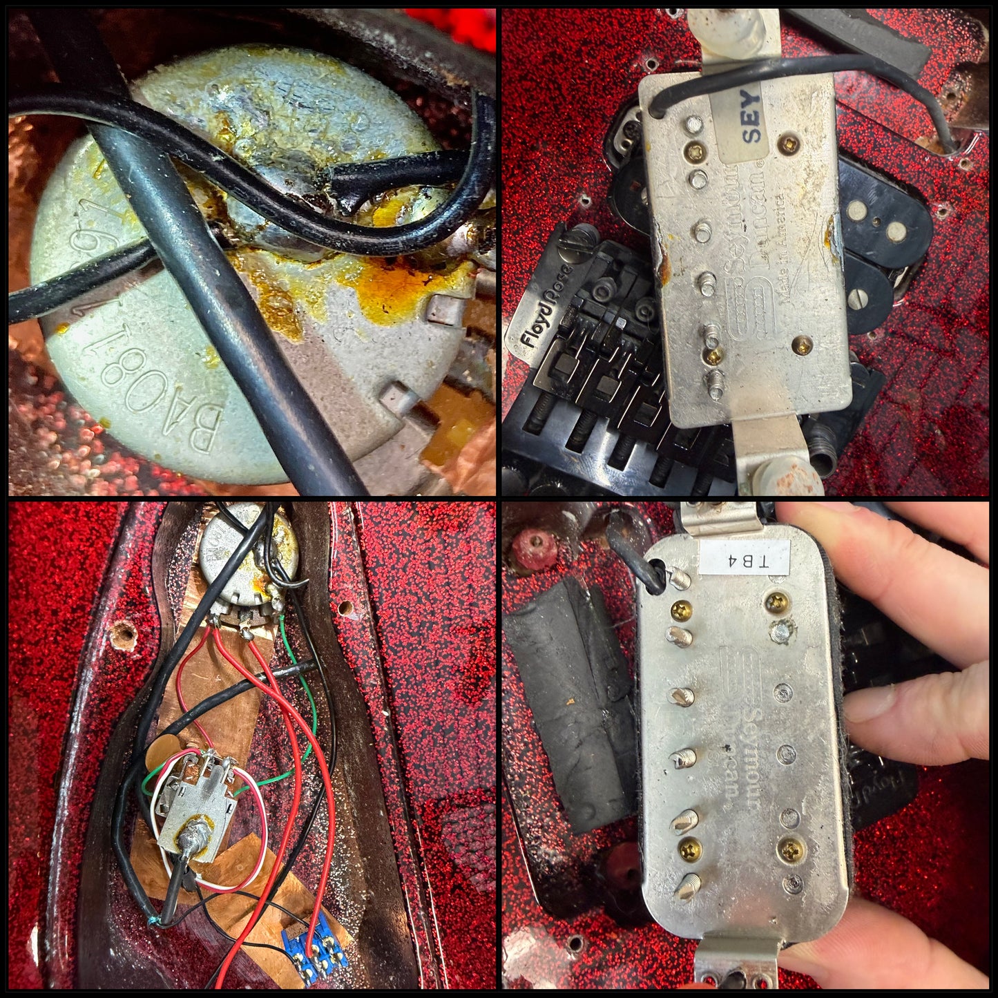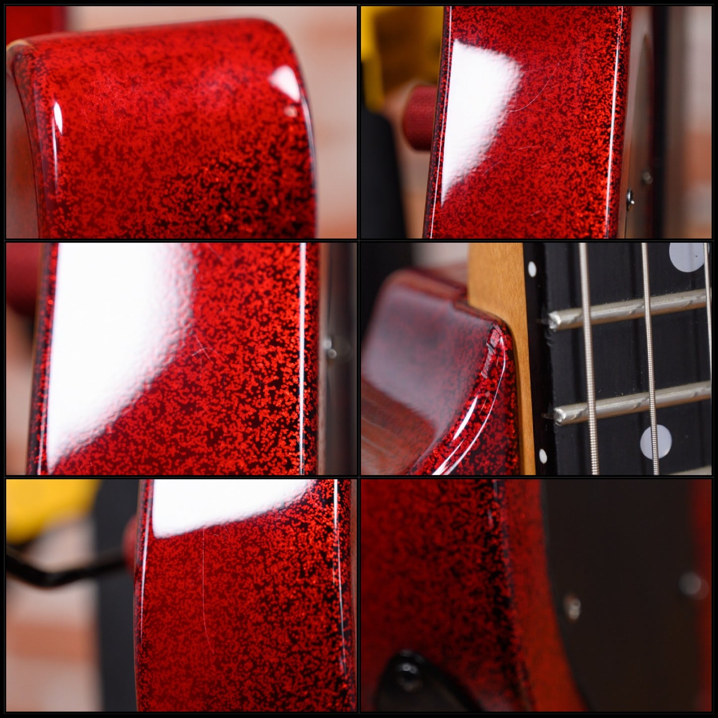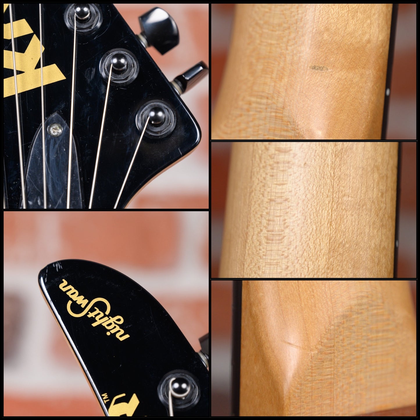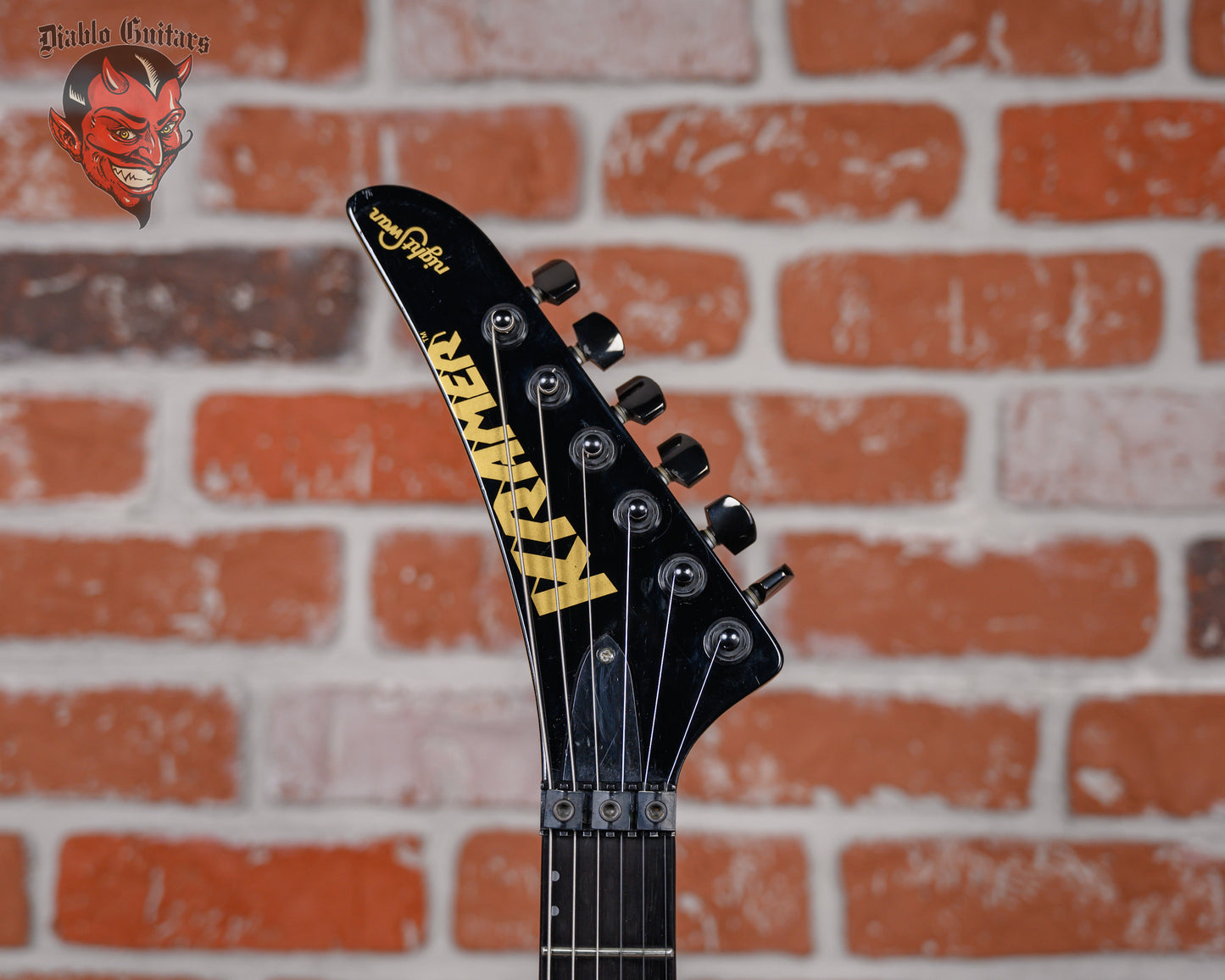 Vintage Kramer Nightswan in Red Sparkle finish made in 1989 with Original Hard Shell Case. This guitar features a solid mahogany body, 3-Piece maple neck and ebony fingerboard with a reverse headstock. Equipped with a Seymour Duncan- Duncan Distortion in the middle position and a Seymour Duncan TB4 JB in the bridge position. Controlled by 1 volume, 1 tone pot with push pull coil tap and a 3-Way mini toggle selector, original volume pot dates to 1988. The 24.75" scale length neck has acrylic offset dot inlays and white side markers with 24 jumbo frets on a 305mm radius with a thin U profile. The hardware is comprised of black Schaller Sealed Die-Cast tuning machines with cloche heads, a Floyd Rose Locking nut, a Floyd Rose Surface Mounted Original Double Locking Tremolo bridge and anodized Red knurled dome knobs.