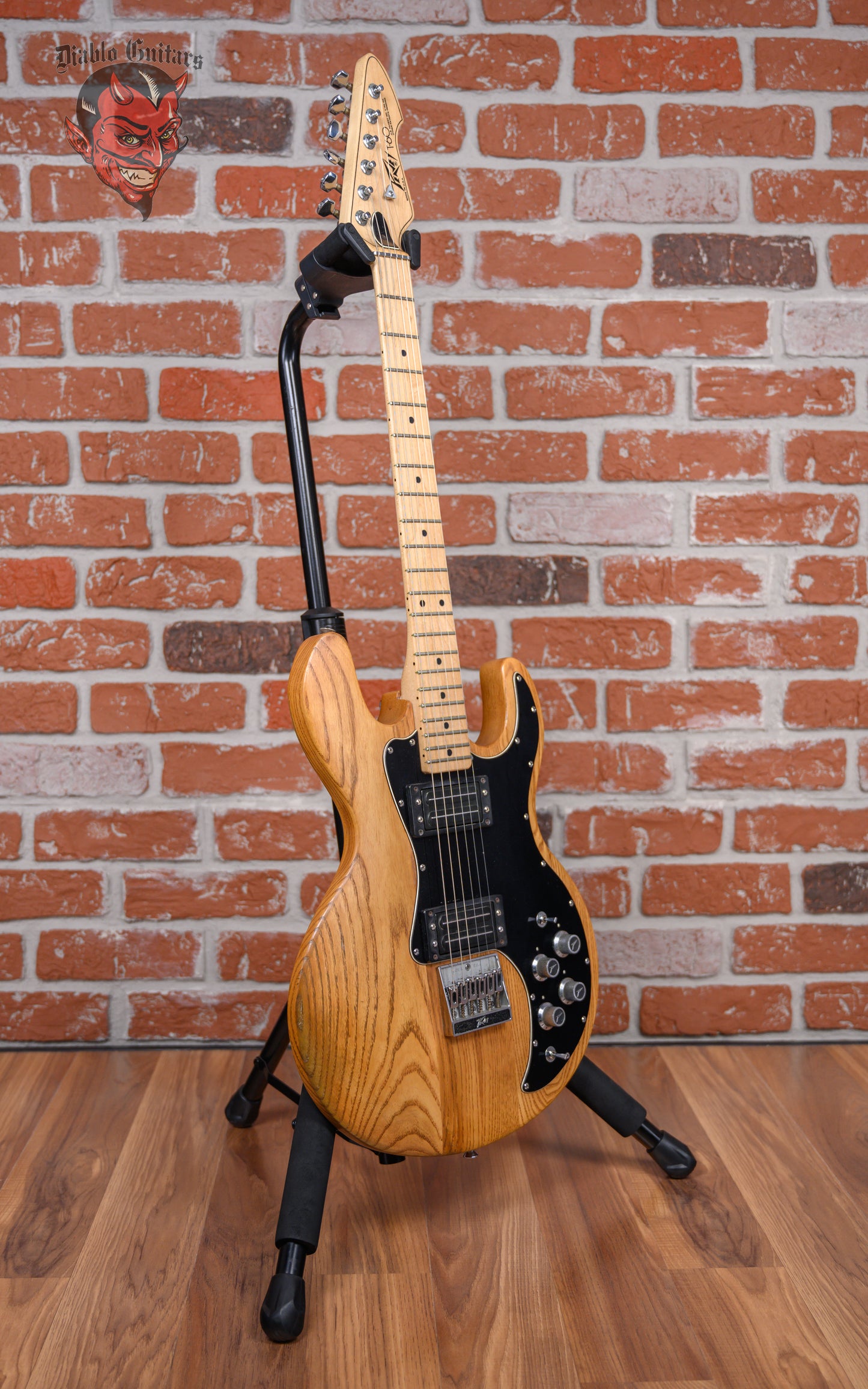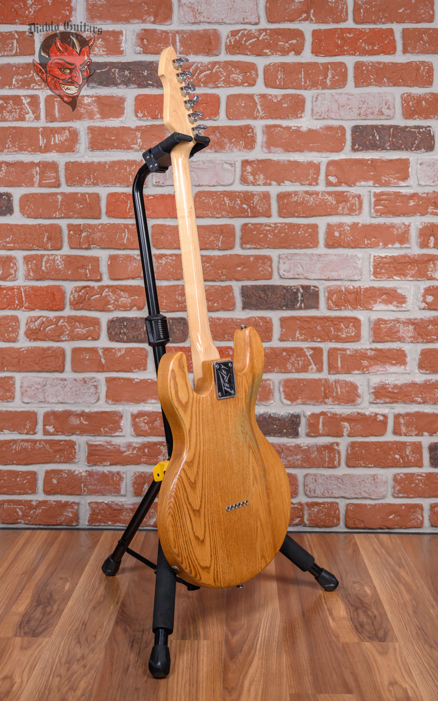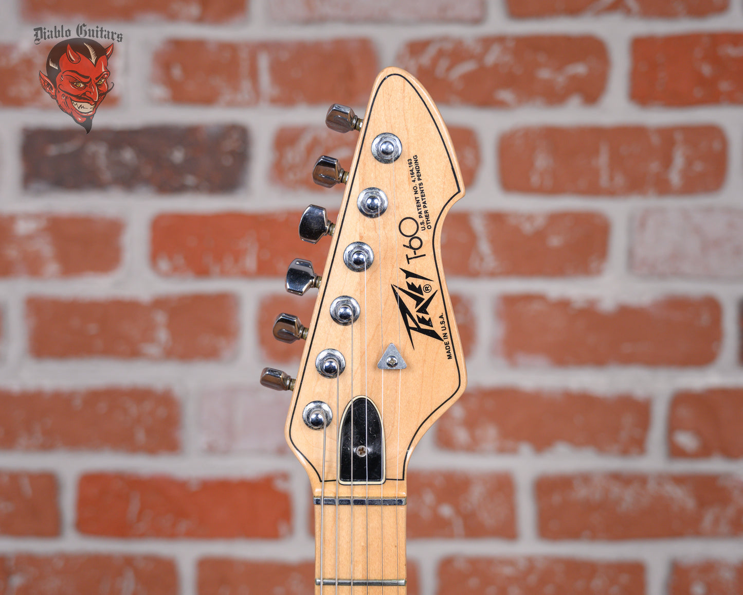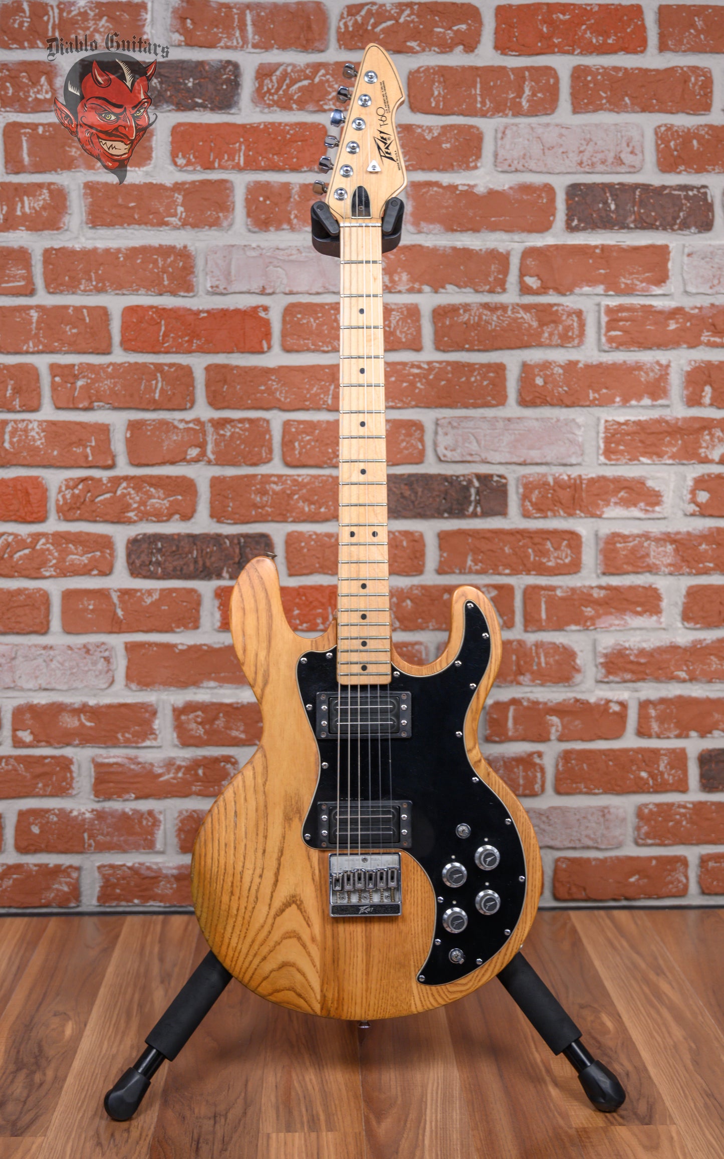 Vintage Peavey T-60 in Natural finish made in 1983 with Original Hard Shell Case. This guitar features a solid ash body, 2-piece hard rock maple neck and maple fingerboard. Re-equipped with Peavey Super Ferrite humbuckers in the neck and bridge positions. Controlled by 2 volume pots, 2 tone pots, a 3-Way pickup toggle switch and a 2-way phase toggle switch. The 25.5" scale length neck has black dot inlays and black side markers with 21 medium frets on a 12" radius with a thin 'C' profile. The hardware is comprised of chrome Peavey sealed die-cast tuning machines with cloche heads, an aluminum nut, a Peavey 6-way adjustable die-cast bridge unit and die-cast "P" top hat knobs with a 3 ply black on white pickguard.