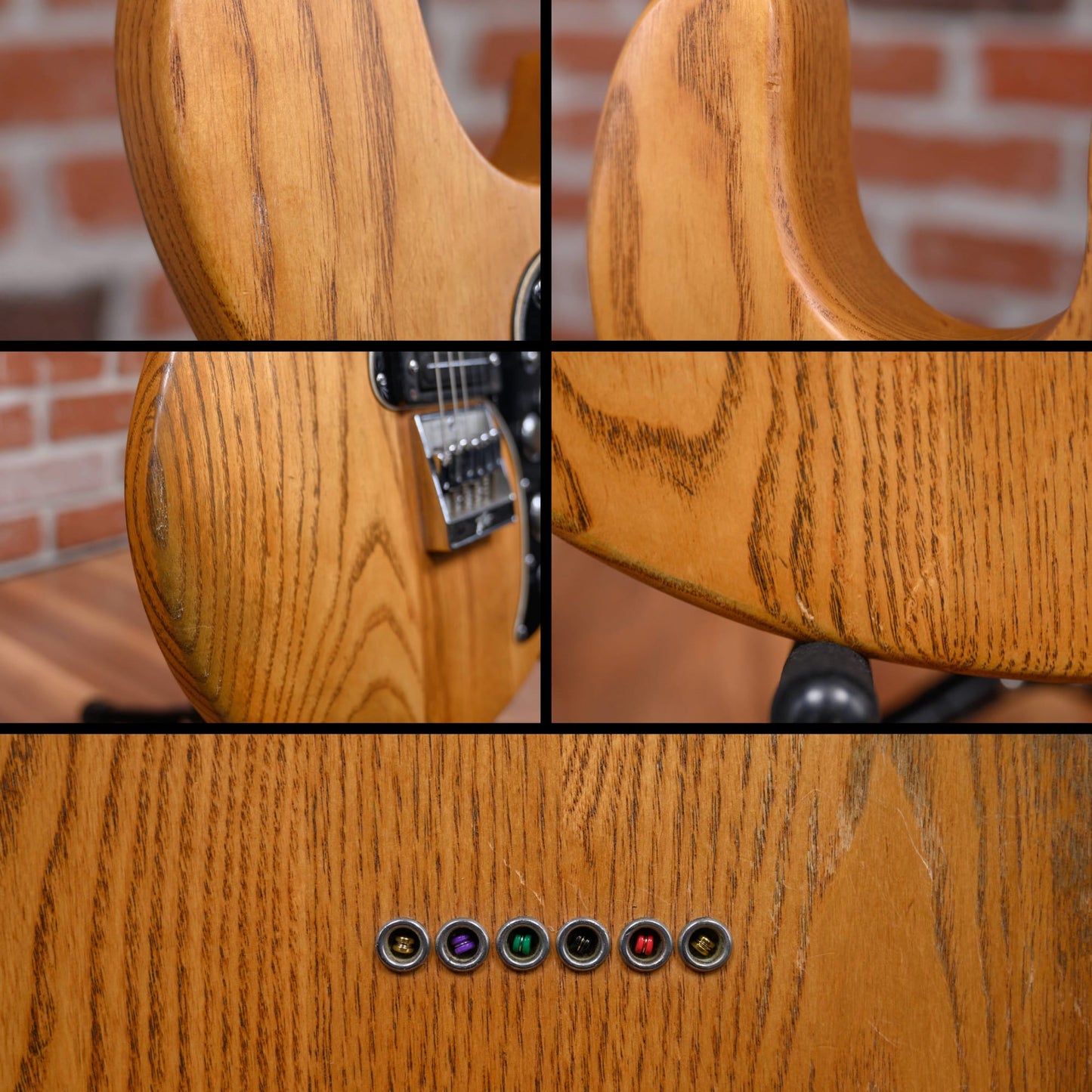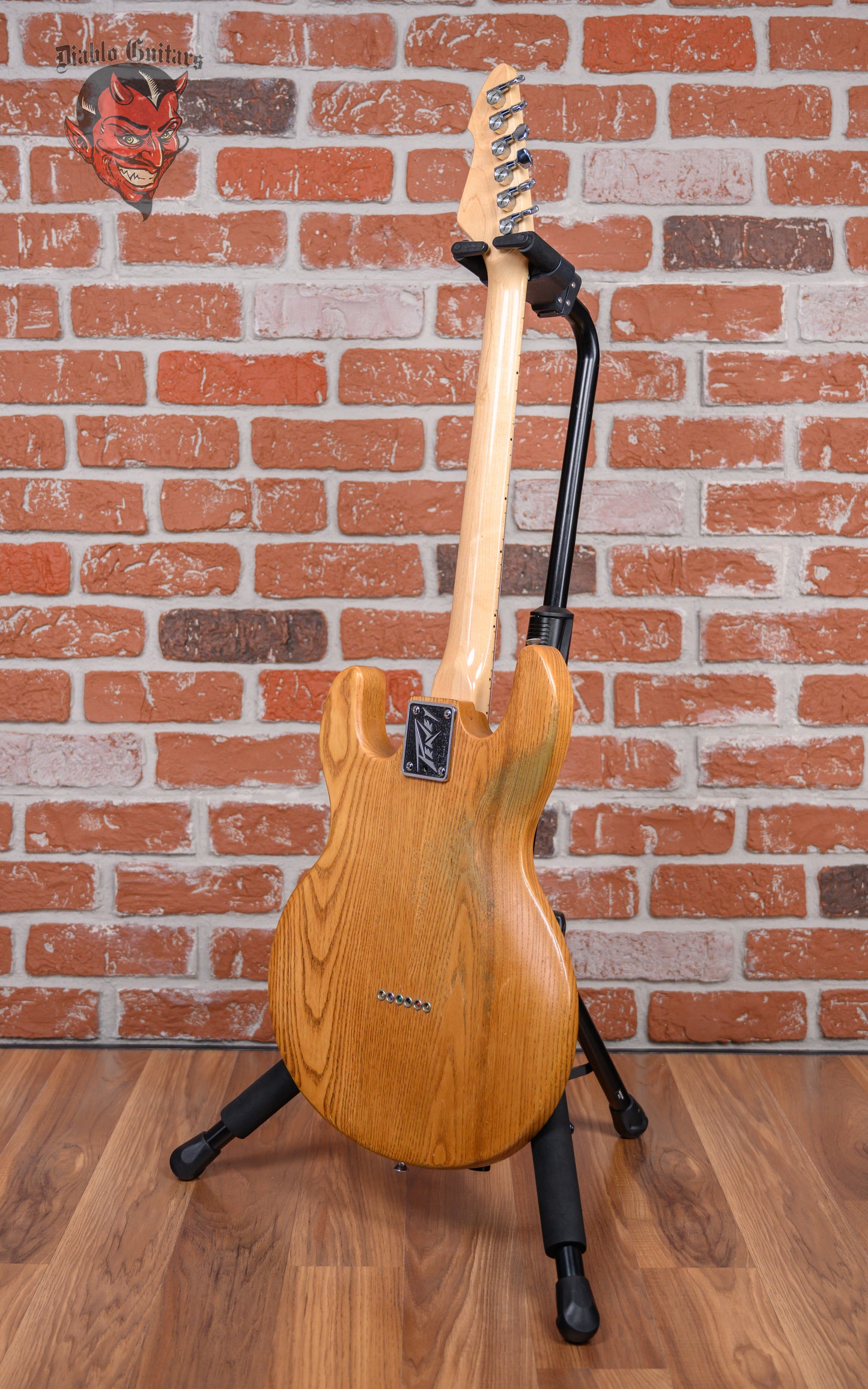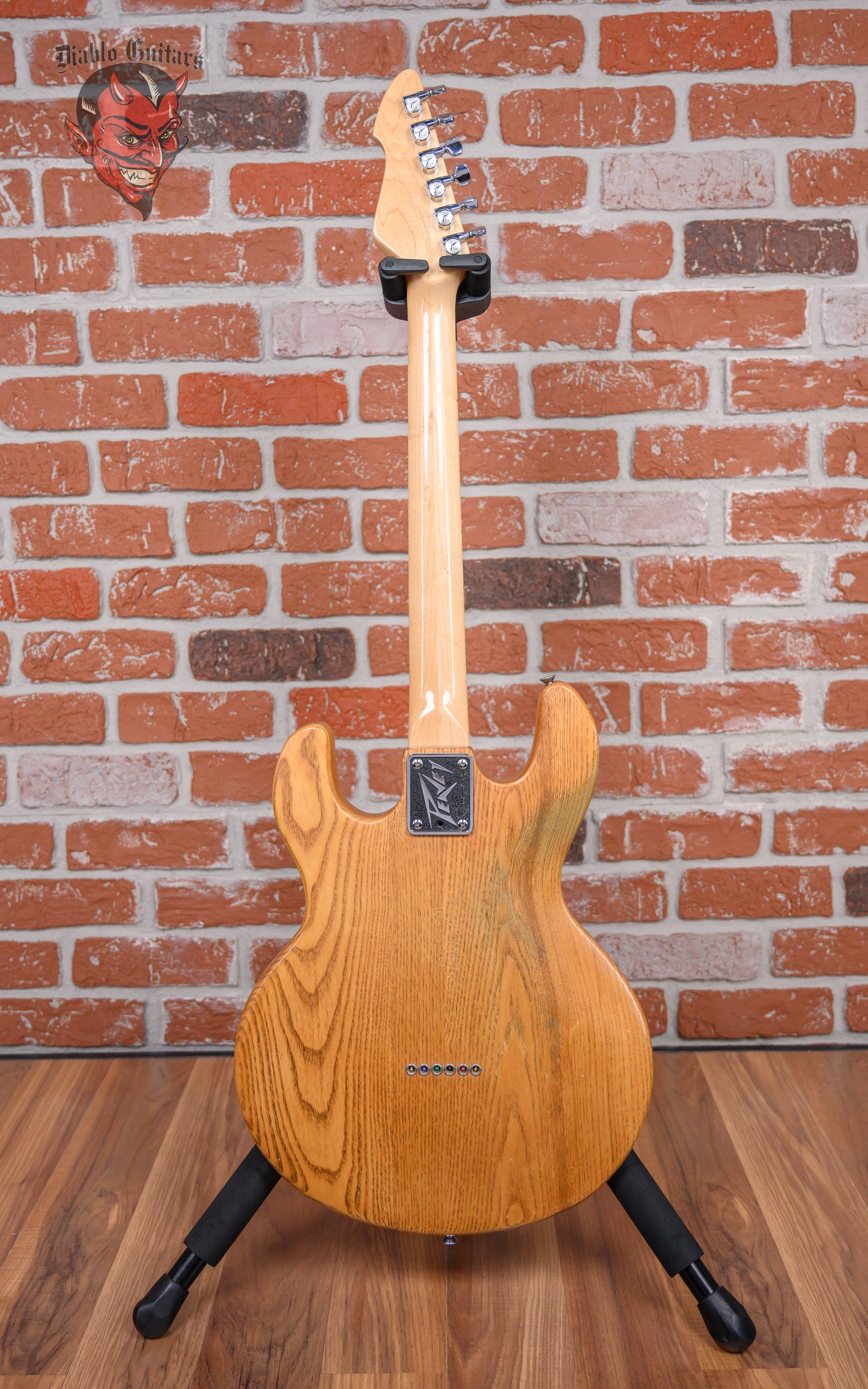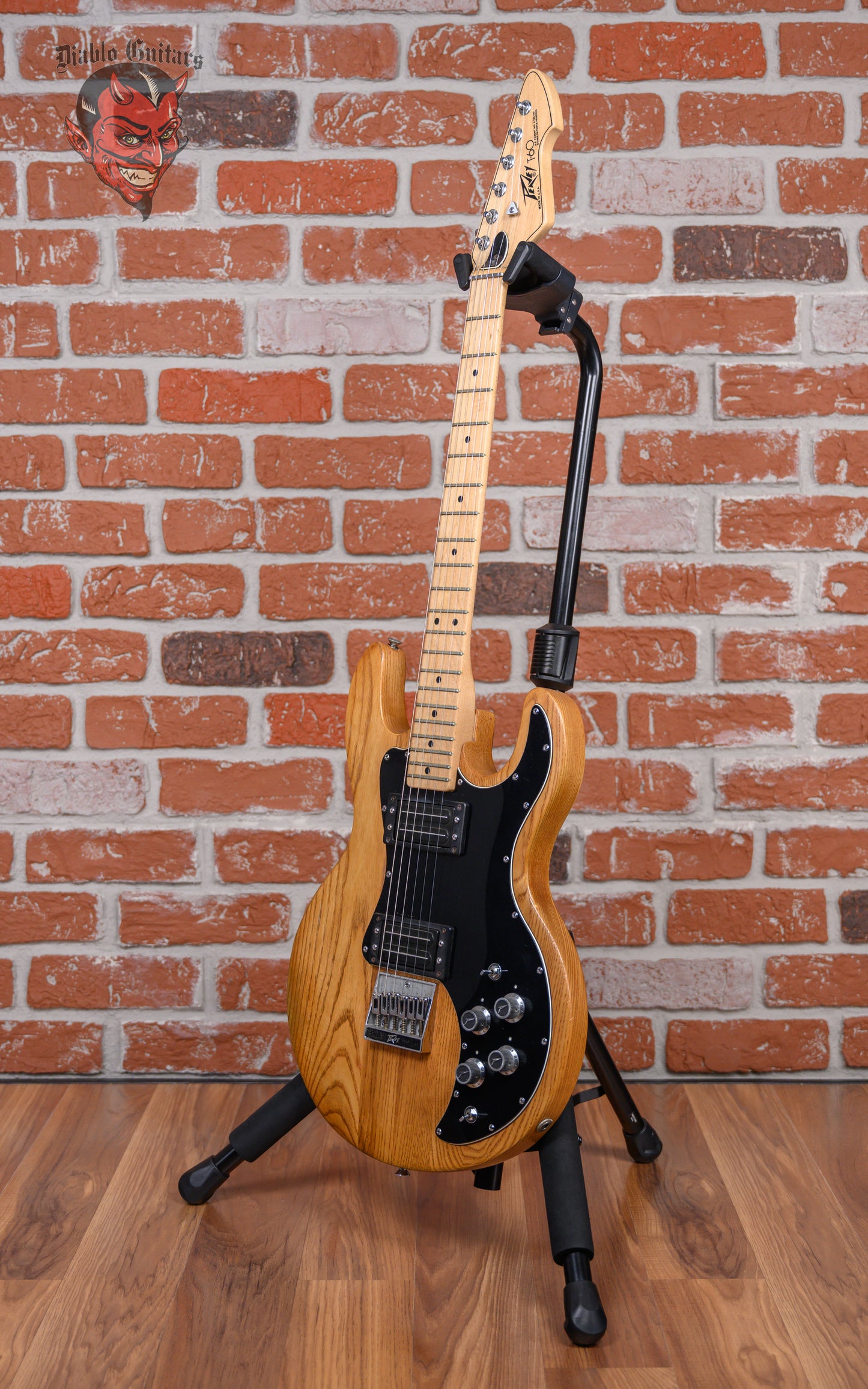 Vintage Peavey T-60 in Natural finish made in 1983 with Original Hard Shell Case. This guitar features a solid ash body, 2-piece hard rock maple neck and maple fingerboard. Re-equipped with Peavey Super Ferrite humbuckers in the neck and bridge positions. Controlled by 2 volume pots, 2 tone pots, a 3-Way pickup toggle switch and a 2-way phase toggle switch. The 25.5" scale length neck has black dot inlays and black side markers with 21 medium frets on a 12" radius with a thin 'C' profile. The hardware is comprised of chrome Peavey sealed die-cast tuning machines with cloche heads, an aluminum nut, a Peavey 6-way adjustable die-cast bridge unit and die-cast "P" top hat knobs with a 3 ply black on white pickguard.