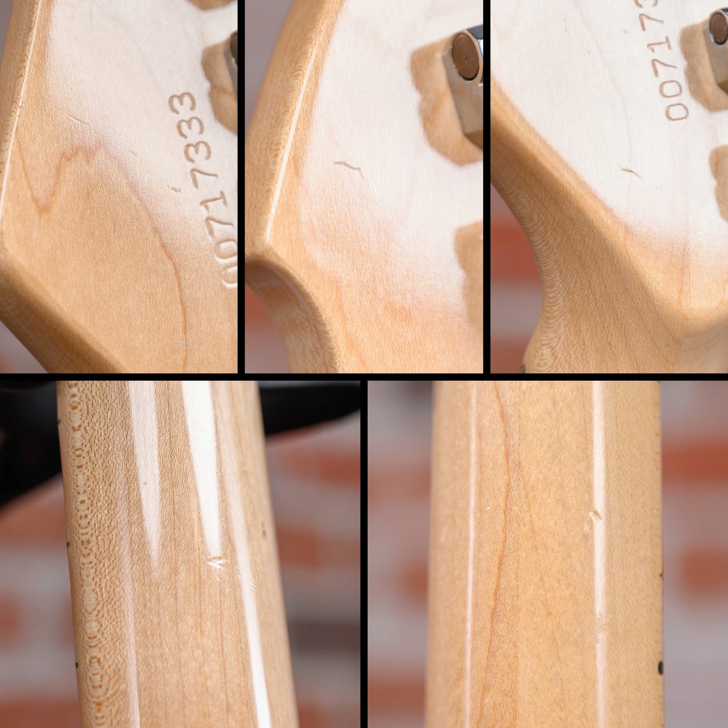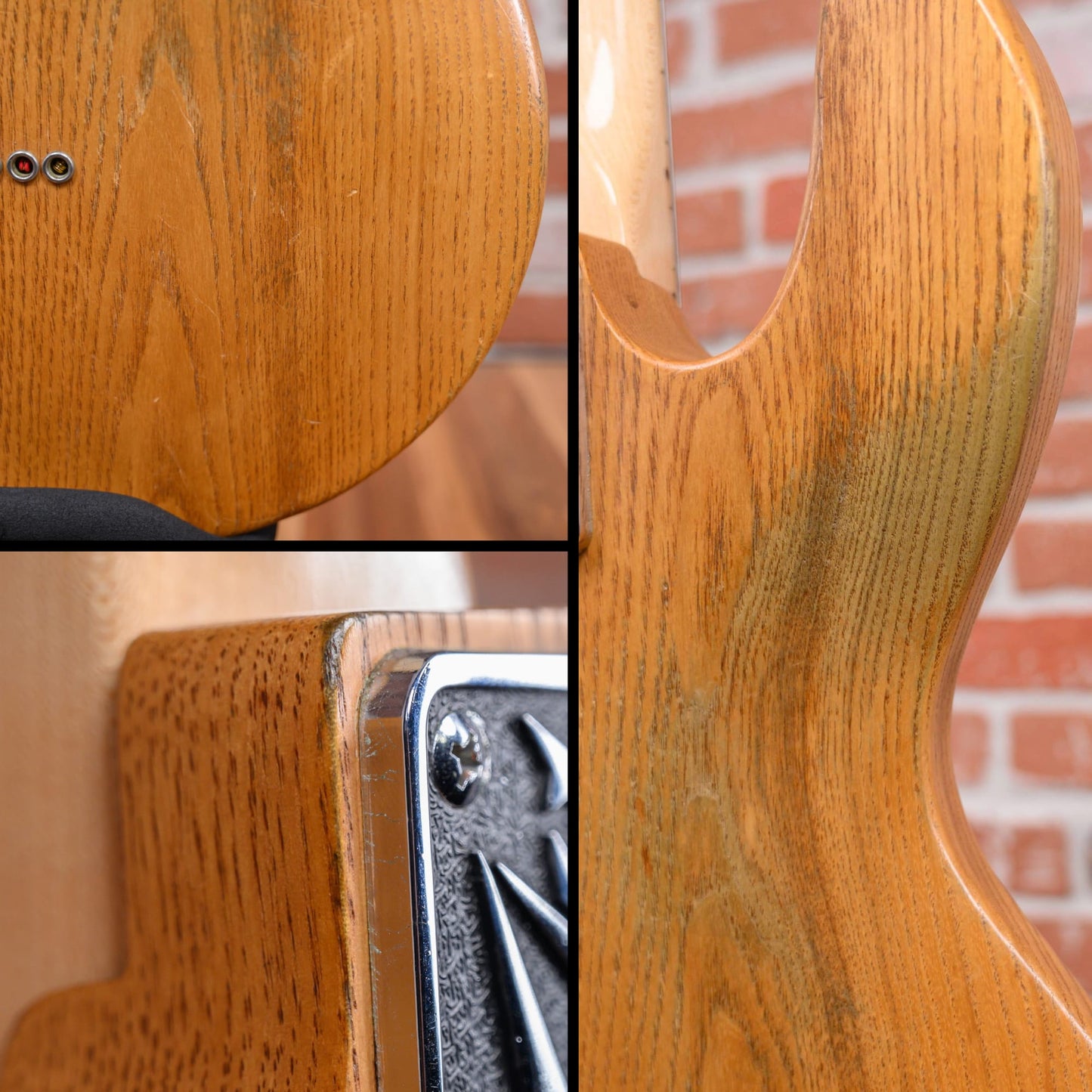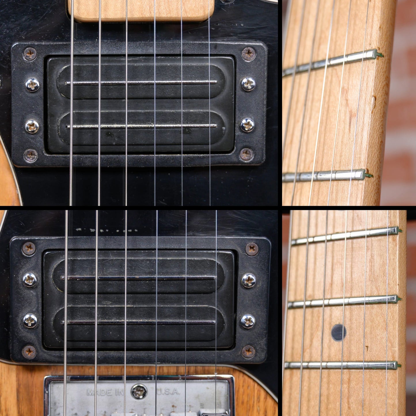 This guitar is in overall good condition. The back of the guitar and the case both have a previous owner's name and a number carved into it. The pickups were replaced with Peavey Super Ferrite The back of the headstock and neck have some light marks. The body has light dings and scuffs throughout. There is some discoloration on the bass side of the body, front and back. The bridge has some light marks and there is some plating wear on the saddles. One of the struts to hold the case open doesn't stay in its slot and falls out, but the case is still fully functional. (See pics)