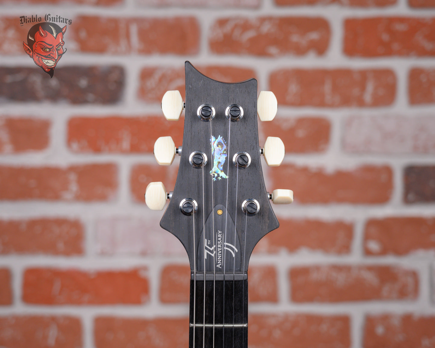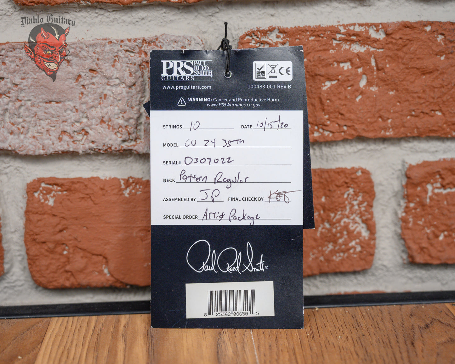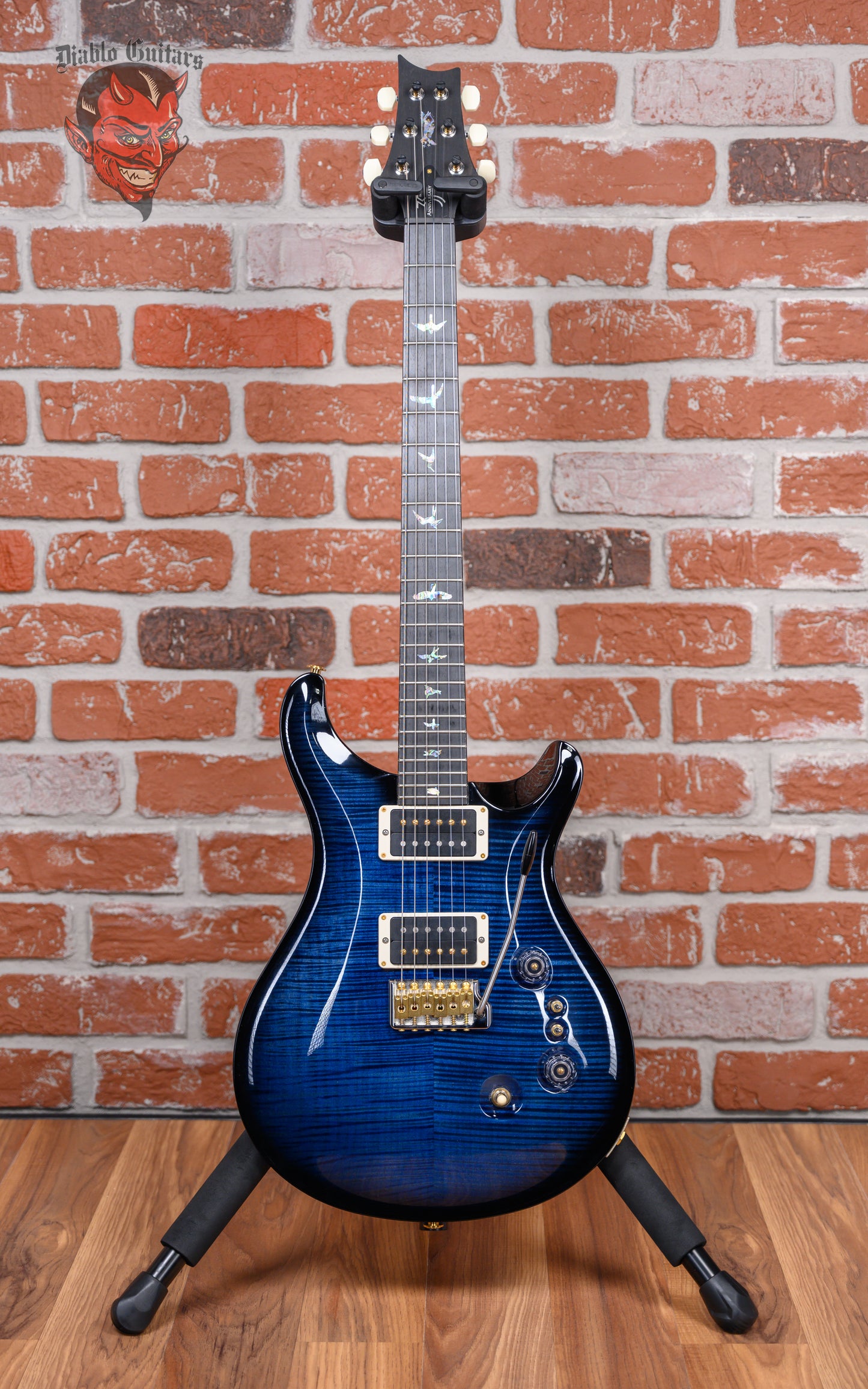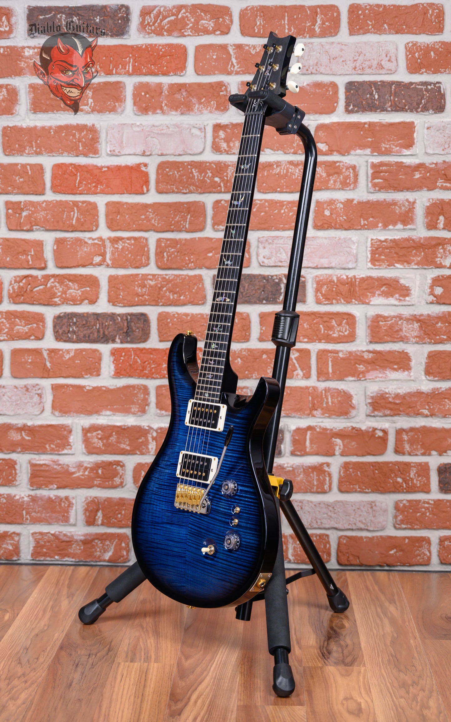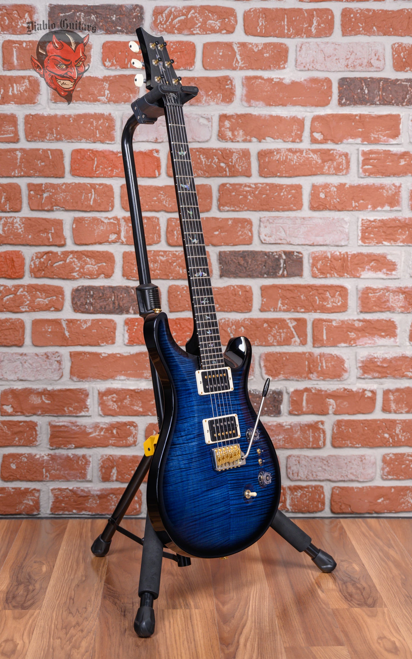 PRS 35th Anniversary Custom 24 Artist Package in Royal Blue Smokewrap Burst finish made in 2020 with Original Hard Shell Case. This guitar features a solid mahogany body with an Artist-Grade maple top, mahogany neck and rosewood fingerboard with a rosewood overlay headstock w/ Small Eagle inlay. Equipped with a set of PRS 85/15 humbuckers in the neck and bridge positions. Controlled by 1 volume pot, 1 tone pot, a 3-Way toggle switch and 2 coil split mini-toggles. The 25" scale length neck has abalone birds inlays and white side markers with 24 medium jumbo frets on a 10" radius with a Pattern Regular profile. The hardware is comprised of gold/chrome PRS Phase III locking tuning machines with cloche heads, a synthetic bronze powder blend nut, a PRS Gen III vibrato bridge/tailpiece and clear lamp shade knobs.