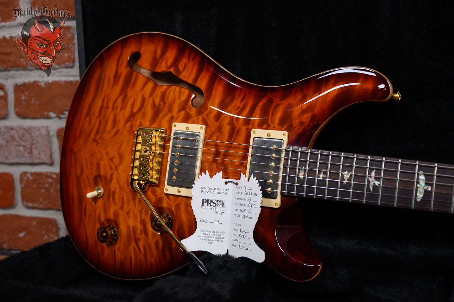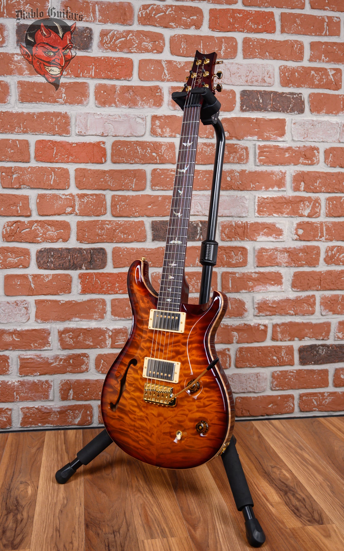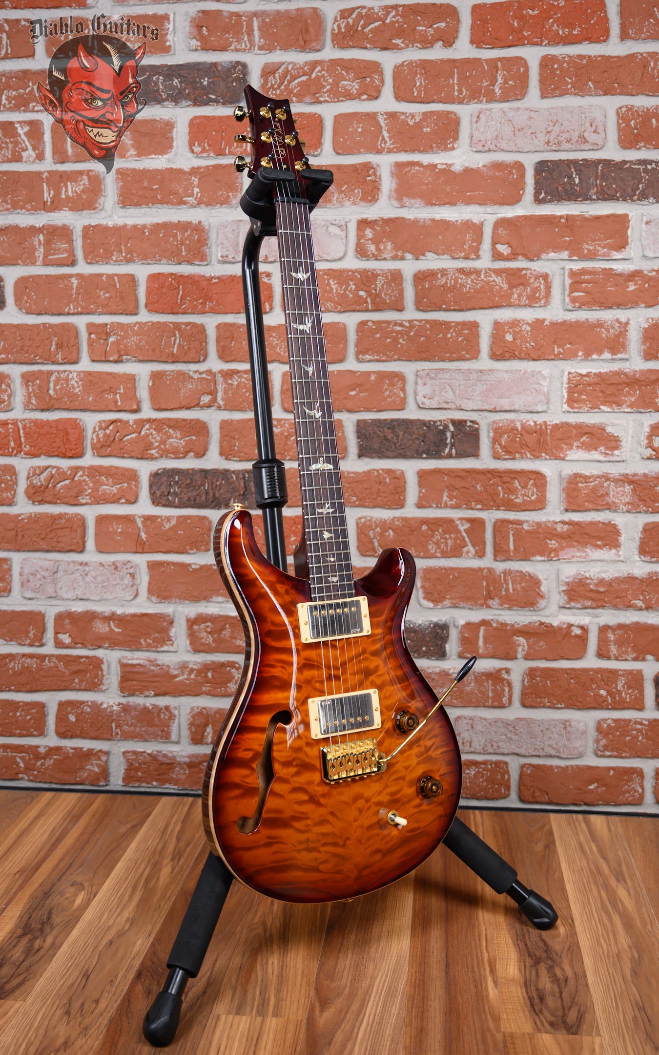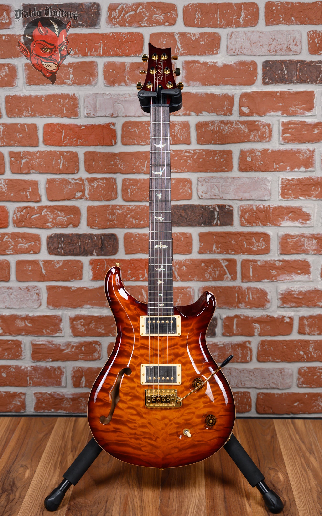 PRS Custom 22 Semi Hollow Quilted Maple 10 Top in Smoked Amber finish made in 2010 with Original Hard Shell Case. This guitar features a Solid Mahogany body with a natural bound Quilted Maple 10 Top top, Mahogany neck and east Indian Rosewood fingerboard with a Color Matched headstock. Equipped with a pair of PRS 57/08 humbuckers in the neck and bridge position. Controlled by 1 Volume, 1 Tone pot with push/pull coil tap and a 3-Way Toggle Switch. The 25" scale length neck has Abalone Bird inlays and White side markers with 22 Medium Jumbo frets on a 10" radius with a Wide Fat profile. The hardware is comprised of gold PRS Phase III Locking tuning machines with Cloche heads, a Synthetic Bronze Powder Blend nut, a PRS Gen III Tremolo bridge and Amber Lamp Shade knobs.
