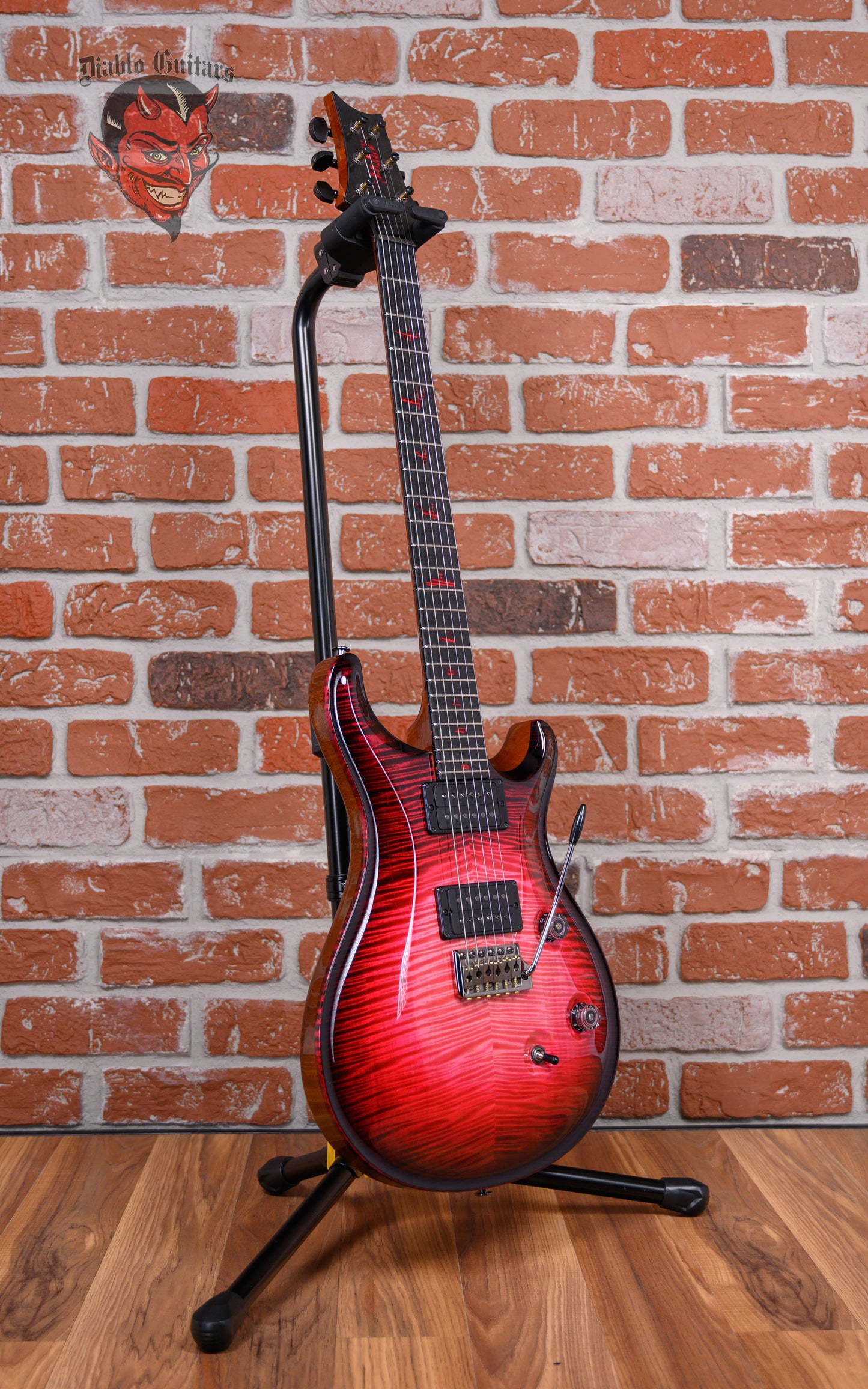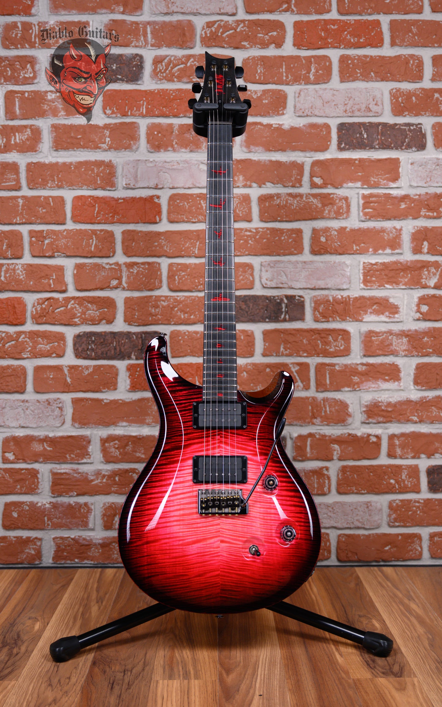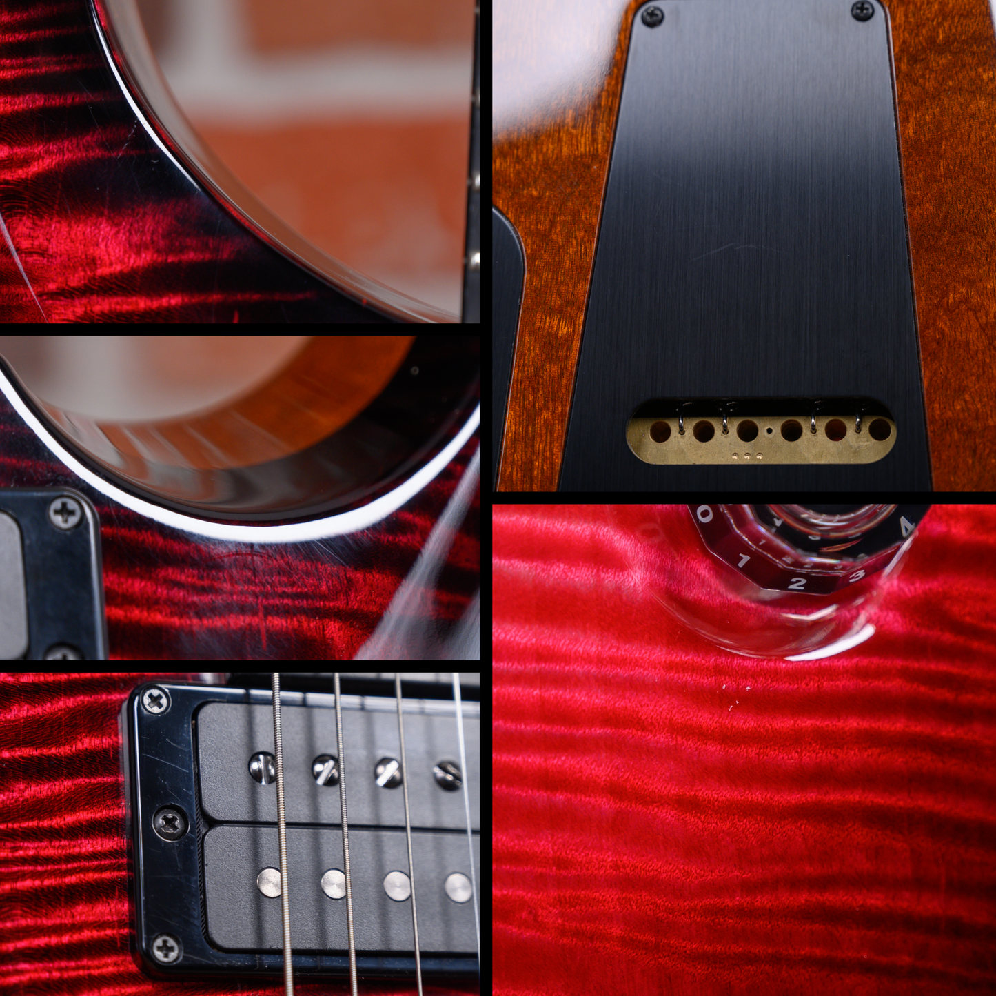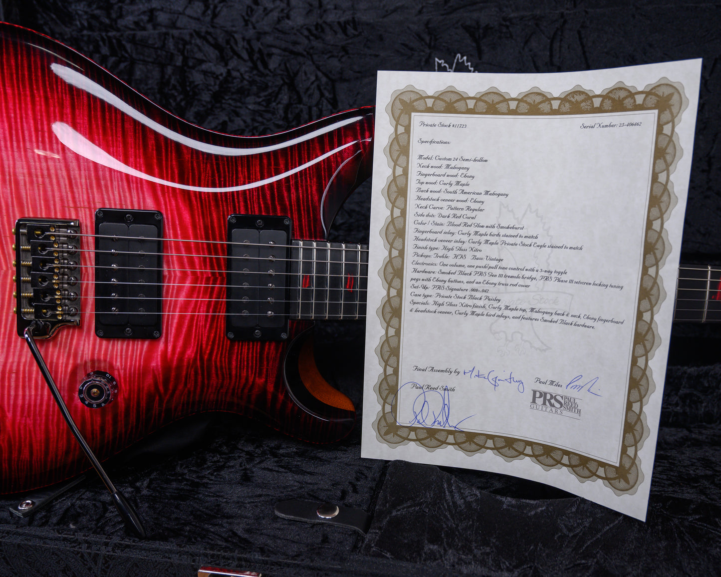 PRS Private Stock Custom 24 Semi-Hollow in Blood Red Glow with Smokeburst finish made in 2025 with Original Hard Shell Case. This guitar features a semi-hollow South American mahogany body with a curly maple top, mahogany neck and ebony fingerboard with an ebony overlay headstock with stained curly maple Private Stock Eagle inlay. Equipped with a PRS Vintage in the neck position and a PRS HFS in the bridge position. Controlled by 1 volume pot, 1 tone pot with push/pull coil tap and a 3-way toggle switch. The 25" scale length neck has red stained curly maple birds inlays and dark red coral side markers with 24 medium jumbo frets on a 10" radius with a Pattern Regular profile. The hardware is comprised of PRS Phase III Locking tuning machines with ebony cloche heads, a synthetic bronze powder blend nut, a PRS Gen III Tremolo bridge and clear lamp shade knobs.