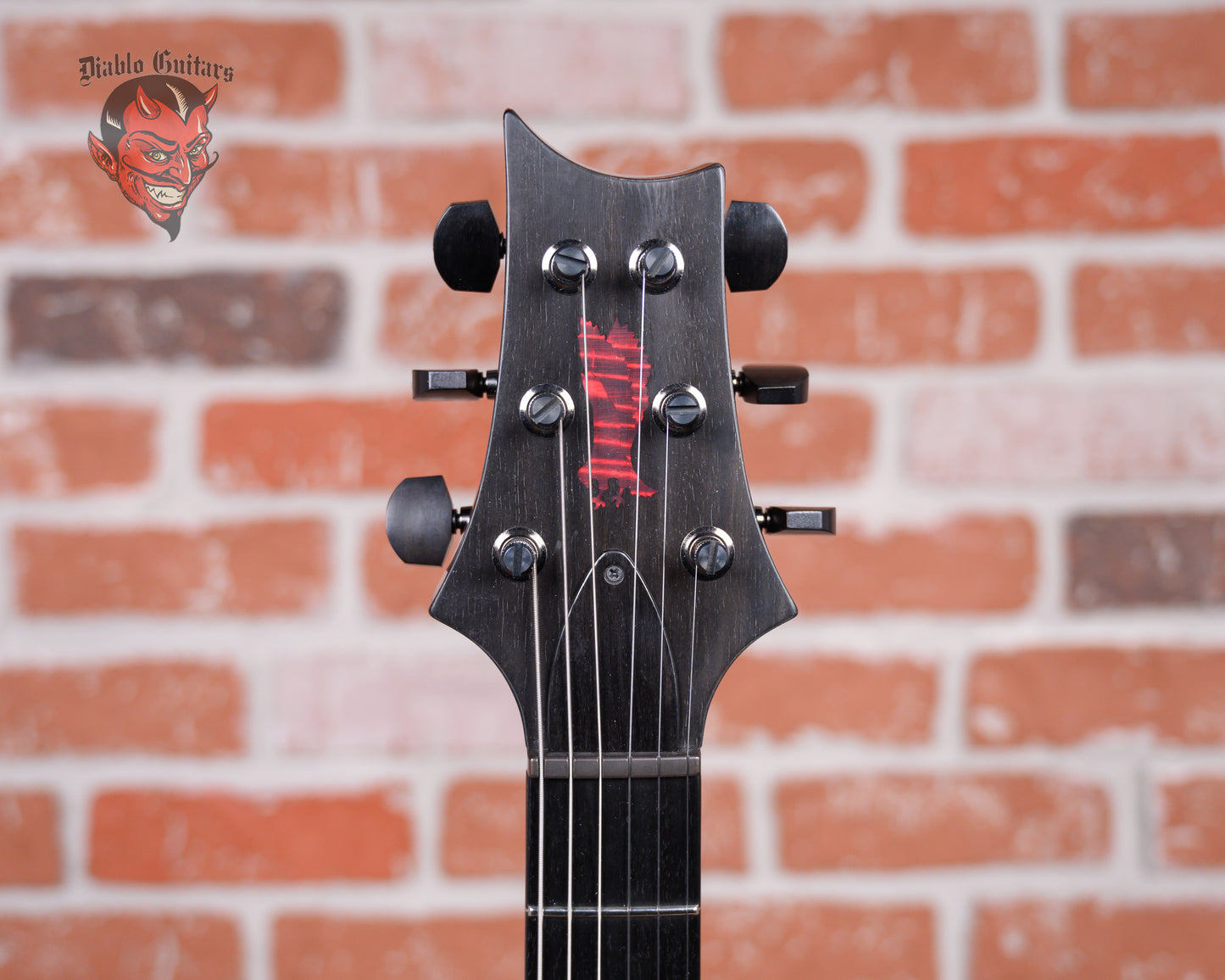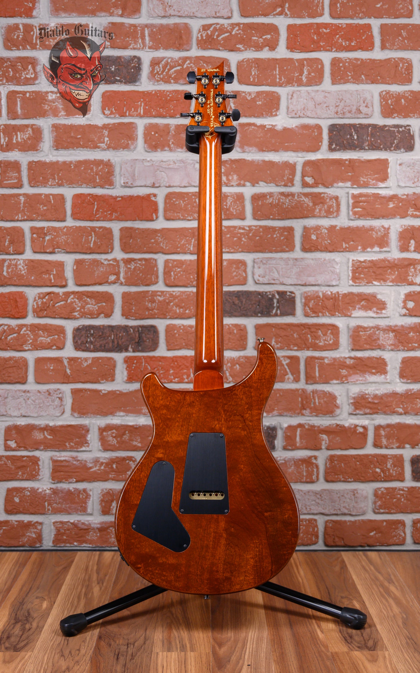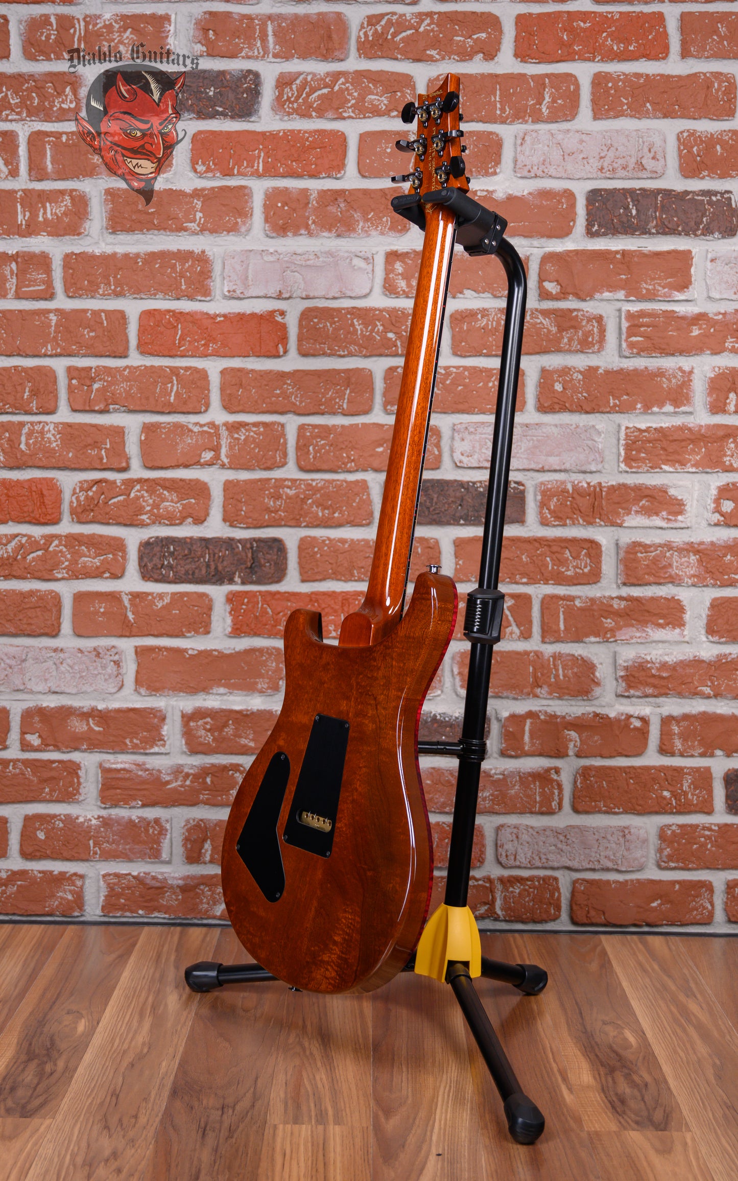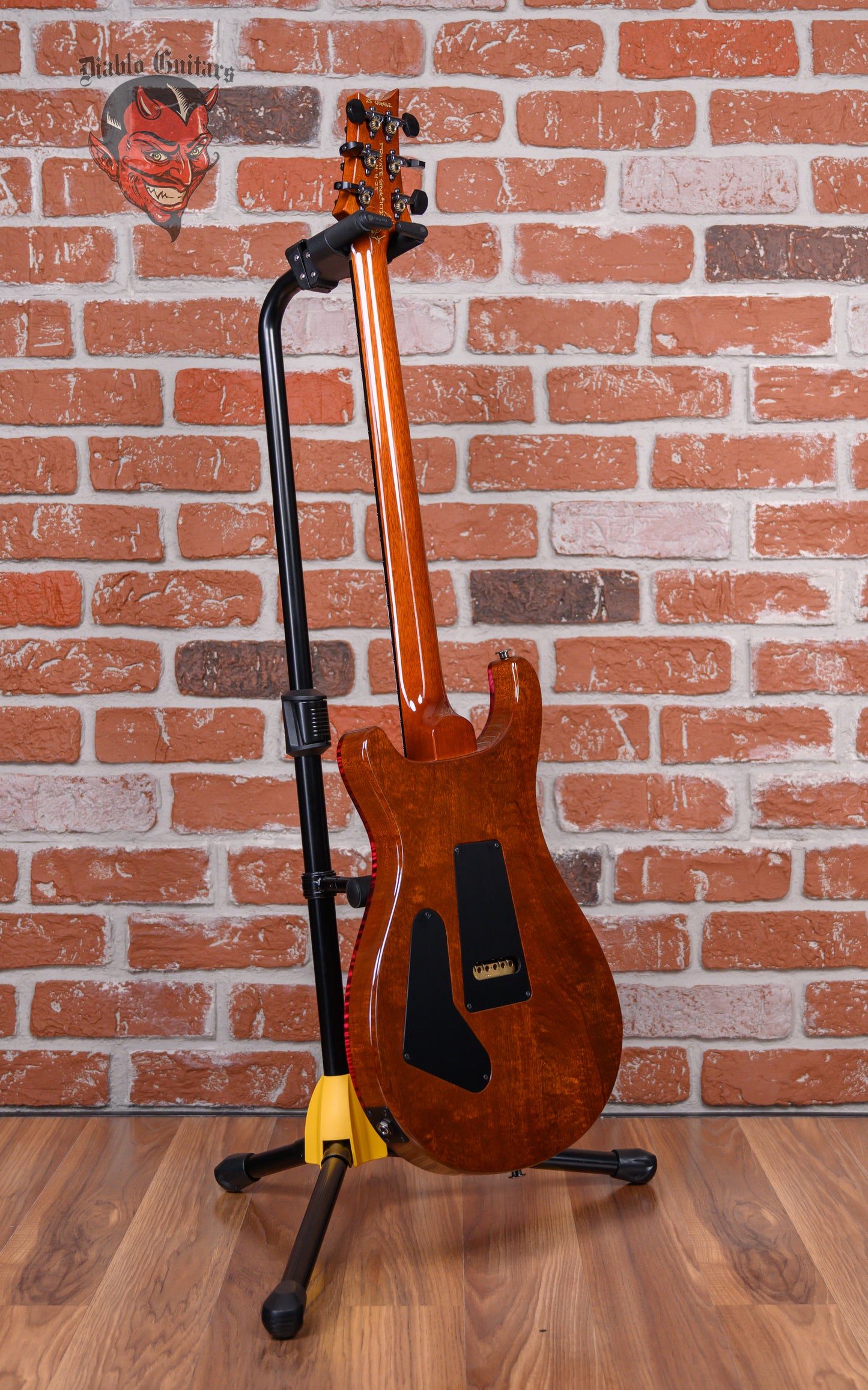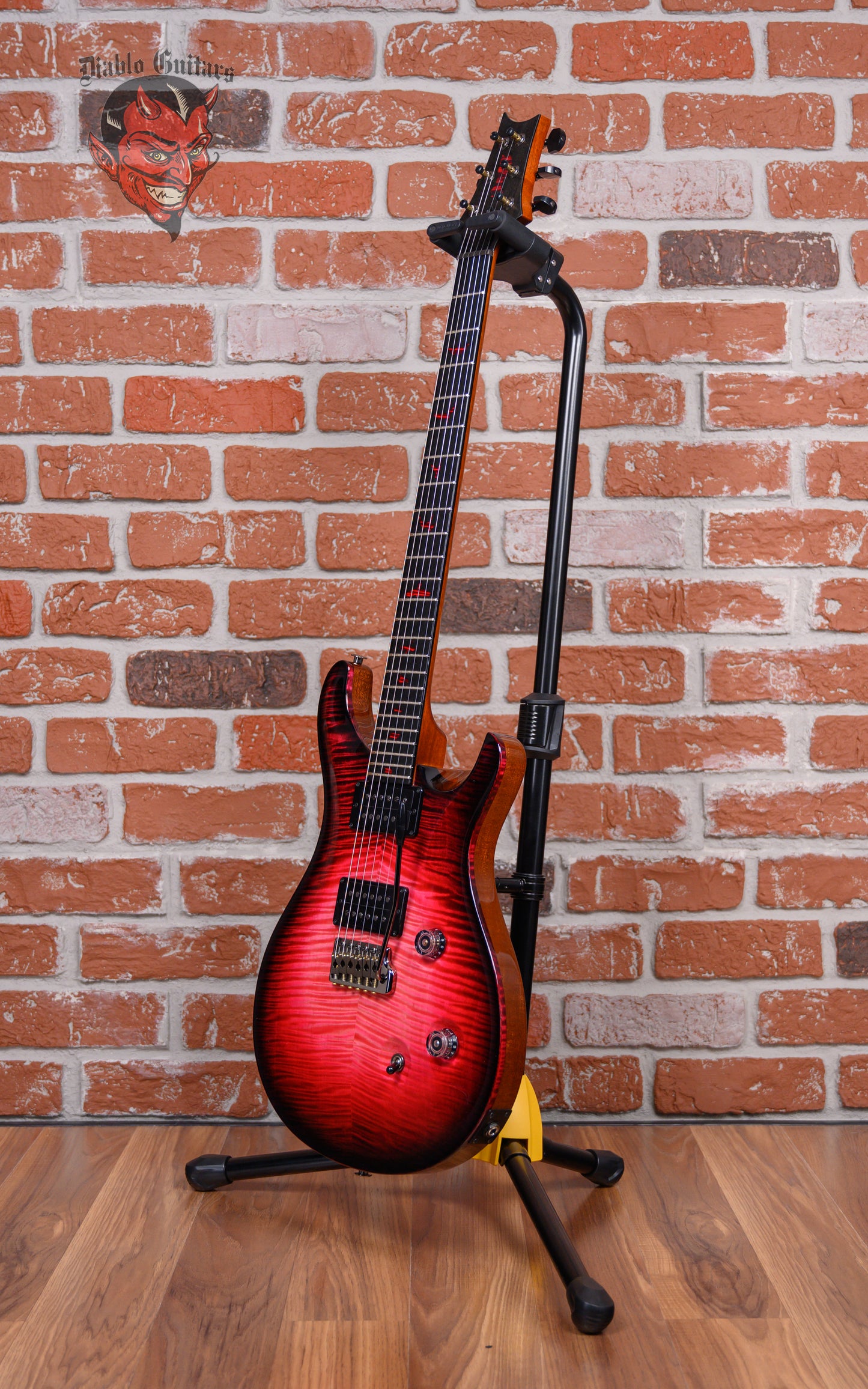 PRS Private Stock Custom 24 Semi-Hollow in Blood Red Glow with Smokeburst finish made in 2025 with Original Hard Shell Case. This guitar features a semi-hollow South American mahogany body with a curly maple top, mahogany neck and ebony fingerboard with an ebony overlay headstock with stained curly maple Private Stock Eagle inlay. Equipped with a PRS Vintage in the neck position and a PRS HFS in the bridge position. Controlled by 1 volume pot, 1 tone pot with push/pull coil tap and a 3-way toggle switch. The 25" scale length neck has red stained curly maple birds inlays and dark red coral side markers with 24 medium jumbo frets on a 10" radius with a Pattern Regular profile. The hardware is comprised of PRS Phase III Locking tuning machines with ebony cloche heads, a synthetic bronze powder blend nut, a PRS Gen III Tremolo bridge and clear lamp shade knobs.