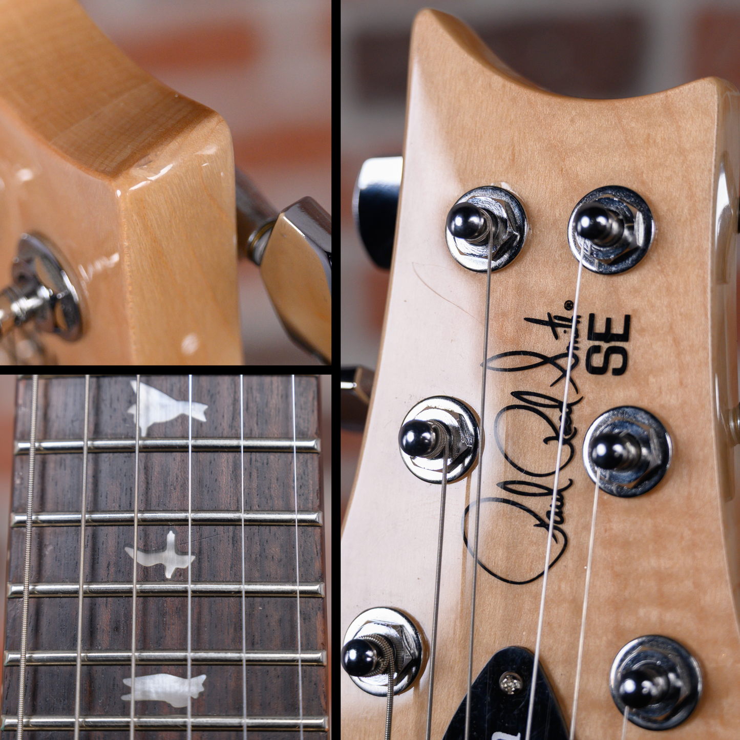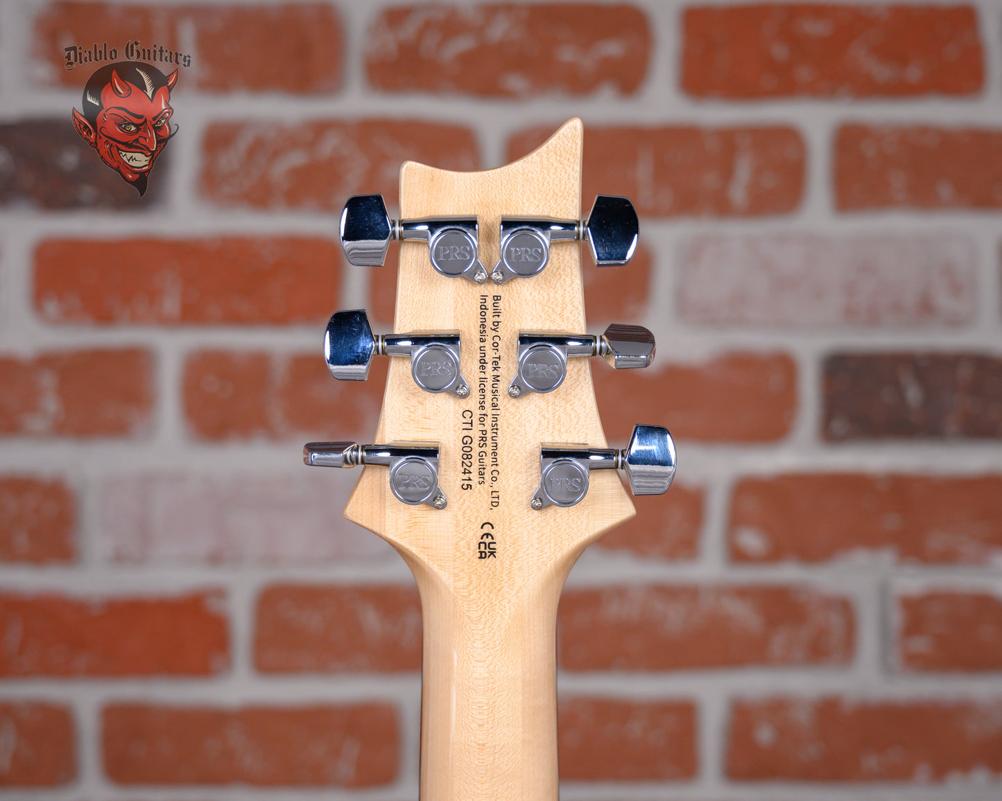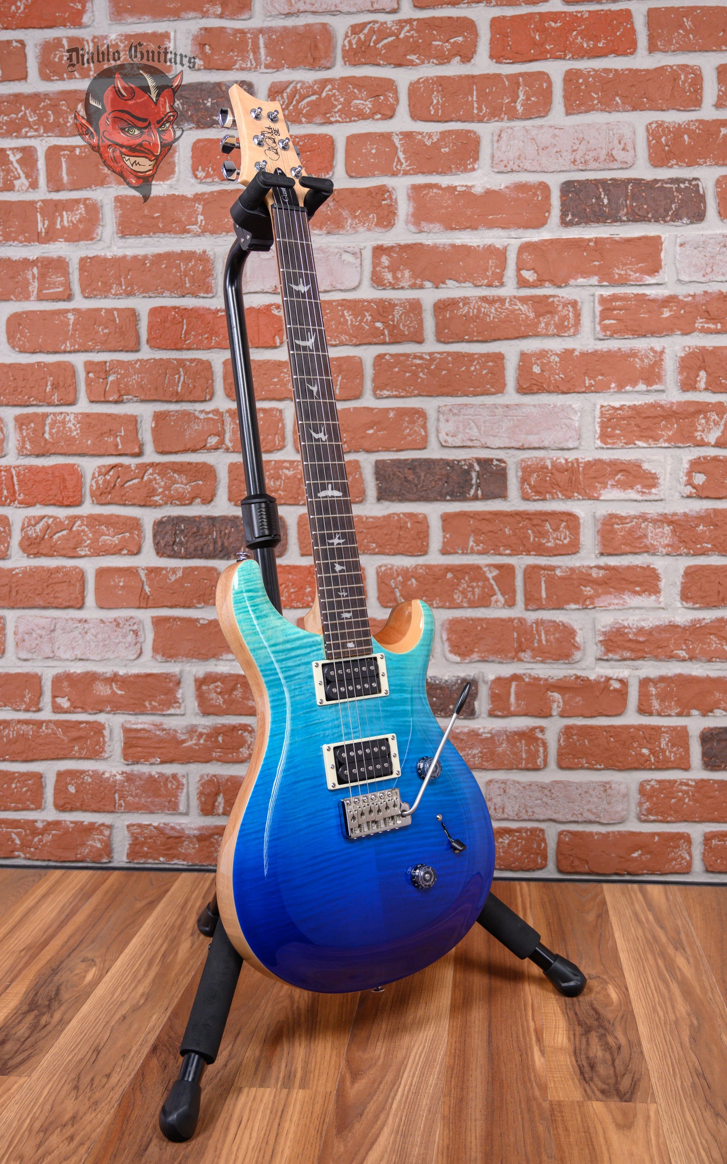 PRS SE Custom 24 Limited Edition in Sapphire Fade finish made in 2024 with Original Gigbag. This guitar features a solid mahogany body with a maple top with flamed maple veneer, maple neck and rosewood fingerboard. Equipped with a set of PRS 85/15 "S" humbuckers in the neck and bridge positions. Controlled by 1 volume pot, 1 tone pot with push/pull coil tap and a 3-way blade switch. The 25" scale length neck has pearloid bird inlays and white side markers with 24 medium jumbo frets on a 10" radius with a wide thin profile. The hardware is comprised of chrome PRS sealed die-cast tuning machines with cloche heads, a synthetic nut, a PRS Patented Tremolo bridge and clear lamp shade knobs.