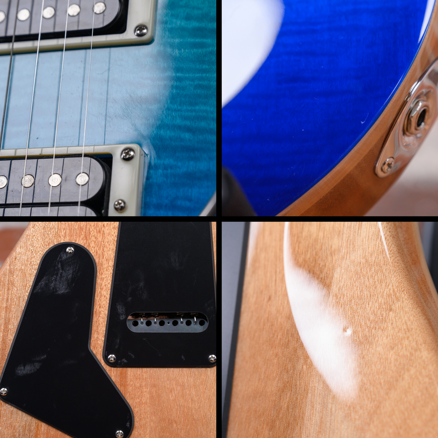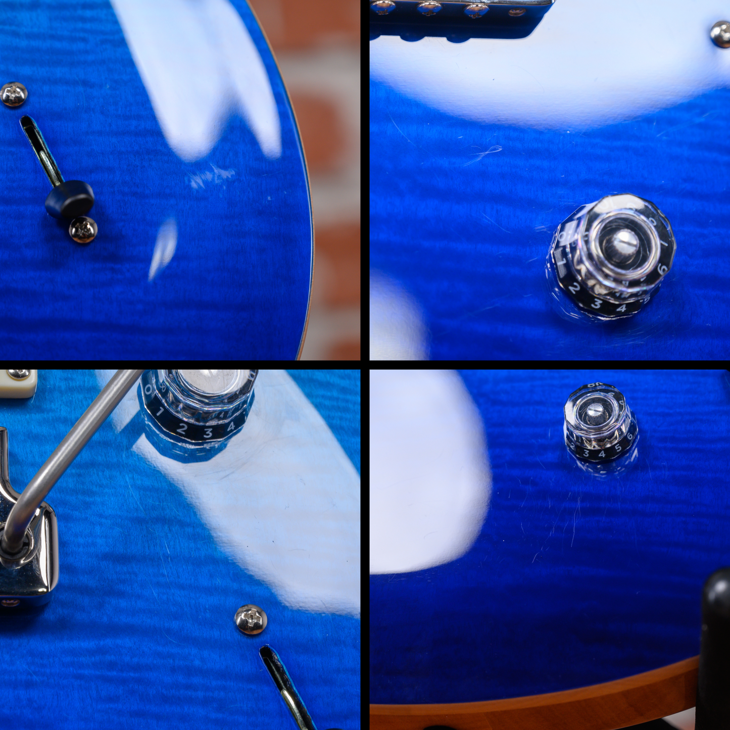 This guitar is in overall excellent condition. There are some light surface marks and scuffs throughout the guitar, particularly around the controls. There are a few small dents on the back. The tip of the headstock has a small ding. (See Pics)