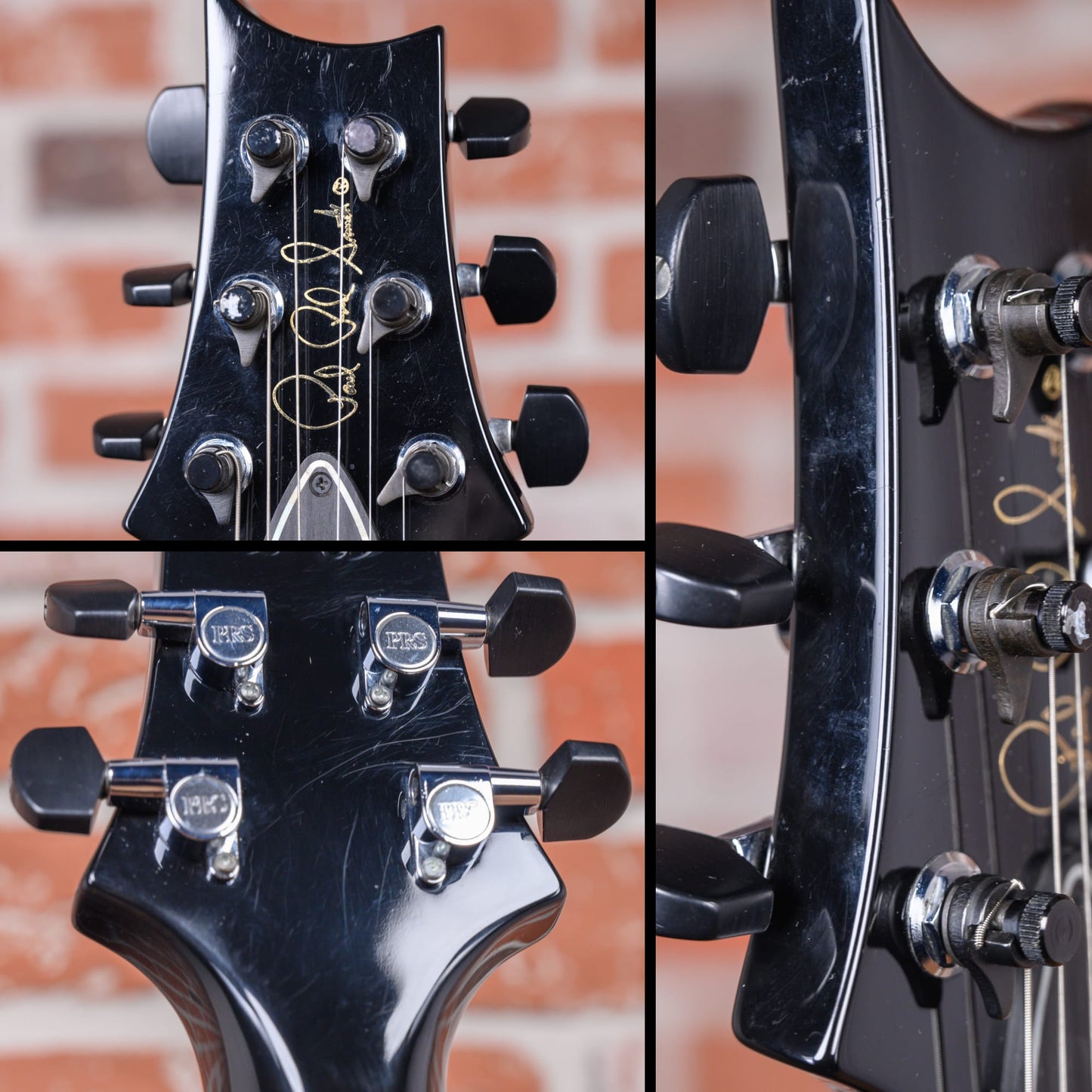 PRS Tremonti in Black finish made in 2001 with Hard Shell Case. This guitar features a solid mahogany body with a bound flamed maple top, mahogany neck and East Indian rosewood fingerboard. Equipped with a PRS 7 humbucker in the neck position and a Seymour Duncan TB-4 JB Model in the bridge position. Controlled by 2 volume pots, 2 tone pots and a 3-Way toggle switch. The 25" scale length neck has mother of pearl birds w/ 12th fret Tremonti inlays and white side markers with 22 medium jumbo frets on a 10" radius with a Pattern (Wide Fat) profile. The hardware is comprised of nickel PRS Phase 1 Locking tuning machines with cloche heads, a synthetic nut, a PRS Straight Stoptail adjustable bridge and black speed knobs.