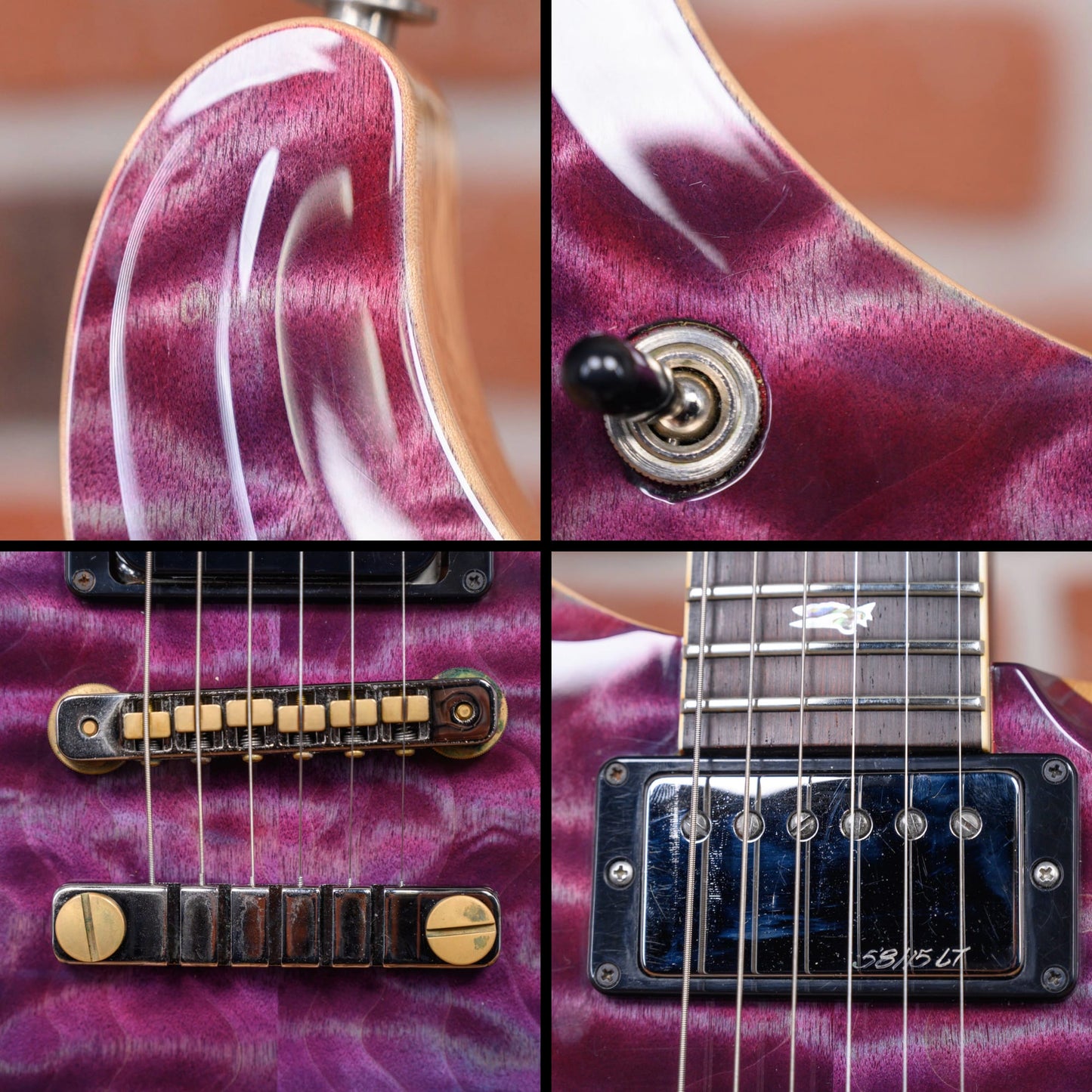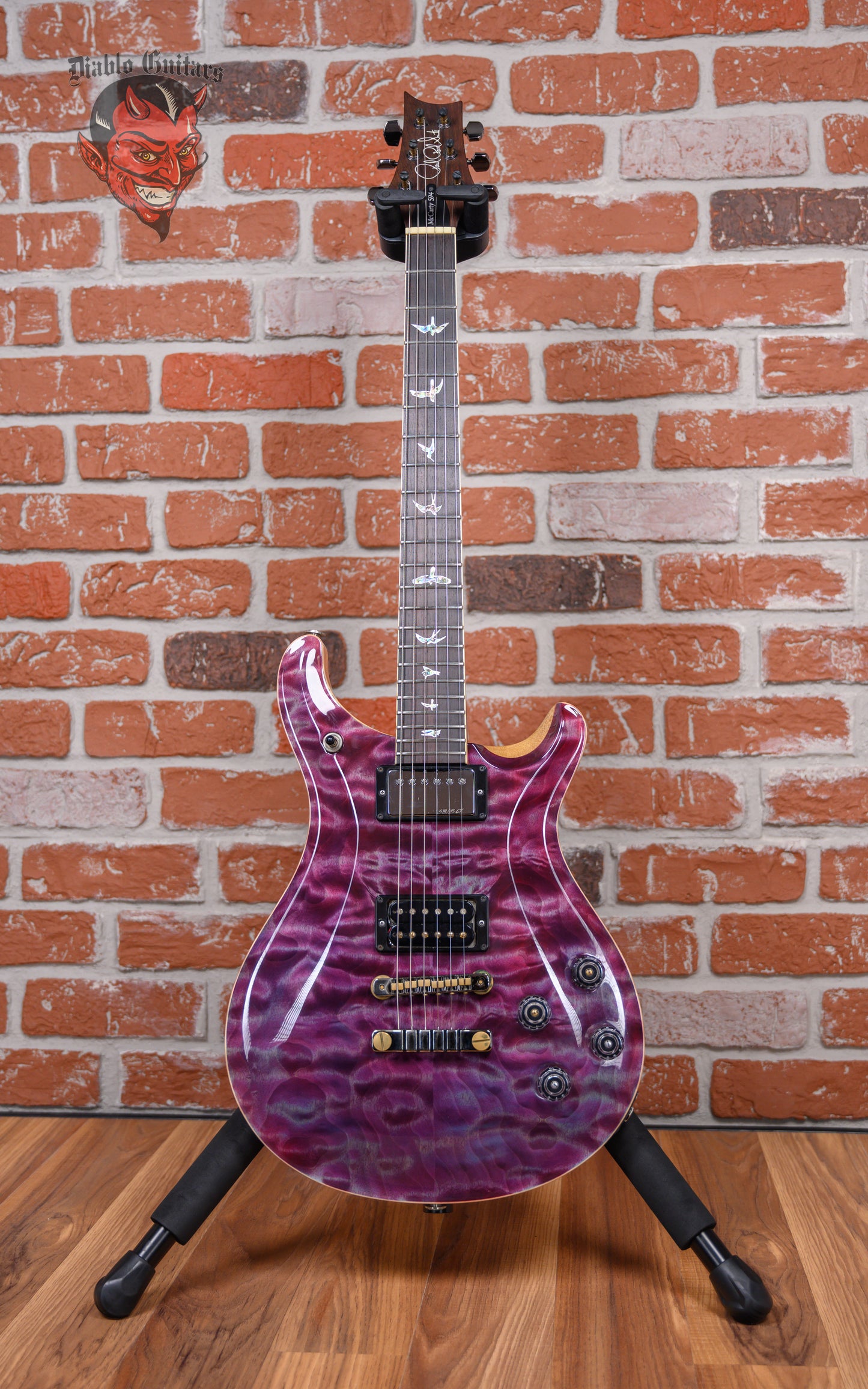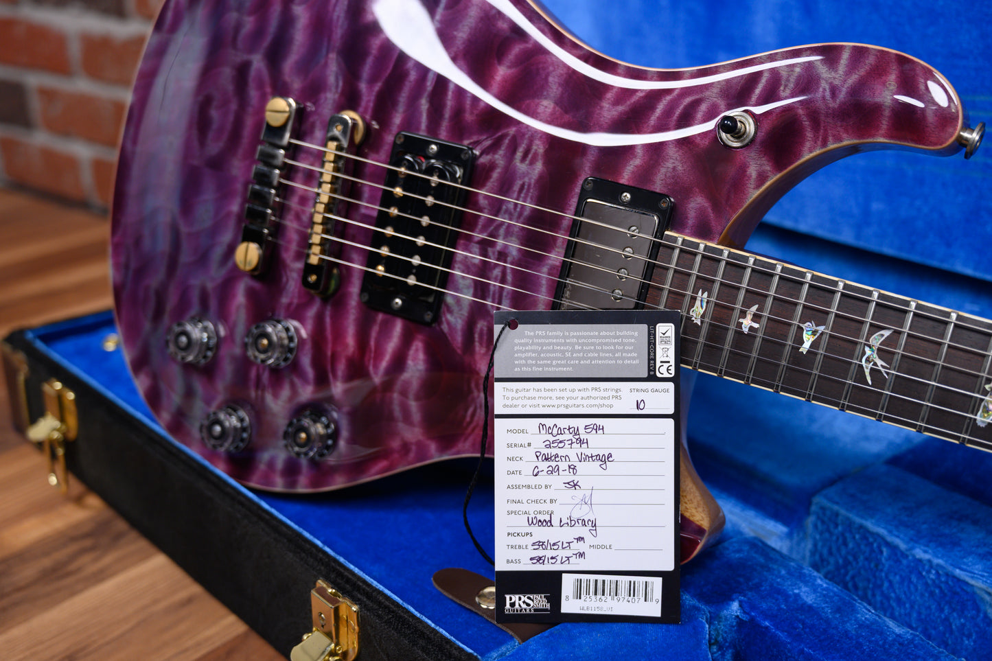 PRS Wood Library McCarty 594 in Purple Iris finish made in 2018 with Original Hard Shell Case. This guitar features a solid korina body with a natural bound quilted maple 10 top, Brazilian rosewood neck and bound Brazilian rosewood fingerboard. Equipped with a PRS 58/15 LT in the neck position and a Bare Knuckle Stormy Monday in the bridge position. Controlled by 2 volume pots, 2 tone pots with push/pull coil split and a 3-way toggle switch. The 24.594" scale length neck has mother of pearl outlined abalone birds inlays and black side markers with 22 medium jumbo frets on a 10" radius with a Pattern Vintage profile. The hardware is comprised of black chrome PRS Phase III Locking tuning machines with cloche heads, a bone nut, a PRS Two-Piece Adjustable bridge and clear lamp shade knobs.