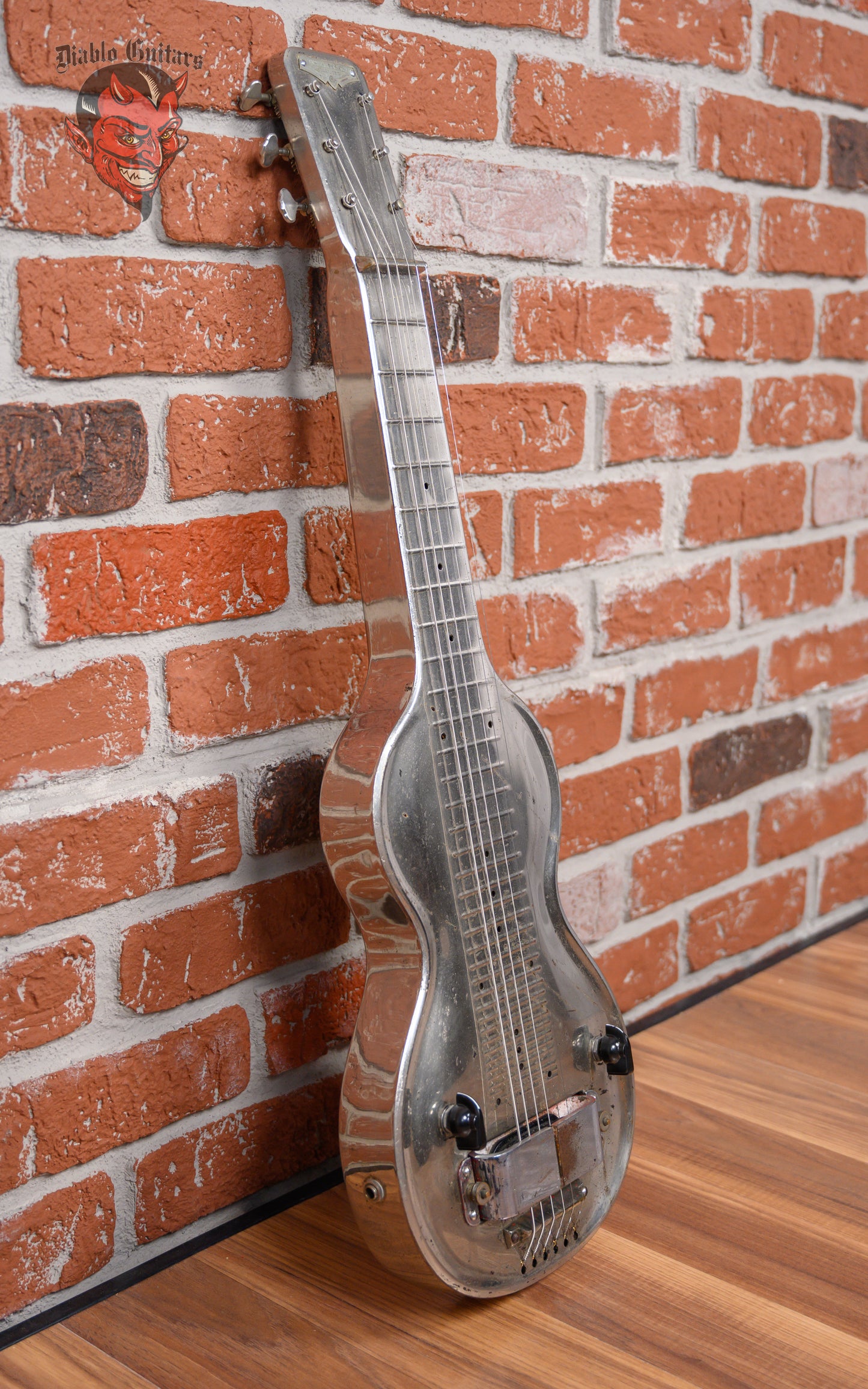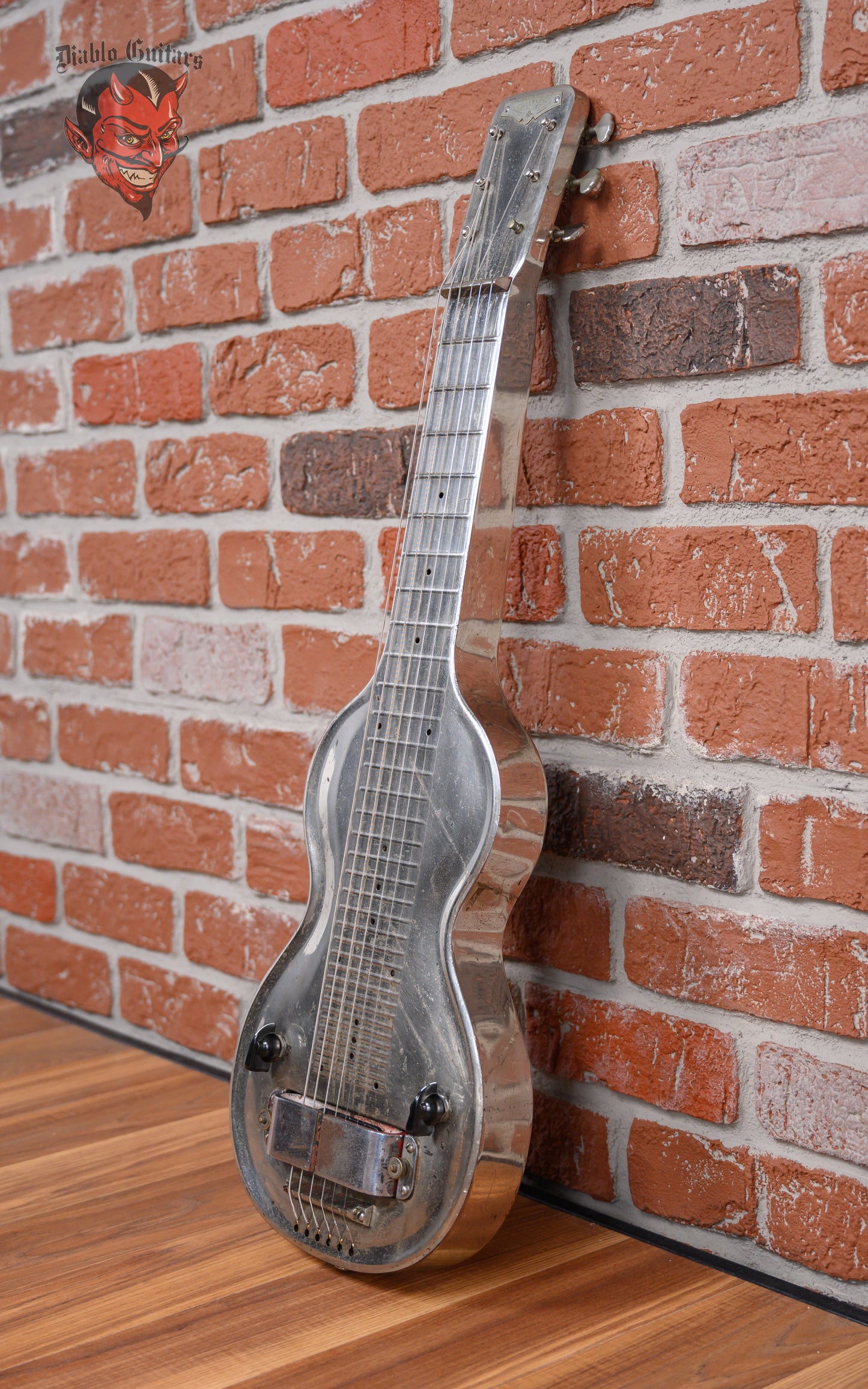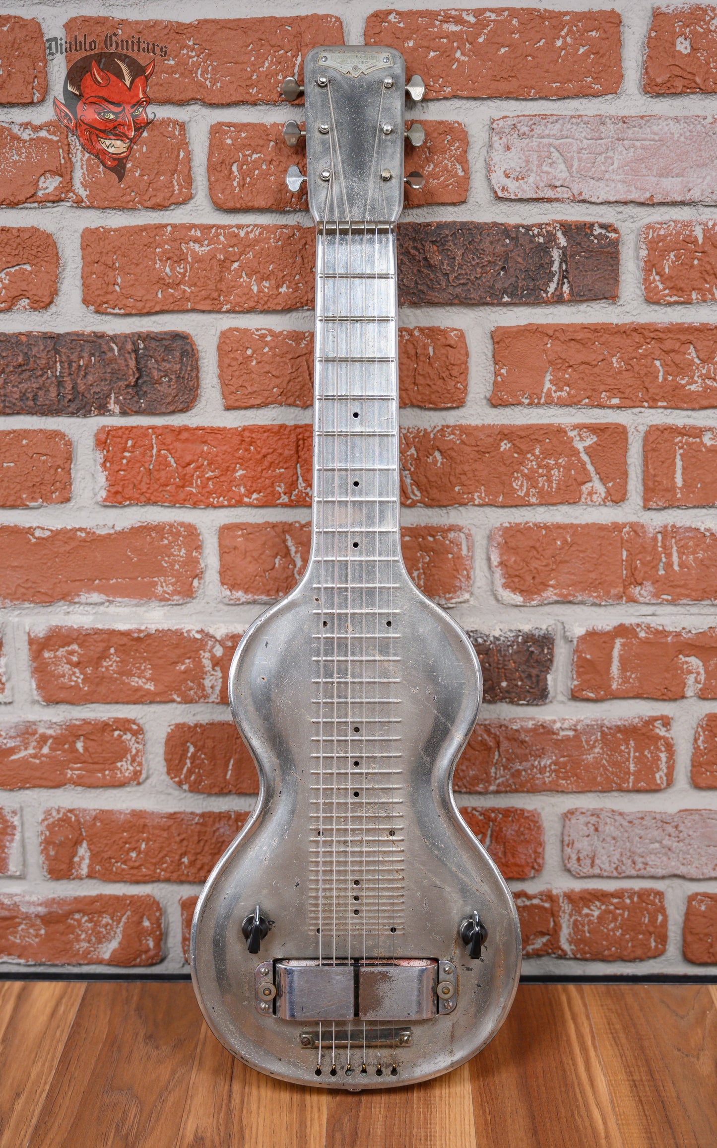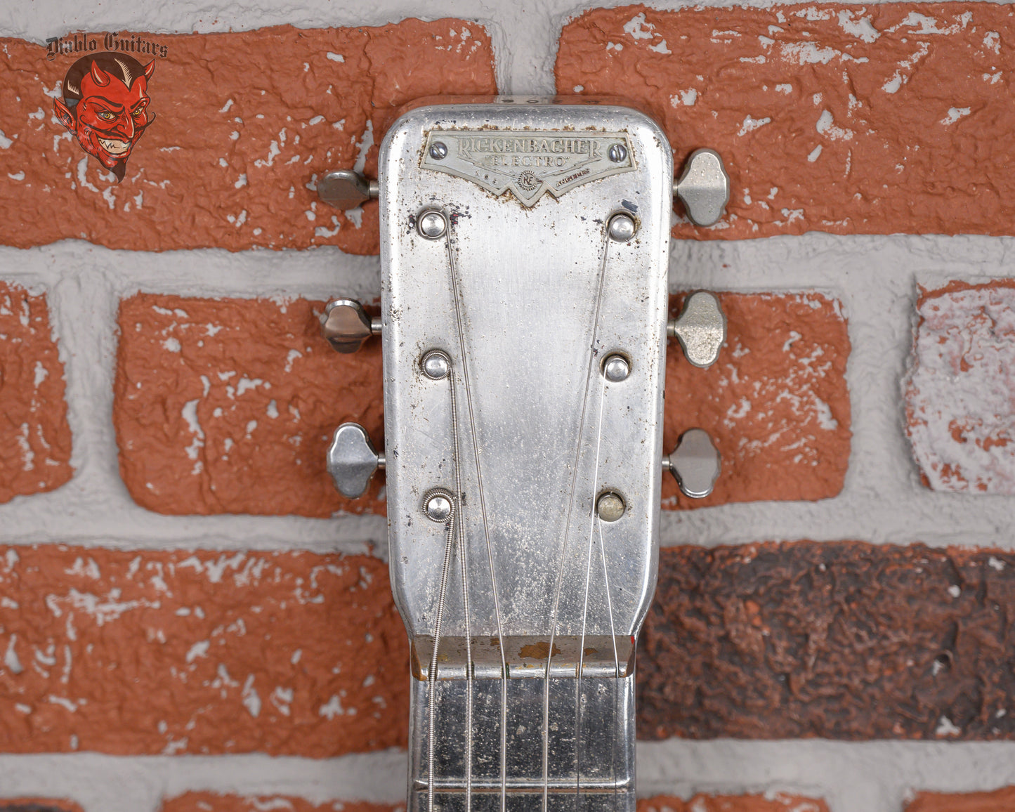 Vintage Rickenbacher Hawaiian Lap Steel in Natural finish made in 1938 with Hard Shell Case. This guitar features a hollow stamped steel body, stamped steel neck and fingerboard. Equipped with a Rickenbacher Horseshoe in the bridge position, controlled by one volume pot and one 4-way varitone pot. The 22.5" scale length neck has dot inlays and no side markers with 36 stamped frets on a flat radius. The hardware is comprised of nickel Grover open gear tuning machines with butterbean heads, a steel nut, a Rickenbacher saddle bridge and chicken head knobs.