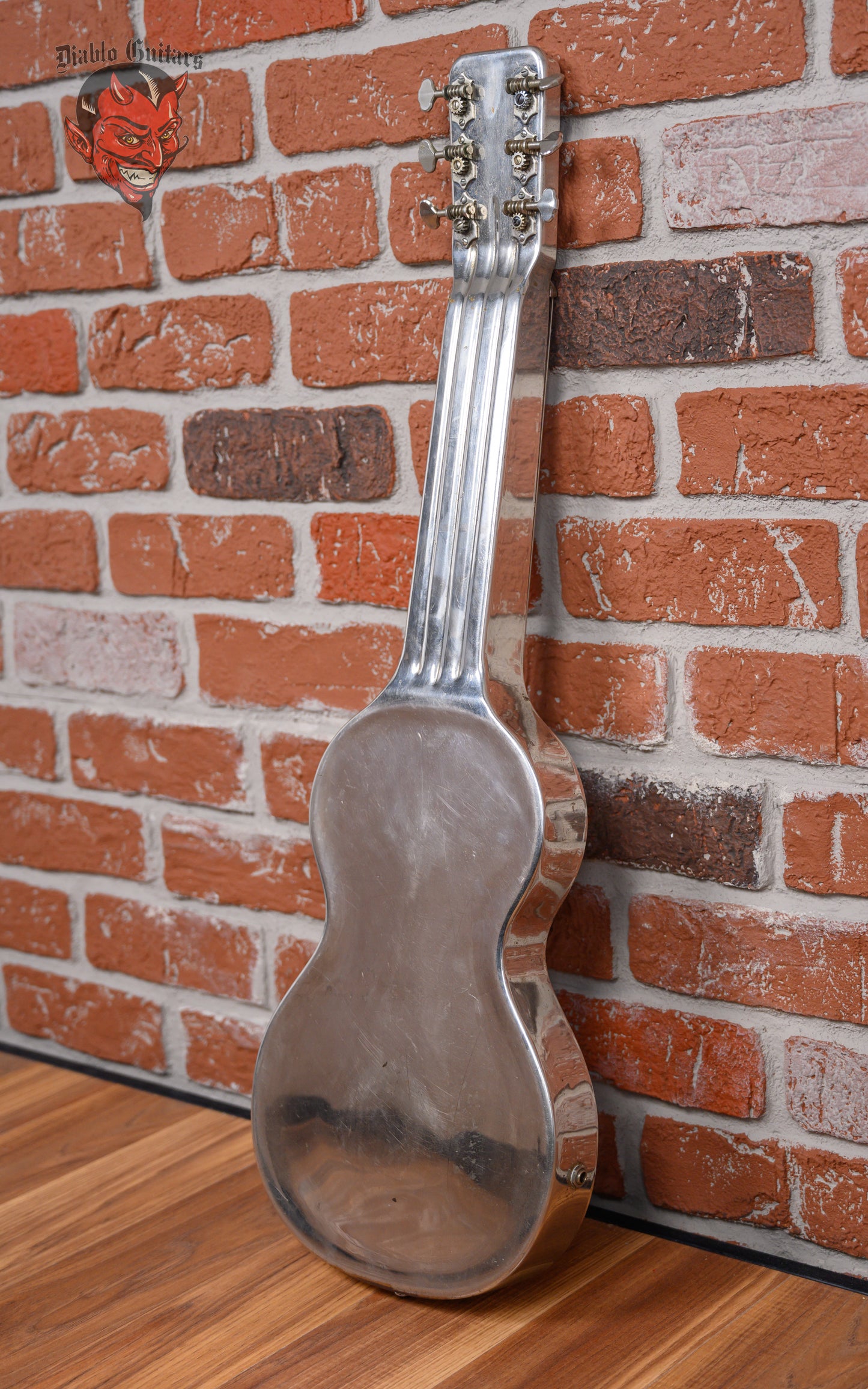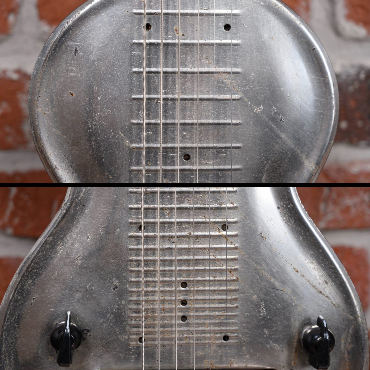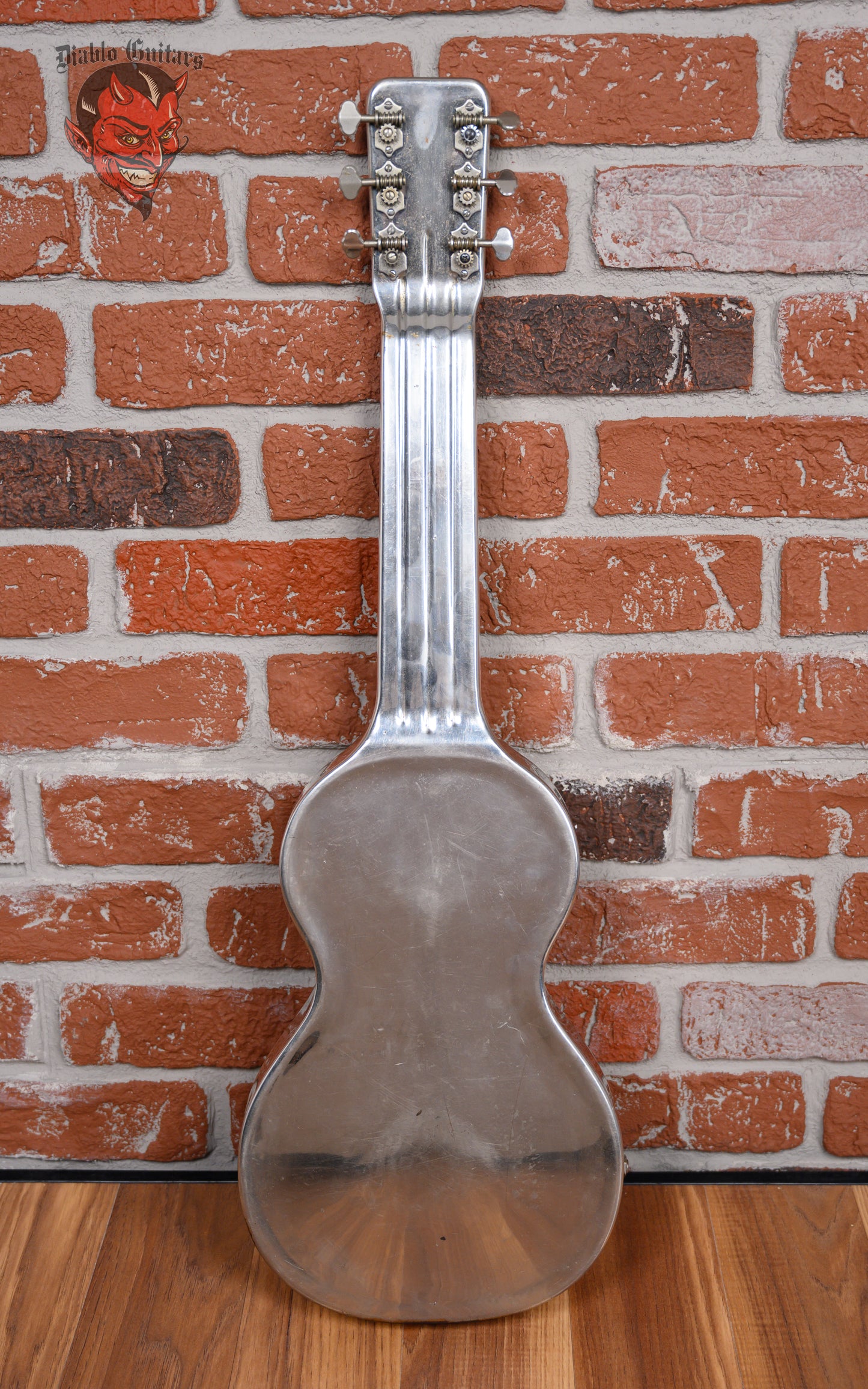 Vintage Rickenbacher Hawaiian Lap Steel in Natural finish made in 1938 with Hard Shell Case. This guitar features a hollow stamped steel body, stamped steel neck and fingerboard. Equipped with a Rickenbacher Horseshoe in the bridge position, controlled by one volume pot and one 4-way varitone pot. The 22.5" scale length neck has dot inlays and no side markers with 36 stamped frets on a flat radius. The hardware is comprised of nickel Grover open gear tuning machines with butterbean heads, a steel nut, a Rickenbacher saddle bridge and chicken head knobs.