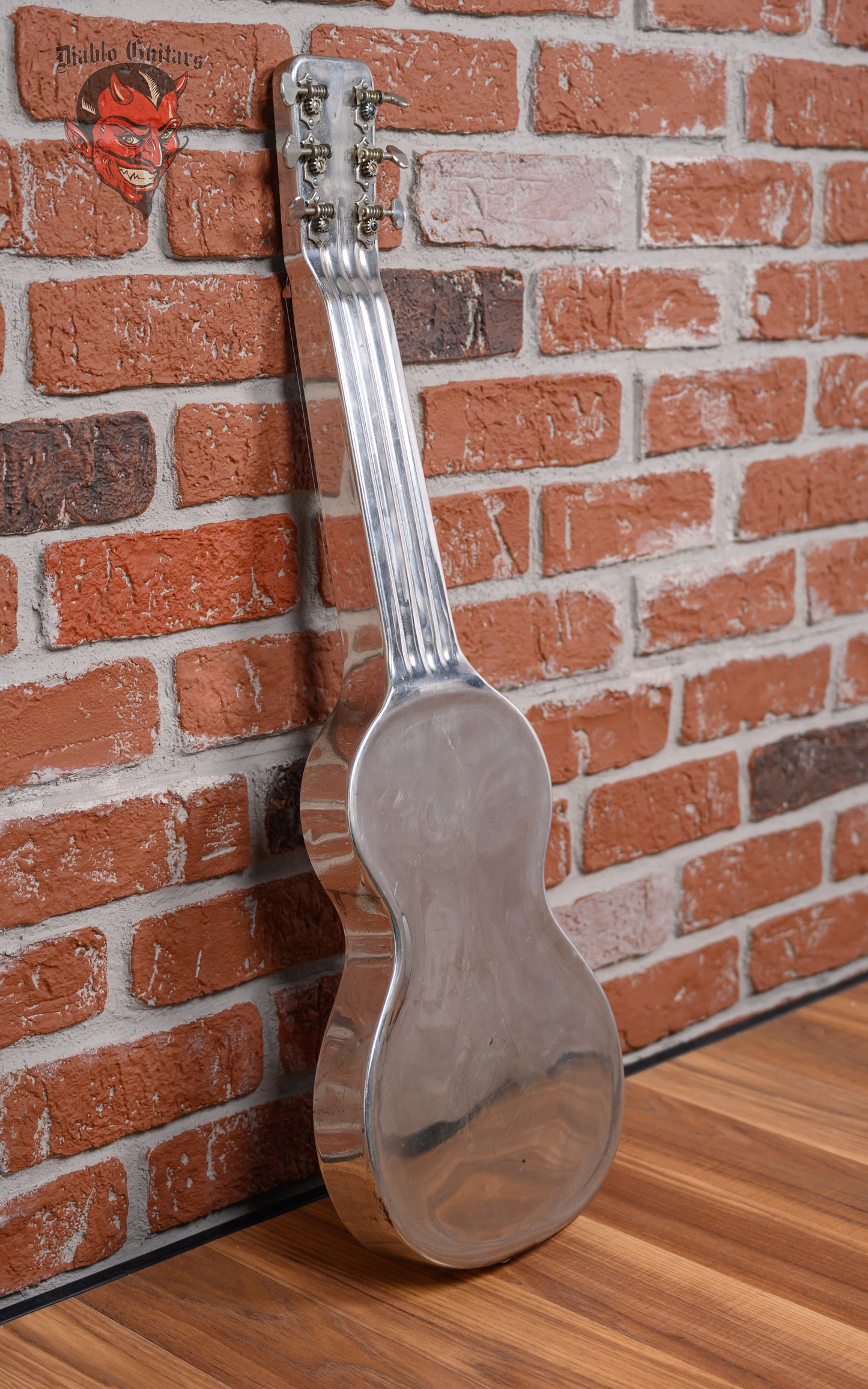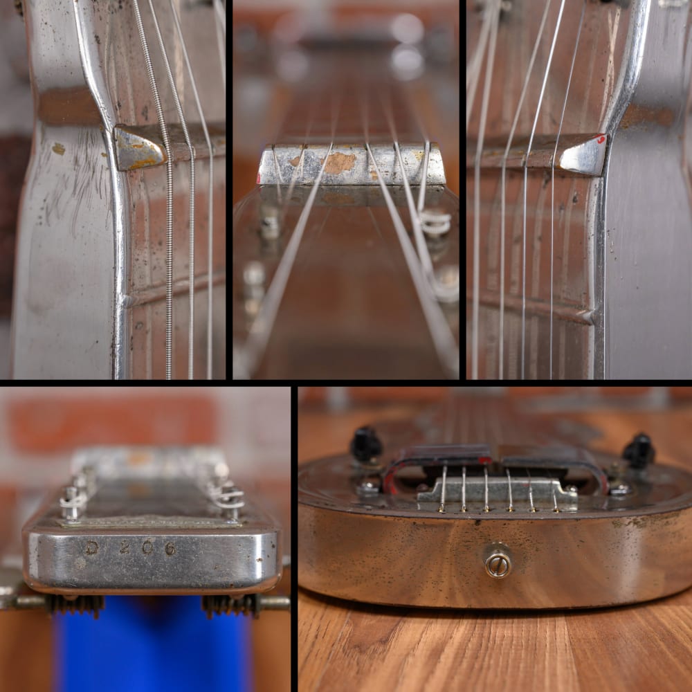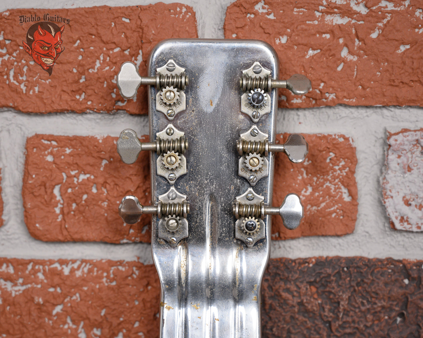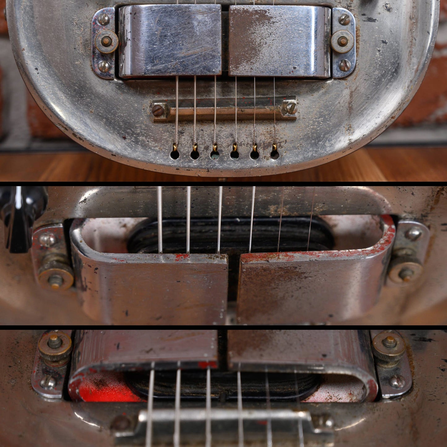 Vintage Rickenbacher Hawaiian Lap Steel in Natural finish made in 1938 with Hard Shell Case. This guitar features a hollow stamped steel body, stamped steel neck and fingerboard. Equipped with a Rickenbacher Horseshoe in the bridge position, controlled by one volume pot and one 4-way varitone pot. The 22.5" scale length neck has dot inlays and no side markers with 36 stamped frets on a flat radius. The hardware is comprised of nickel Grover open gear tuning machines with butterbean heads, a steel nut, a Rickenbacher saddle bridge and chicken head knobs.