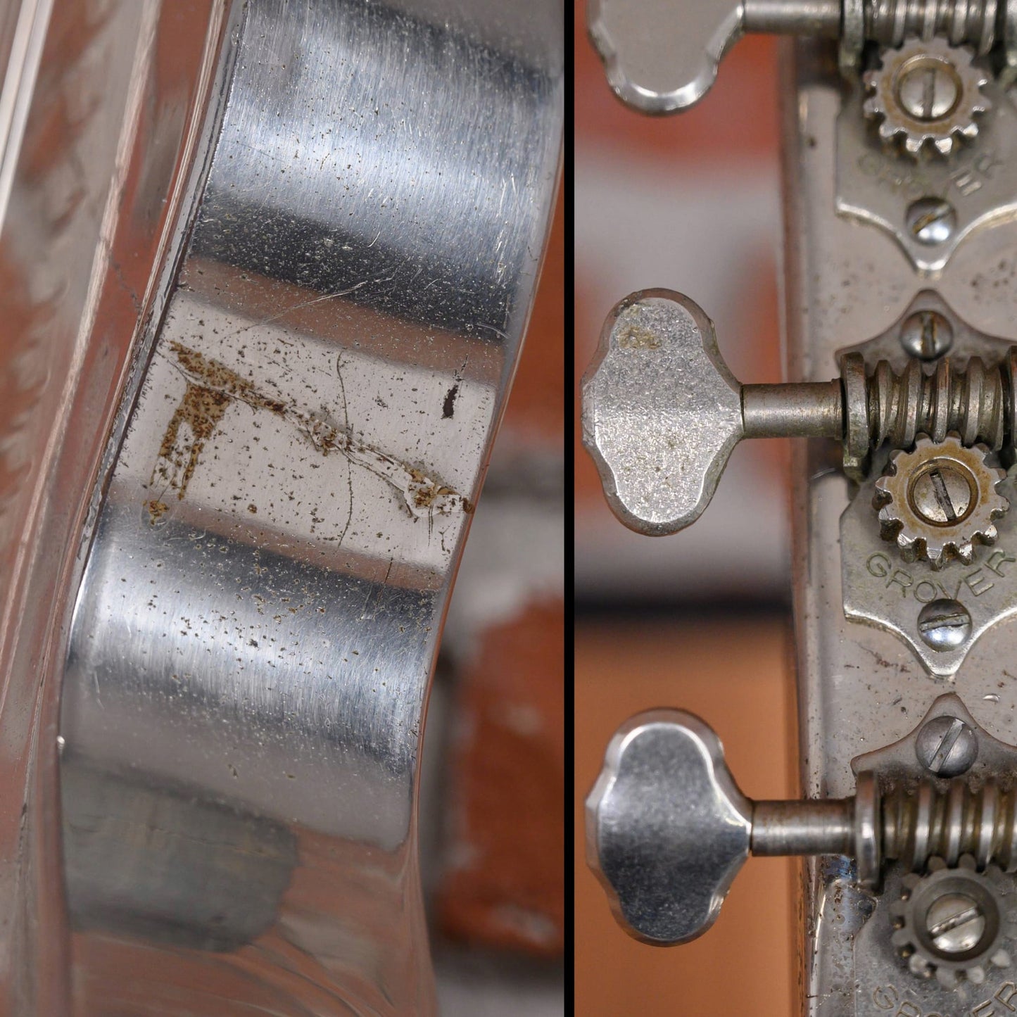 This guitar is in overall good condition. The bridge and nut appear to have been painted red at some point in its life. There are marks and plating chips throughout the neck and body. The guitar arrived to us without knobs and were replaced by our luthiers. (See pics)