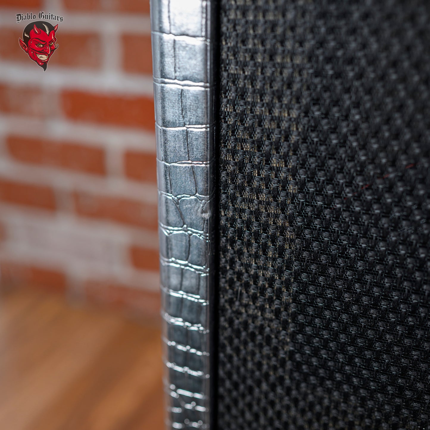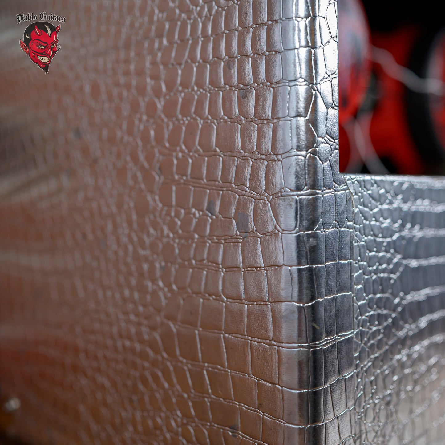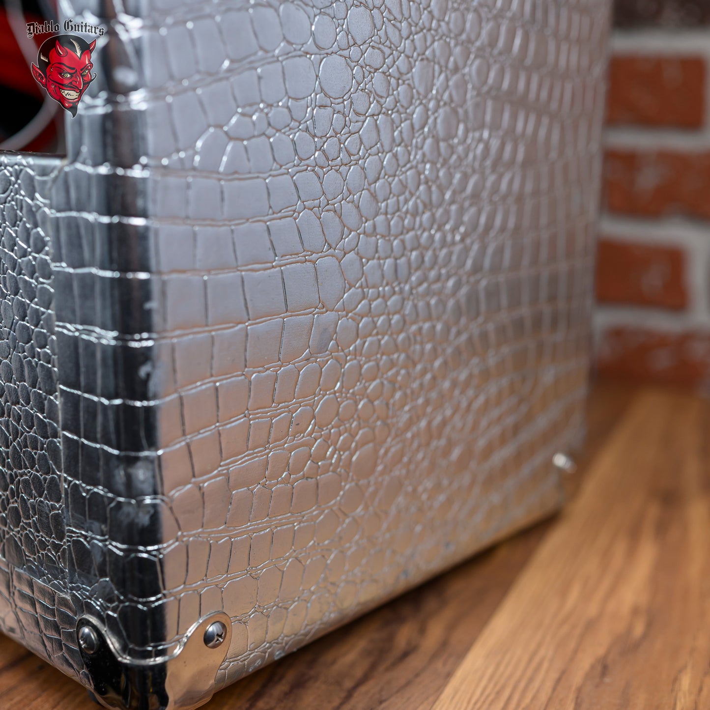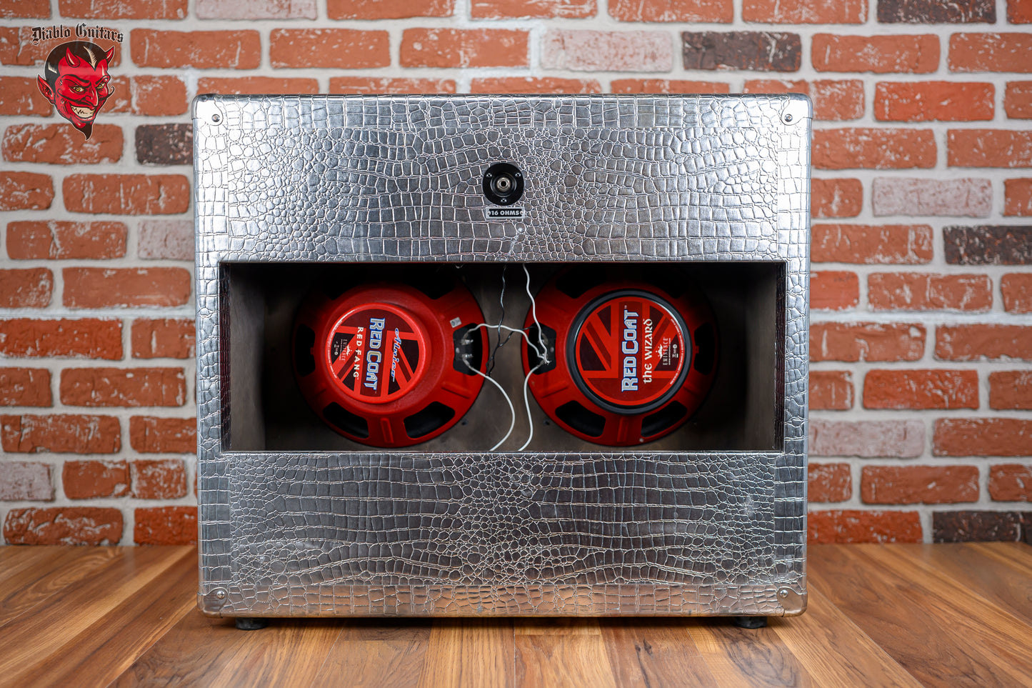 Soldano 2x12 Straight Guitar Cabinet finished in a Silver Crocodile vinyl covering. Likely a 2010s unit, this cabinet appears to have been re-tolexed and is front-loaded, open back, and oversized for a standard 2x12. The speakers sit side-by-side in a nearly square enclosure. It is loaded with a pair of Eminence Redcoat series speakers, one Red Fang and one Wizard, for a combined 16-ohm load.