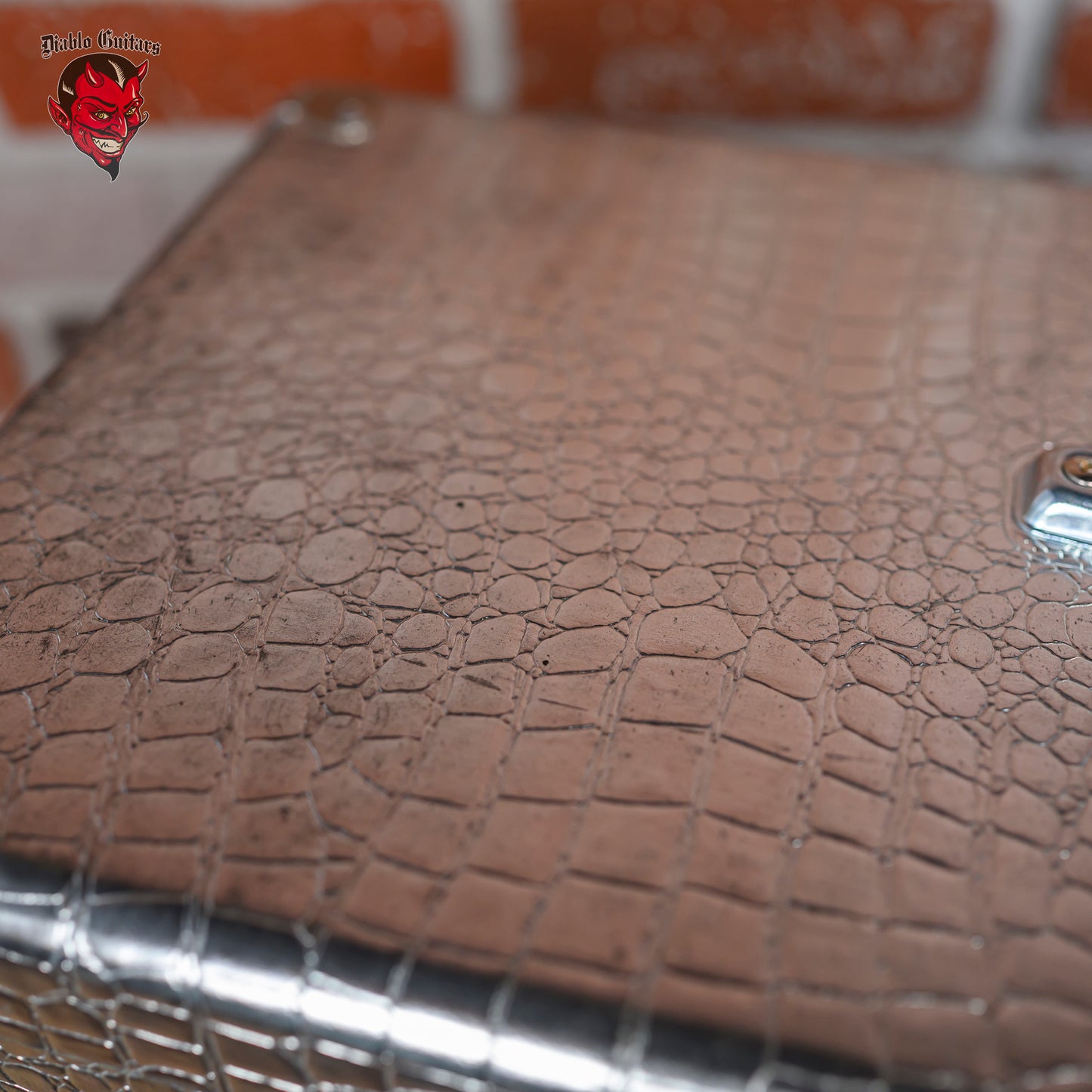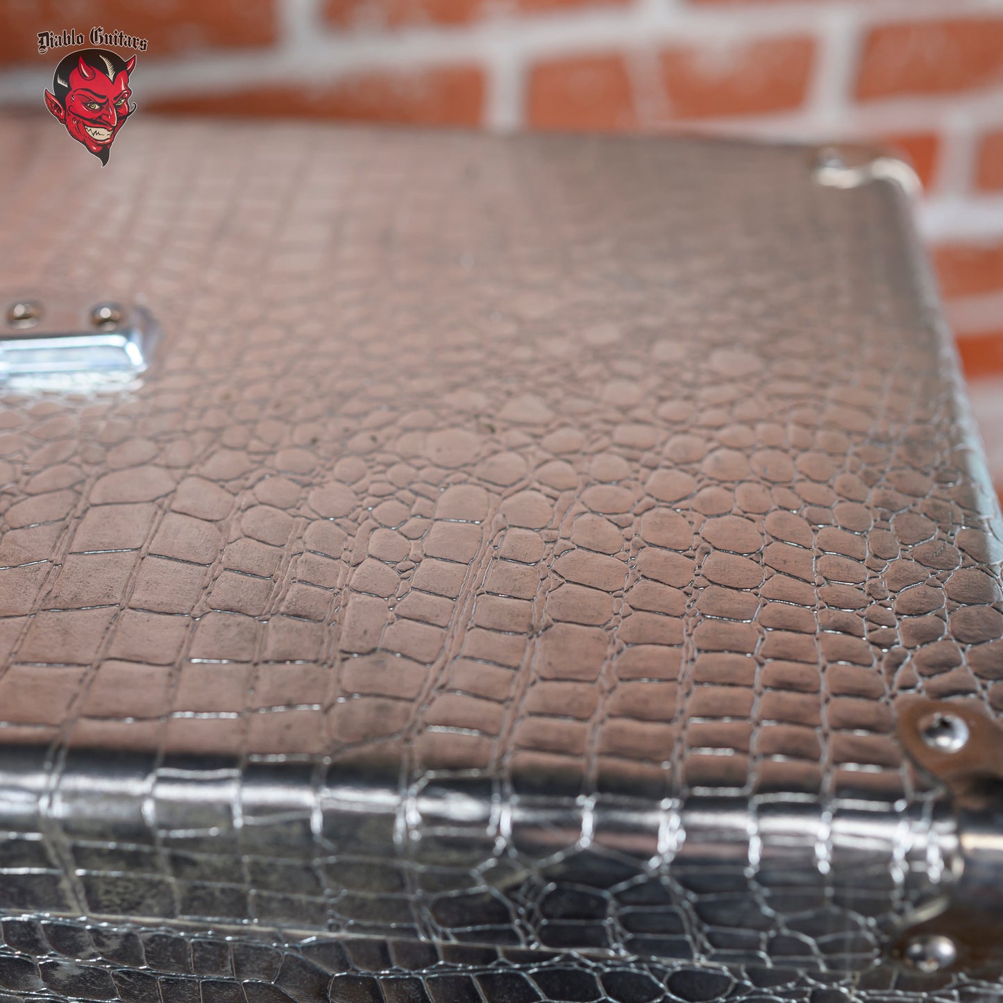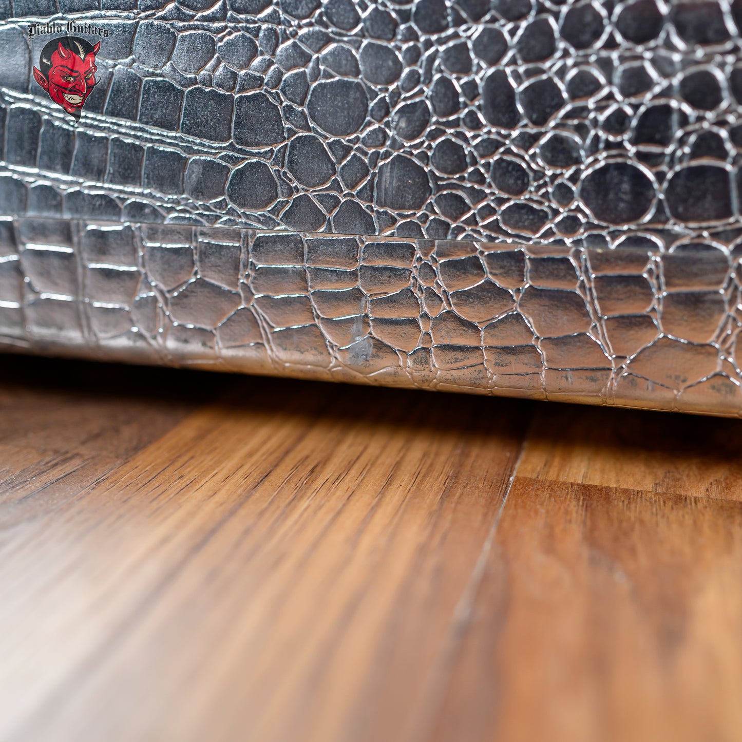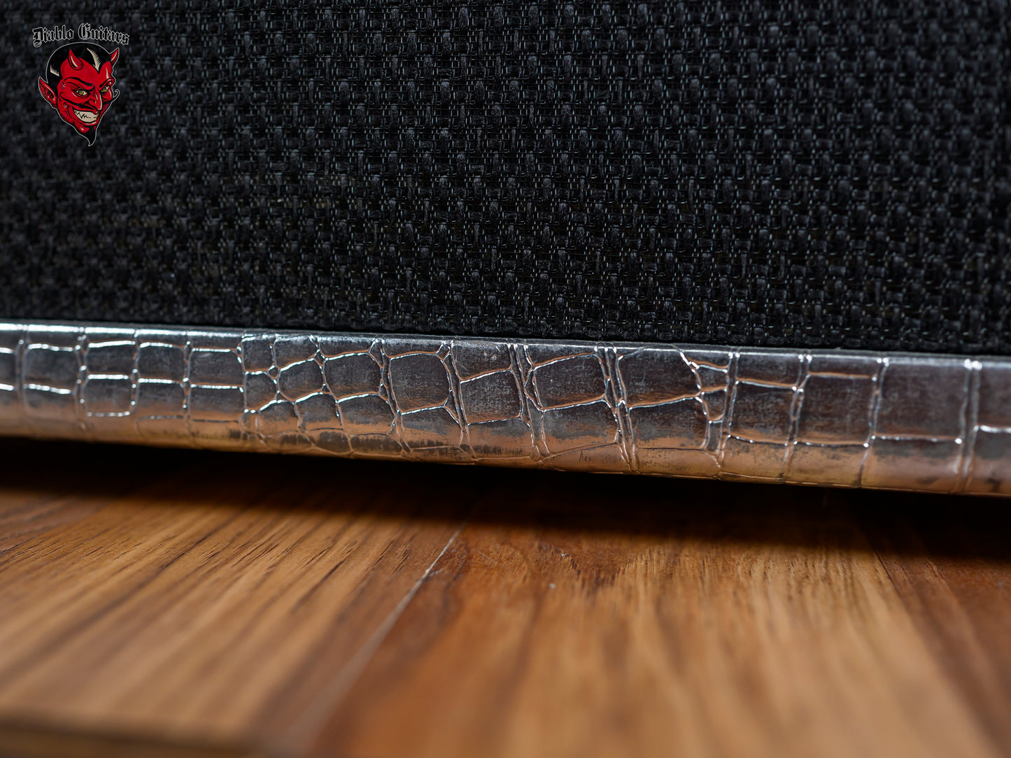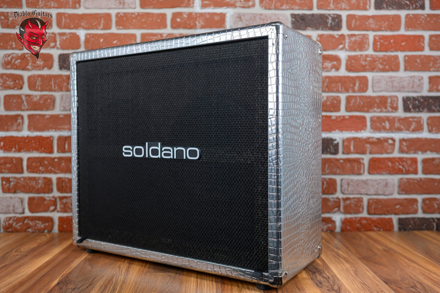 Soldano 2x12 Straight Guitar Cabinet finished in a Silver Crocodile vinyl covering. Likely a 2010s unit, this cabinet appears to have been re-tolexed and is front-loaded, open back, and oversized for a standard 2x12. The speakers sit side-by-side in a nearly square enclosure. It is loaded with a pair of Eminence Redcoat series speakers, one Red Fang and one Wizard, for a combined 16-ohm load.