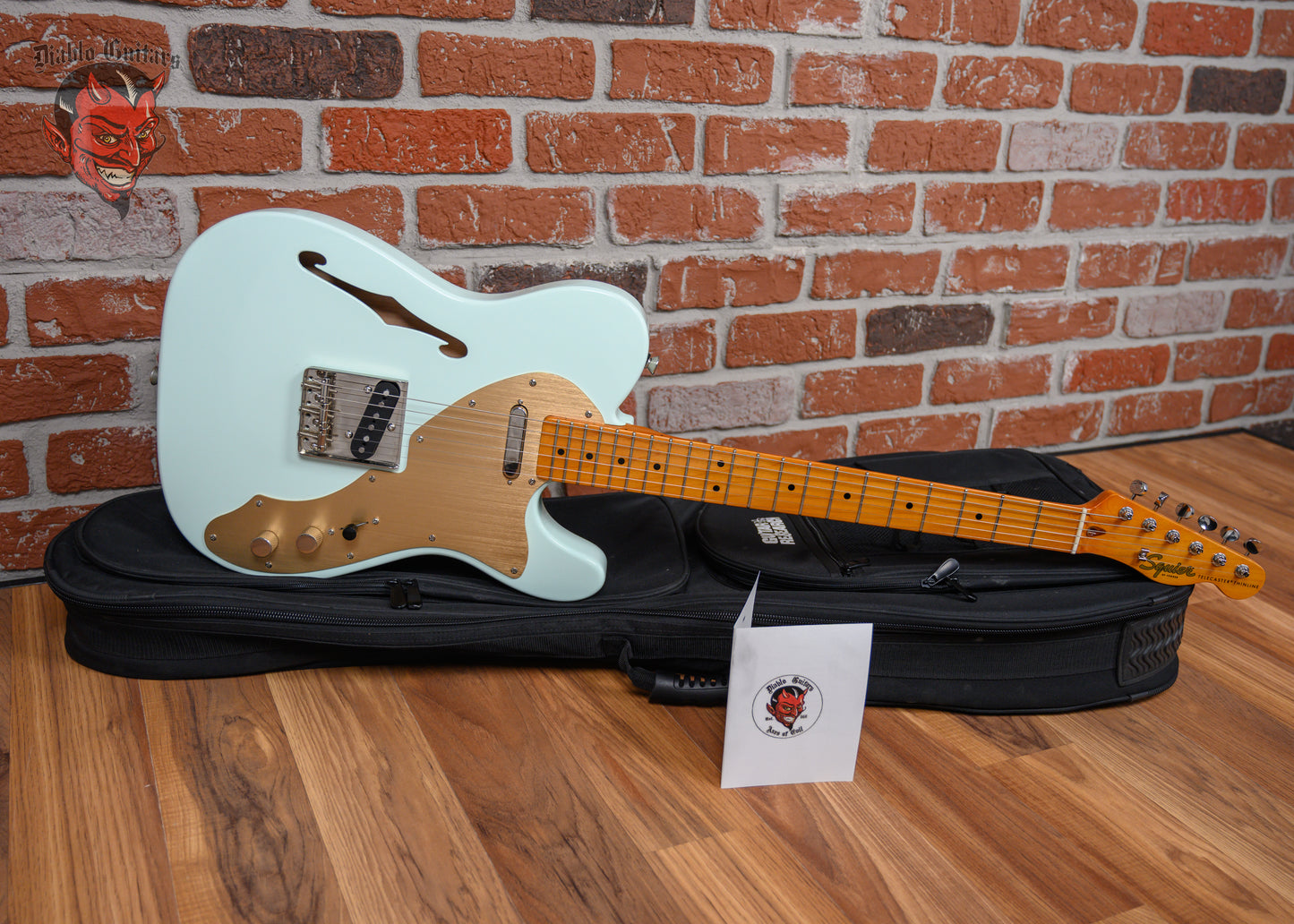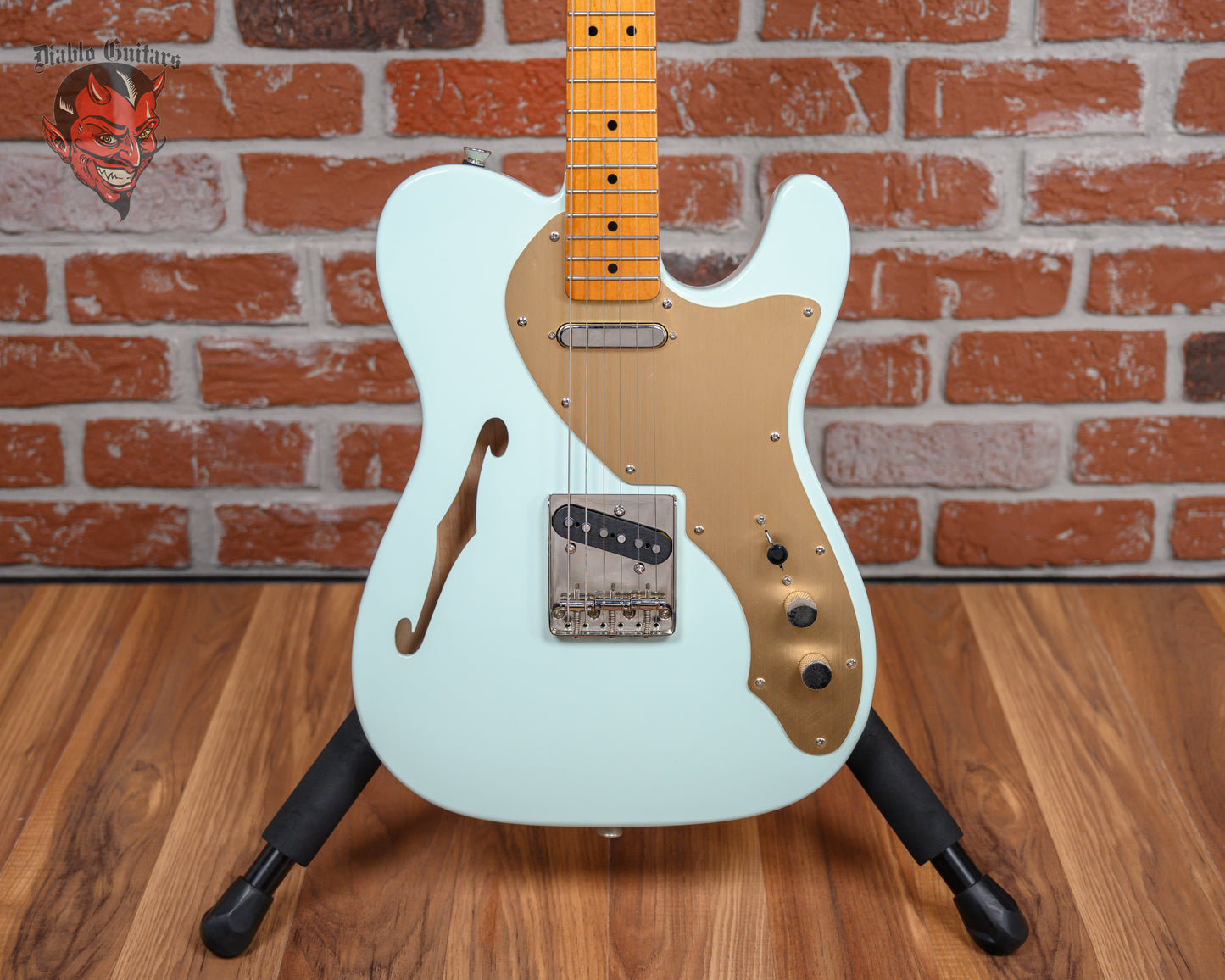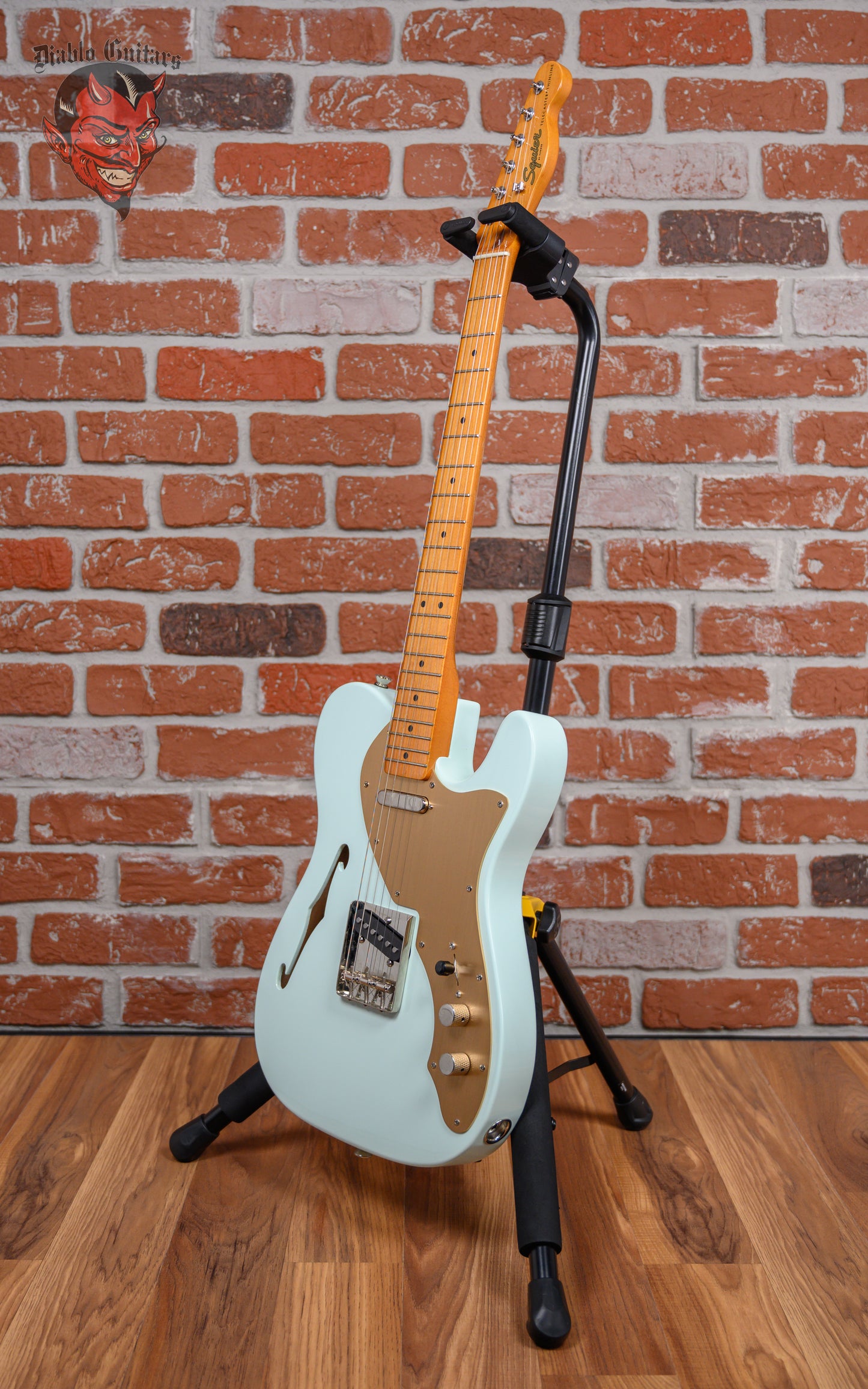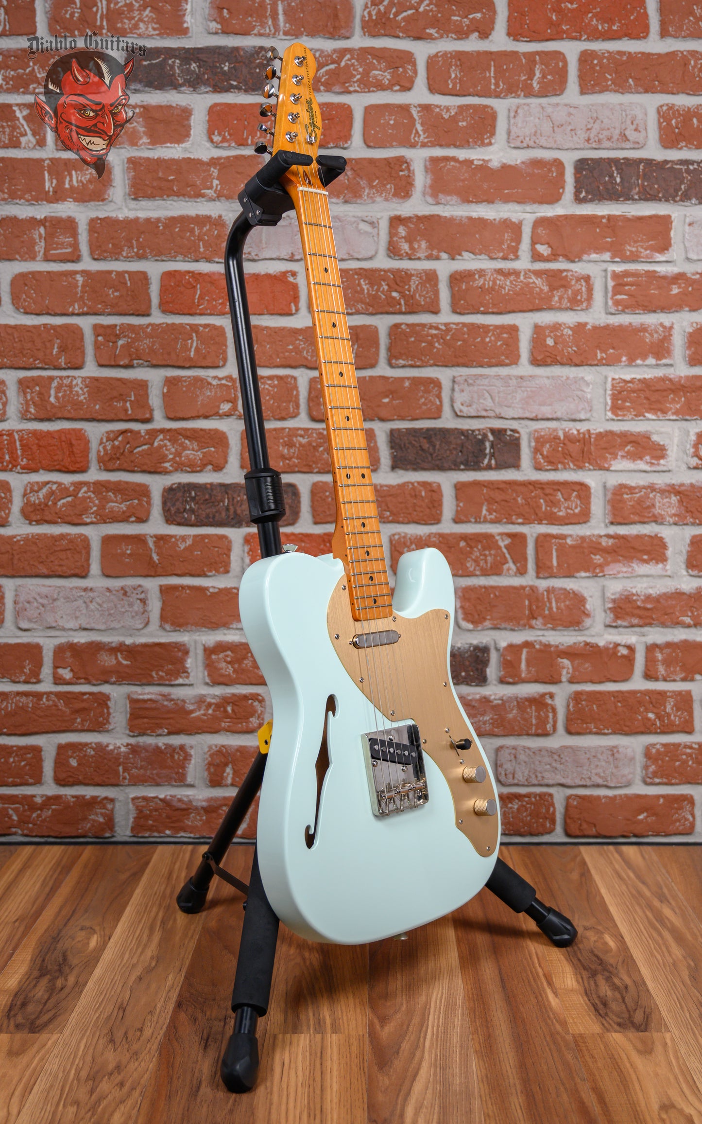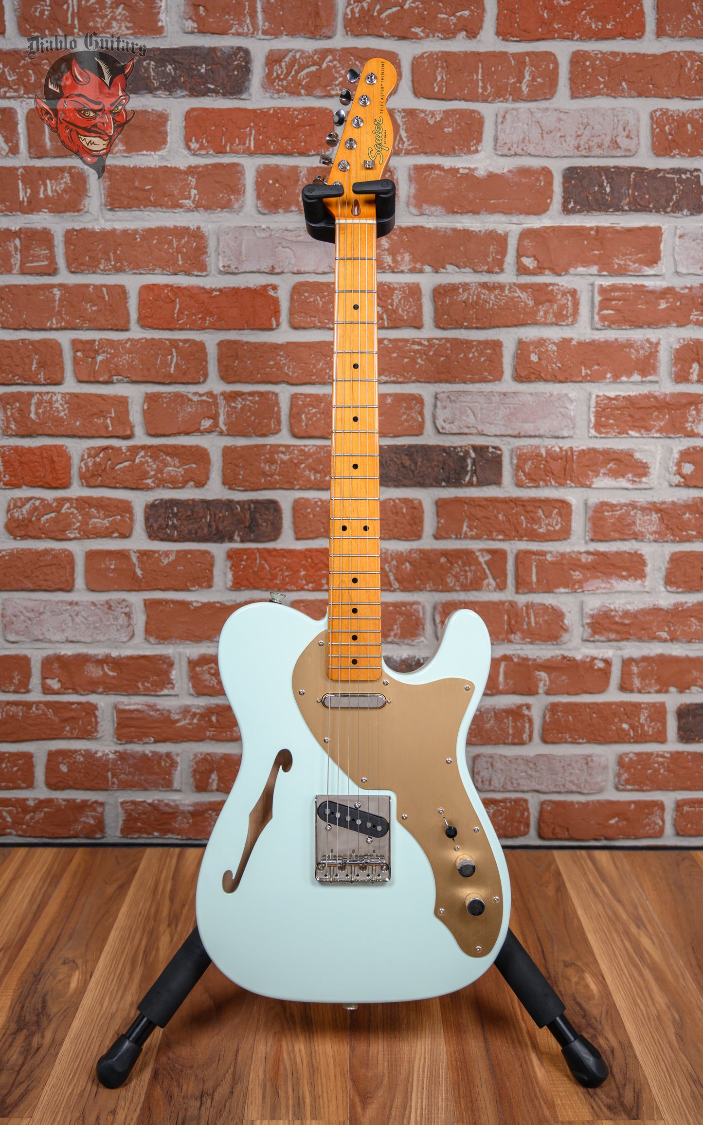 Squier Classic Vibe '60s Telecaster Thinline in Sonic Blue finish made in 2022 with Gigbag. This guitar features a semi-hollow nyatoh body, maple neck and maple fingerboard. Equipped with a set of Fender Designed Alnico Single-Coil pickups in the neck and bridge positions. Controlled by 1 volume pot, 1 tone pot and a 3-Way blade switch. The 25.5" scale length neck has black dot inlays and black side markers with 21 narrow tall frets on a 9.5" radius with a "C" shape profile. The hardware is comprised of nickel vintage style tuning machines with oval heads, a bone nut, a 3-saddle vintage-style strings-through-body Tele bridge with chrome barrel saddles and chrome knurled flat top knobs with a gold anodized aluminum pickguard.