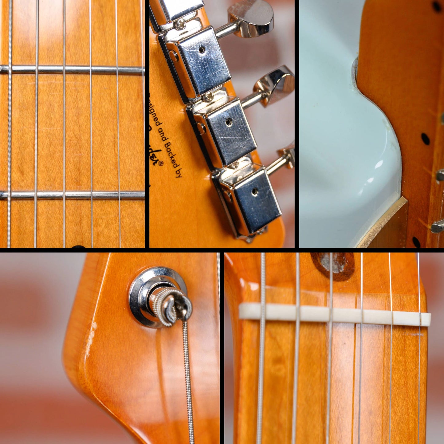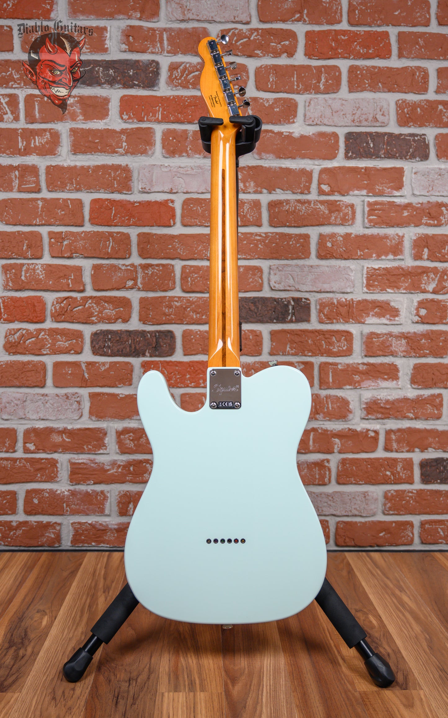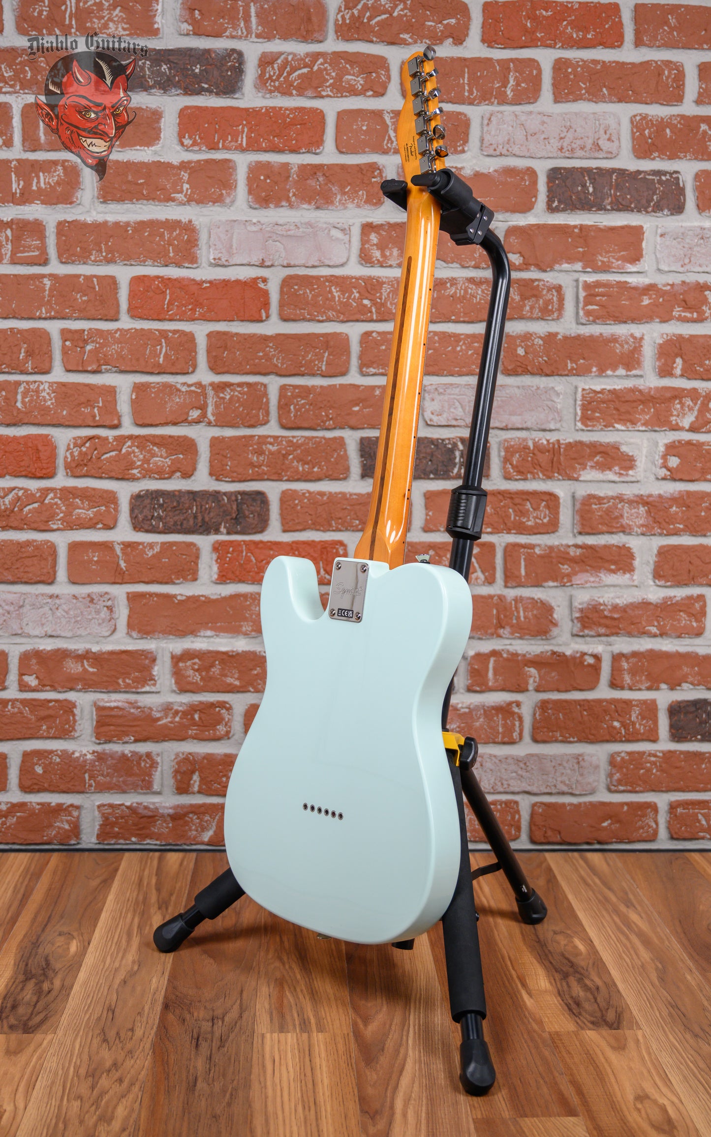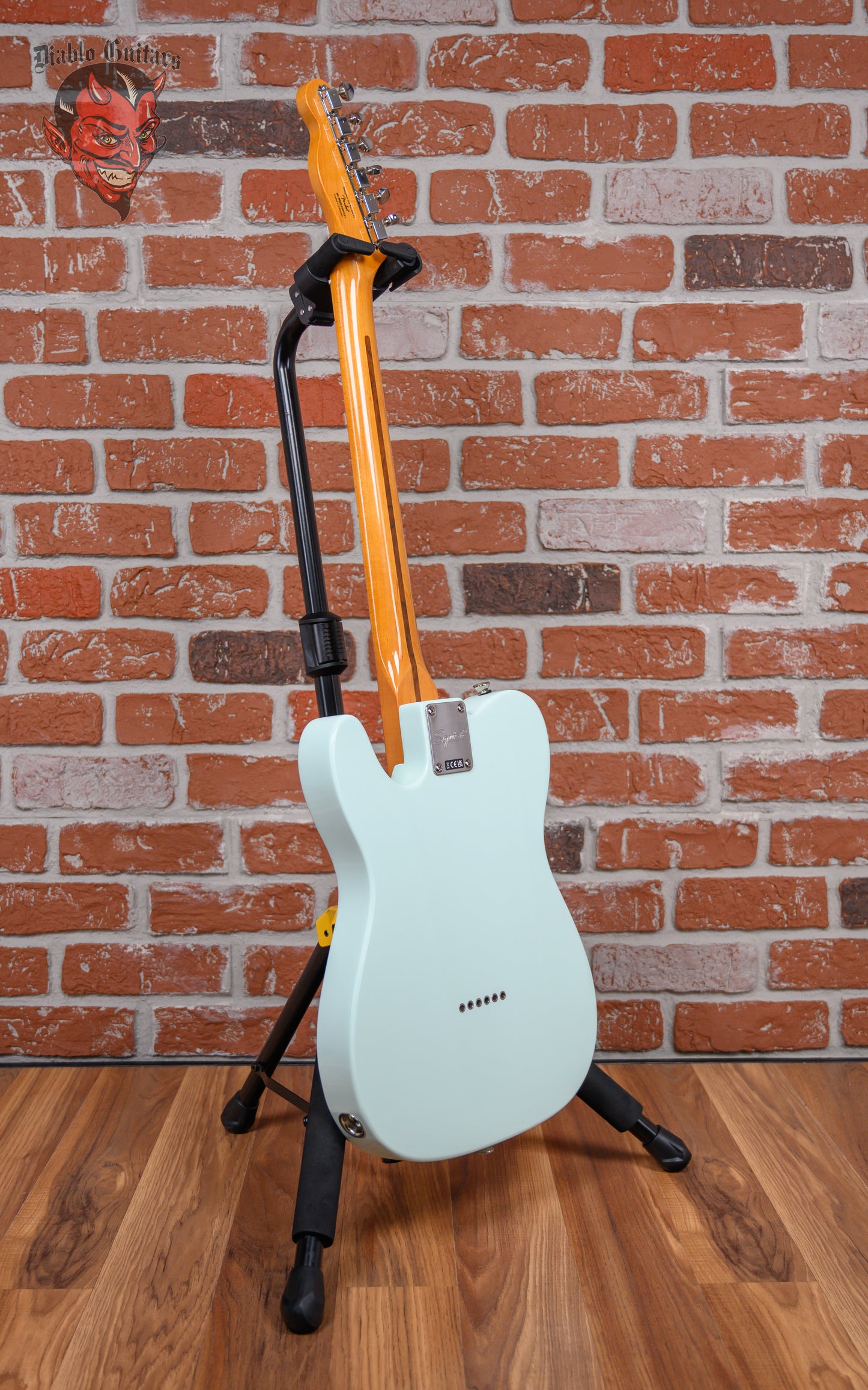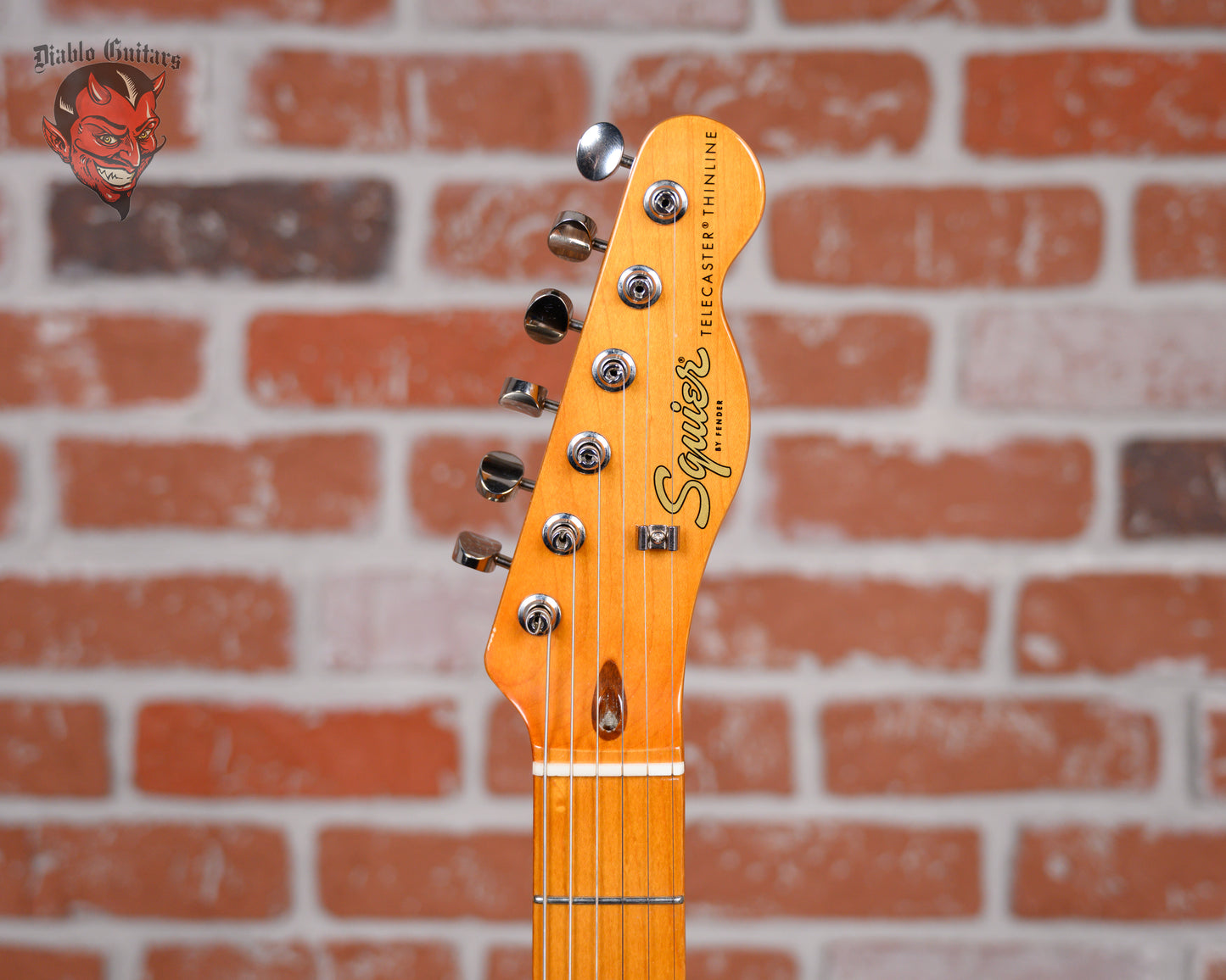 Squier Classic Vibe '60s Telecaster Thinline in Sonic Blue finish made in 2022 with Gigbag. This guitar features a semi-hollow nyatoh body, maple neck and maple fingerboard. Equipped with a set of Fender Designed Alnico Single-Coil pickups in the neck and bridge positions. Controlled by 1 volume pot, 1 tone pot and a 3-Way blade switch. The 25.5" scale length neck has black dot inlays and black side markers with 21 narrow tall frets on a 9.5" radius with a "C" shape profile. The hardware is comprised of nickel vintage style tuning machines with oval heads, a bone nut, a 3-saddle vintage-style strings-through-body Tele bridge with chrome barrel saddles and chrome knurled flat top knobs with a gold anodized aluminum pickguard.