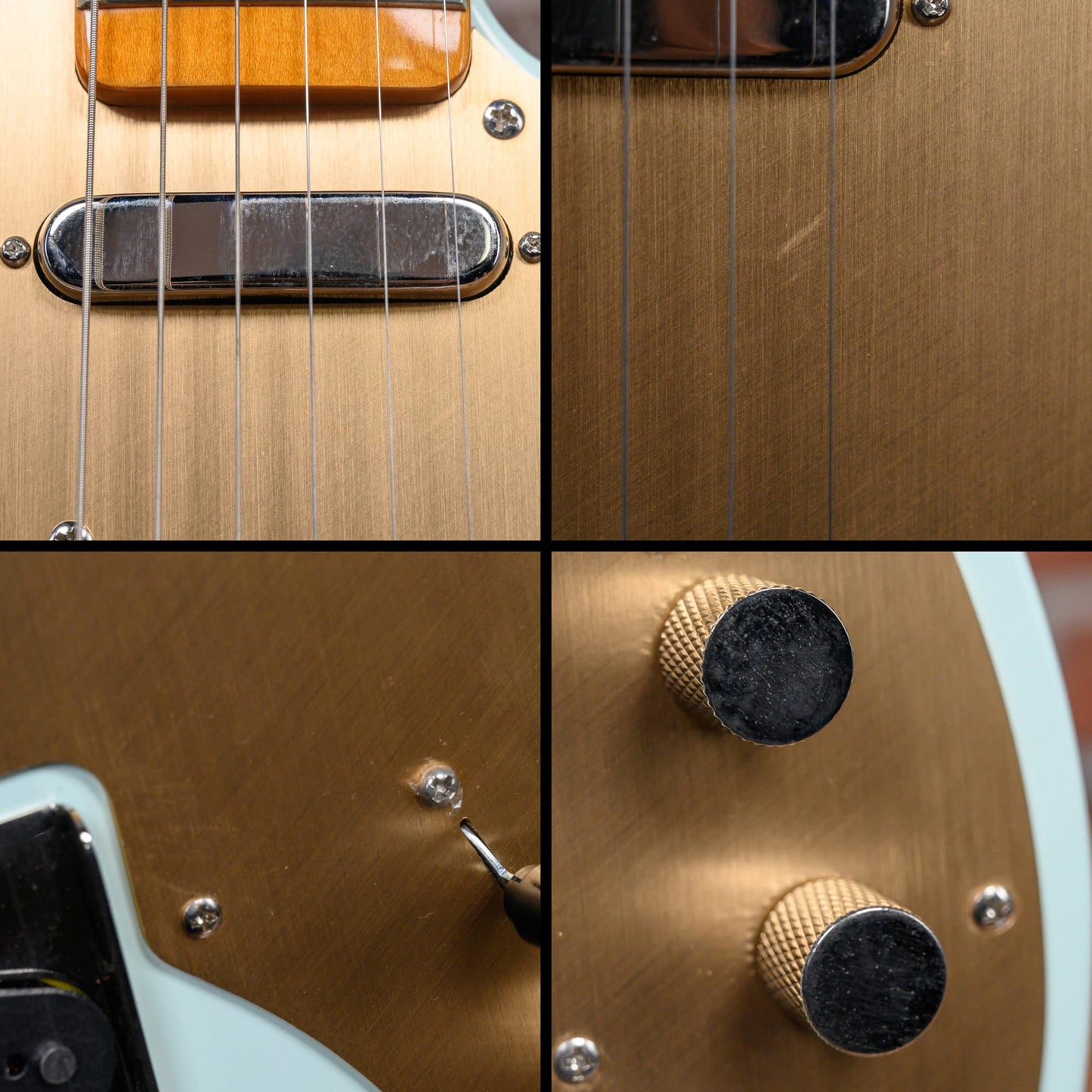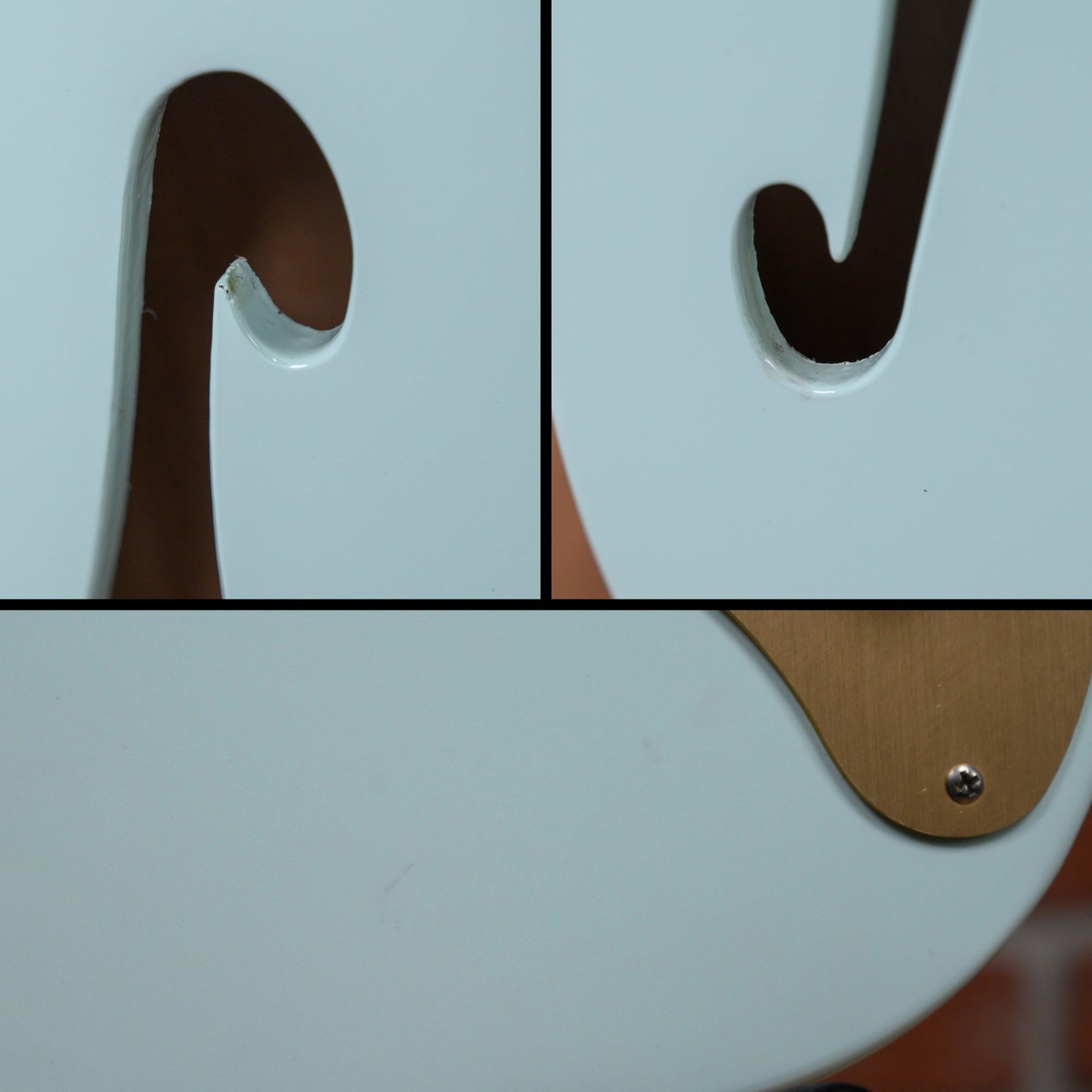 This guitar is in overall excellent condition. There are some light surface marks on the tuners and on the fretboard. The body has some light discoloration around the neck pocket, the front lower bout, and around the F-hole. The pickguard has some light marks on the treble side and the knobs show some wear. (See pics)