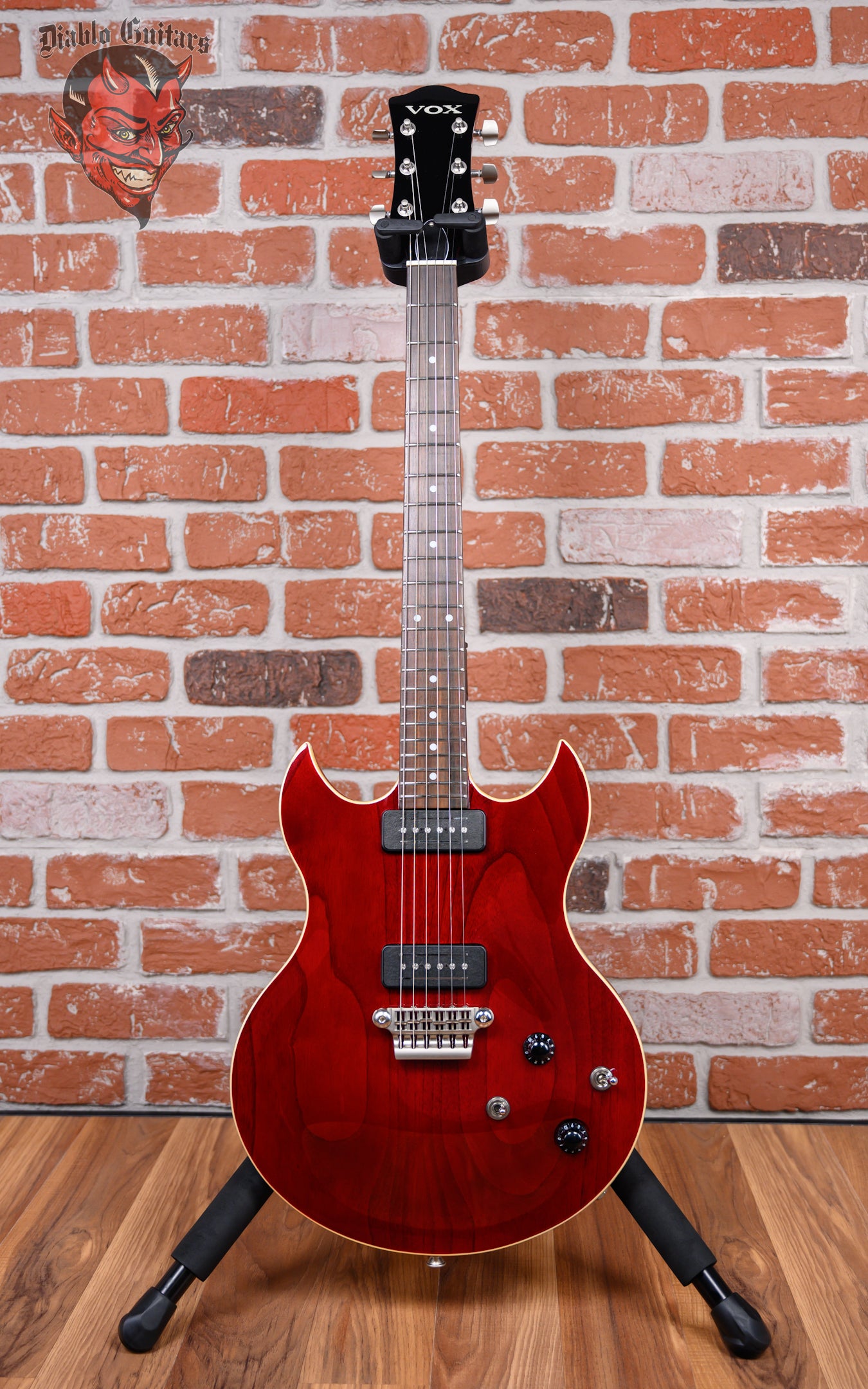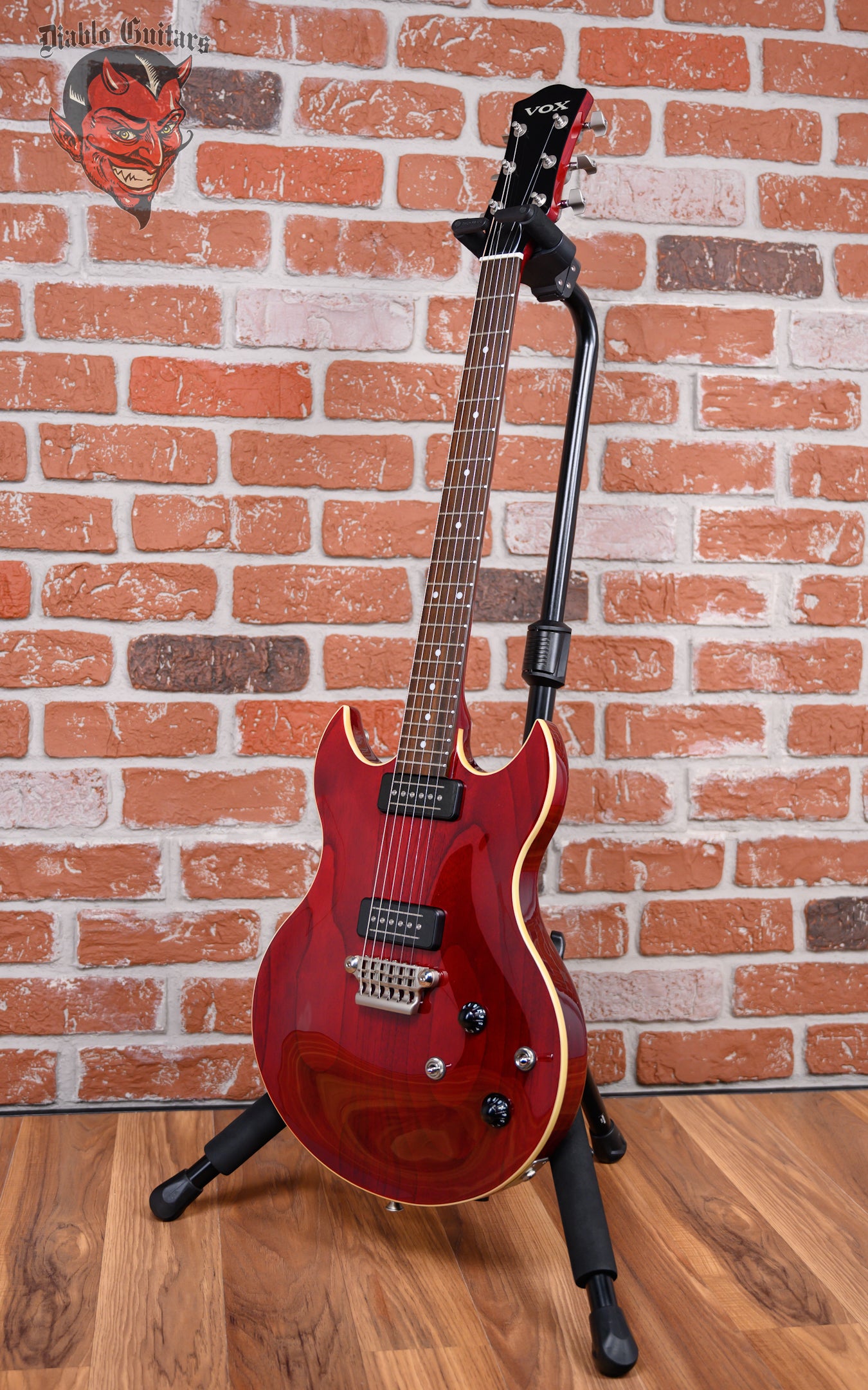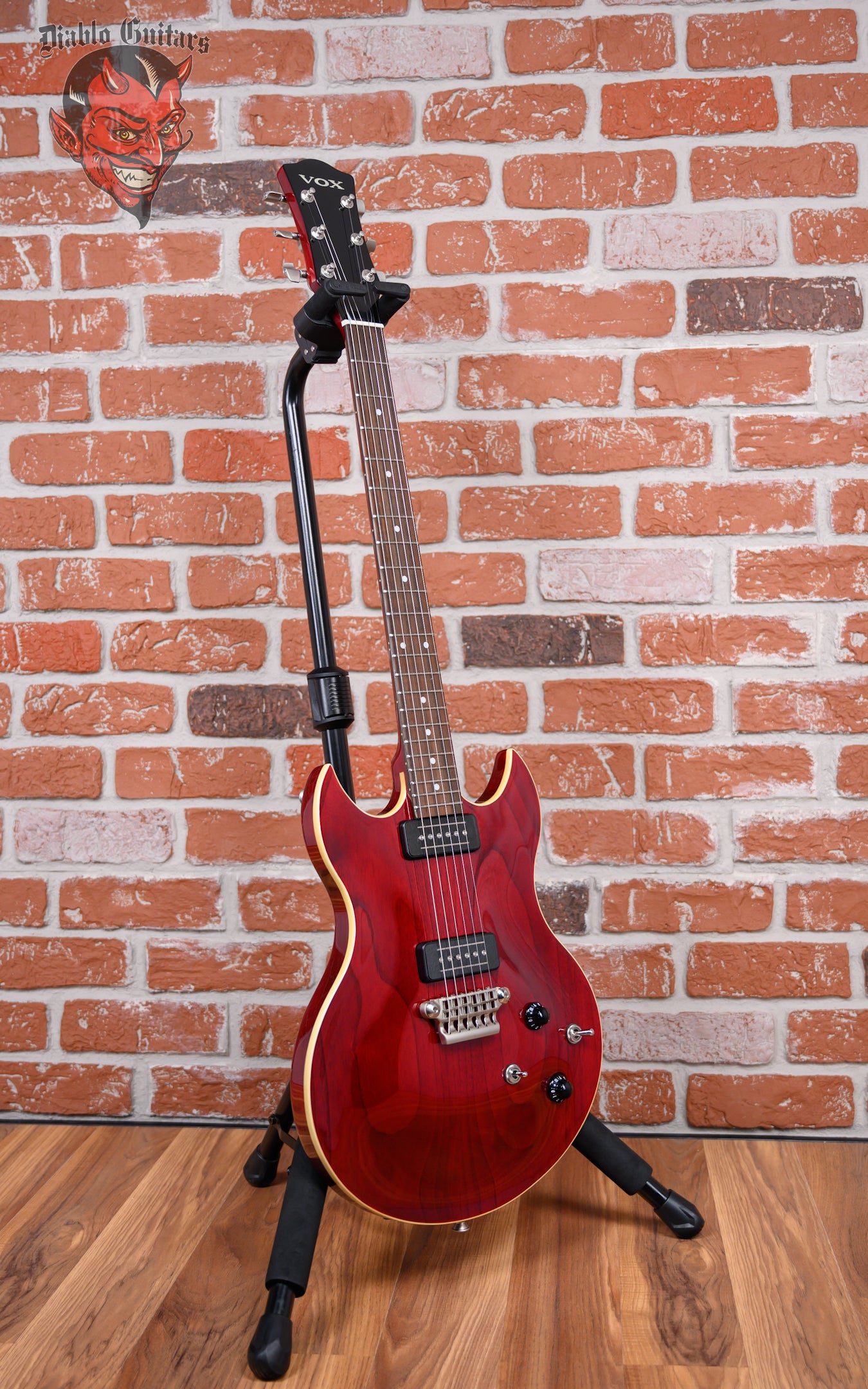 Vox SDC-33 in Transparent Red finish made in 2010 with Original Gigbag. This guitar features a solid ash body with a bound ash top, neck and rosewood fingerboard. Equipped with a pair of Vox coAxe humbuckers in the neck and bridge position. Controlled by 1 volume, 1 tone pot, a 3-Way toggle selector switch with 2-Way toggle coil tap switch. The 25 1/8" scale length neck has acrylic dot inlays and pearloid side markers with 22 medium jumbo frets on a 300mm radius with a thin "C" profile. The hardware is comprised of satin chrome vox vox super smooth custom tuners tuning machines with wave motif heads, a TUSQ nut, a vox the maxconnect™ bridge , and black top hat knobs.