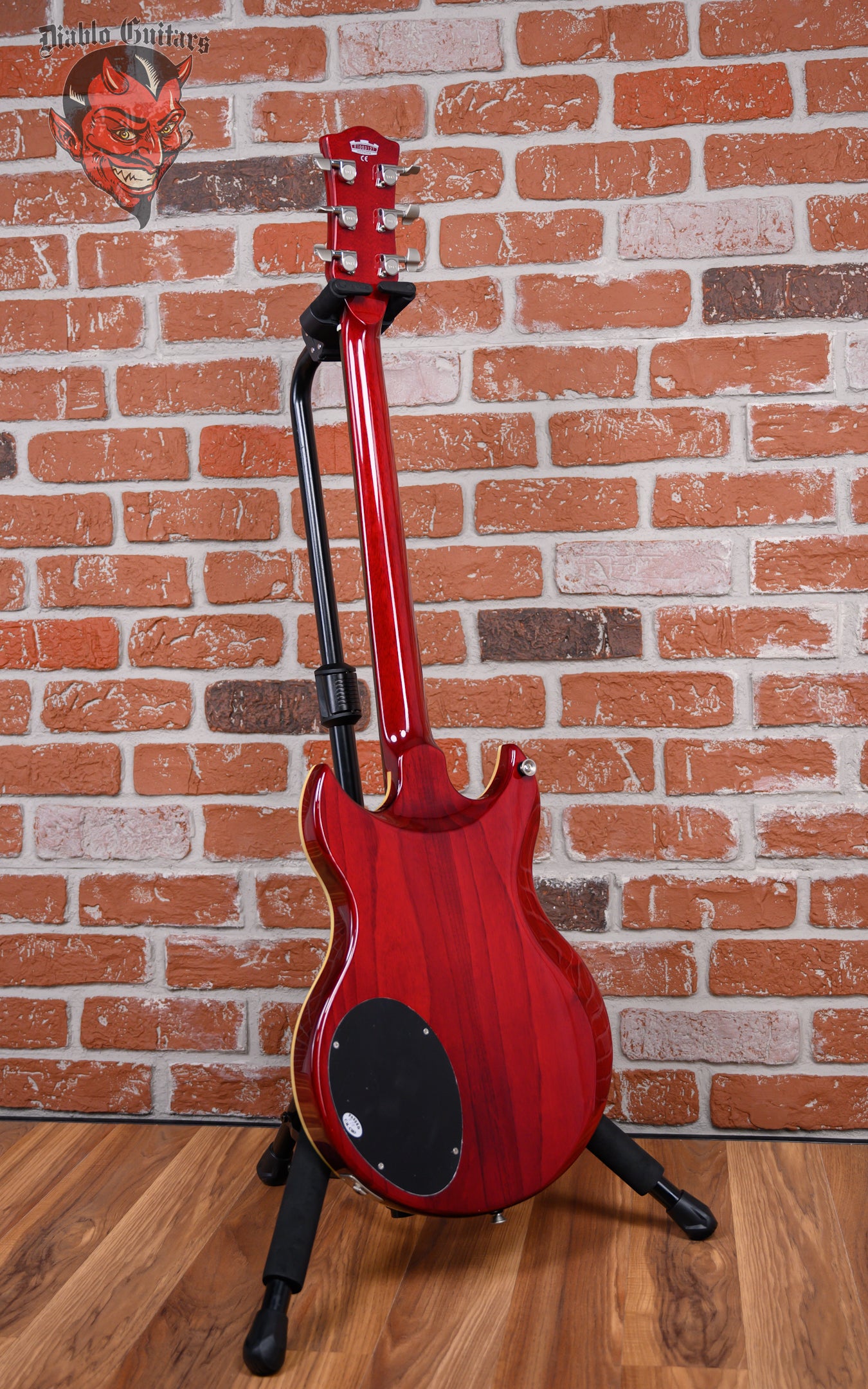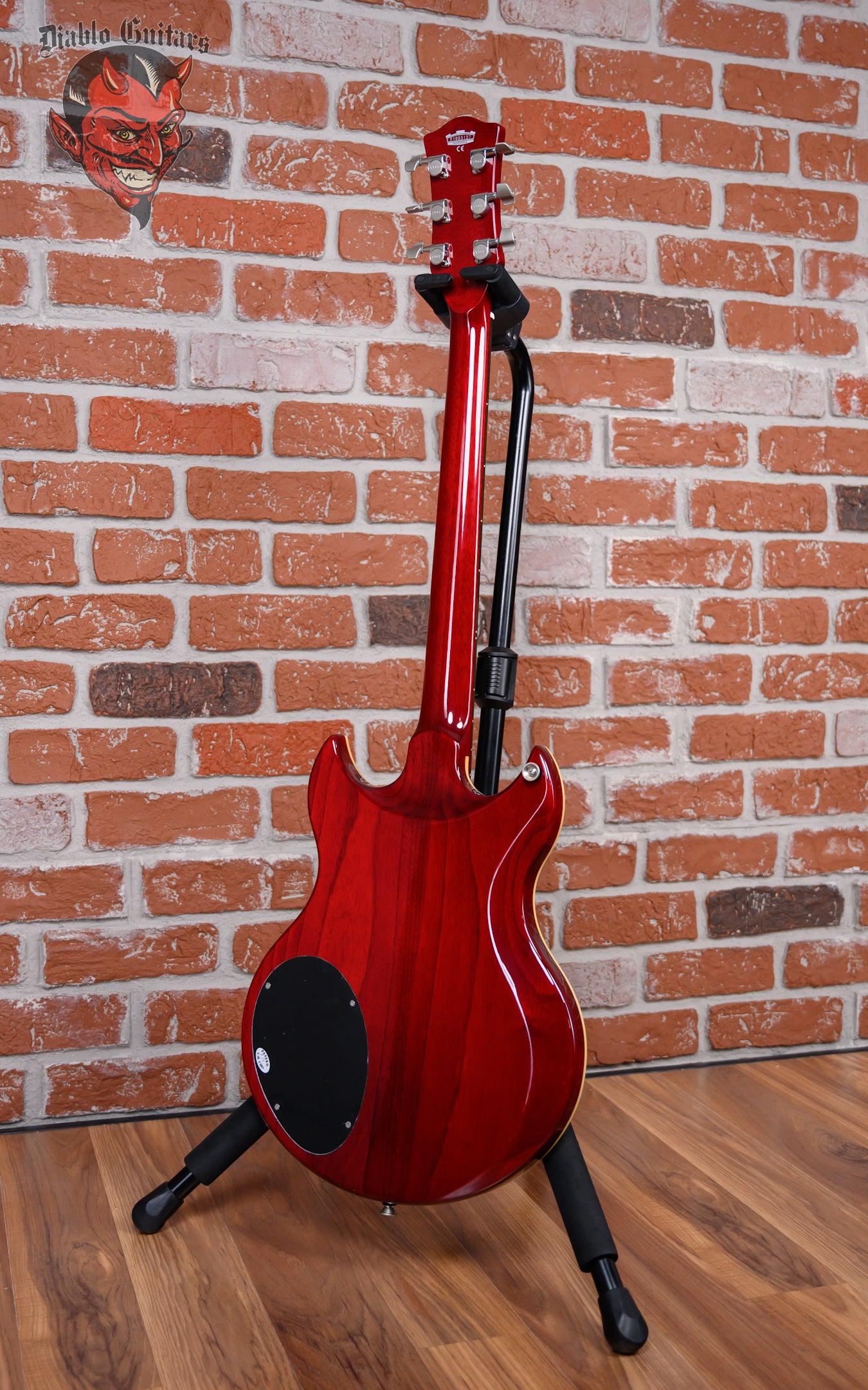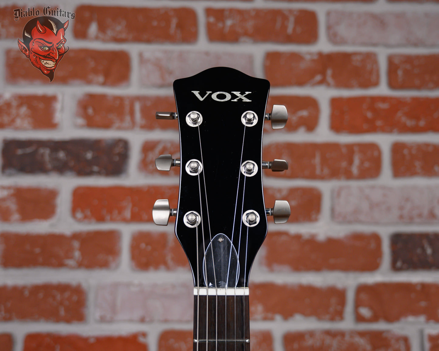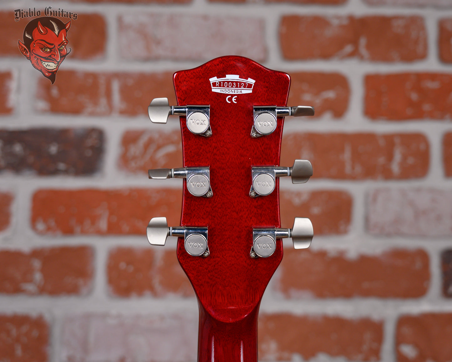 Vox SDC-33 in Transparent Red finish made in 2010 with Original Gigbag. This guitar features a solid ash body with a bound ash top, neck and rosewood fingerboard. Equipped with a pair of Vox coAxe humbuckers in the neck and bridge position. Controlled by 1 volume, 1 tone pot, a 3-Way toggle selector switch with 2-Way toggle coil tap switch. The 25 1/8" scale length neck has acrylic dot inlays and pearloid side markers with 22 medium jumbo frets on a 300mm radius with a thin "C" profile. The hardware is comprised of satin chrome vox vox super smooth custom tuners tuning machines with wave motif heads, a TUSQ nut, a vox the maxconnect™ bridge , and black top hat knobs.