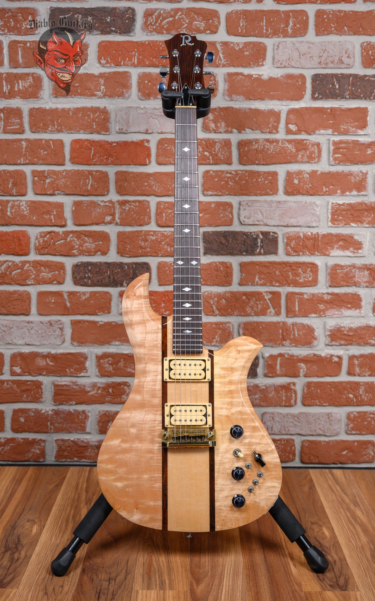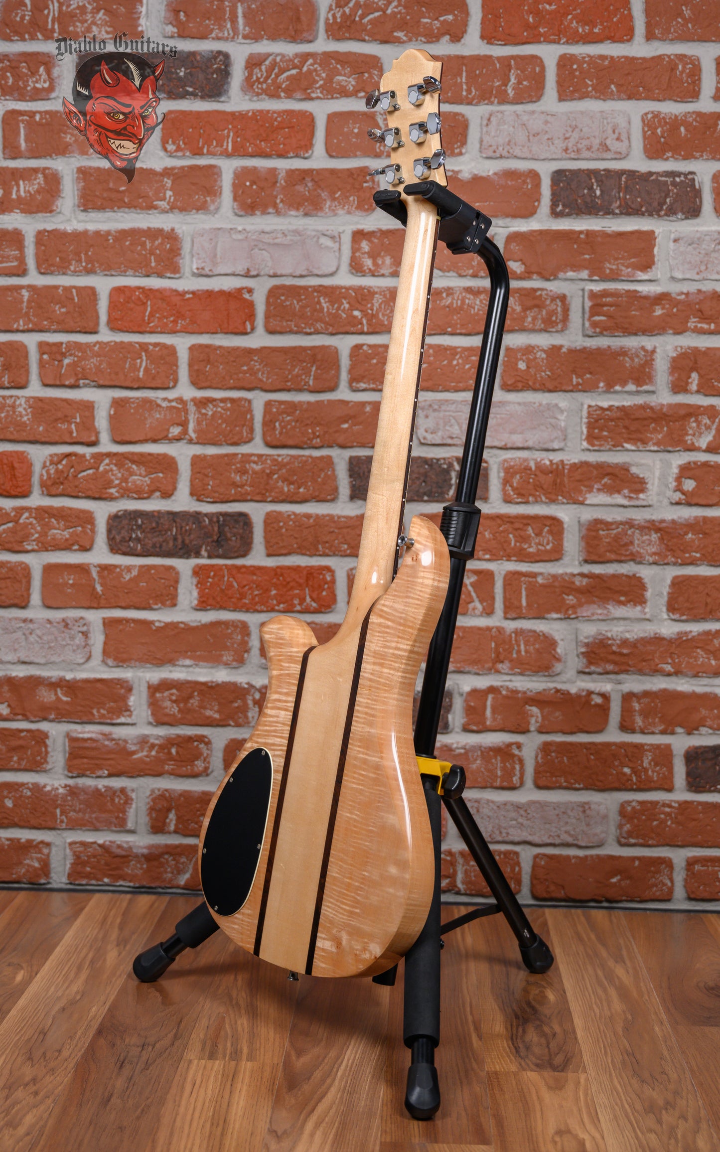 Vintage B.C. Rich Eagle Deluxe in Natural finish made in 1983 with hard shell case. This guitar features a solid figured maple body with walnut stringers, maple neck-thru and rosewood fingerboard with a rosewood overlay headstock. Equipped with a set of DiMarzio Super 2 humbuckers in the neck & bridge positions. Controlled by 1 volume, 1 tone, 1 gain boost, a 6-way rotary pot, a 3-Way toggle switch and 2-way mini toggles for boost, Varitone, phase and neck/bridge split. The 24 5/8" scale length neck has mother of pearl diamond inlays and white side markers with 24 jumbo frets on a 12" radius with a slim D profile. The hardware is comprised of chrome Schaller sealed die-cast tuning machines with cloche heads, a bone nut, a B.C. Rich Quadmatic bridge and black top hat knobs.