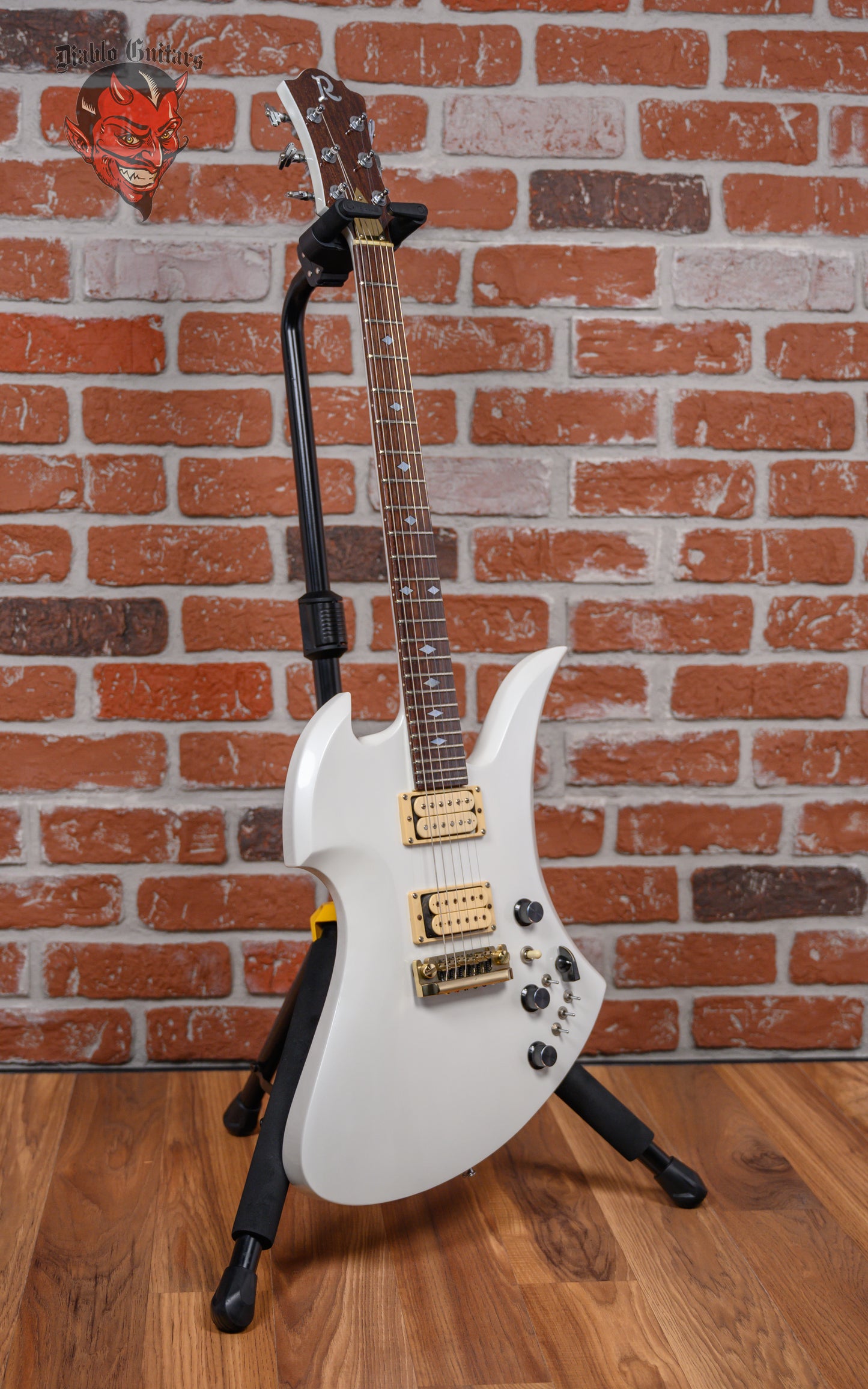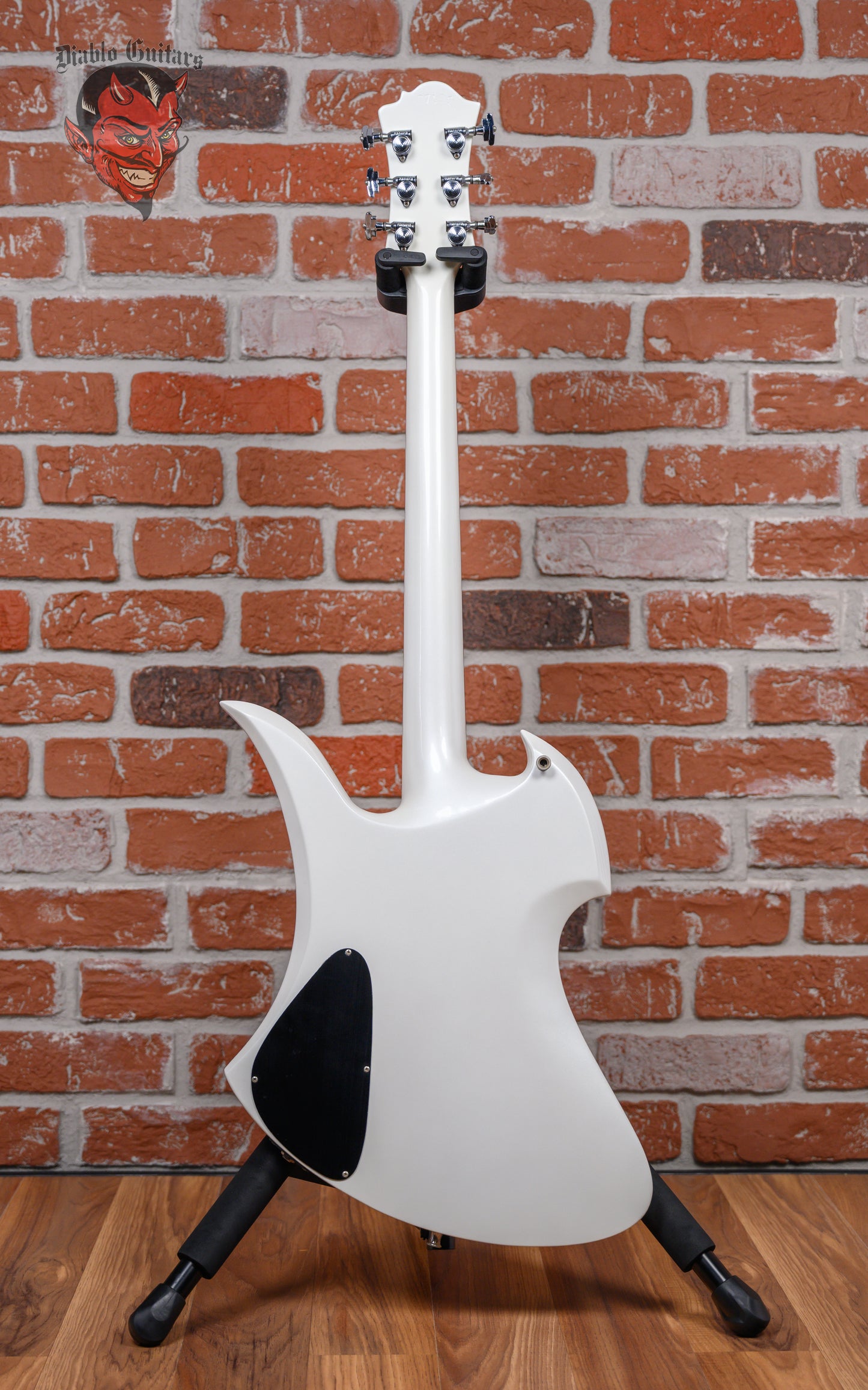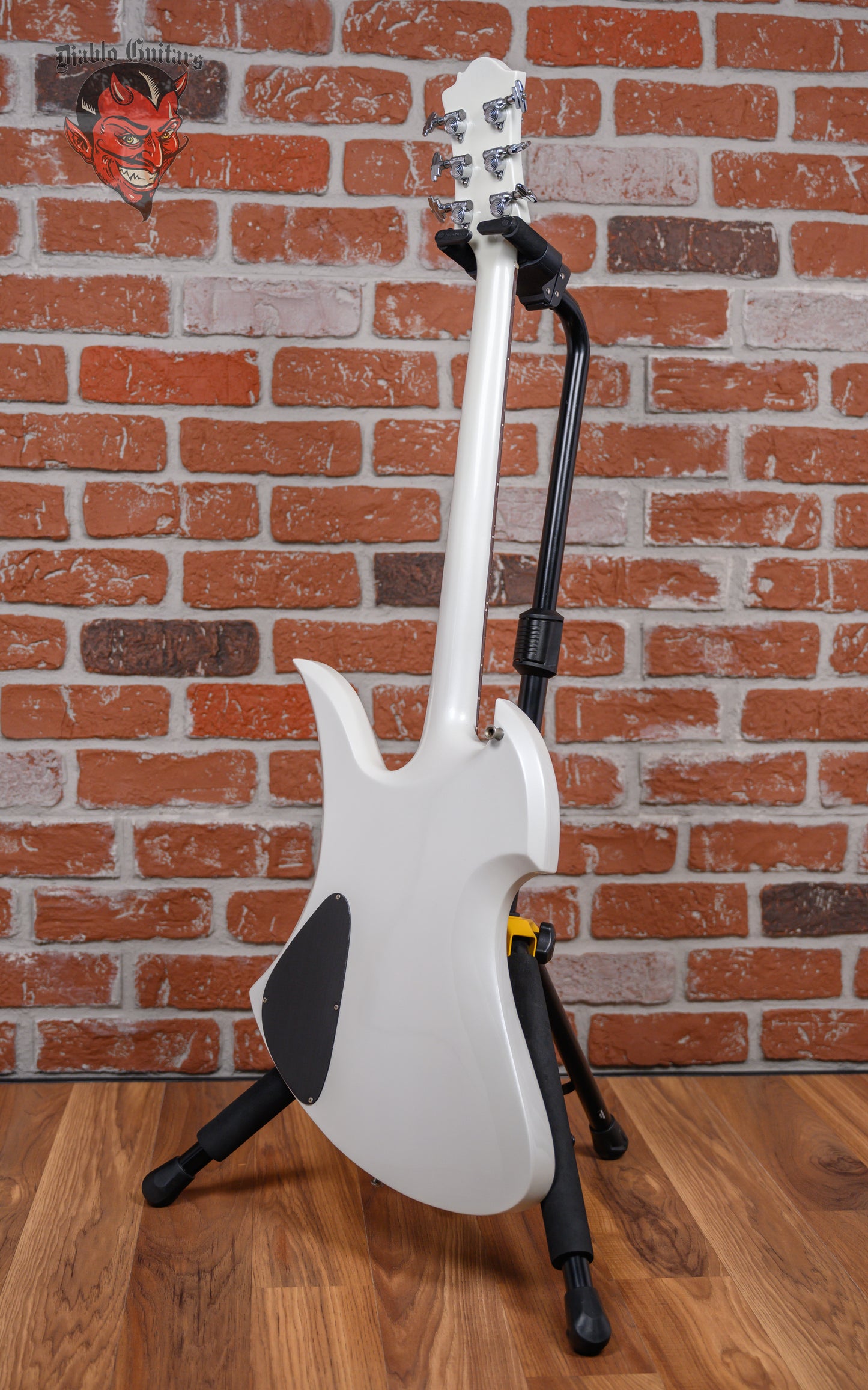 Vintage B.C. Rich Mockingbird Deluxe in Glitter Rock White finish made in 1984 with original hard shell case. This guitar features a solid mahogany body w/maple stringers, mahogany neck-thru and rosewood fingerboard with a rosewood overlay headstock. Equipped with a DiMarzio PAF Pro in the neck position and a DiMarzio Super 2 in the bridge position. Controlled by 1 master volume, 1 boost, 1 master tone pot, a 3-way toggle, a 6-way Varitone rotary dial with two coil tap 2-Way mini toggles and a phase 2-Way mini toggle. The 24 5/8" scale length neck has mother of pearl diamond inlays and white side markers with 24 jumbo frets on a 12" radius with a slim C profile. The hardware is comprised of chrome Grover Rotomatic tuning machines with imperial heads, a bone nut, a B.C. Rich Brass Quadmatic bridge and black aluminum top hat knobs.