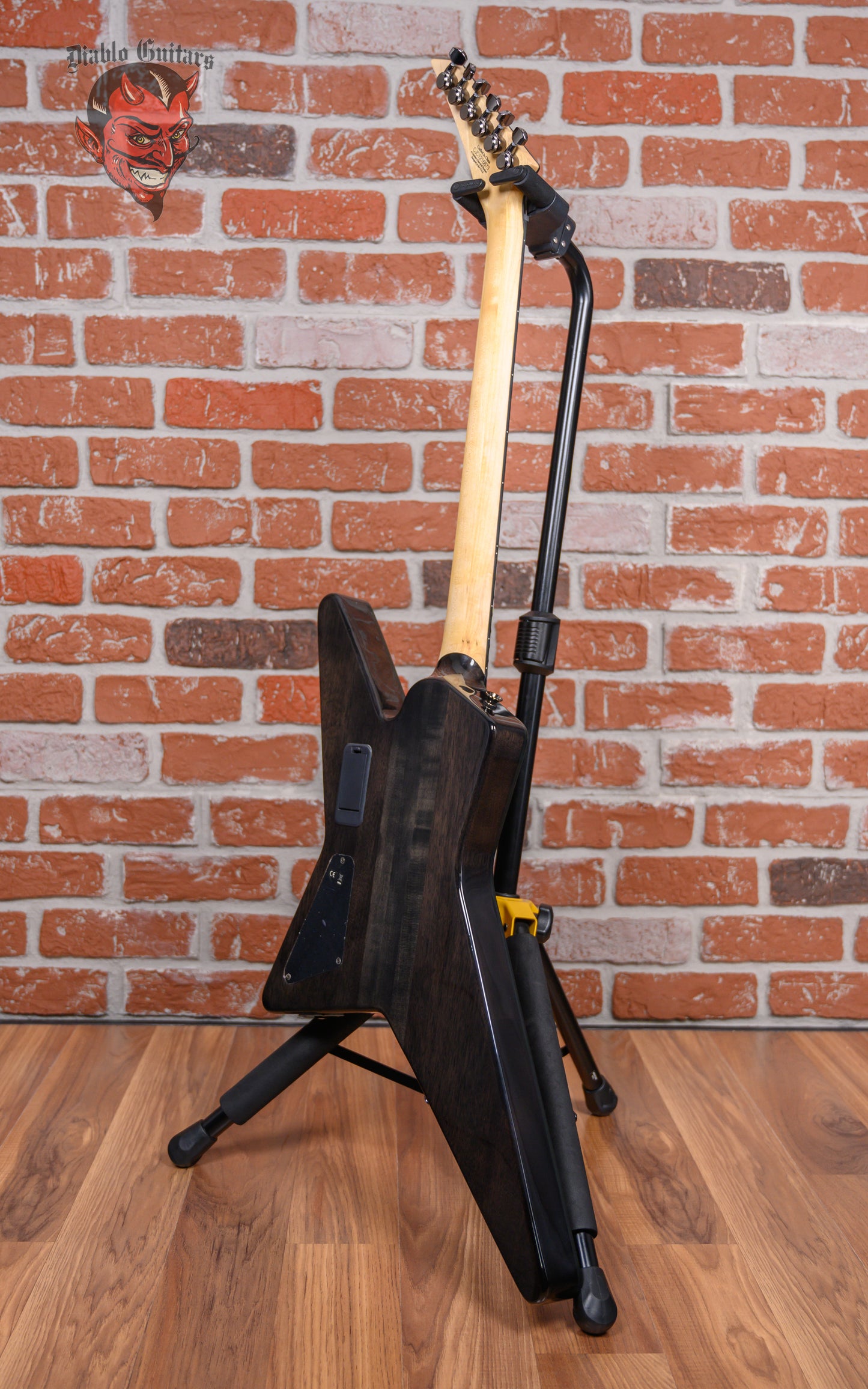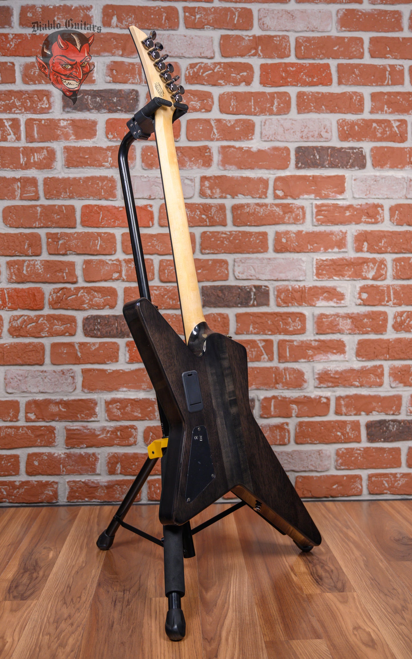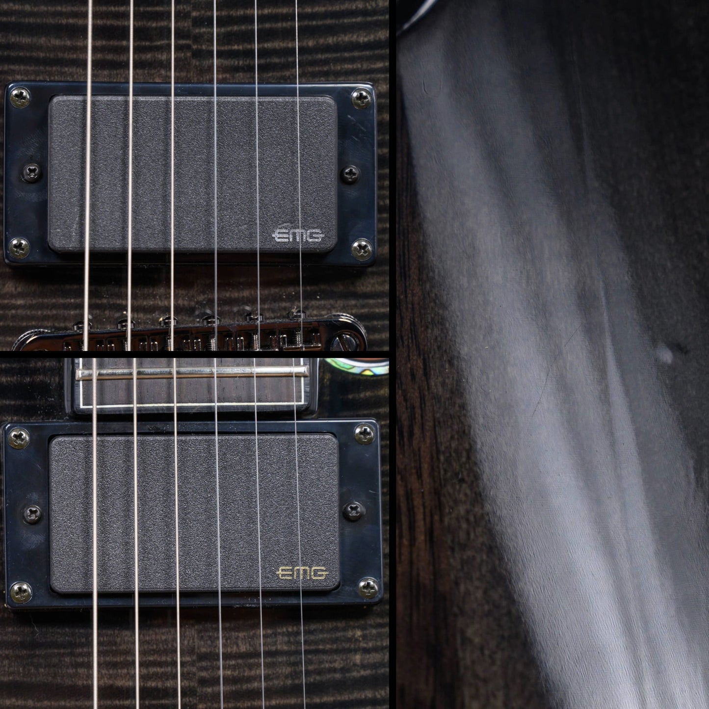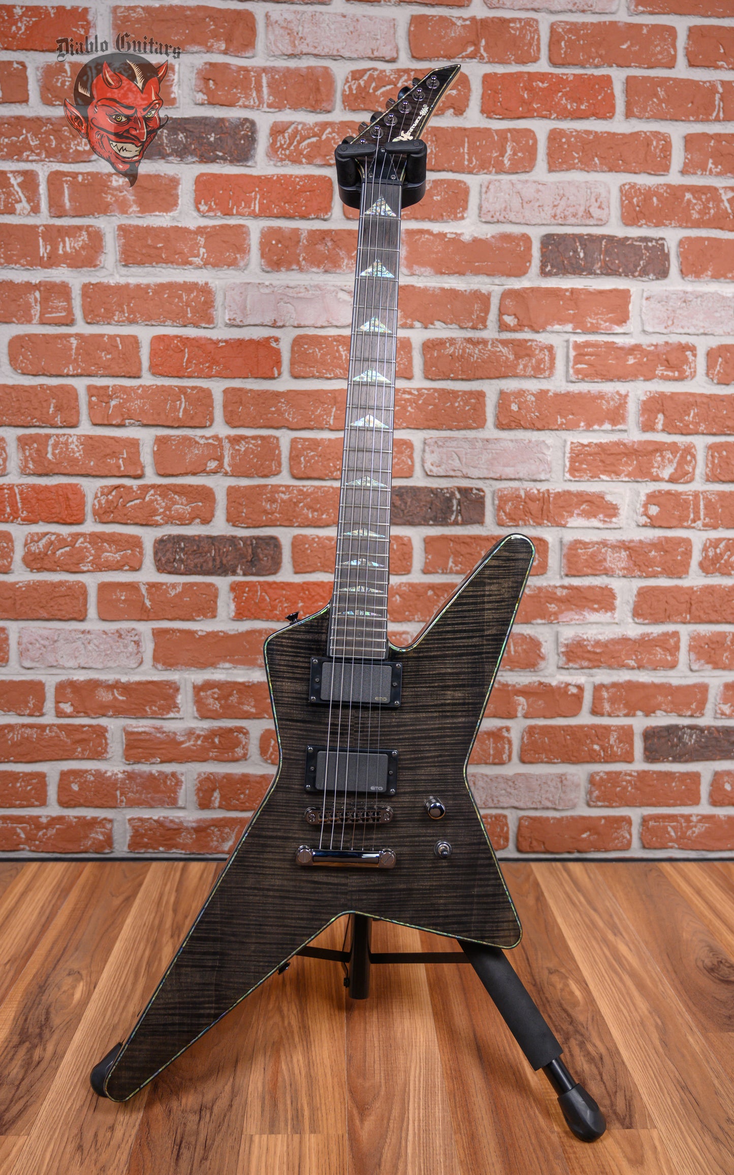 Charvel Desolation Star DST-1 ST in Transparent Black finish made in 2012 with Gigbag. This guitar features a solid mahogany body with a bound flamed maple top, 3-piece maple neck-thru and bound rosewood fingerboard with a bound/color matched headstock w/ flame maple overlay. Equipped with active EMG pickups; an 85 in the neck position and an 81 in the bridge position. Controlled by one master volume pot and a 3-Way toggle switch. The 25.5" scale length neck has abalone Shark Tooth inlays and white side markers with 24 jumbo frets on a compound 12"-16" radius with a speed profile. The hardware is comprised of black chrome Charvel locking tuning machines with cloche heads, a plastic nut, a Charvel Tune-o-Matic bridge w/ stop tail and black chrome knurled dome knobs.