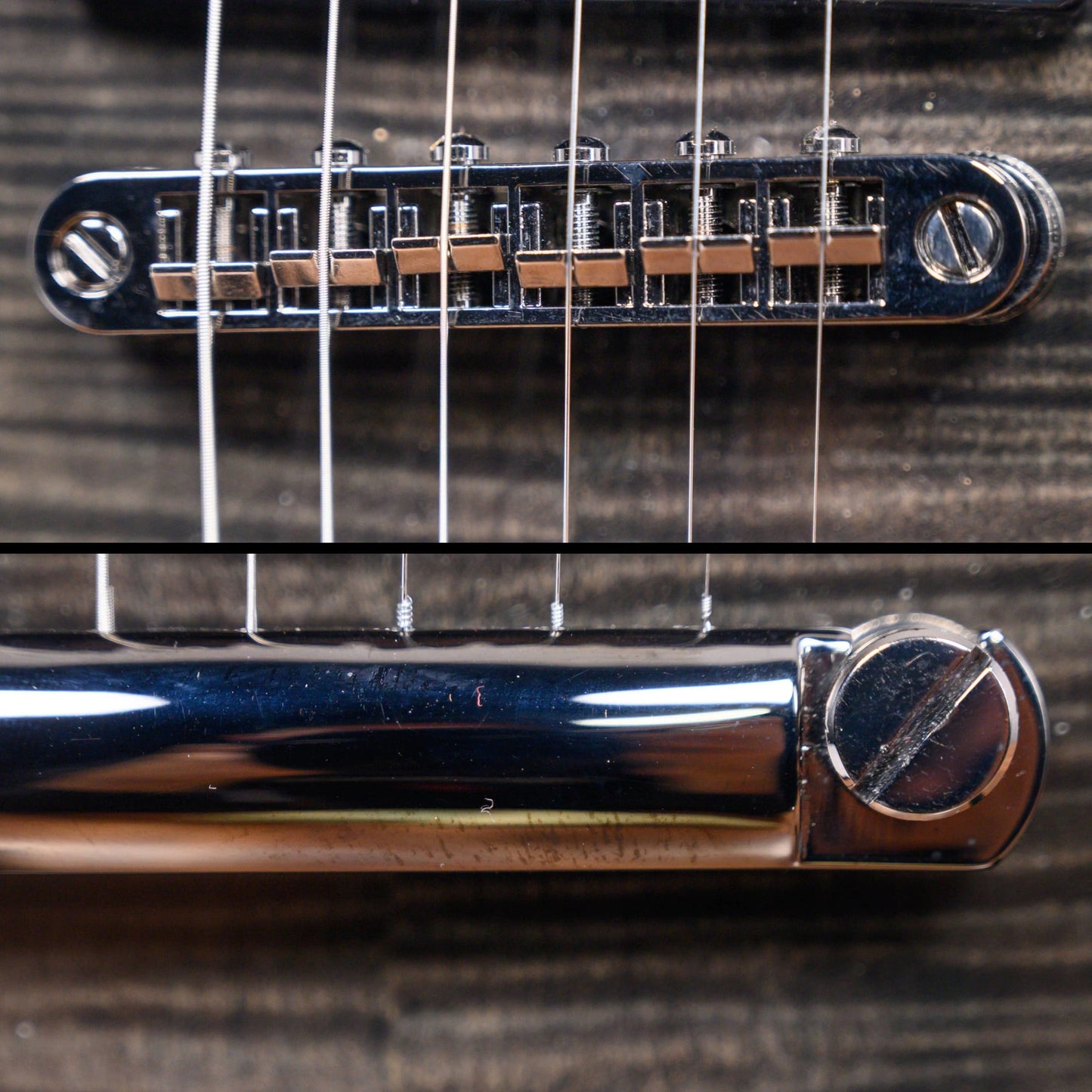 This guitar is in overall excellent condition. There is a small ding on the tip of the headstock. There are some small finish delamination spots at the neck joint. Part of the back of the neck is lightly discolored. The back has a few small blemishes. There is some playing wear on the pickups and bridge. (See pics)