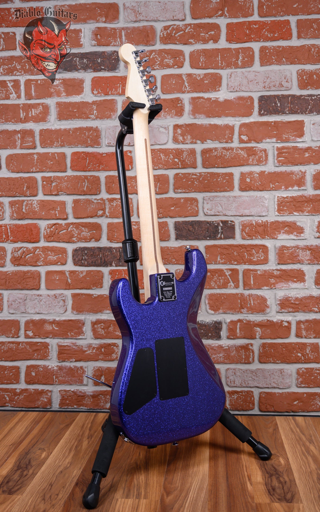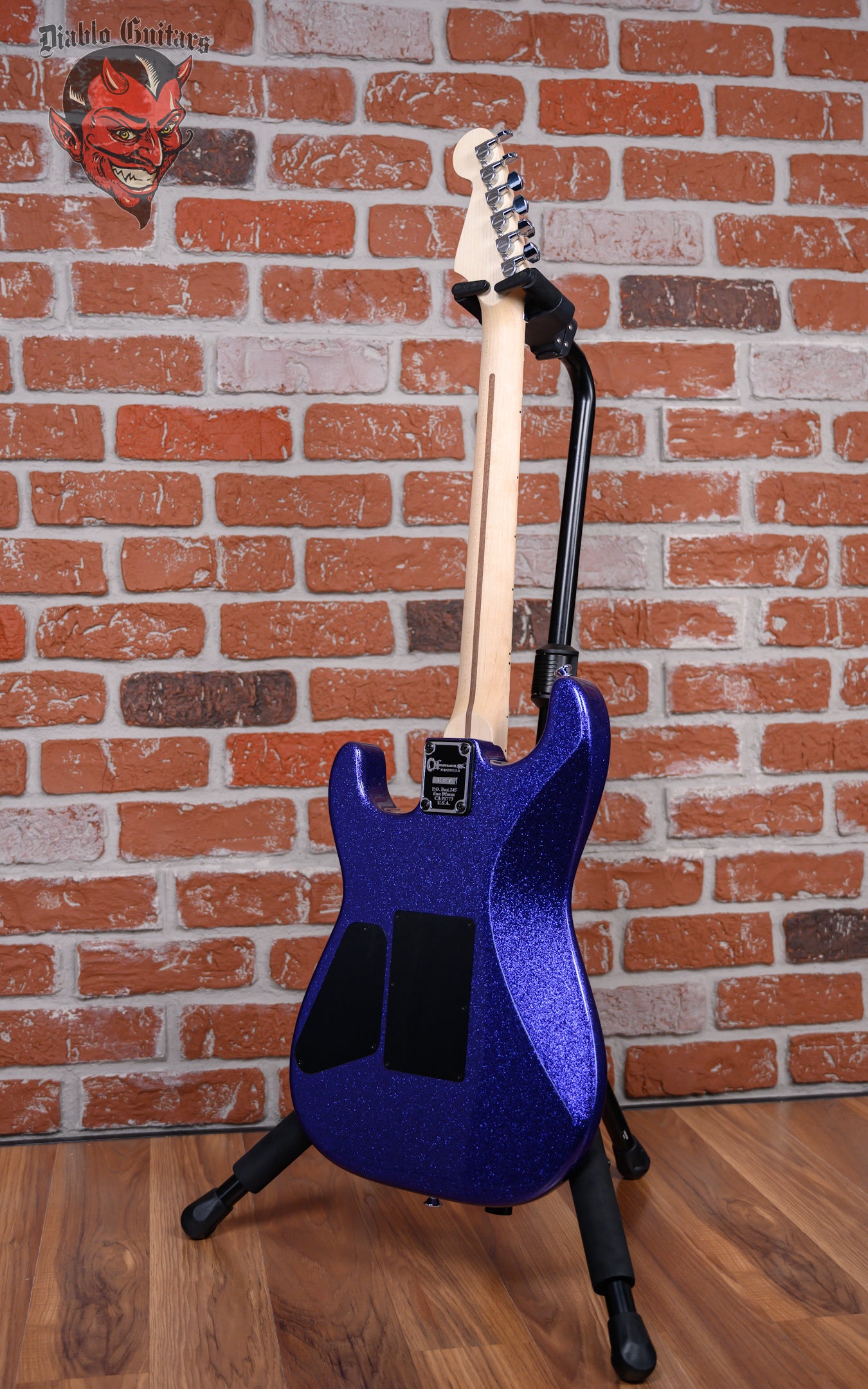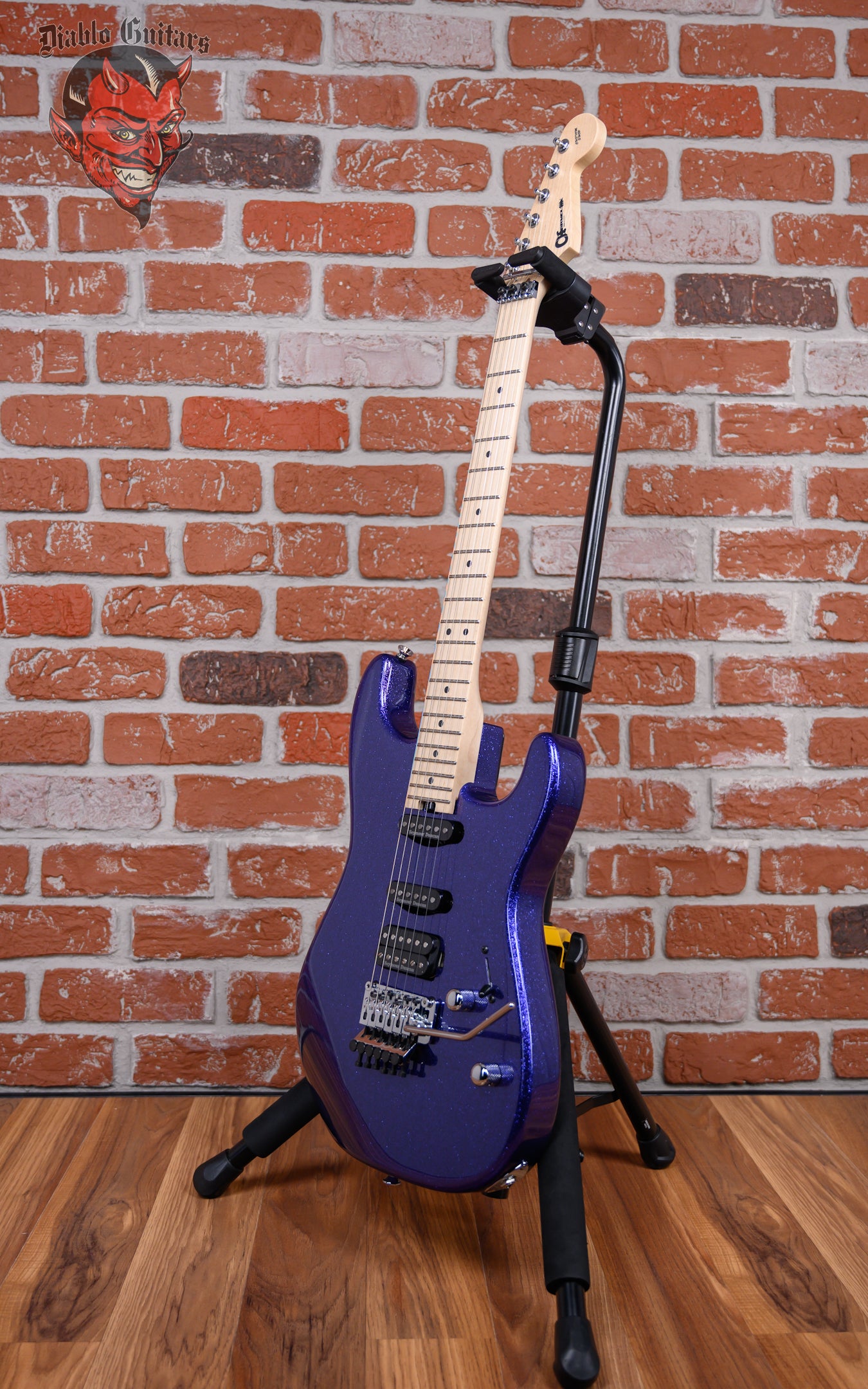 New Charvel USA Custom Shop San Dimas HSS in Purple Sparkle finish made in 2024 with Original Hard Shell Case. This guitar features a solid alder body, quartersawn maple neck and maple fingerboard with a licensed Fender headstock. Equipped with a pair of Seymour Duncan classic stacks in the neck /middle position and a Seymour Duncan JB in the bridge position. Controlled by 1 volume, 1 tone pot and a 5-Way blade switch. The 25.5" scale length neck has black dot inlays and black side markers with 22 jumbo stainless steel frets on a compound 12"-16" radius with a speed profile. The hardware is comprised of chrome gotoh sealed Die-Cast tuning machines with cloche heads, a Floyd Rose locking nut, a surface mounted Floyd Rose original double locking tremolo bridge and chrome knurled dome knobs.