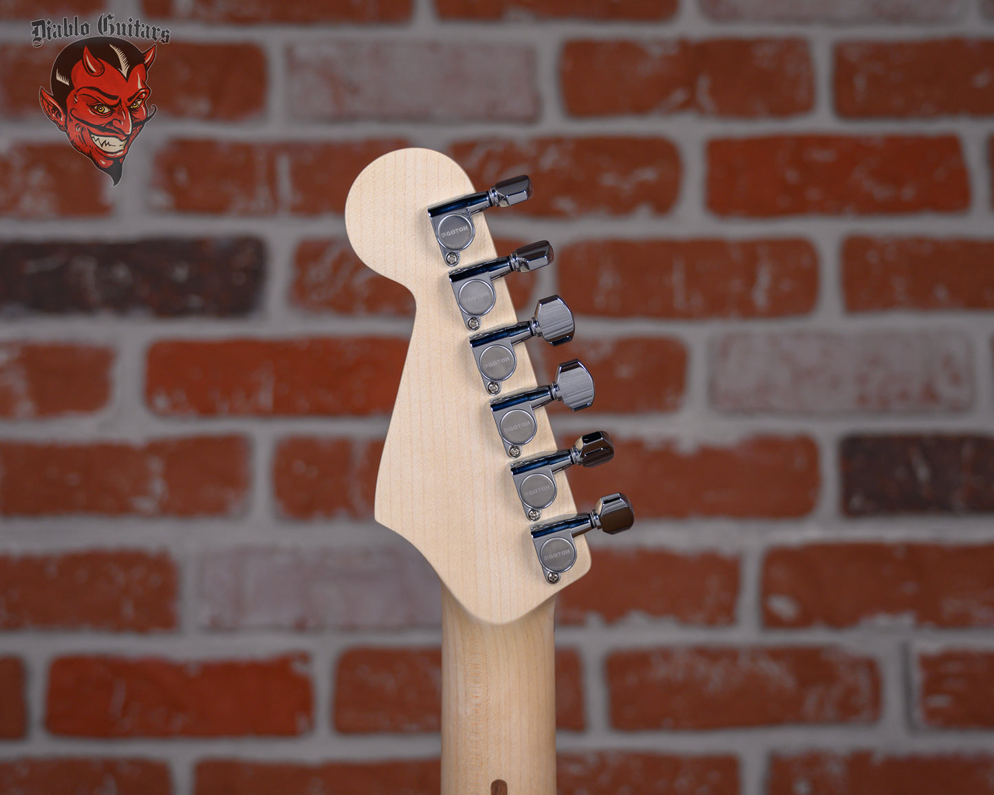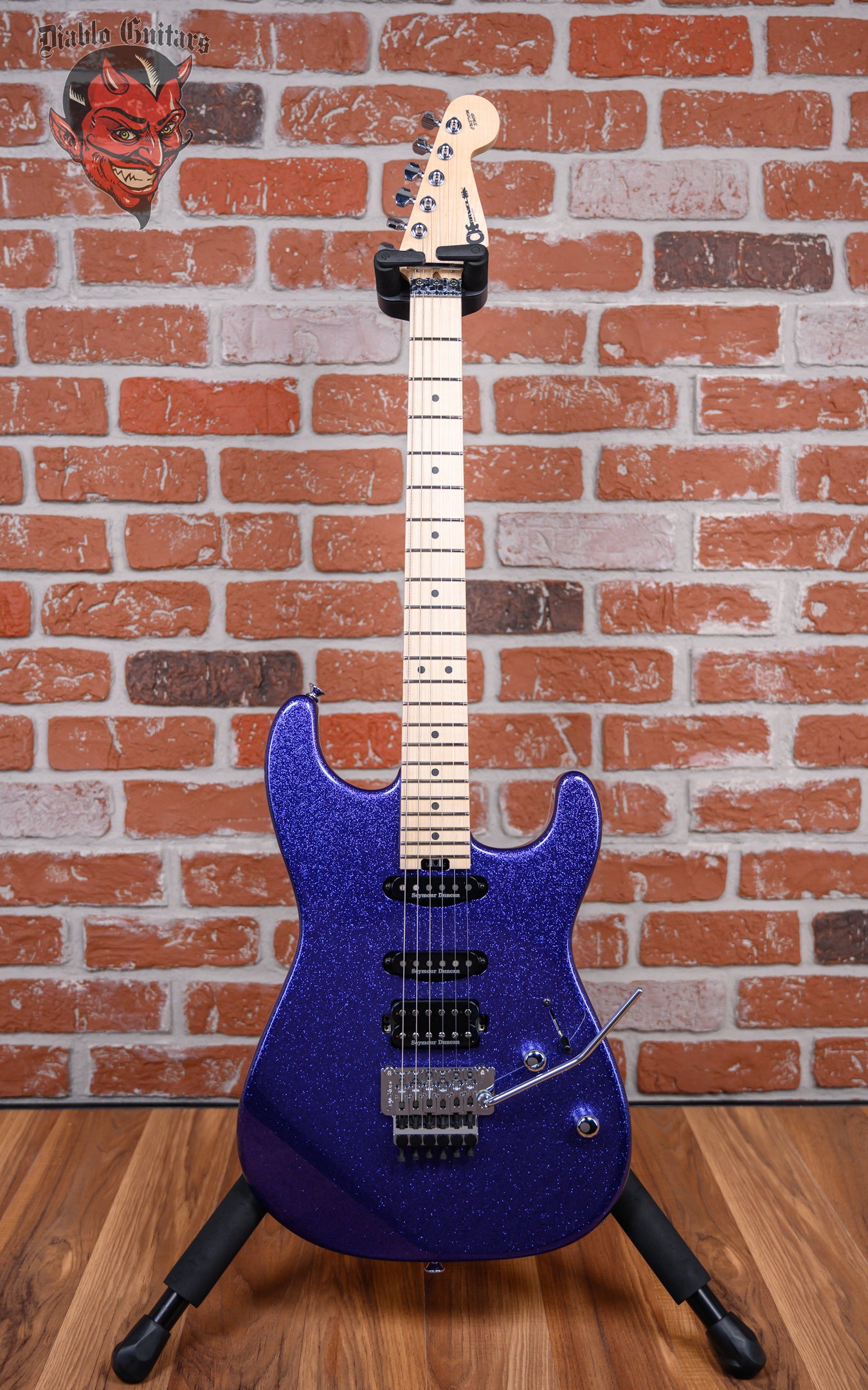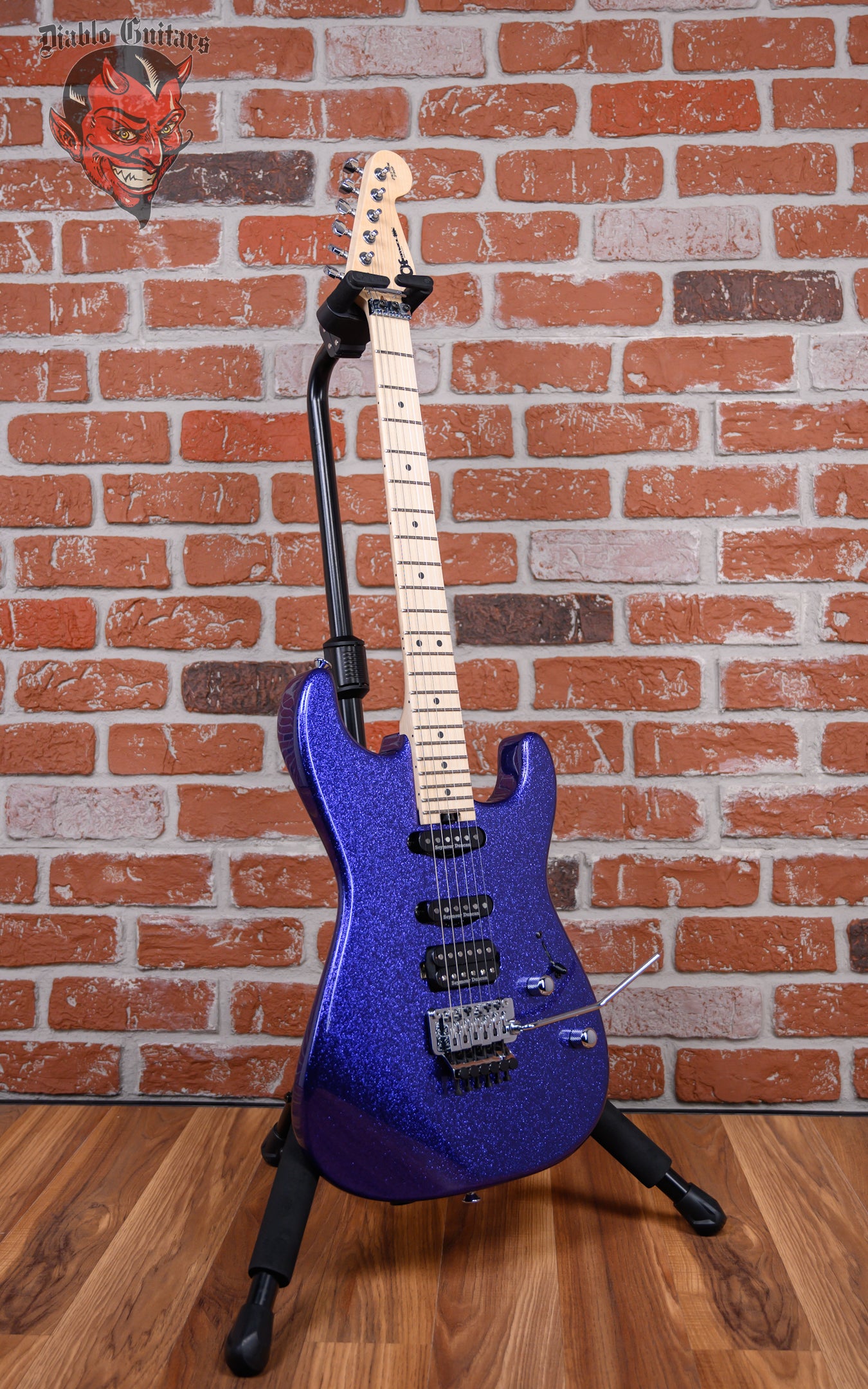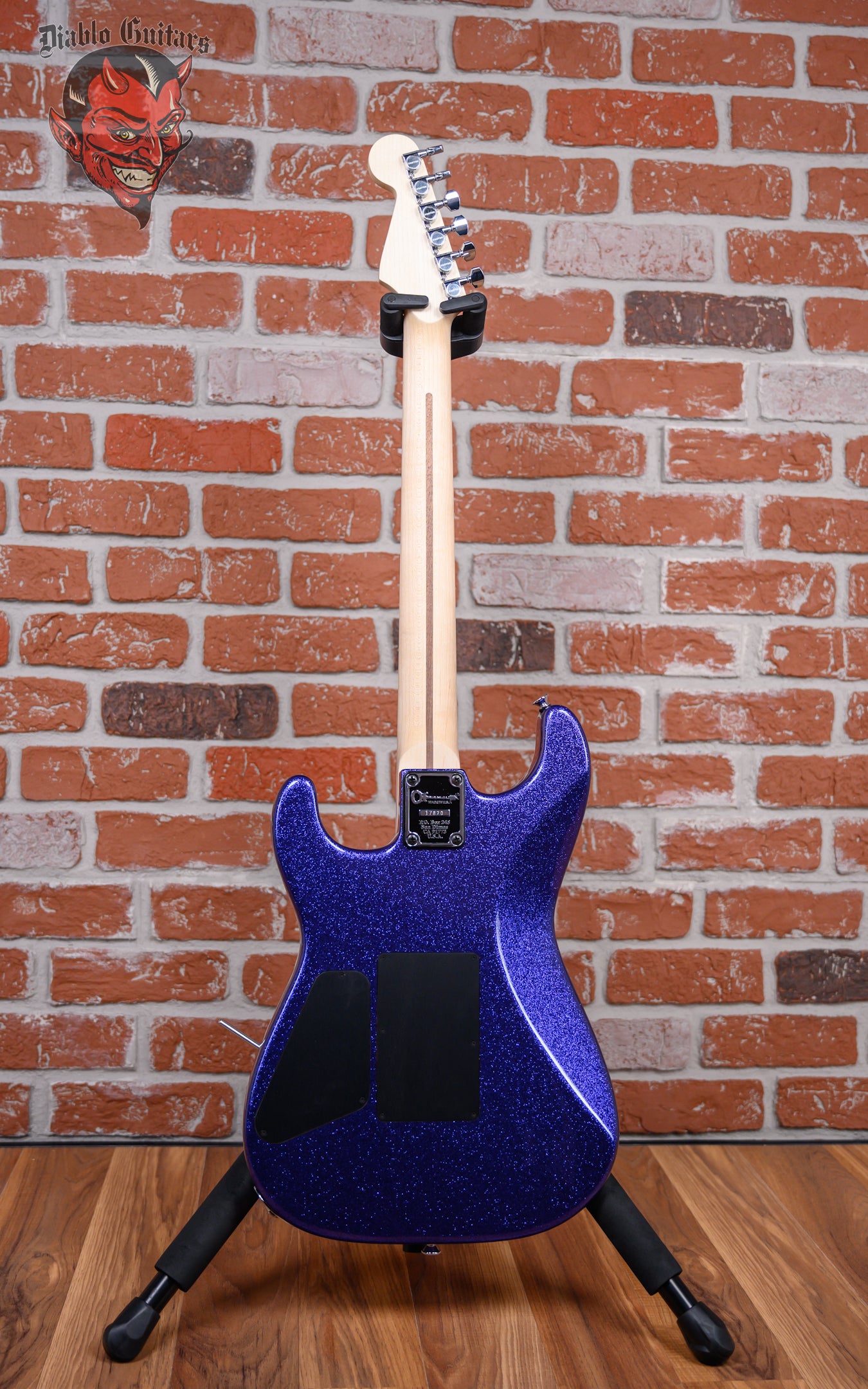 New Charvel USA Custom Shop San Dimas HSS in Purple Sparkle finish made in 2024 with Original Hard Shell Case. This guitar features a solid alder body, quartersawn maple neck and maple fingerboard with a licensed Fender headstock. Equipped with a pair of Seymour Duncan classic stacks in the neck /middle position and a Seymour Duncan JB in the bridge position. Controlled by 1 volume, 1 tone pot and a 5-Way blade switch. The 25.5" scale length neck has black dot inlays and black side markers with 22 jumbo stainless steel frets on a compound 12"-16" radius with a speed profile. The hardware is comprised of chrome gotoh sealed Die-Cast tuning machines with cloche heads, a Floyd Rose locking nut, a surface mounted Floyd Rose original double locking tremolo bridge and chrome knurled dome knobs.