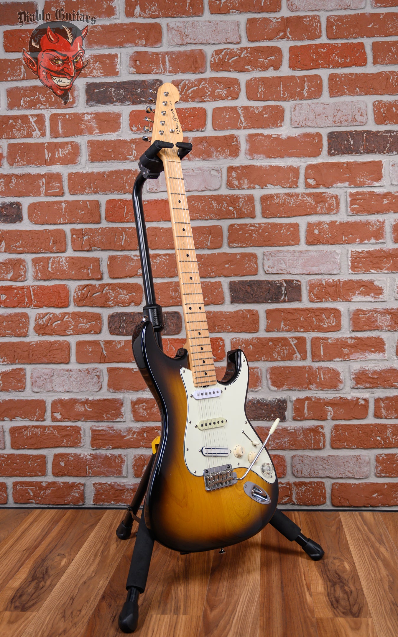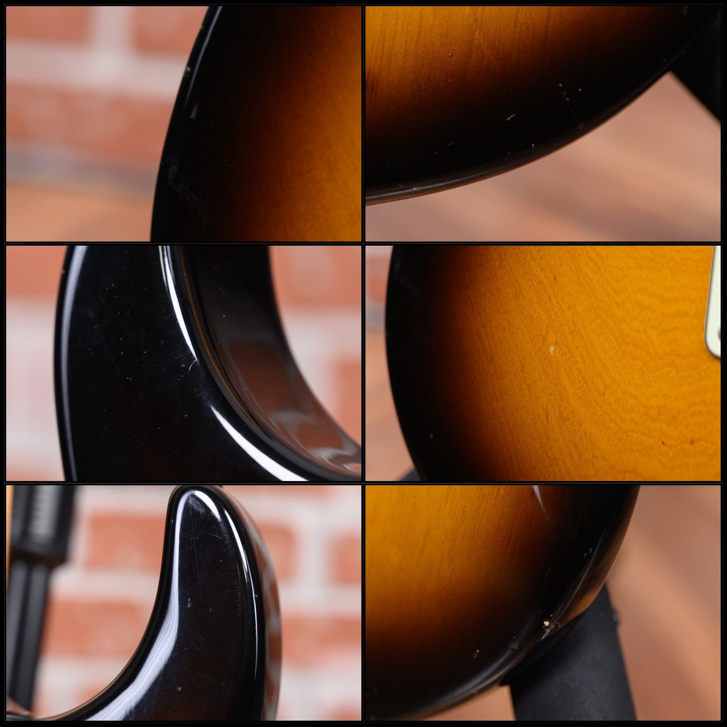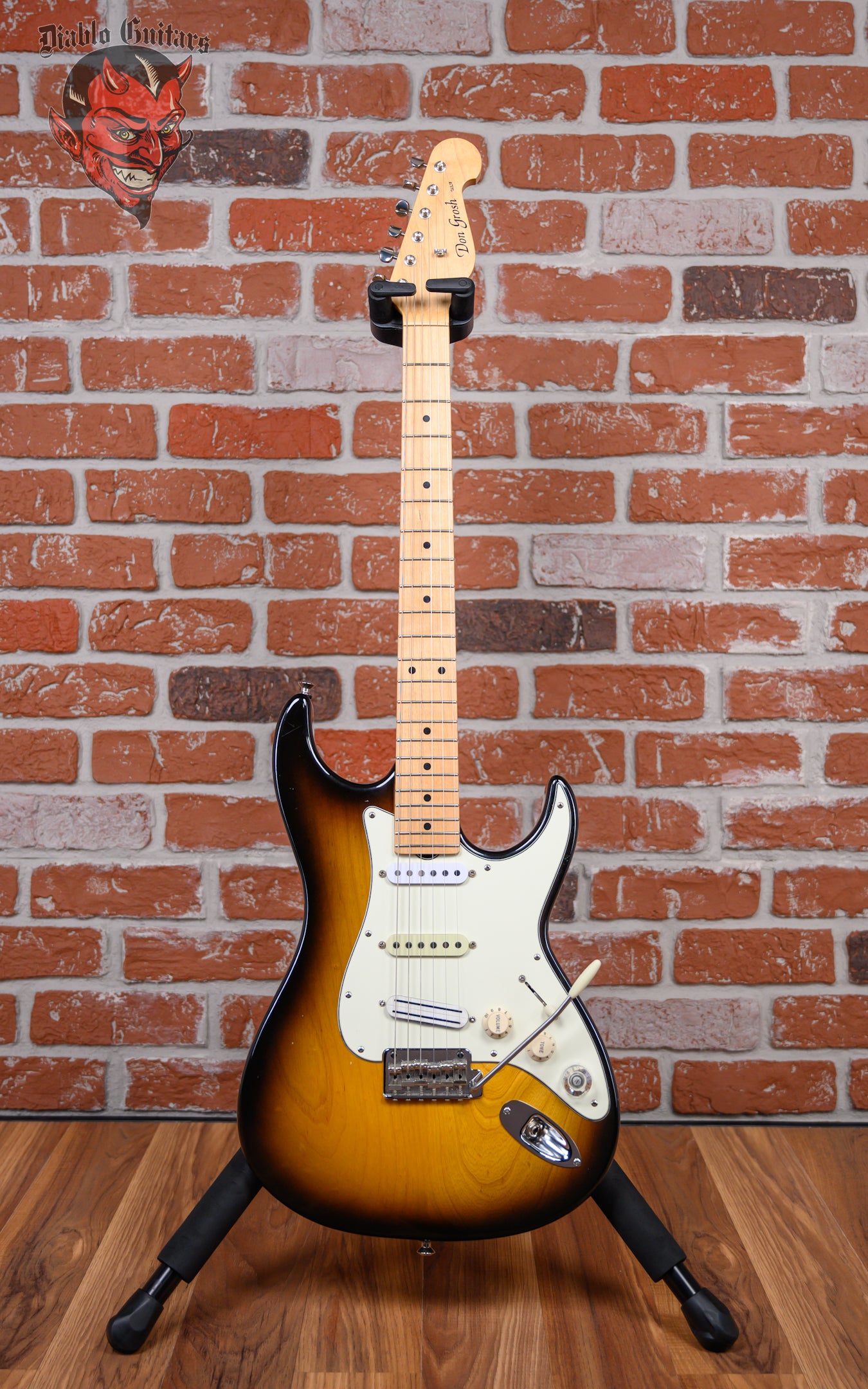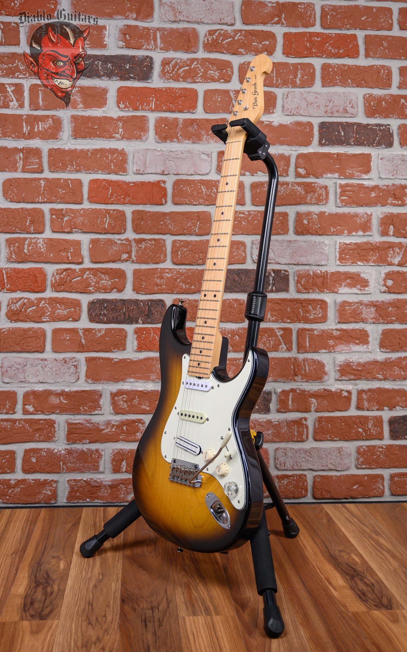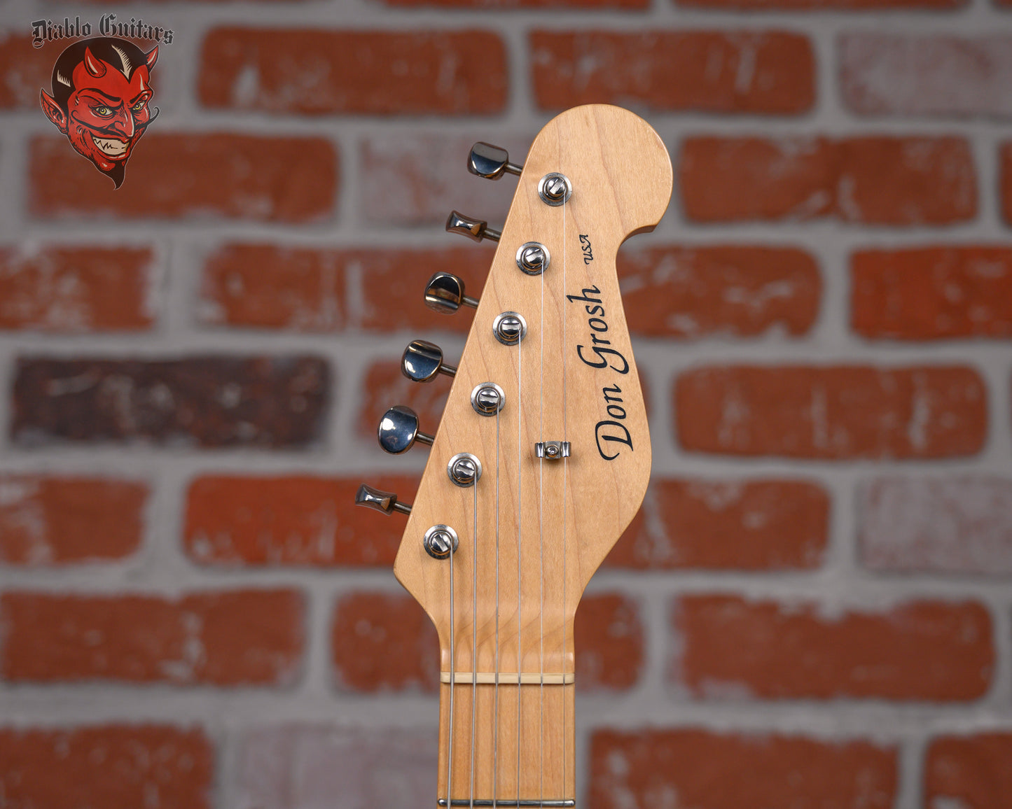 Don Grosh Custom Guitars Retro Classic S in 2-Color Sunburst finish made in 2001 with Polyfoam Case. This guitar features a solid ash body, maple neck and maple fingerboard. Equipped with a PRS PTP1107 silver sky single coil in the neck position, a Seymour Duncan vintage staggered strat in the middle position, and a dimarzio air norton S in the bridge position. Controlled by 1 volume, 2 tone pots and a 5-Way blade switch with push/pull tone coil tap. The 25.5" scale length neck has black dot inlays and black side markers with 22 medium jumbo frets on a 10" radius with a medium round back "C" profile. The hardware is comprised of nickel gotoh vintage style locking tuning machines with oval heads, a synthetic bone nut, a Gotoh 1088 2-Point tremolo, bridge and white top hat / clear speed knobs with a 3 ply Aged white on black pickguard.