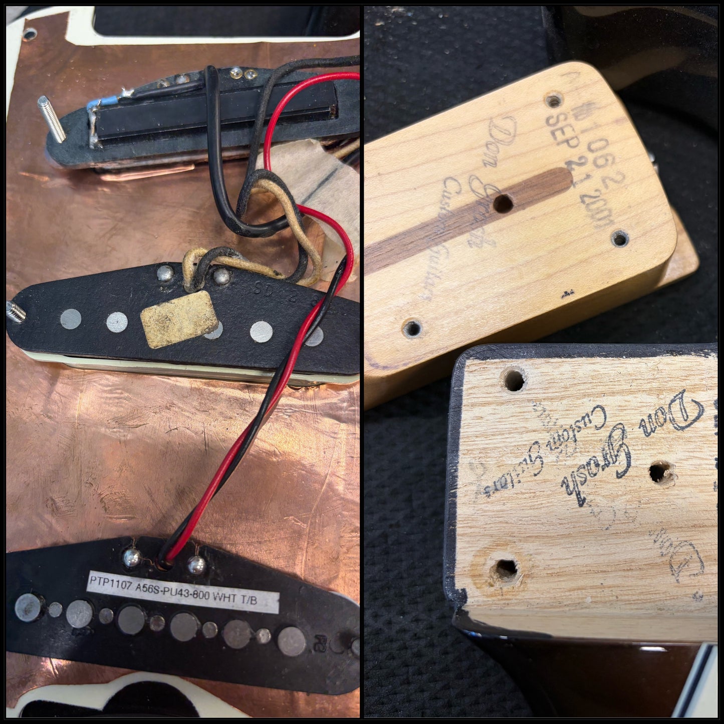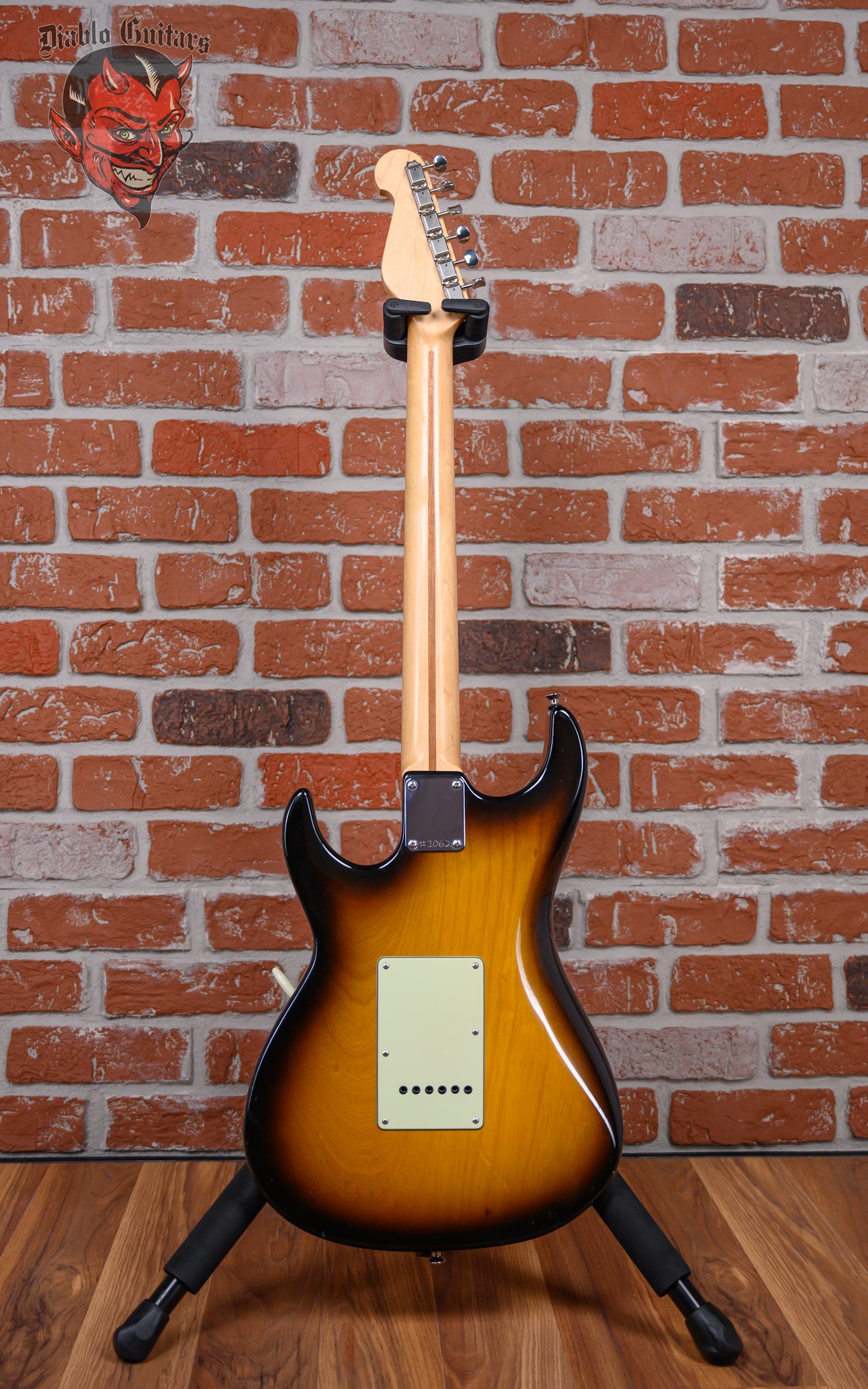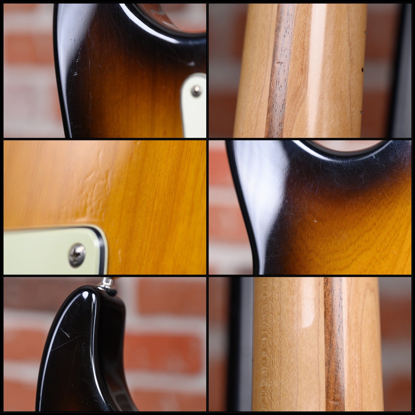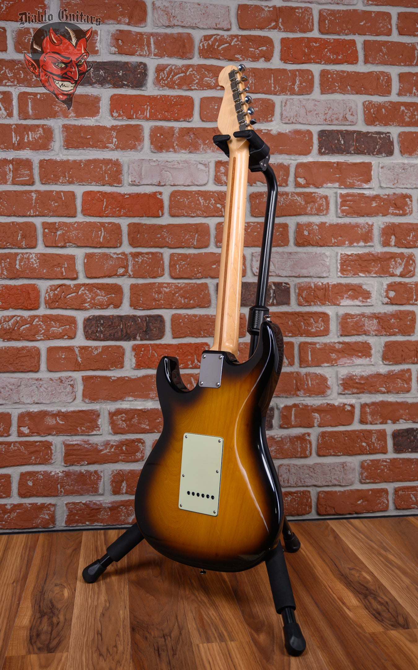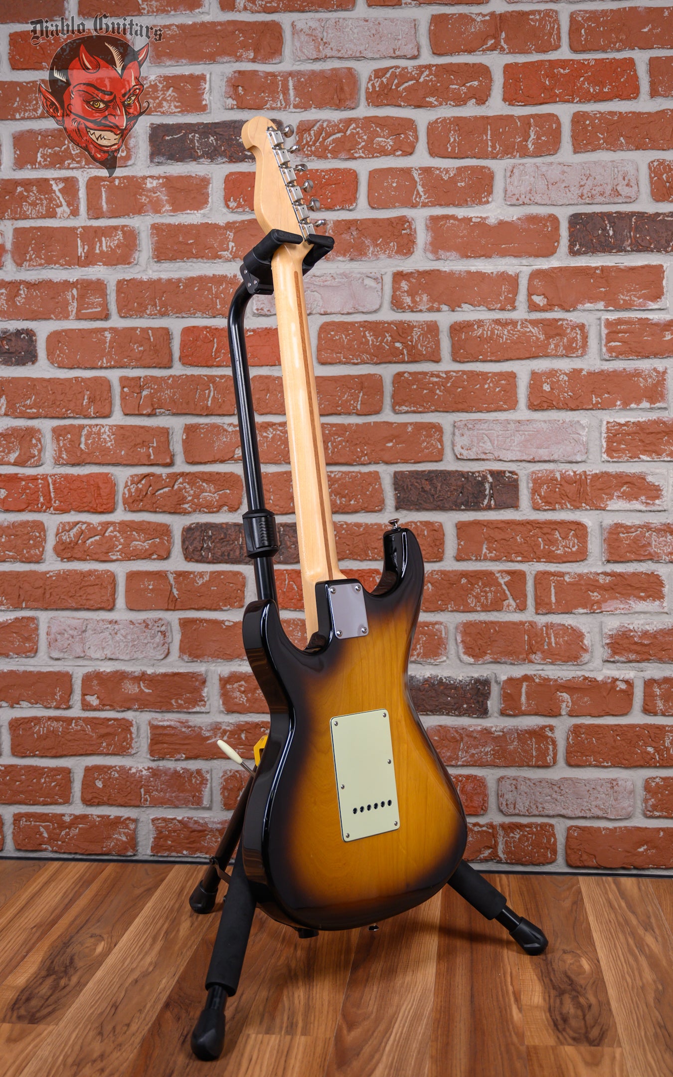 Don Grosh Custom Guitars Retro Classic S in 2-Color Sunburst finish made in 2001 with Polyfoam Case. This guitar features a solid ash body, maple neck and maple fingerboard. Equipped with a PRS PTP1107 silver sky single coil in the neck position, a Seymour Duncan vintage staggered strat in the middle position, and a dimarzio air norton S in the bridge position. Controlled by 1 volume, 2 tone pots and a 5-Way blade switch with push/pull tone coil tap. The 25.5" scale length neck has black dot inlays and black side markers with 22 medium jumbo frets on a 10" radius with a medium round back "C" profile. The hardware is comprised of nickel gotoh vintage style locking tuning machines with oval heads, a synthetic bone nut, a Gotoh 1088 2-Point tremolo, bridge and white top hat / clear speed knobs with a 3 ply Aged white on black pickguard.