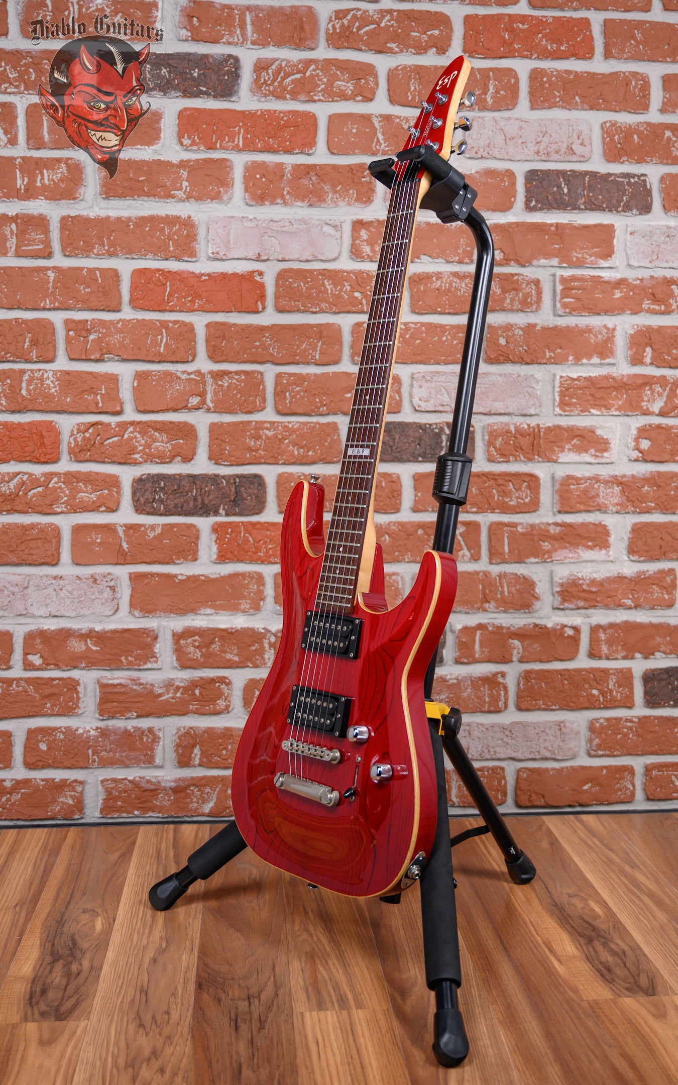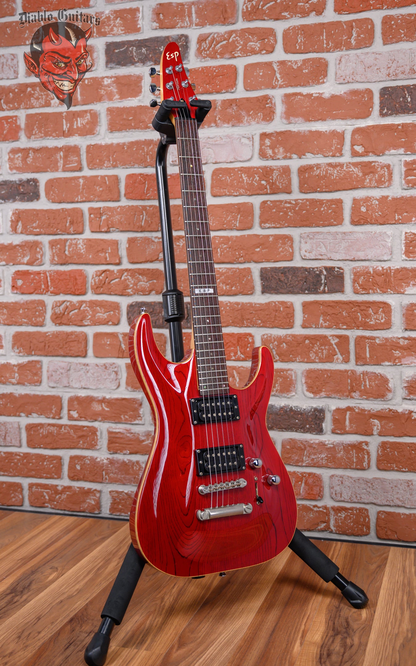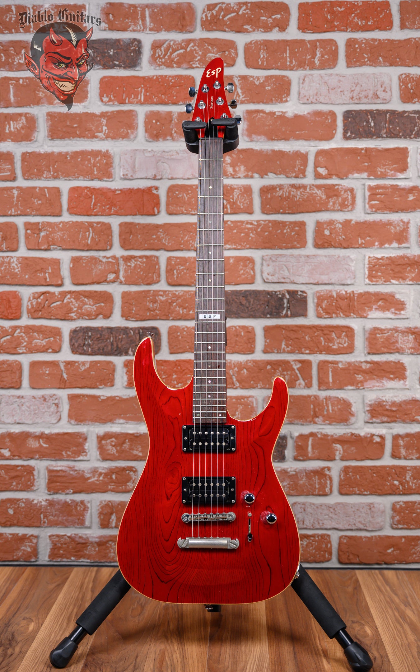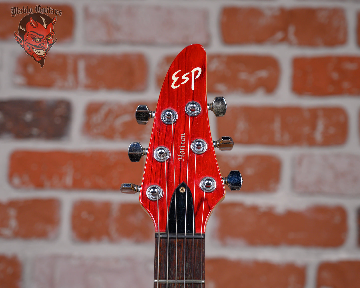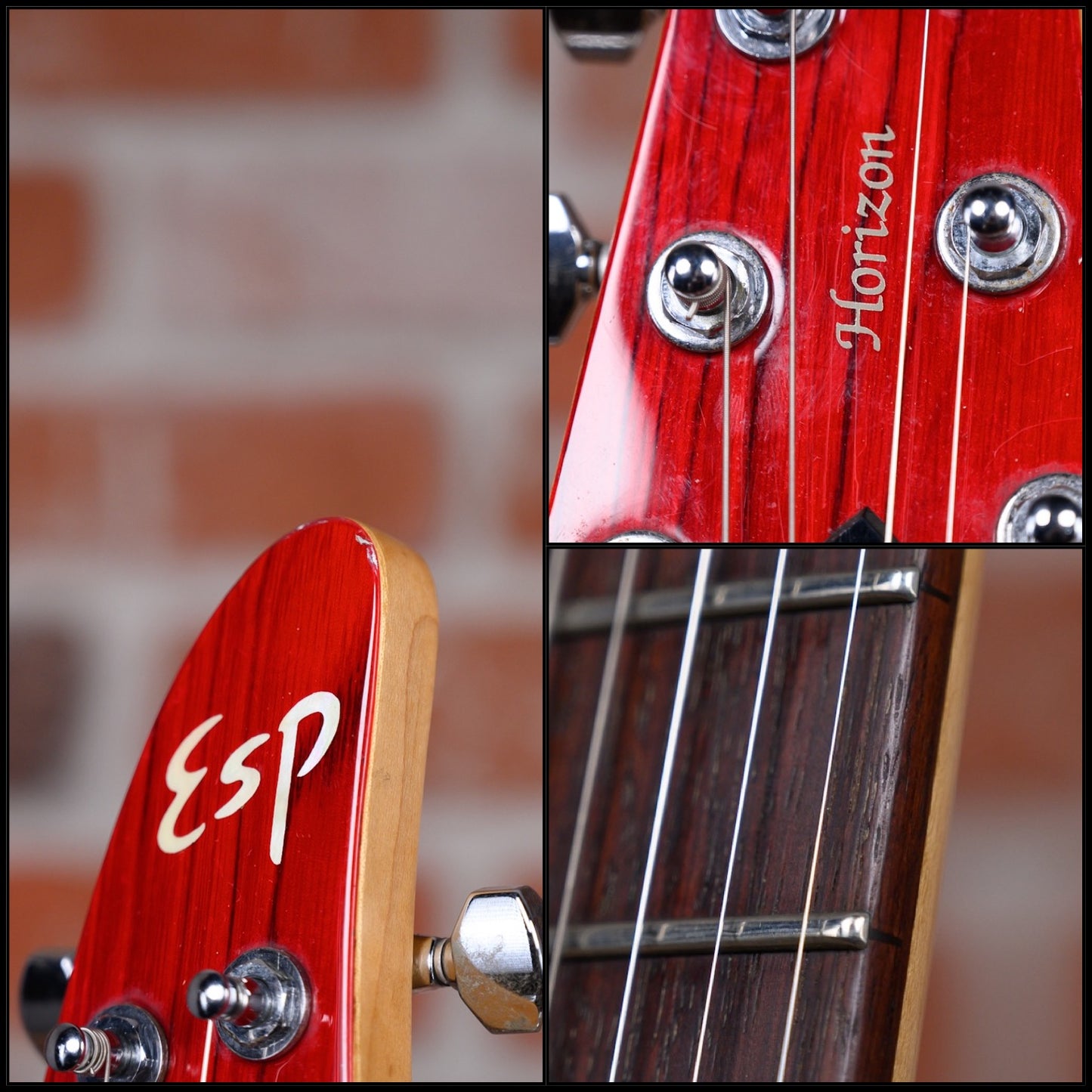 Vintage ESP Horizon in Transparent Red finish made in 1997 with Gator Hardshell Case. This guitar features a natural bound solid arch top ash body, maple neck and rosewood fingerboard with a color matched headstock. Equipped with a pair of ESP LH200 Humbuckers in the neck and bridge position. Controlled by 1 volume, 1 tone pot and a 5-Way blade with coil tapping. The 25.5" scale length neck has abalone dot inlays and white side markers with 24 extra jumbo frets on a 305mm radius with an extra thin U profile. The hardware is comprised of chrome Gotoh Sealed Die-Cast tuning machines with cloche heads, a graphite nut, a Gotoh ABR-1 Tune-o-matic bridge, and chrome knurled dome knobs.