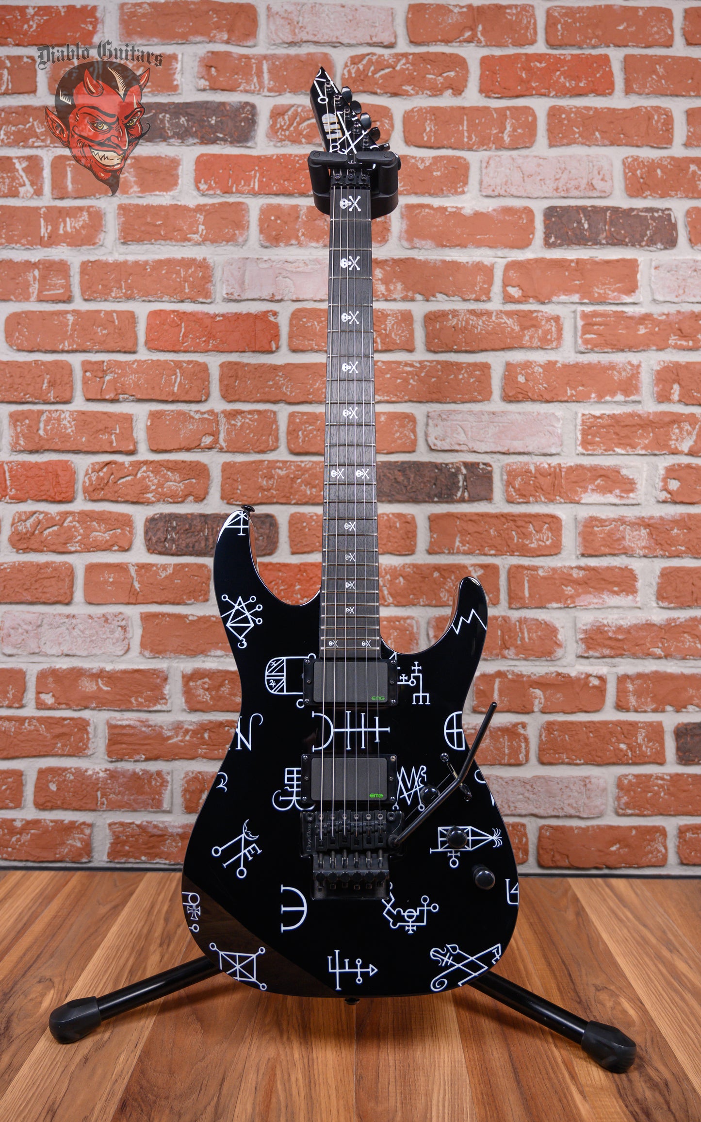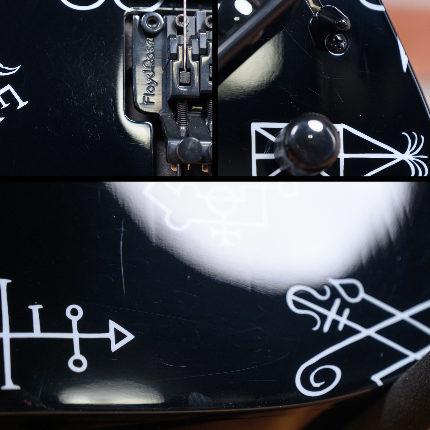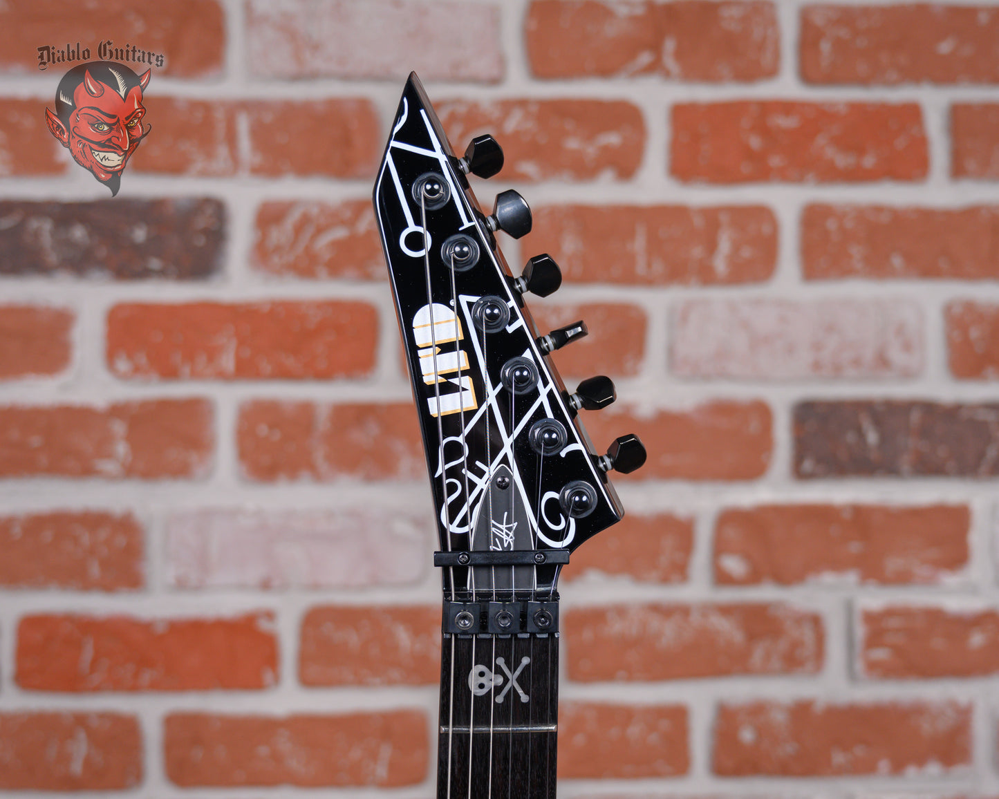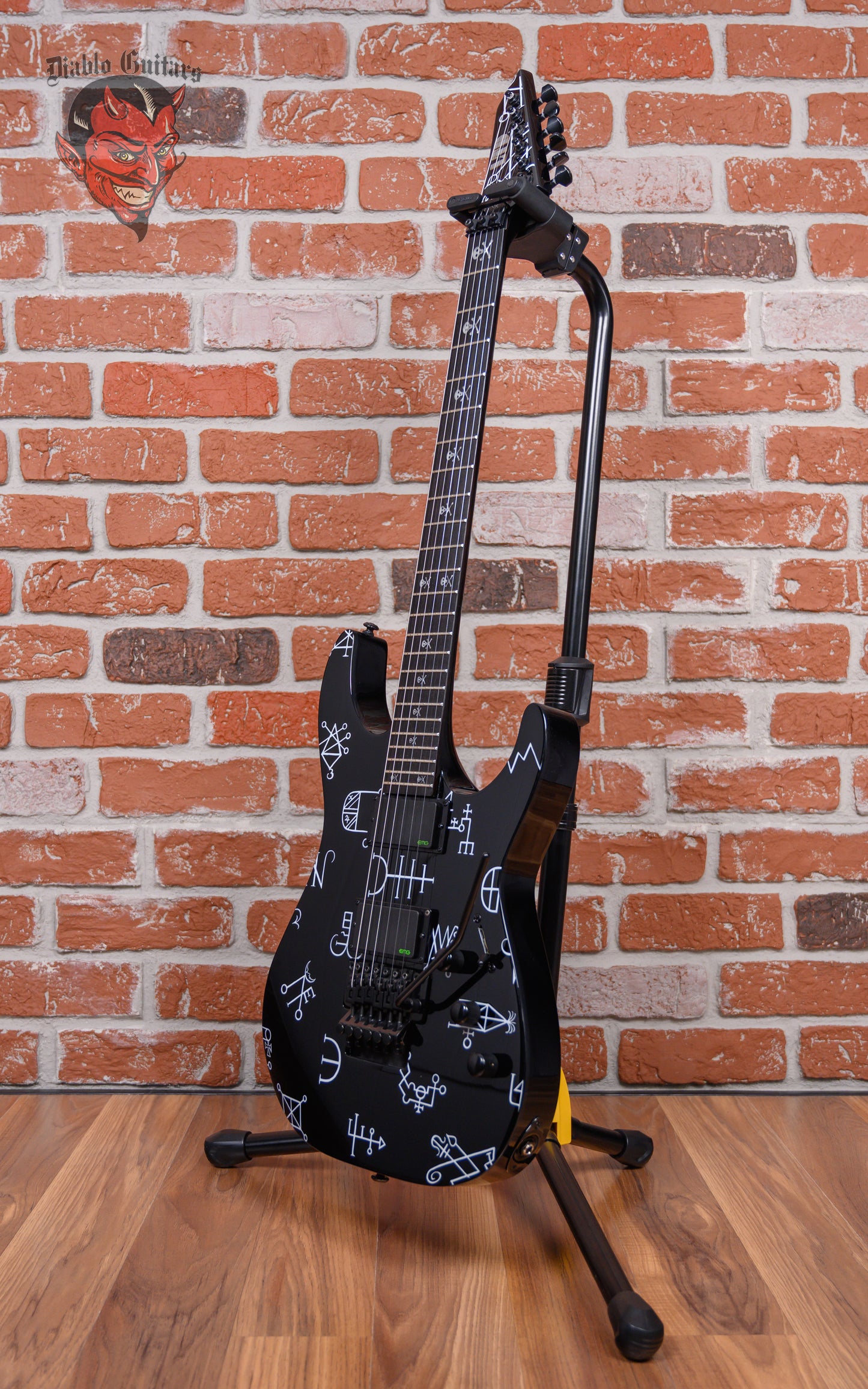 ESP LTD Kirk Hammett Signature Demonology in Black w/ Demonology Graphic finish made in 2022 with Original Hard Shell Case. This guitar features a solid alder body, 3-piece maple neck-thru and macassar ebony fingerboard with a reverse, color matched headstock. Equipped with a set of EMG Bone Breakers in the neck and bridge positions. Controlled by 2 volume pots, 1 tone pot and a 3-Way blade switch. The 25.5" scale length neck has pearloid skull & crossbones inlays and white side markers with 24 extra jumbo frets on a 350mm radius with an Extra Thin U profile. The hardware is comprised of black LTD sealed die-cast tuning machines with cloche heads, a Floyd Rose Locking nut, a Floyd Rose 1000 Series Double Locking Tremolo bridge and black knurled dome knobs.