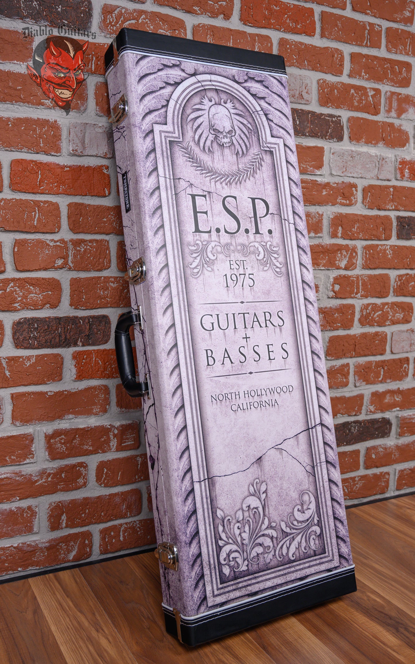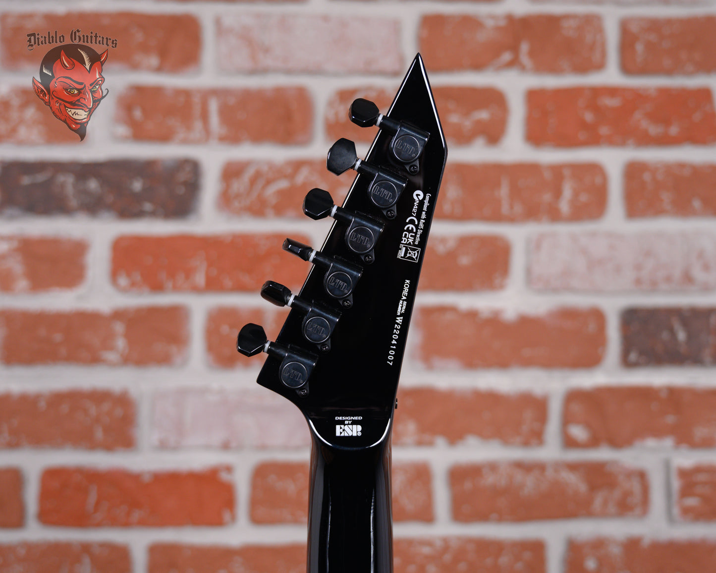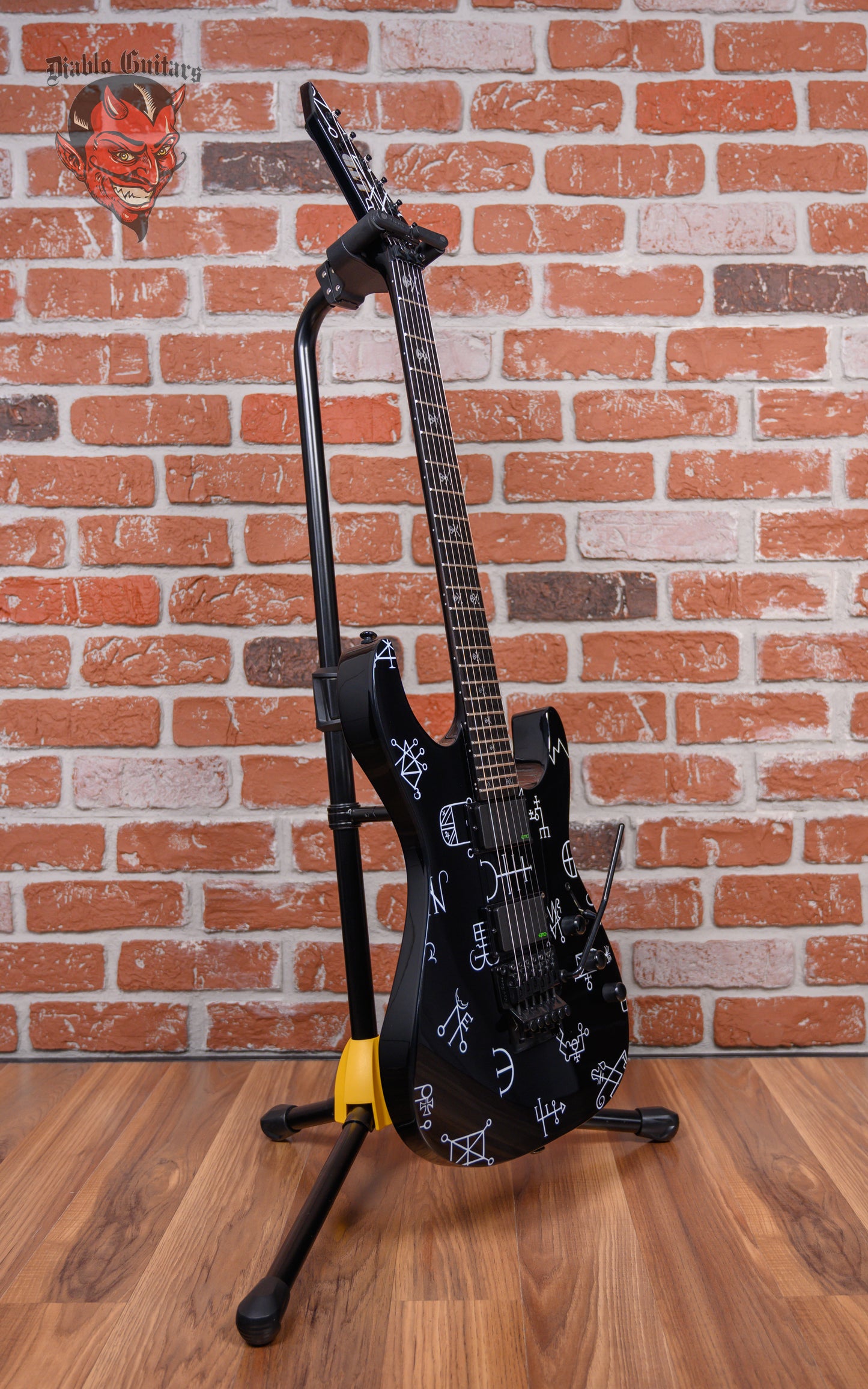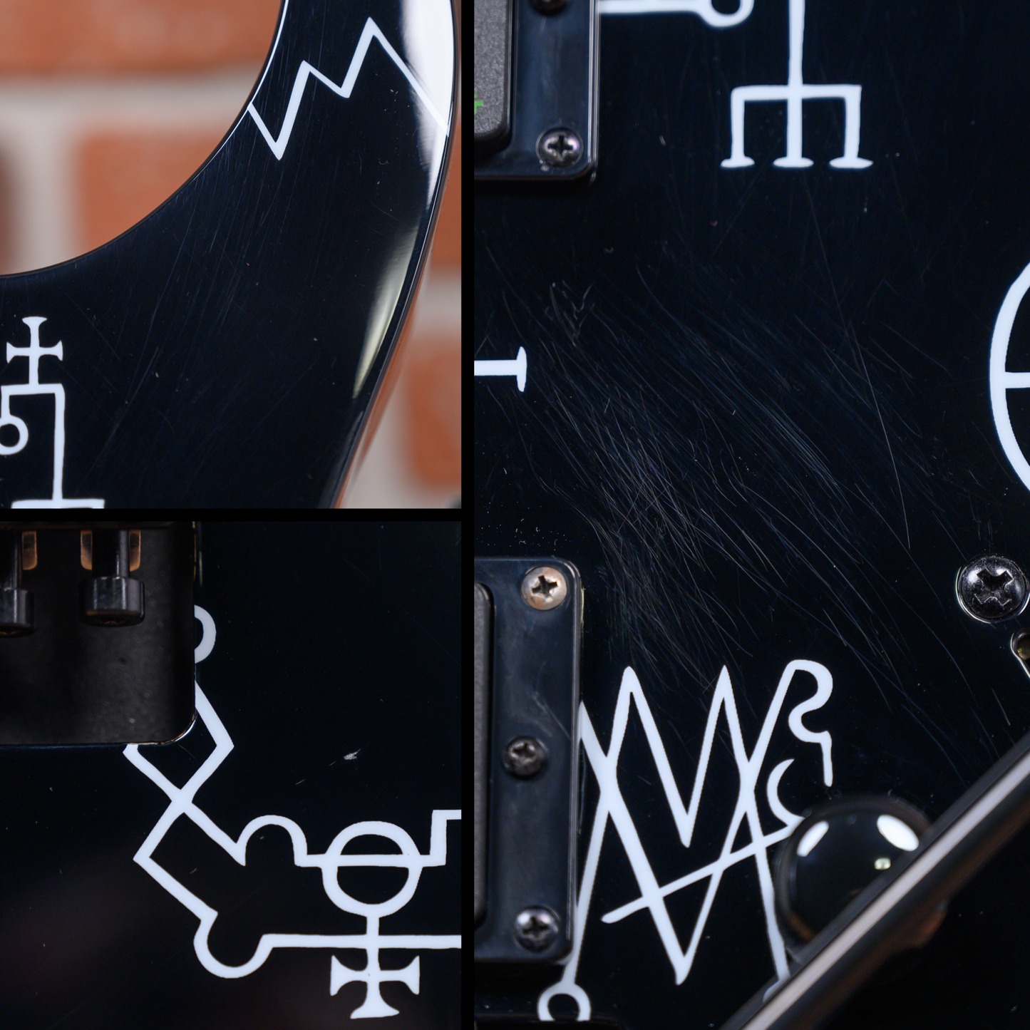ESP LTD Kirk Hammett Signature Demonology in Black w/ Demonology Graphic finish made in 2022 with Original Hard Shell Case. This guitar features a solid alder body, 3-piece maple neck-thru and macassar ebony fingerboard with a reverse, color matched headstock. Equipped with a set of EMG Bone Breakers in the neck and bridge positions. Controlled by 2 volume pots, 1 tone pot and a 3-Way blade switch. The 25.5" scale length neck has pearloid skull & crossbones inlays and white side markers with 24 extra jumbo frets on a 350mm radius with an Extra Thin U profile. The hardware is comprised of black LTD sealed die-cast tuning machines with cloche heads, a Floyd Rose Locking nut, a Floyd Rose 1000 Series Double Locking Tremolo bridge and black knurled dome knobs.