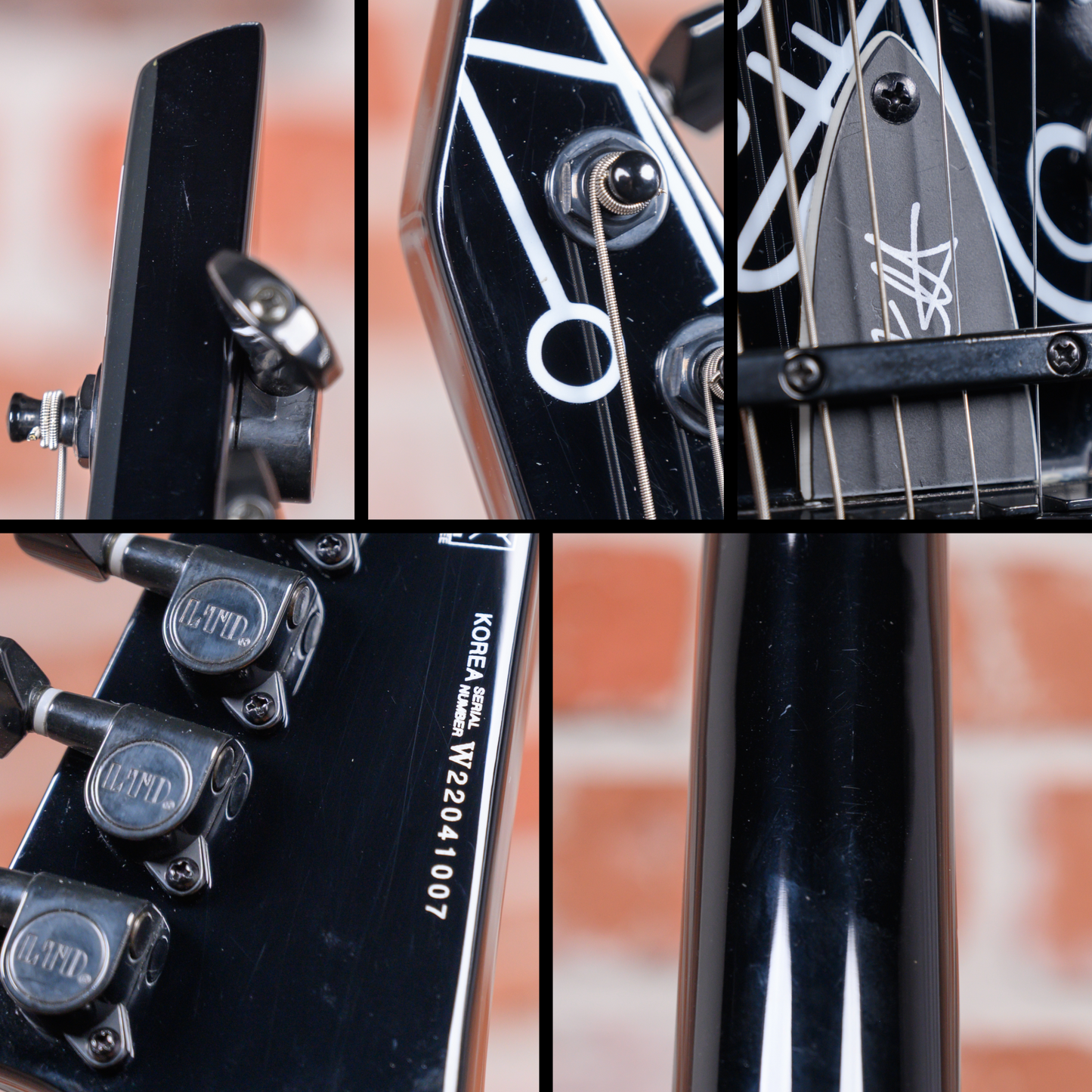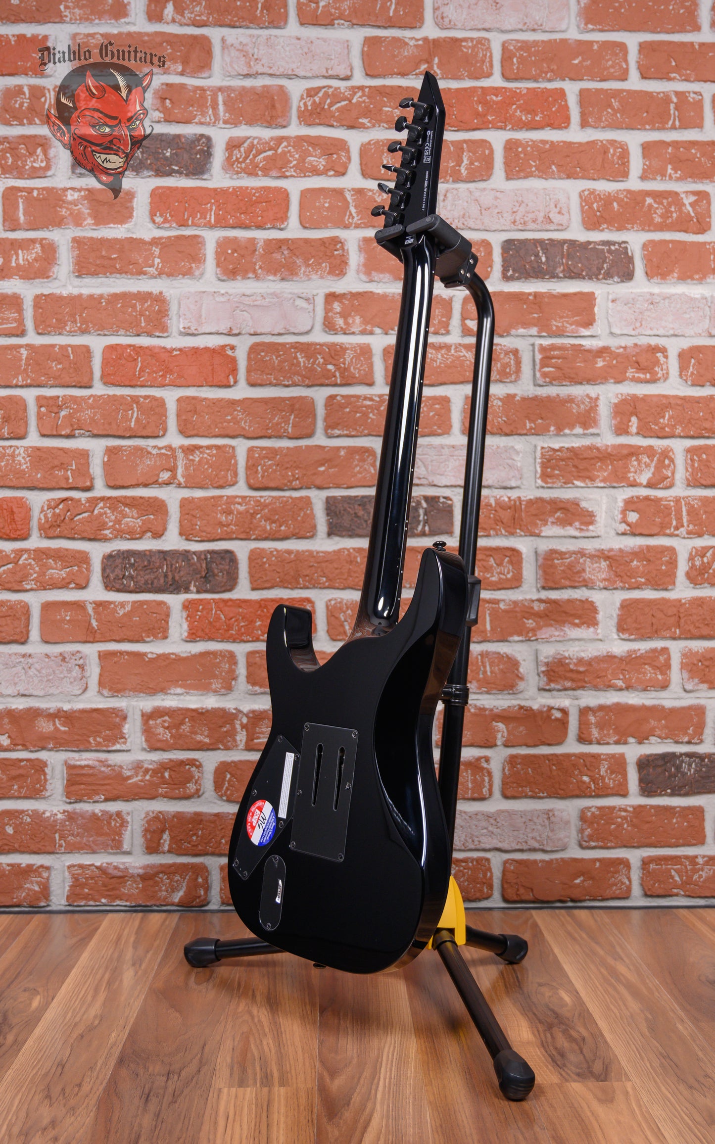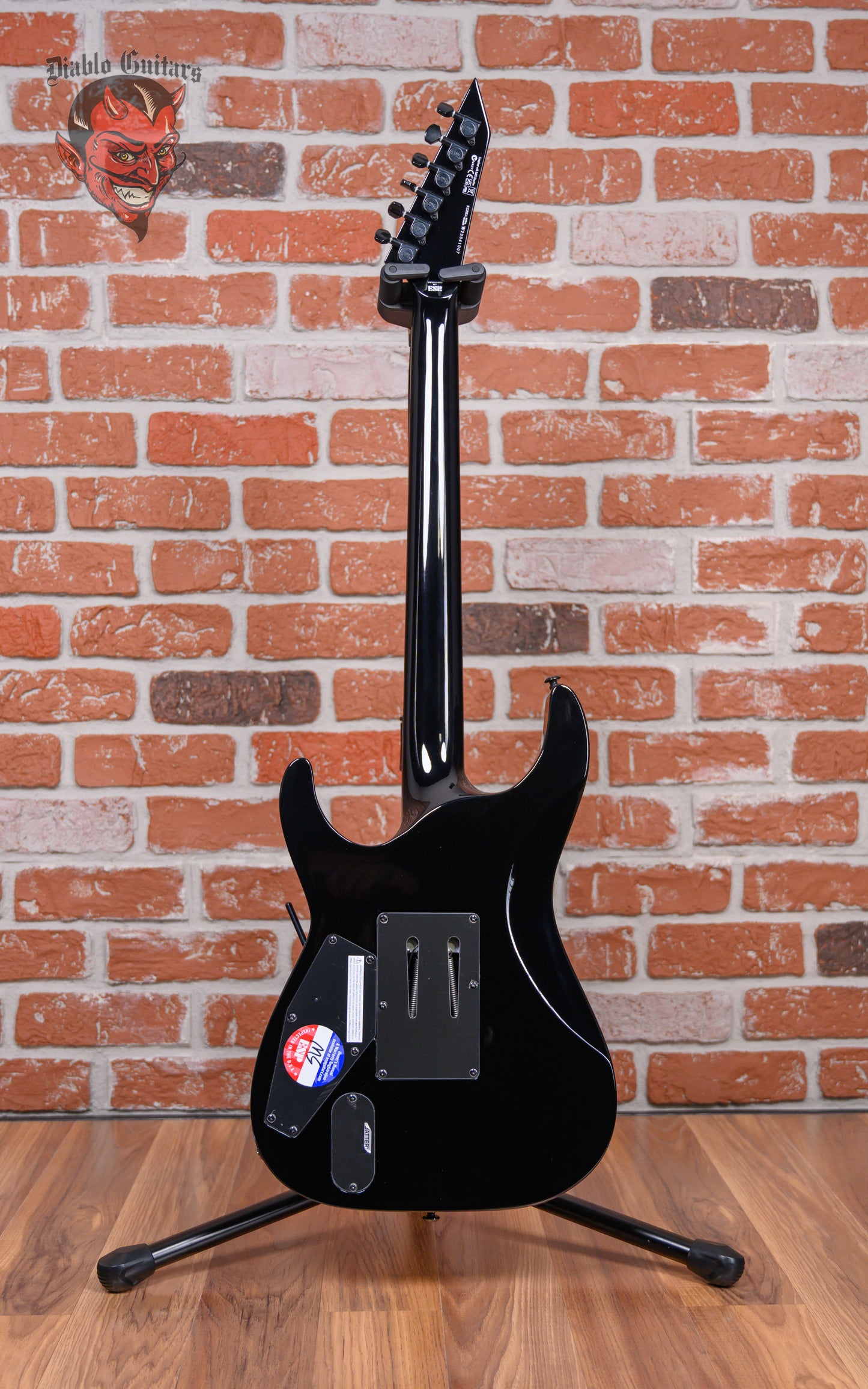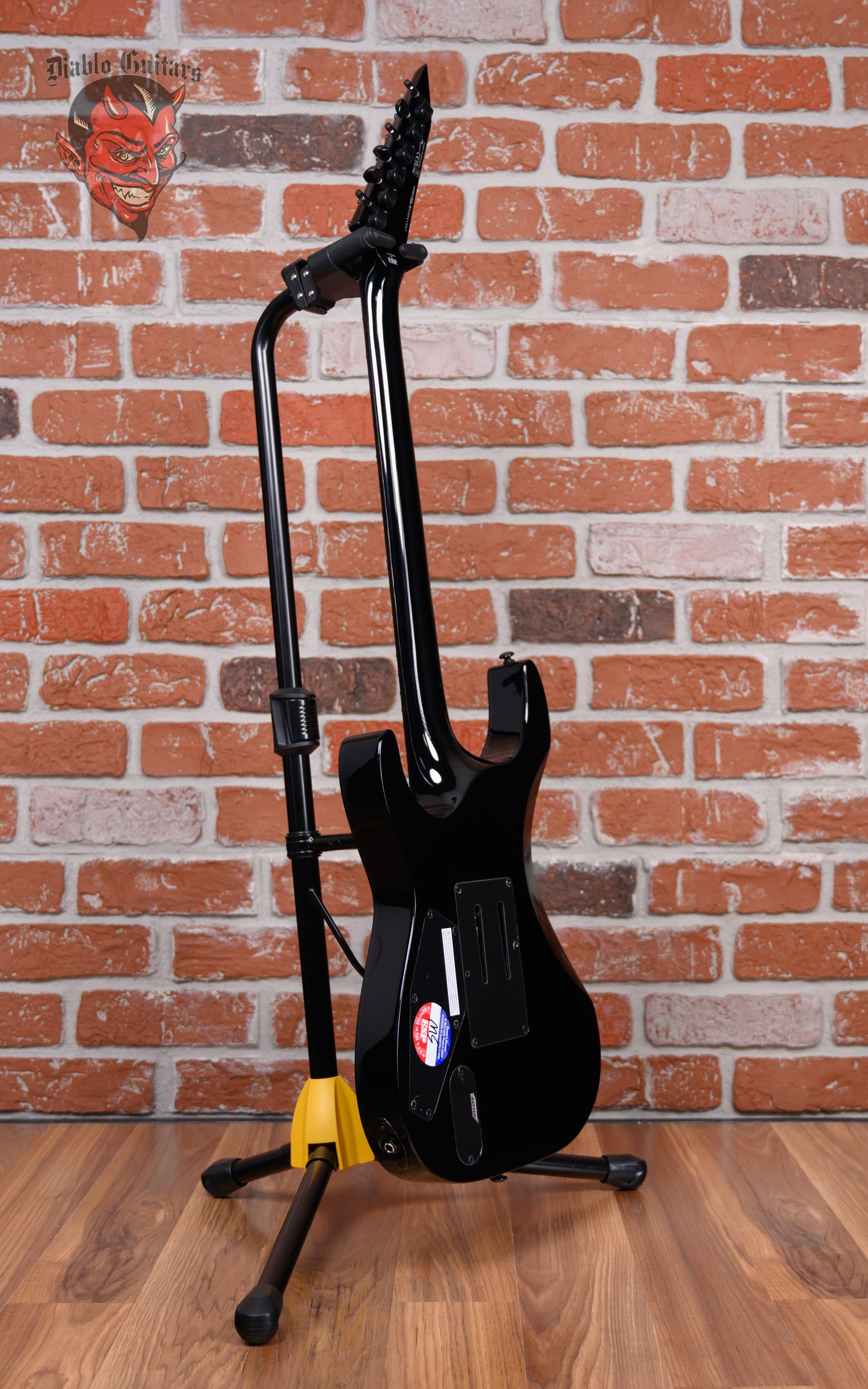 ESP LTD Kirk Hammett Signature Demonology in Black w/ Demonology Graphic finish made in 2022 with Original Hard Shell Case. This guitar features a solid alder body, 3-piece maple neck-thru and macassar ebony fingerboard with a reverse, color matched headstock. Equipped with a set of EMG Bone Breakers in the neck and bridge positions. Controlled by 2 volume pots, 1 tone pot and a 3-Way blade switch. The 25.5" scale length neck has pearloid skull & crossbones inlays and white side markers with 24 extra jumbo frets on a 350mm radius with an Extra Thin U profile. The hardware is comprised of black LTD sealed die-cast tuning machines with cloche heads, a Floyd Rose Locking nut, a Floyd Rose 1000 Series Double Locking Tremolo bridge and black knurled dome knobs.